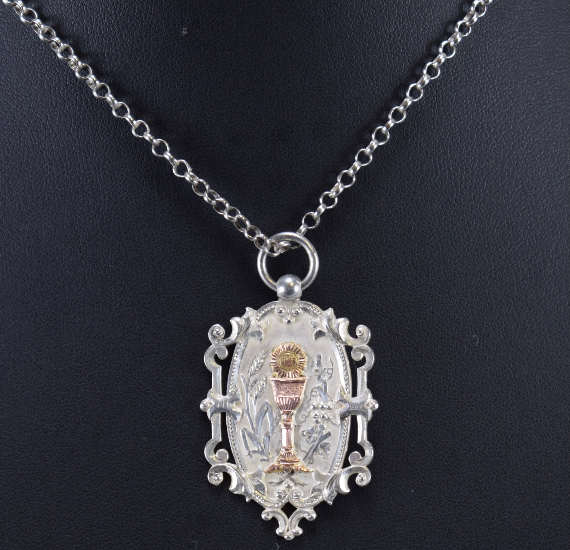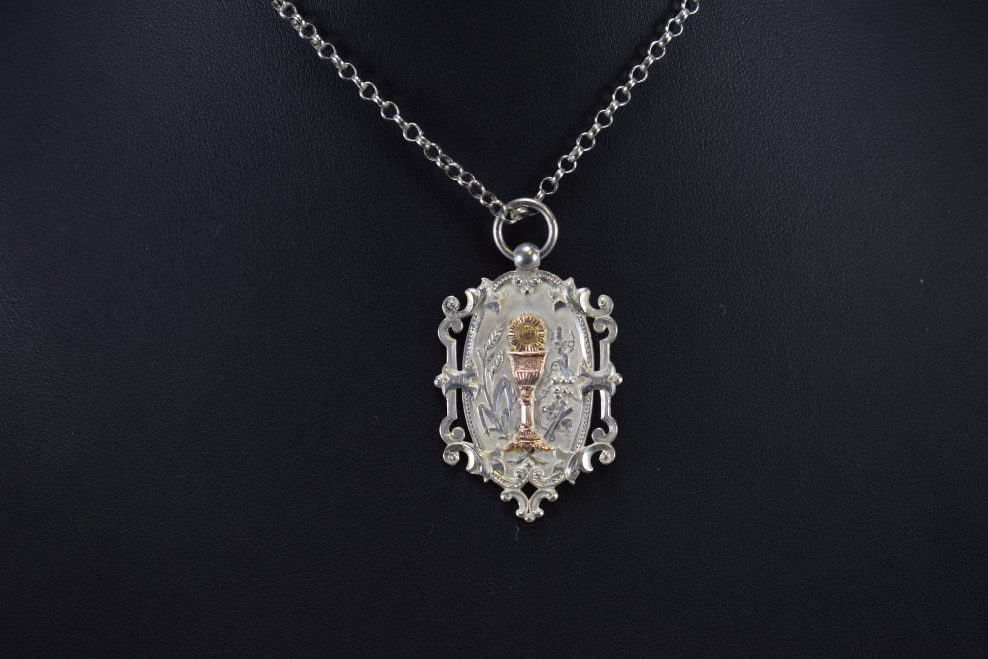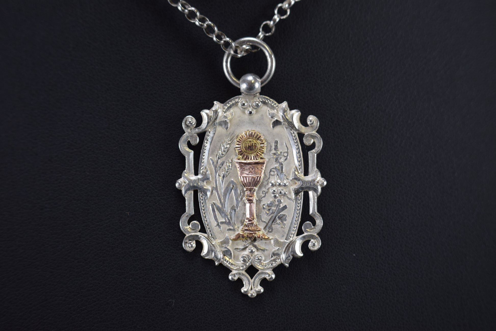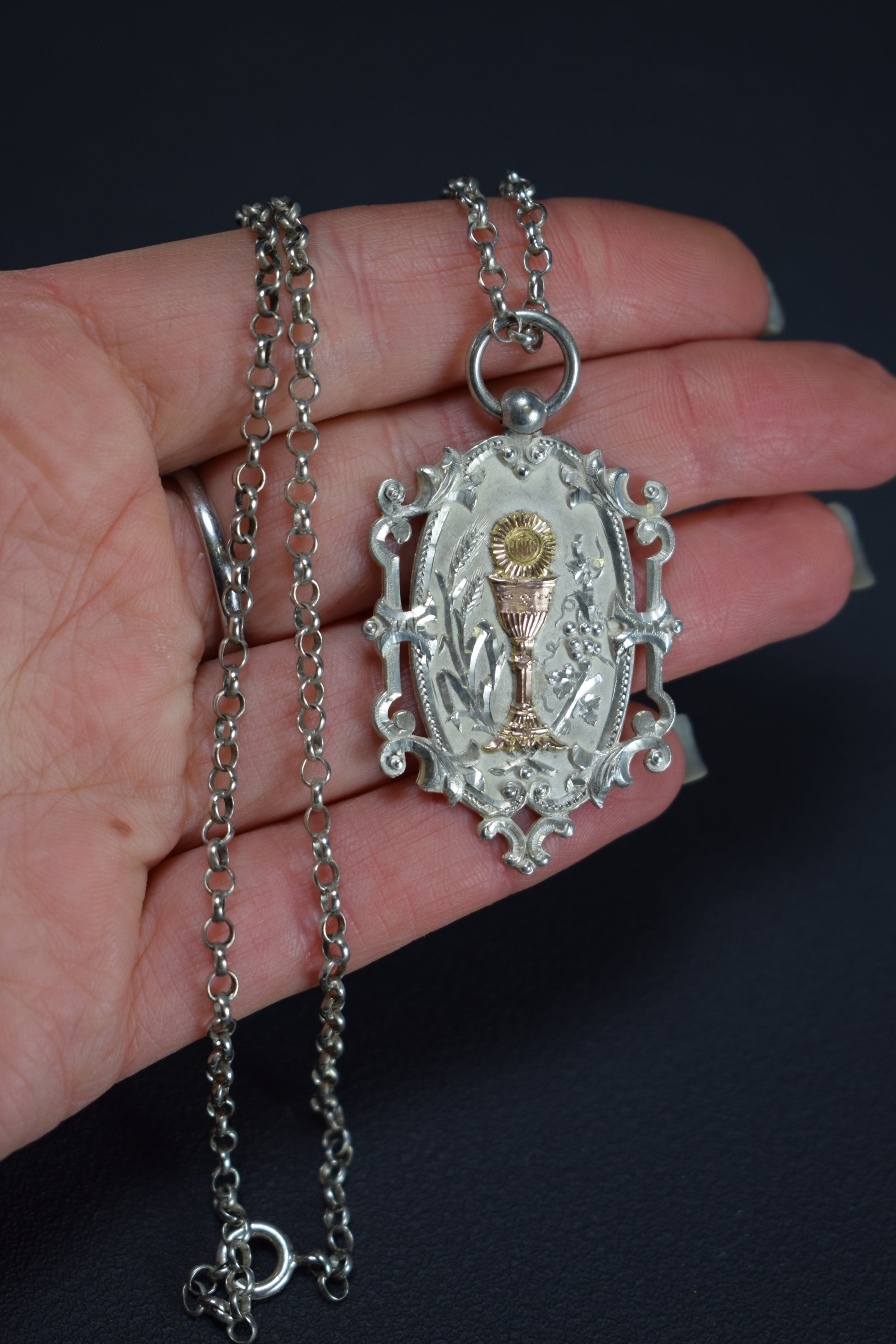 Il s'agit d'une médaille antique de communion française, datant du début du 20e siècle. Le pendentif chrétien présente un calice entouré d'épis de blé et de raisins. Grande taille. La médaille flotte sur une chaîne vintage en argent sterling mesurant 26 pouces (66 cm).