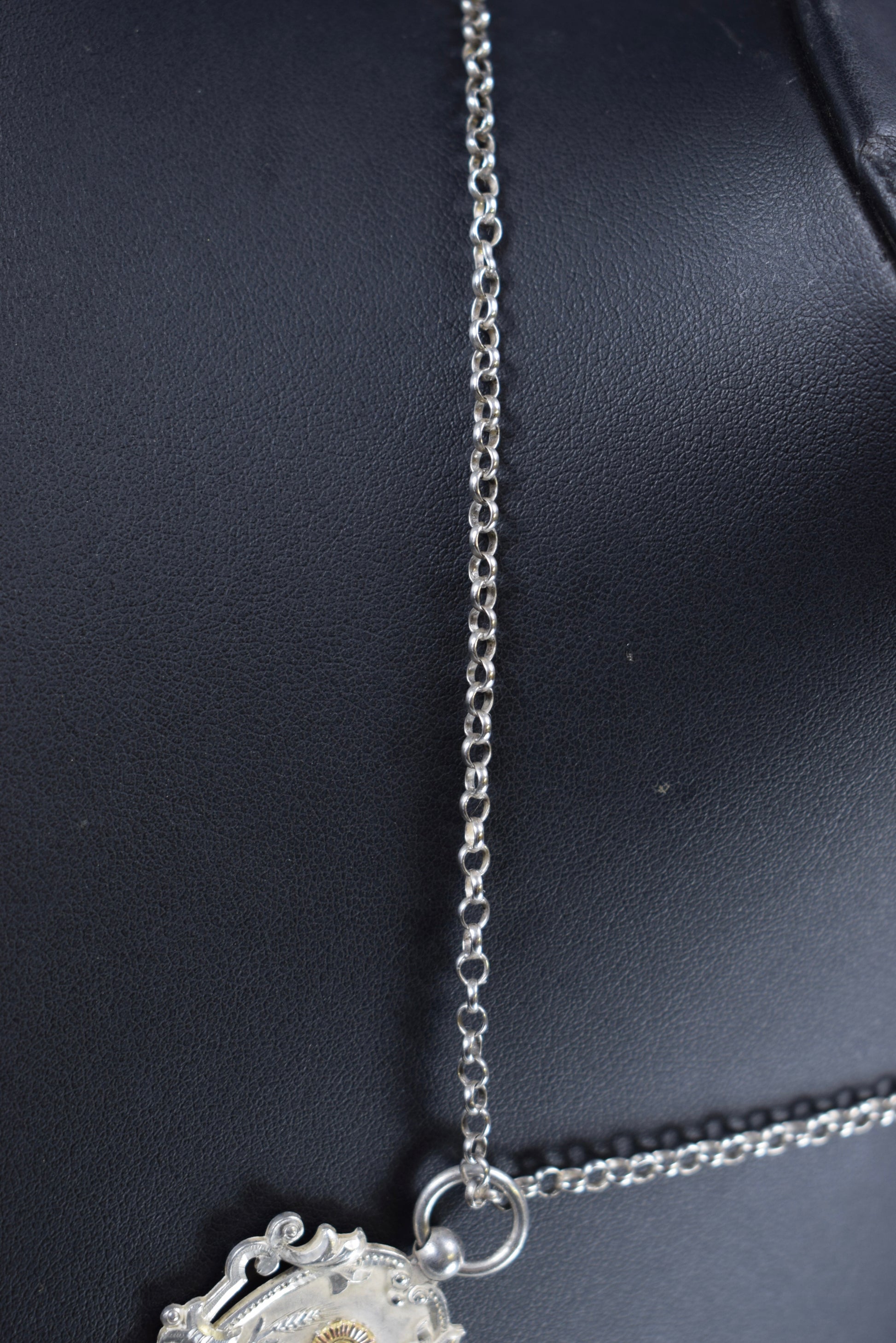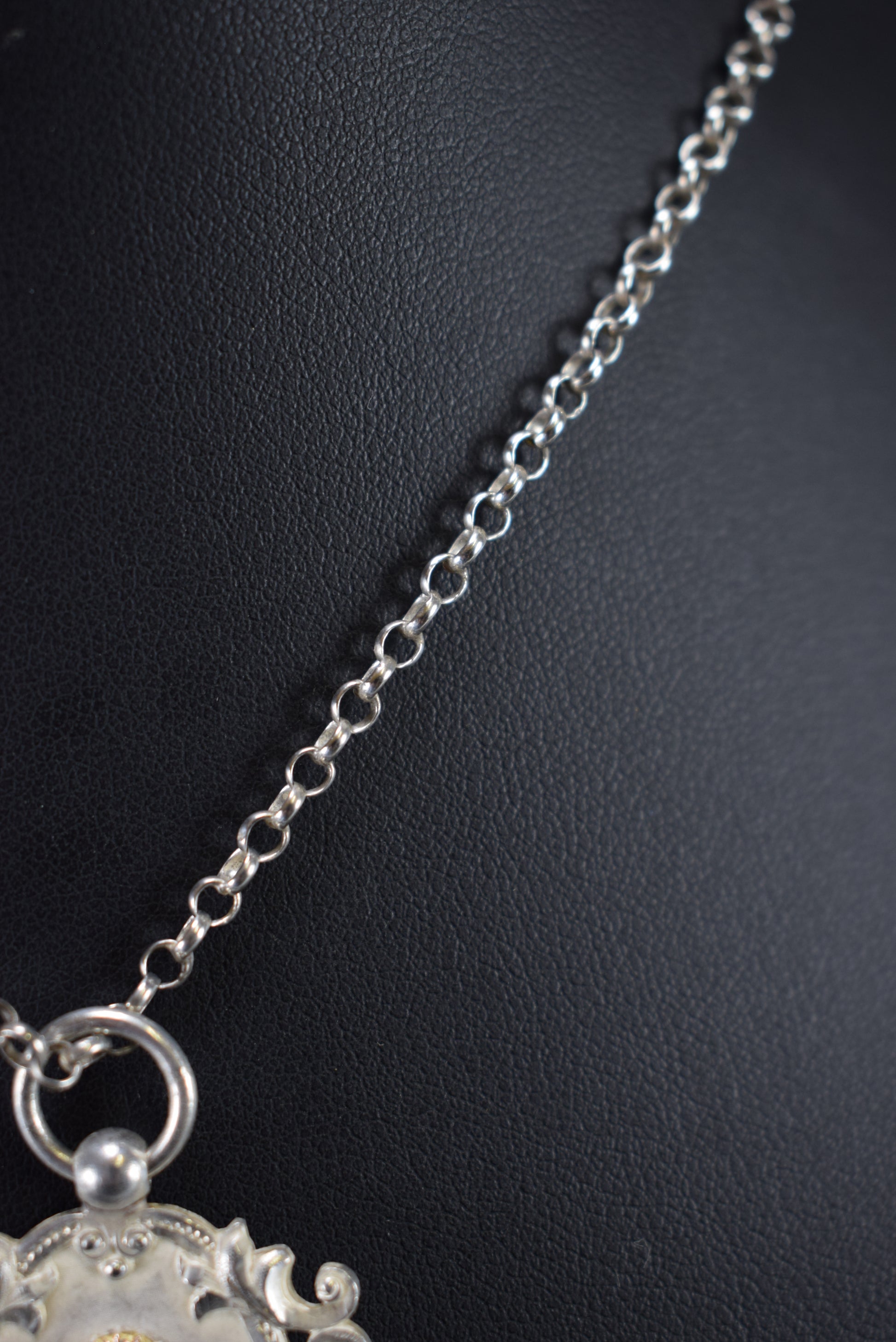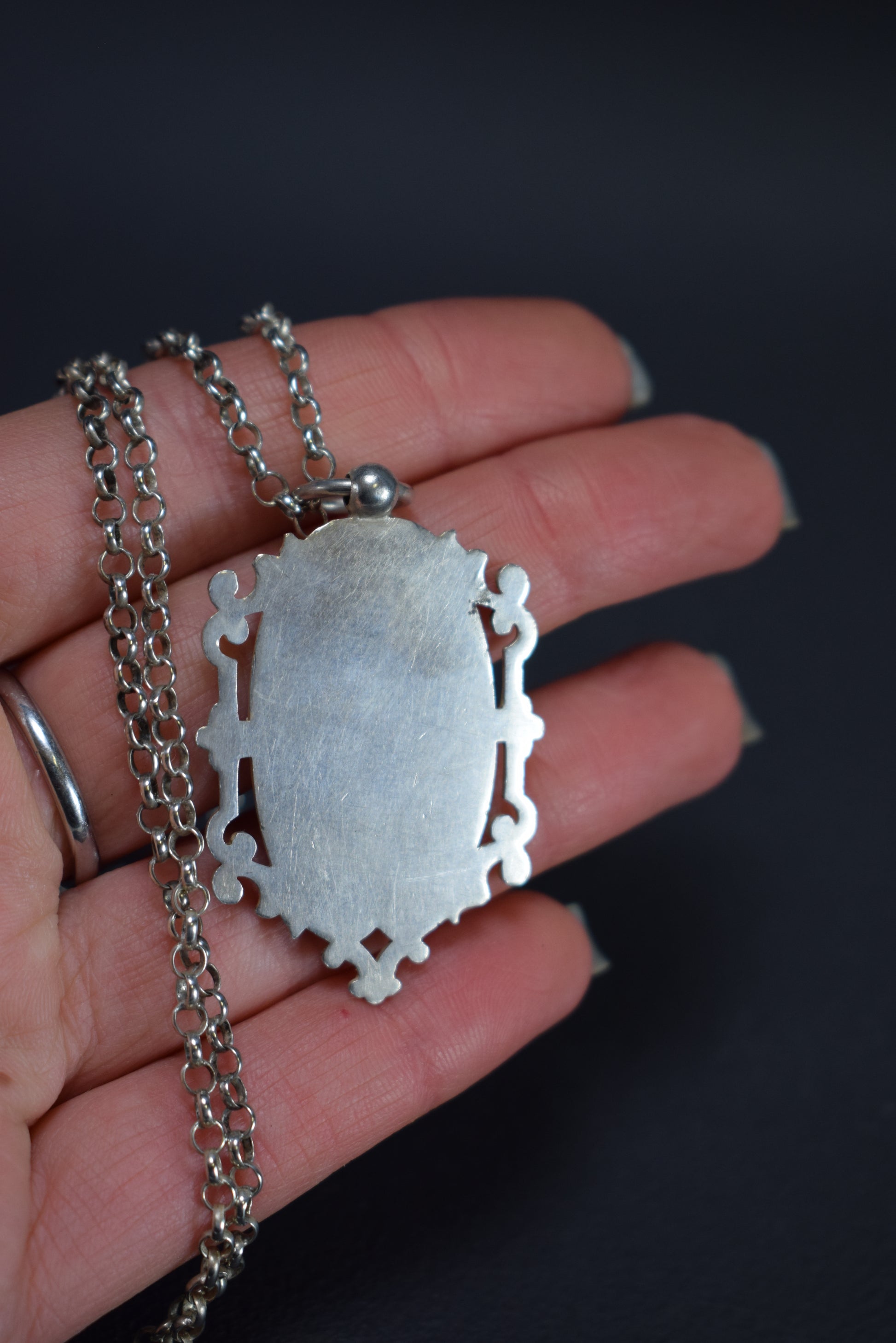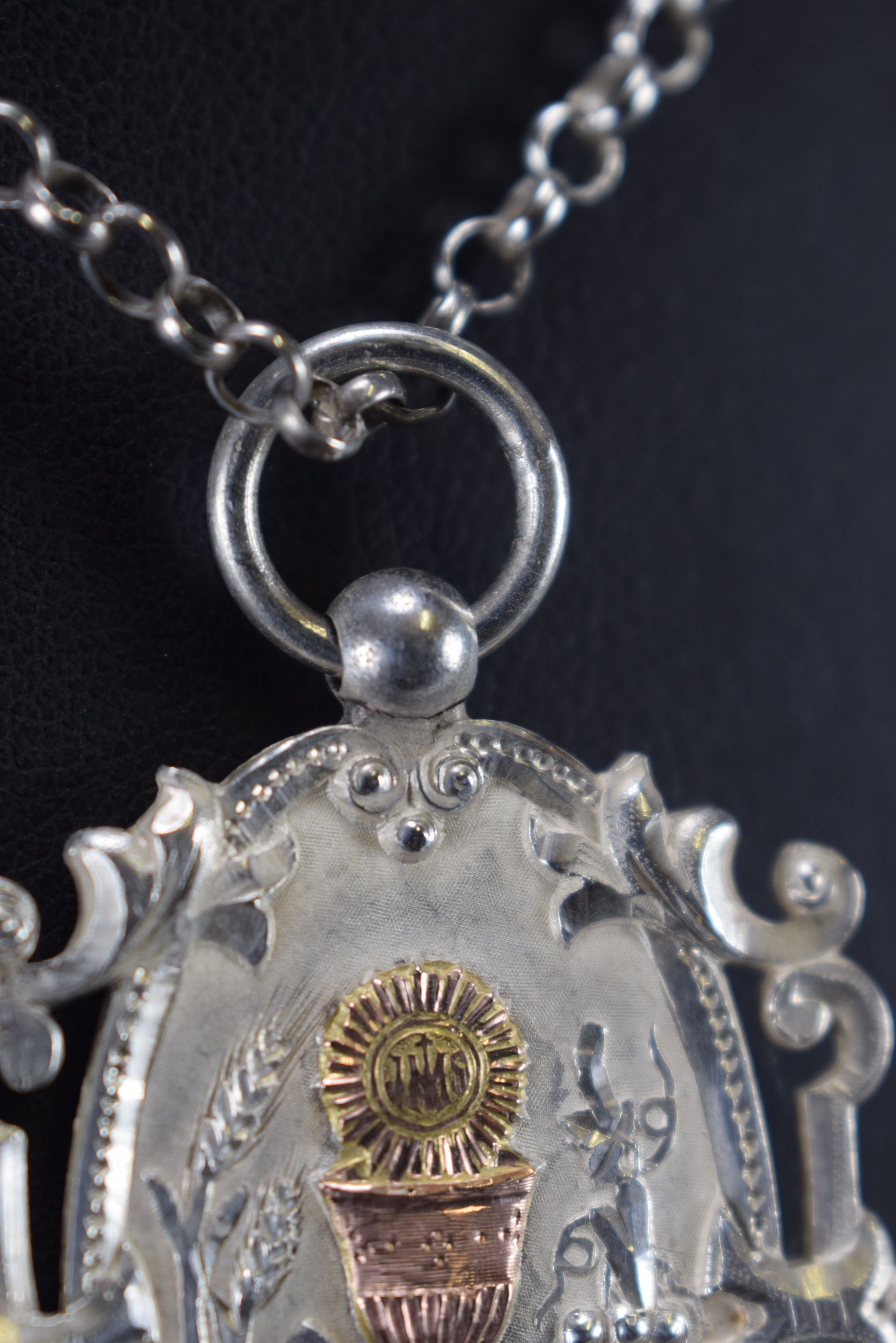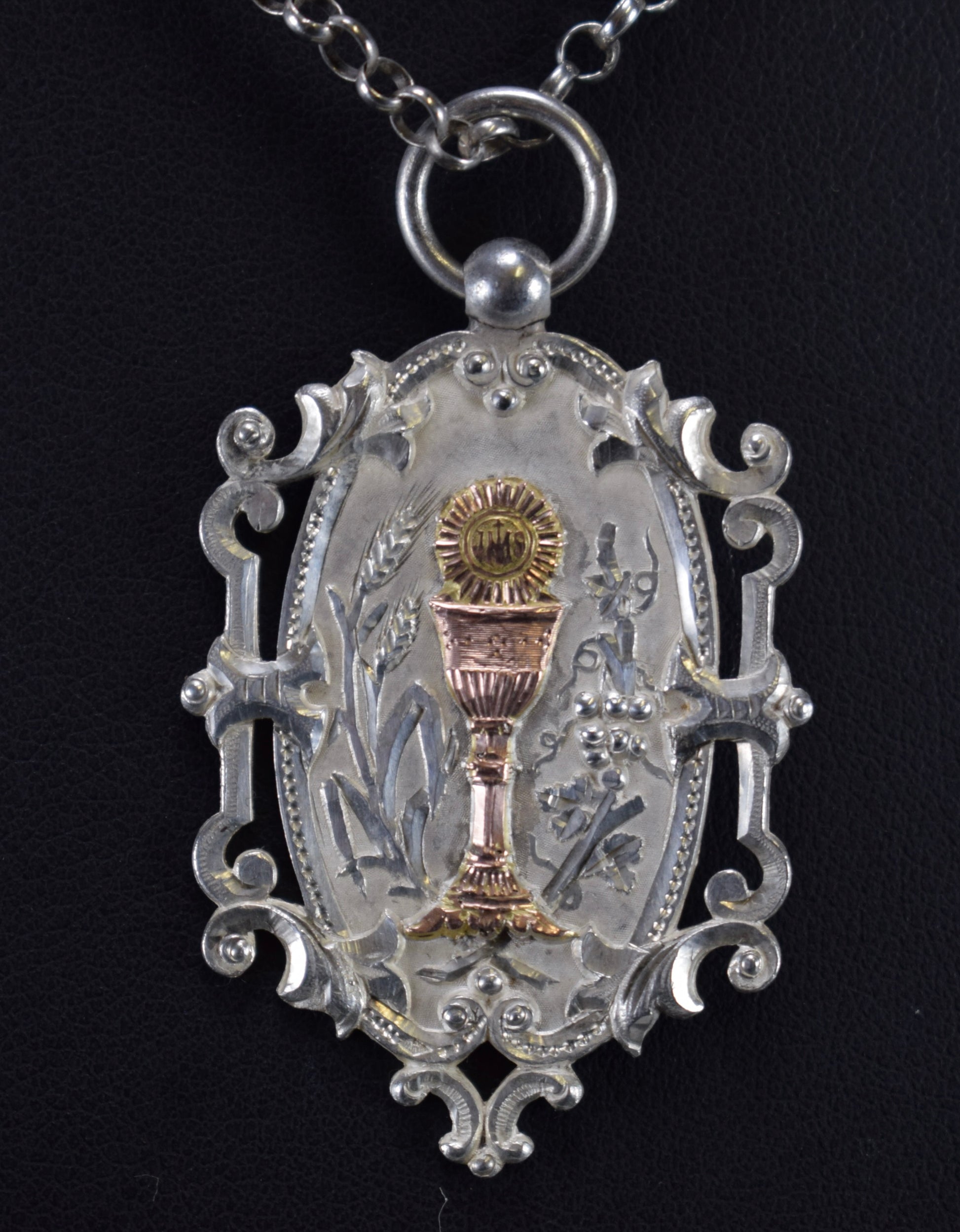 Il s'agit d'une médaille antique de communion française, datant du début du 20e siècle. Le pendentif chrétien présente un calice entouré d'épis de blé et de raisins. Grande taille. La médaille flotte sur une chaîne vintage en argent sterling mesurant 26 pouces (66 cm).