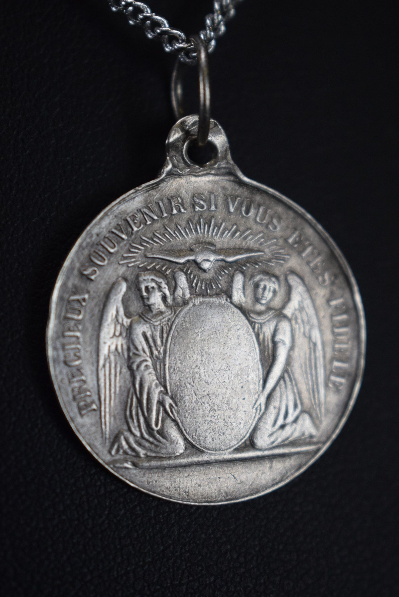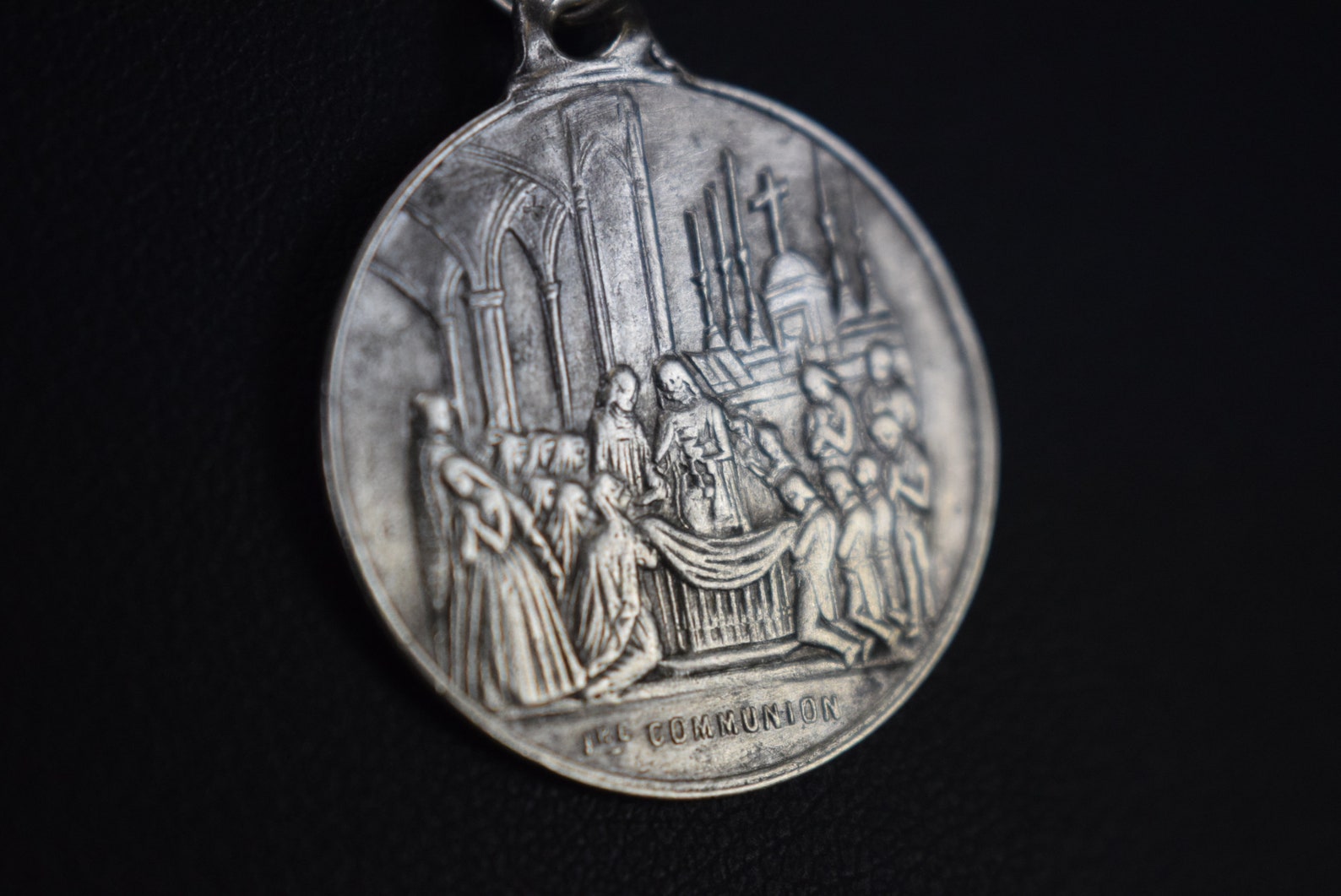 A beautiful French first communion medal made of sterling silver. It features the first Communion in a Church. On the reverse, there is an two angels and the inscription "precious souvenir if you are faithful".