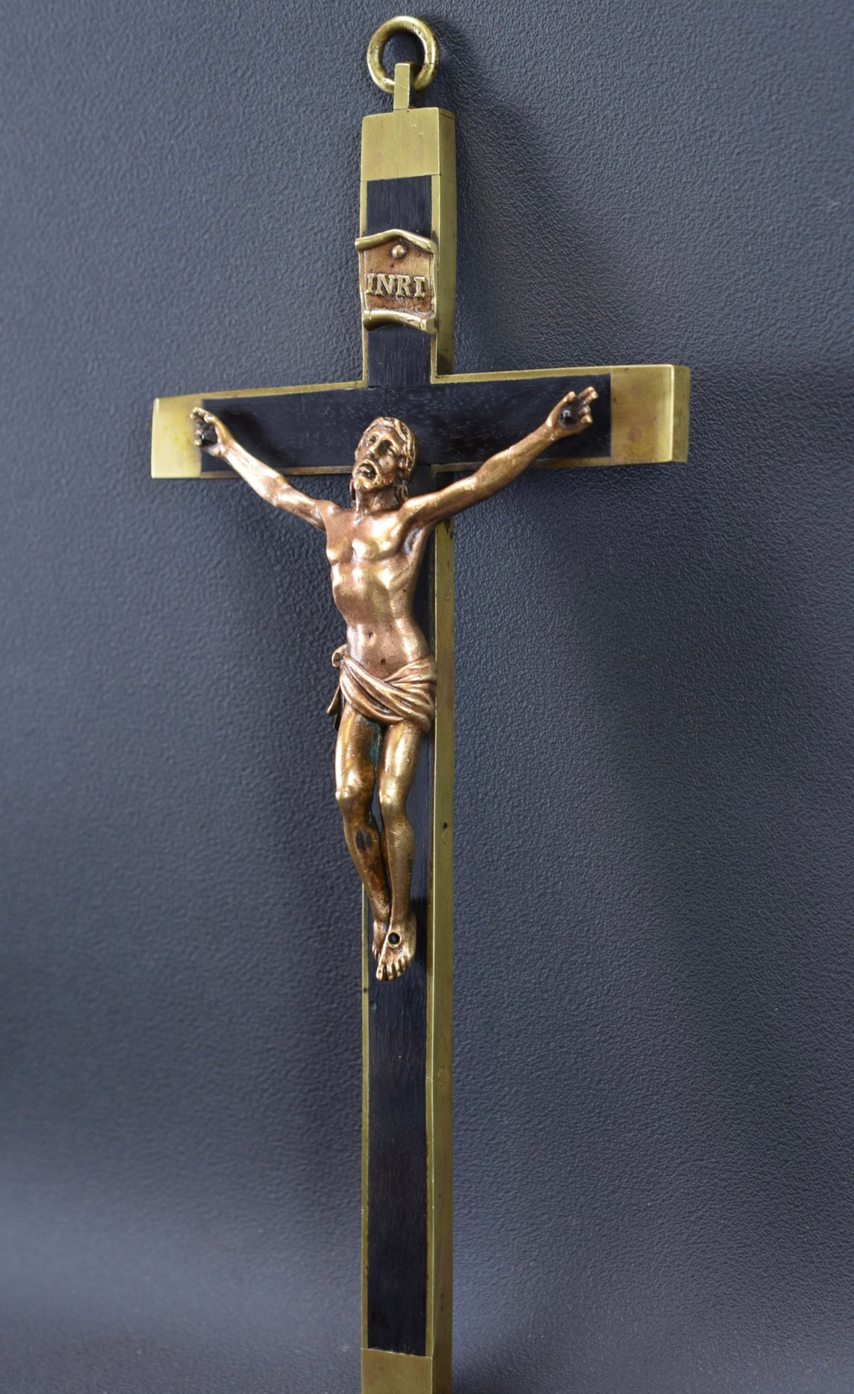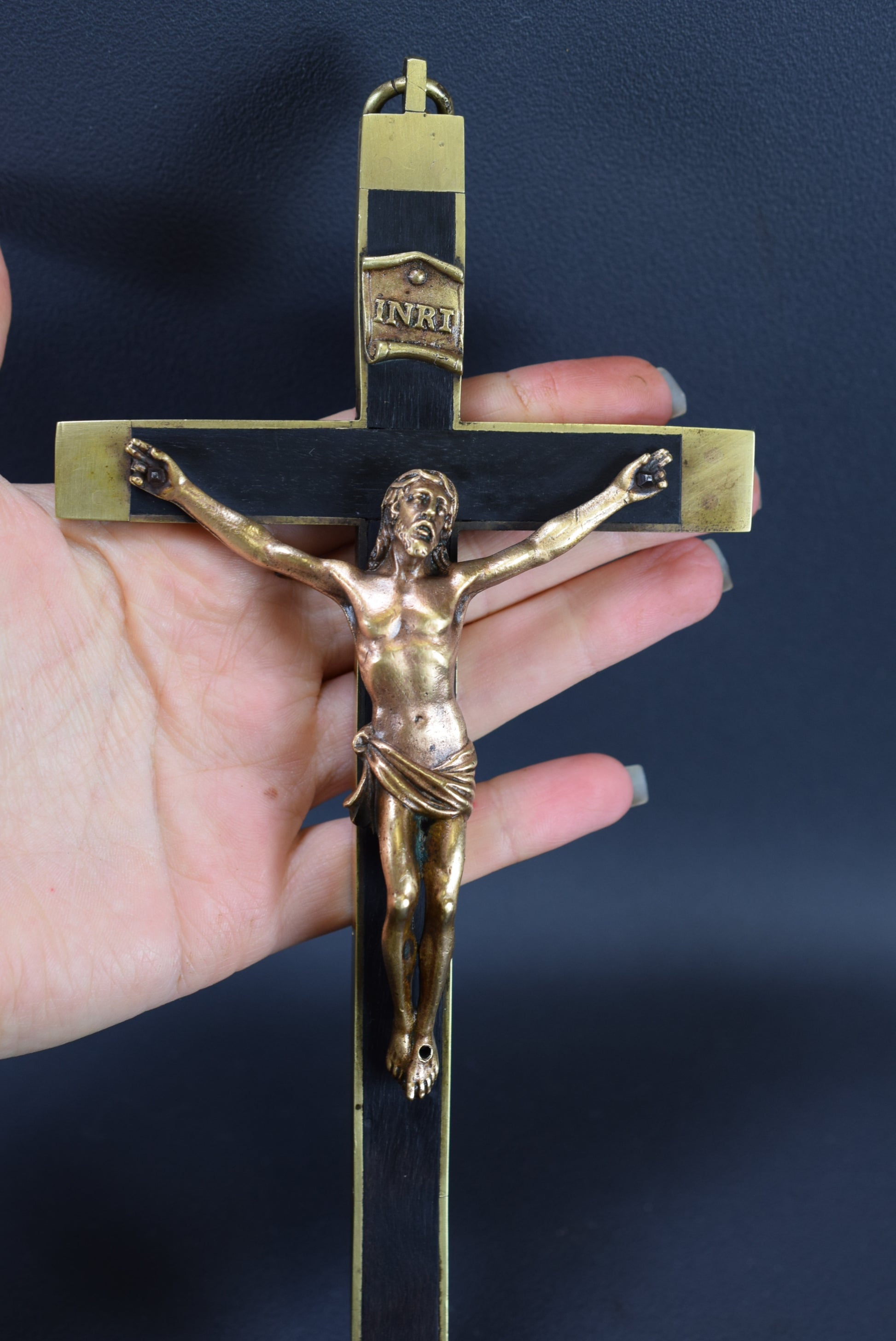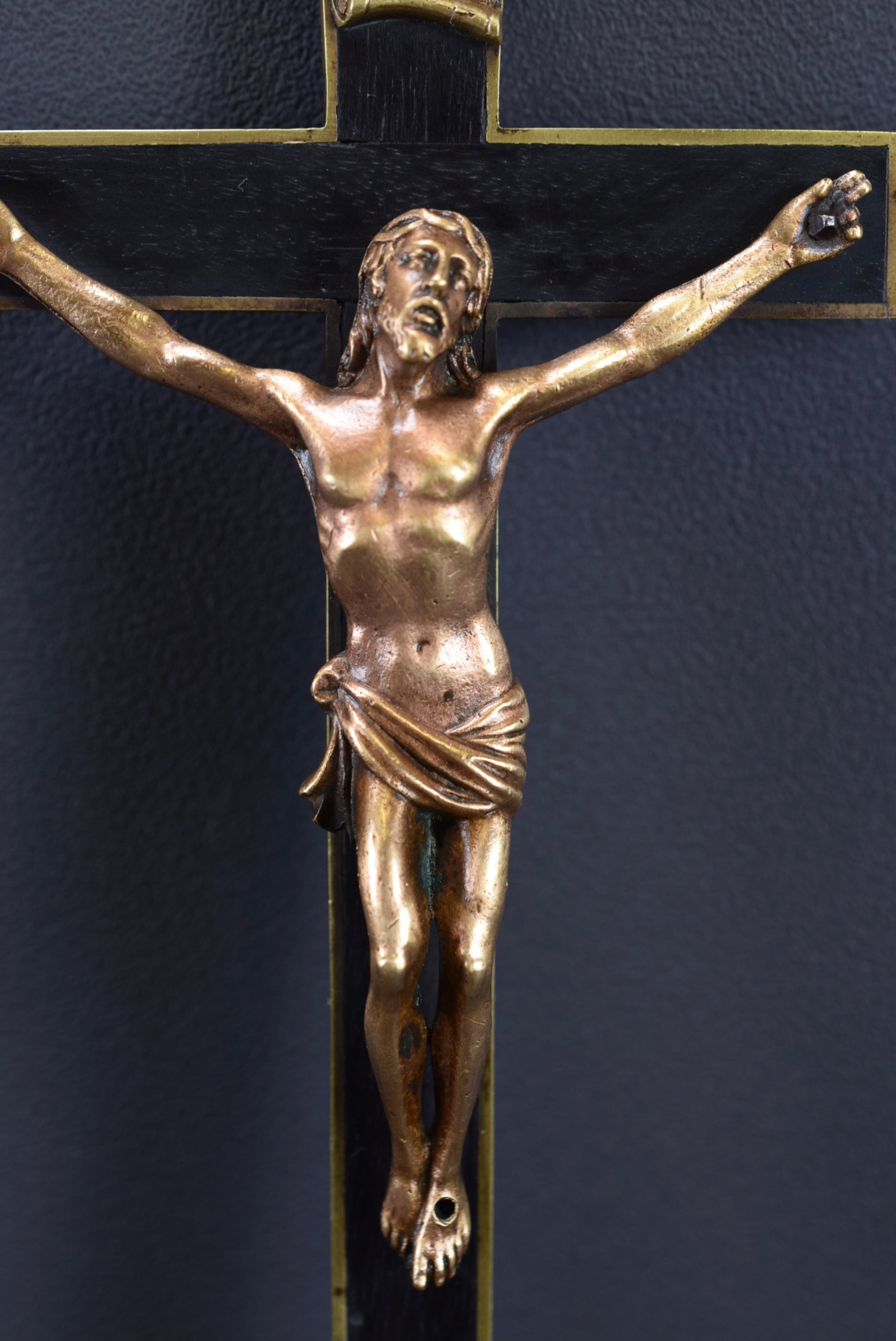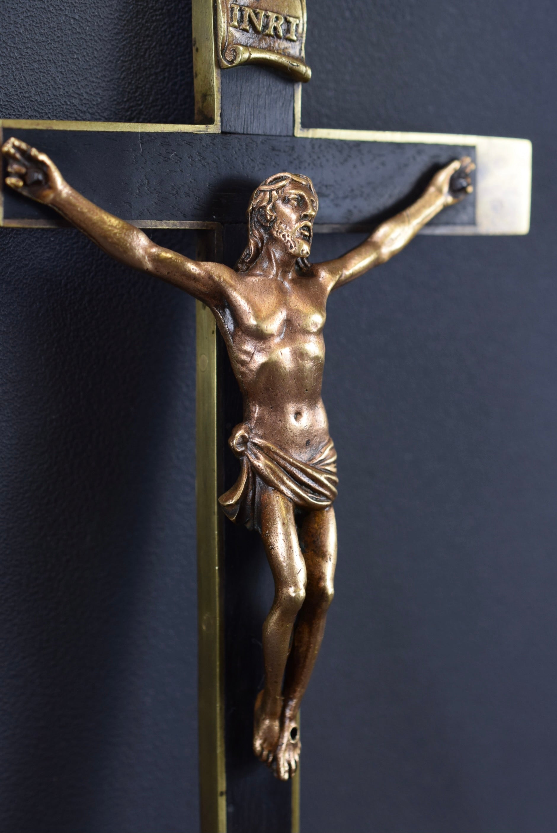 An antique and authentic French large cross dating to the early 20th century. The nun's cross or wall crucifix is made of bronze and ebony wood inlay. Beautiful quality.