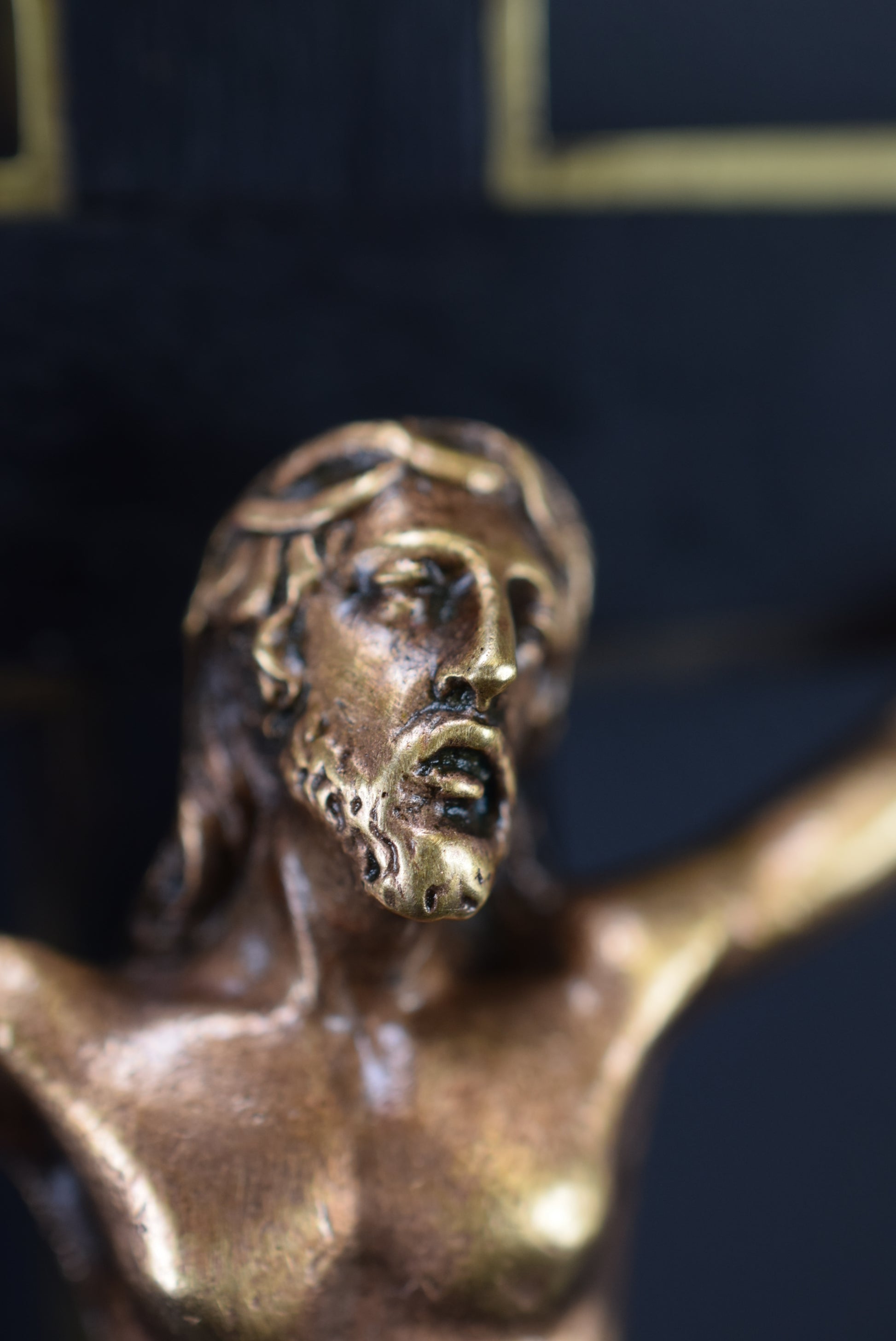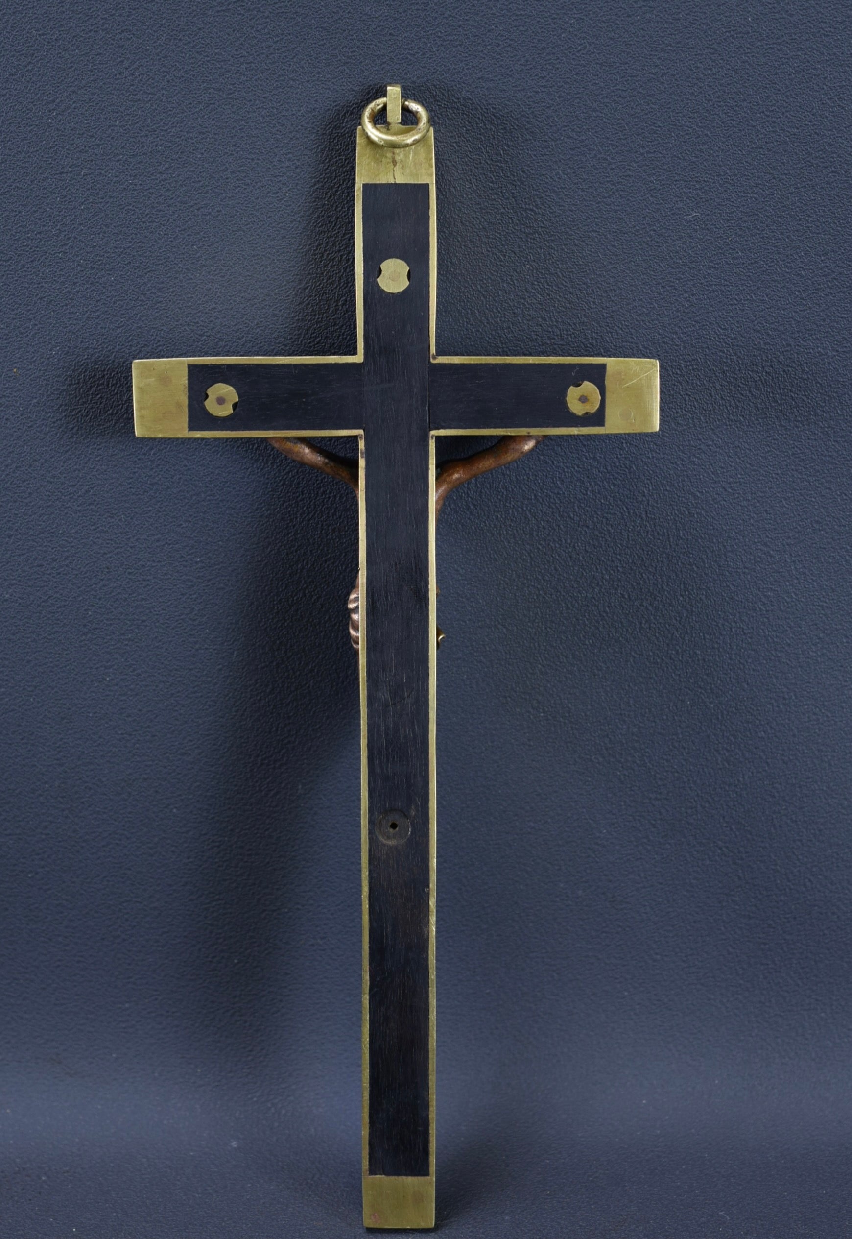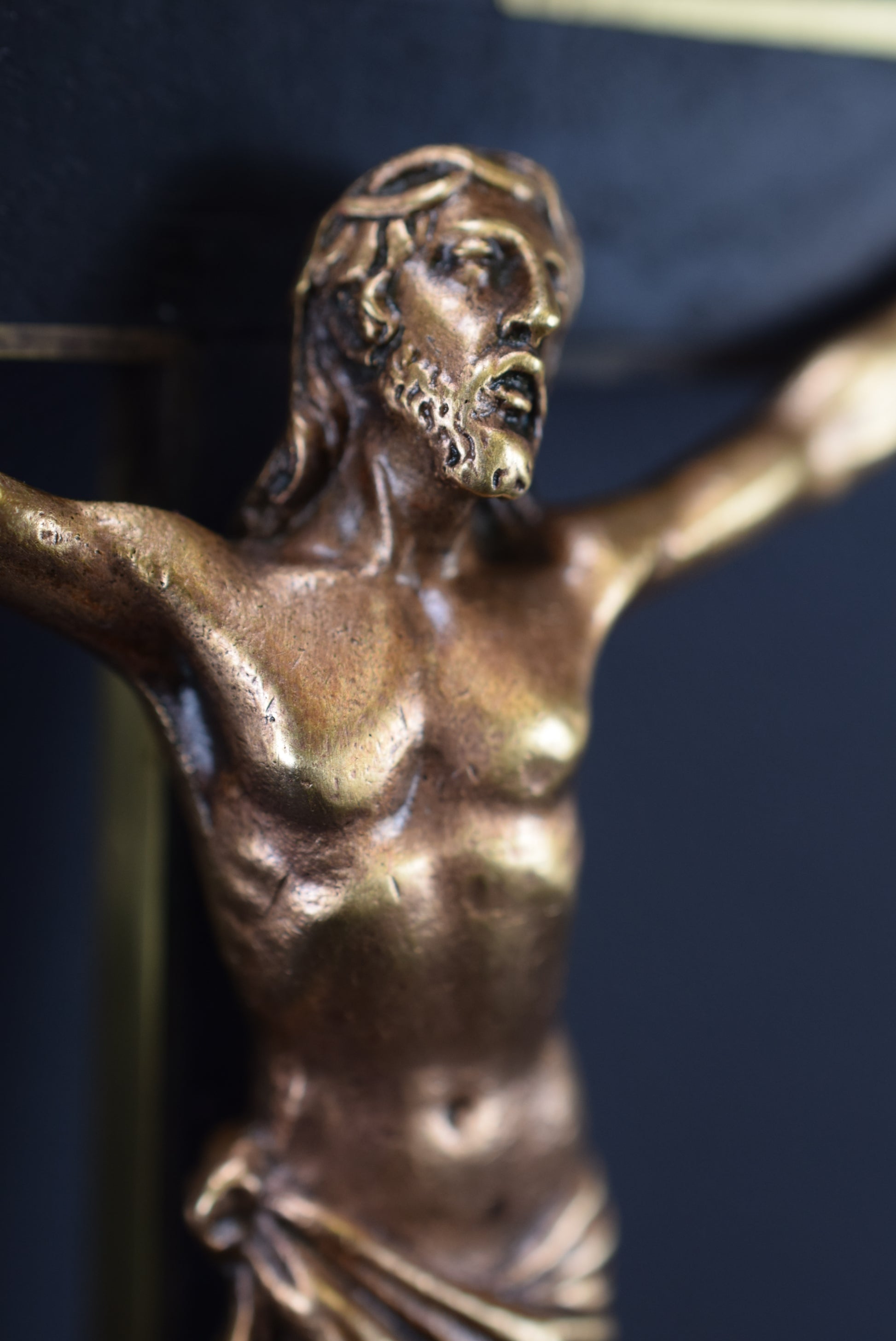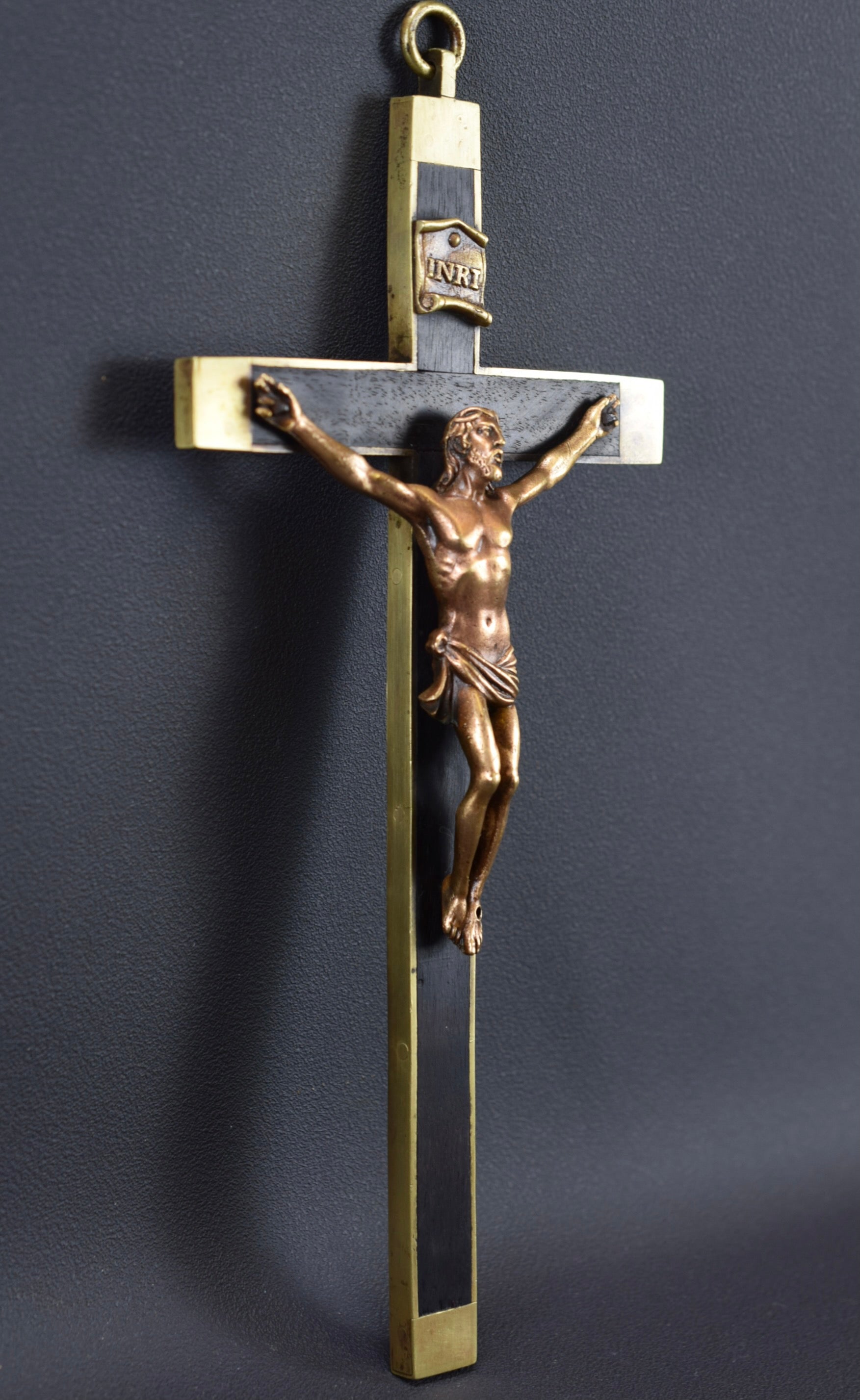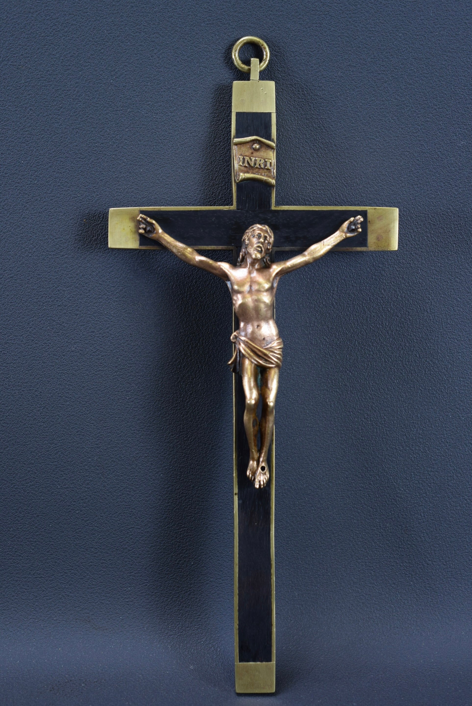 An antique and authentic French large cross dating to the early 20th century. The nun's cross or wall crucifix is made of bronze and ebony wood inlay. Beautiful quality.