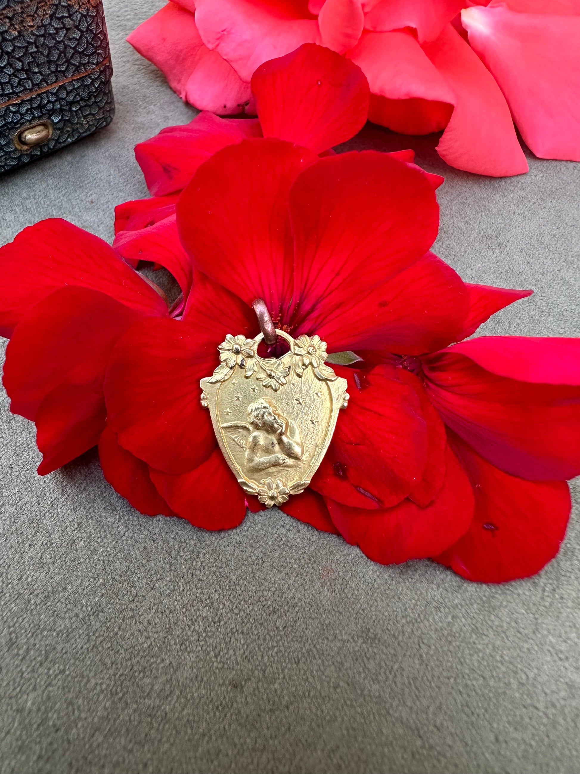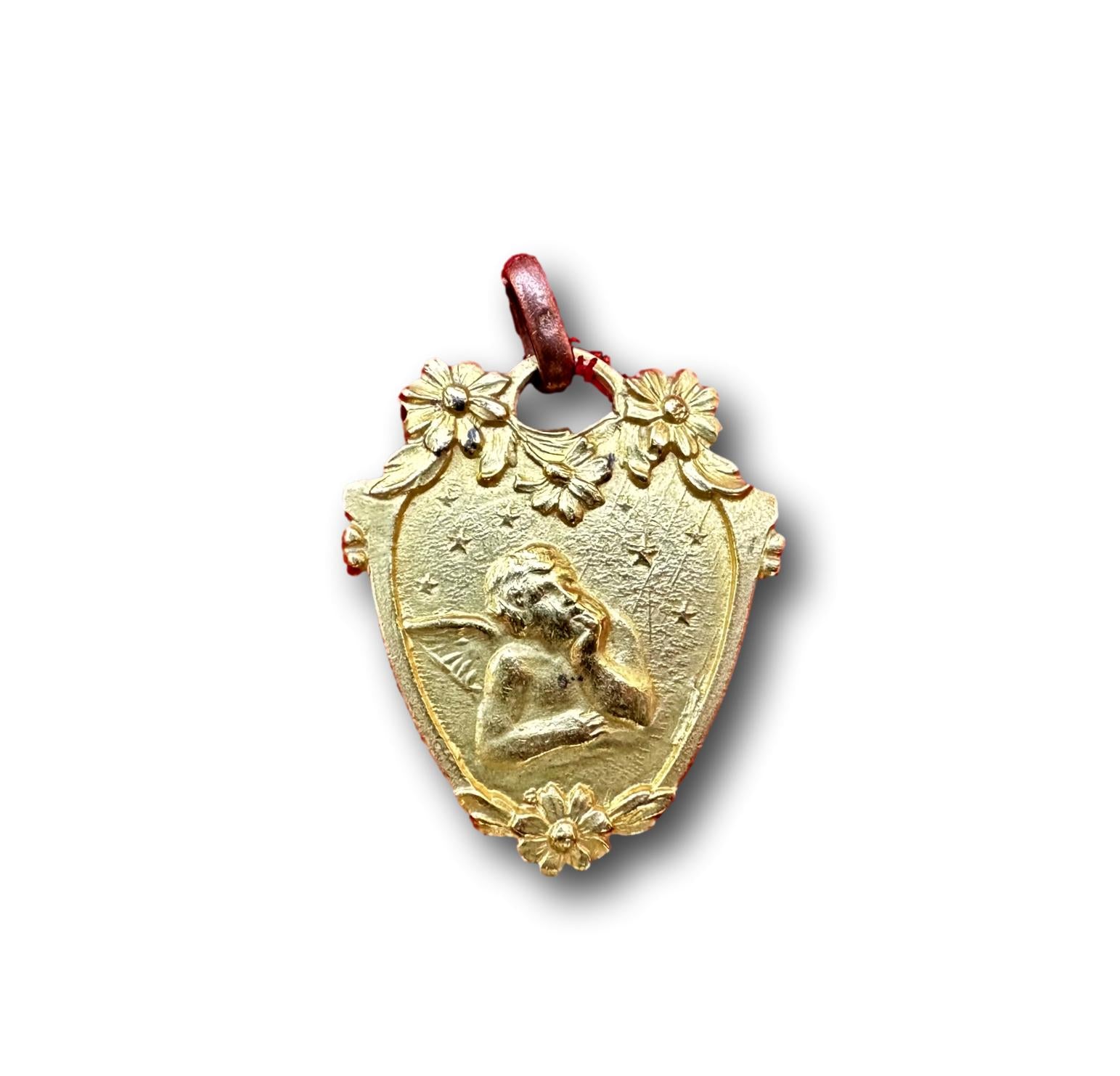 A beautiful French antique pendant featuring a charming angel, Raphael's cherub. Elegant Art Nouveau design with floral motifs. The guardian angel medal would be a great Communion or newborn Baptism gift. High quality antique heirloom jewelry. The back is the perfect place to engrave something as a date or a name.