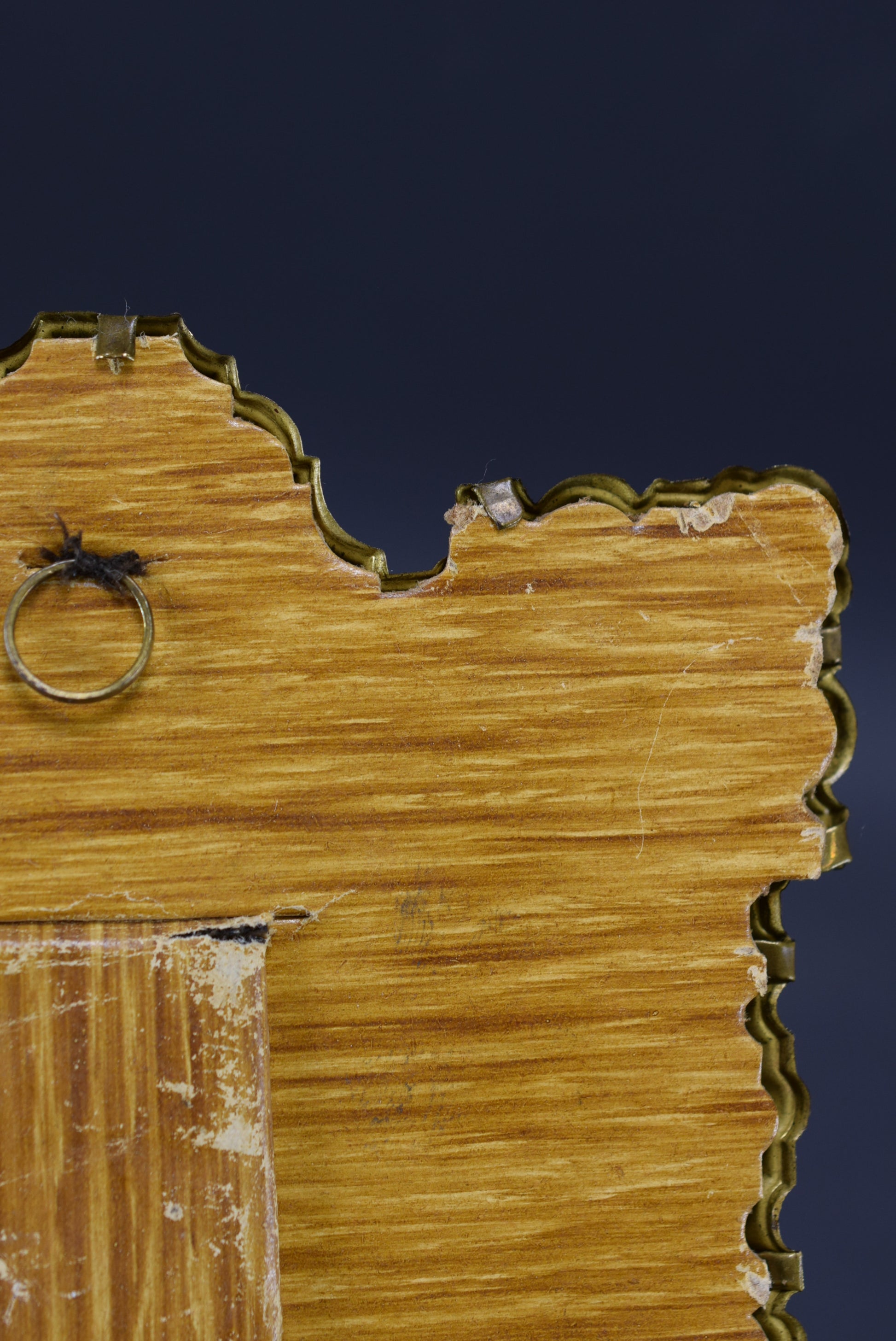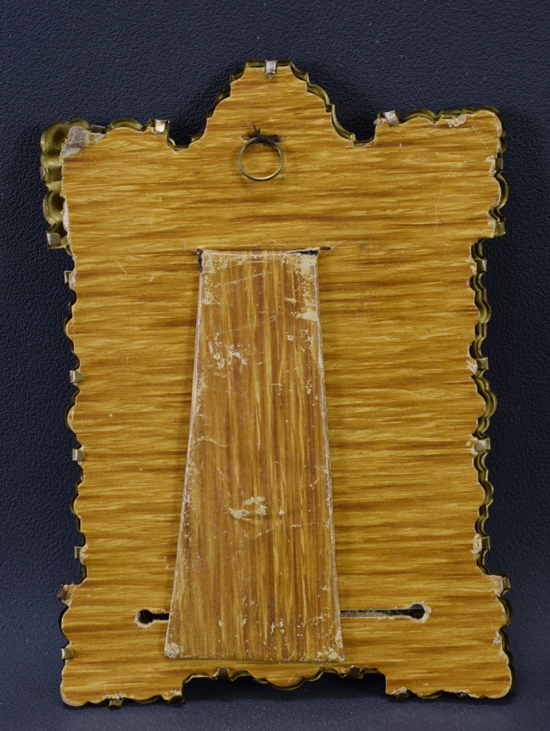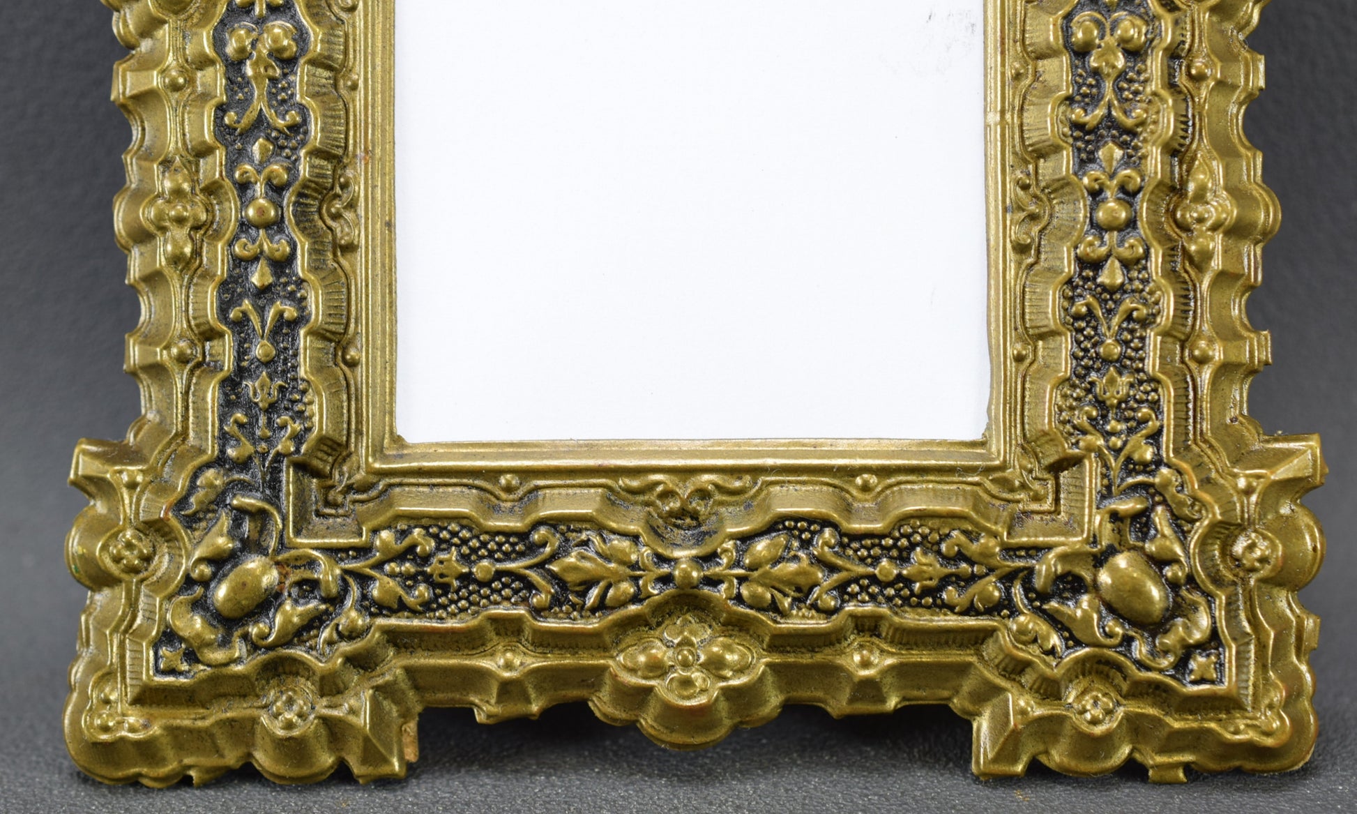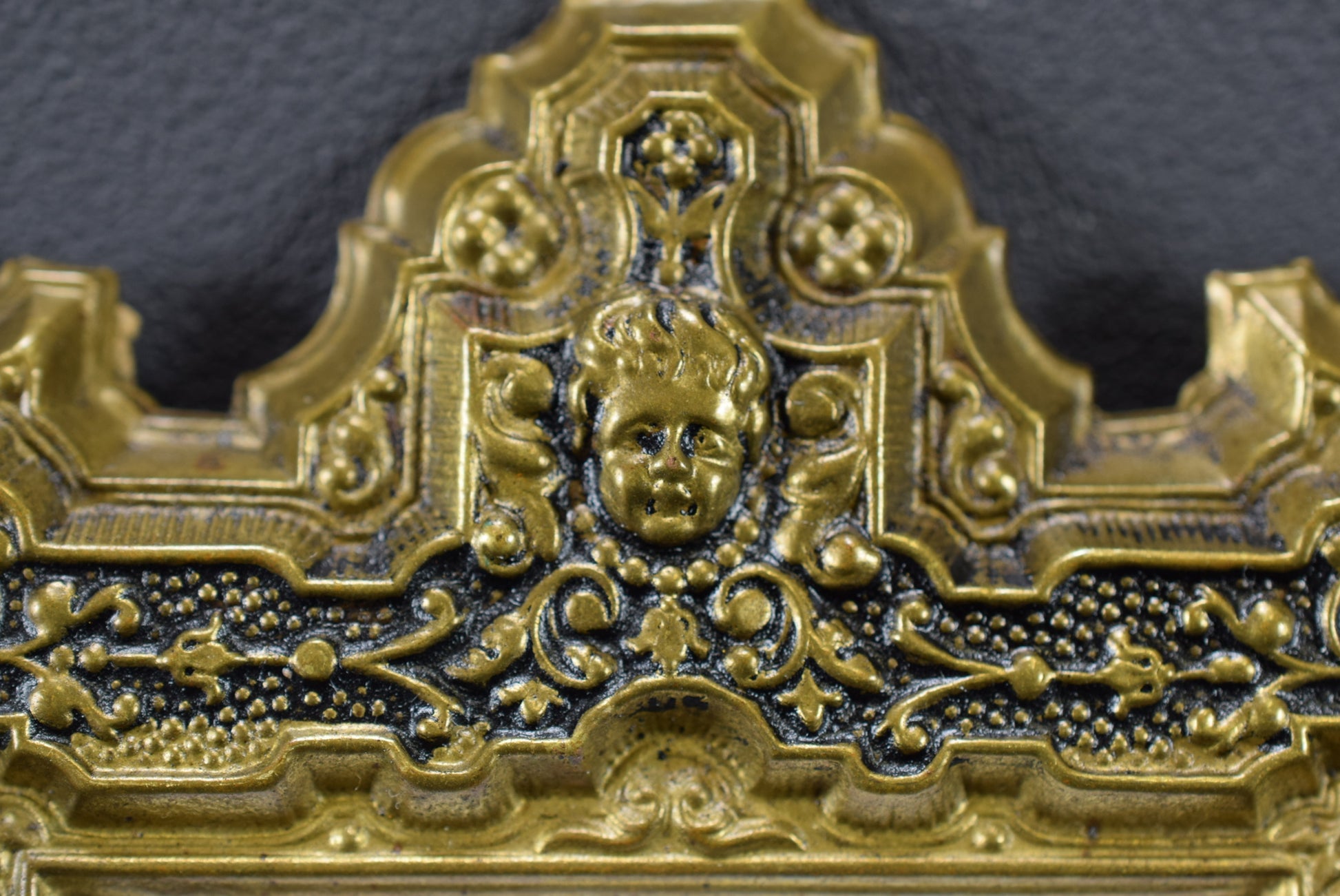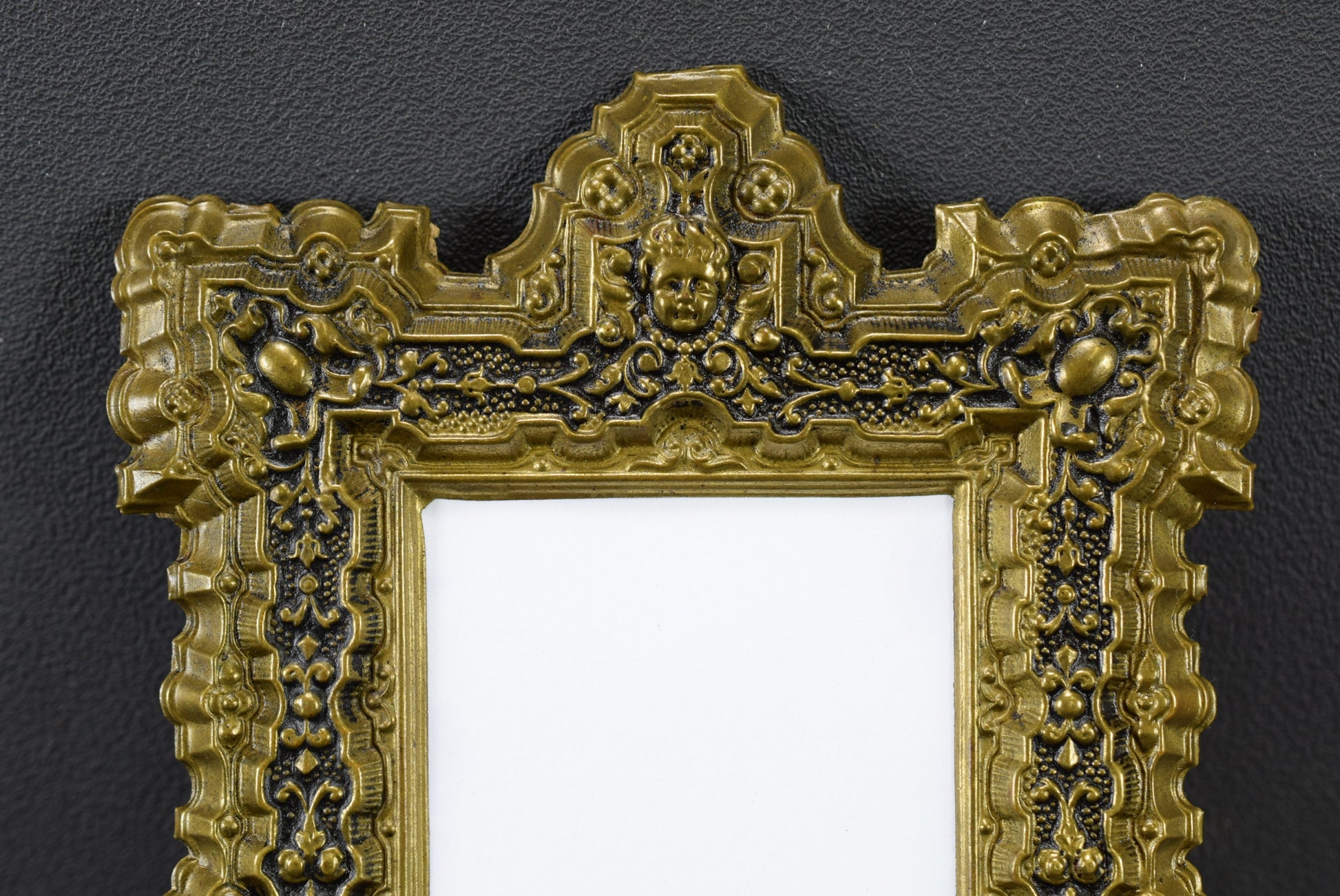 A French antique photo frame dating to the early 20th century. The light metal frame features a Victorian ornate decor with the head of an angel at the top . There is no glass pane. This beautiful small frame can be hung on a wall or put on a flat surface. It is charming.