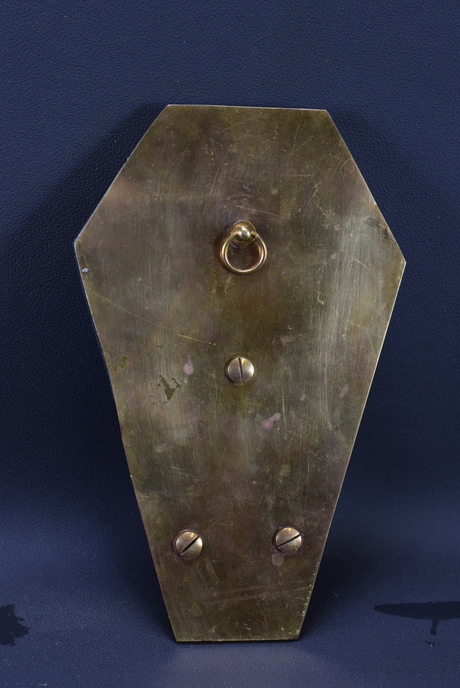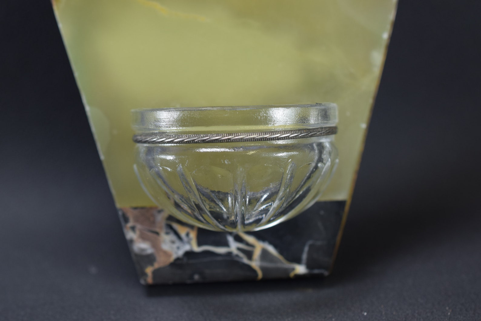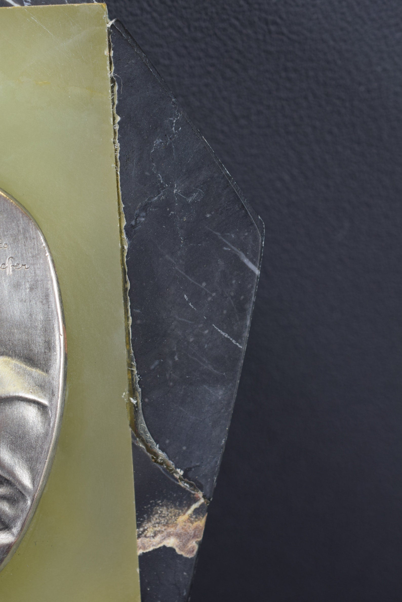 The medallion is mounted on a marble plaque made of green and black plaques. The water font is made of glass. The back is protected by a brass plaque.