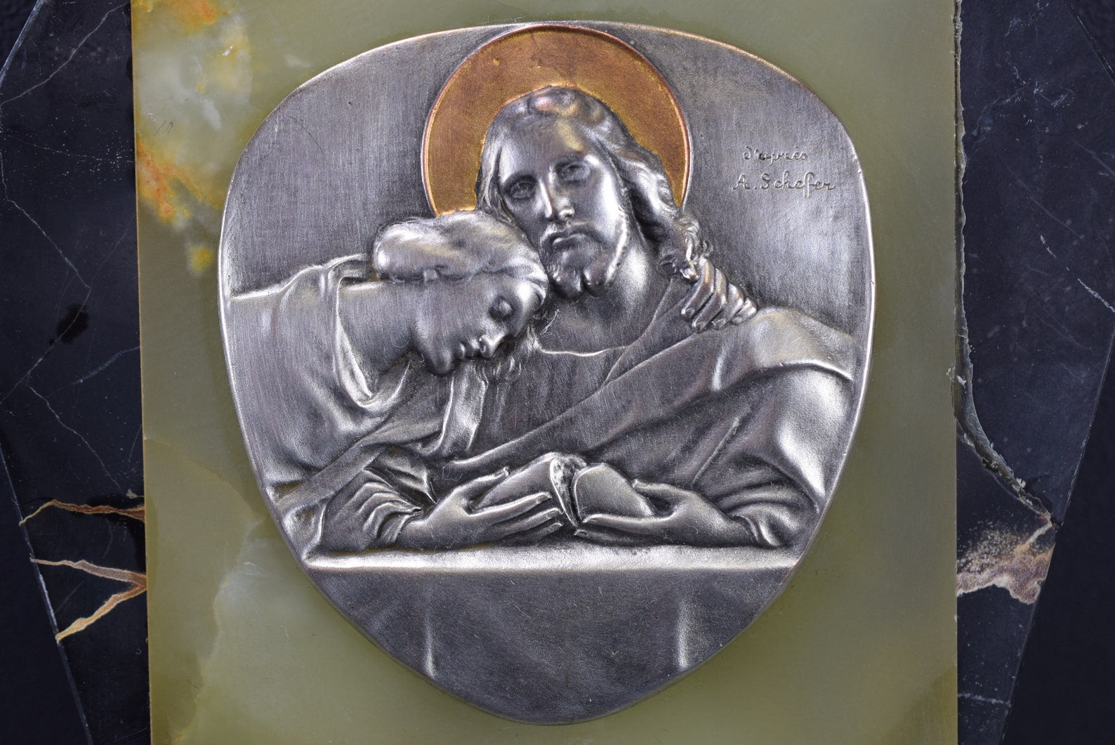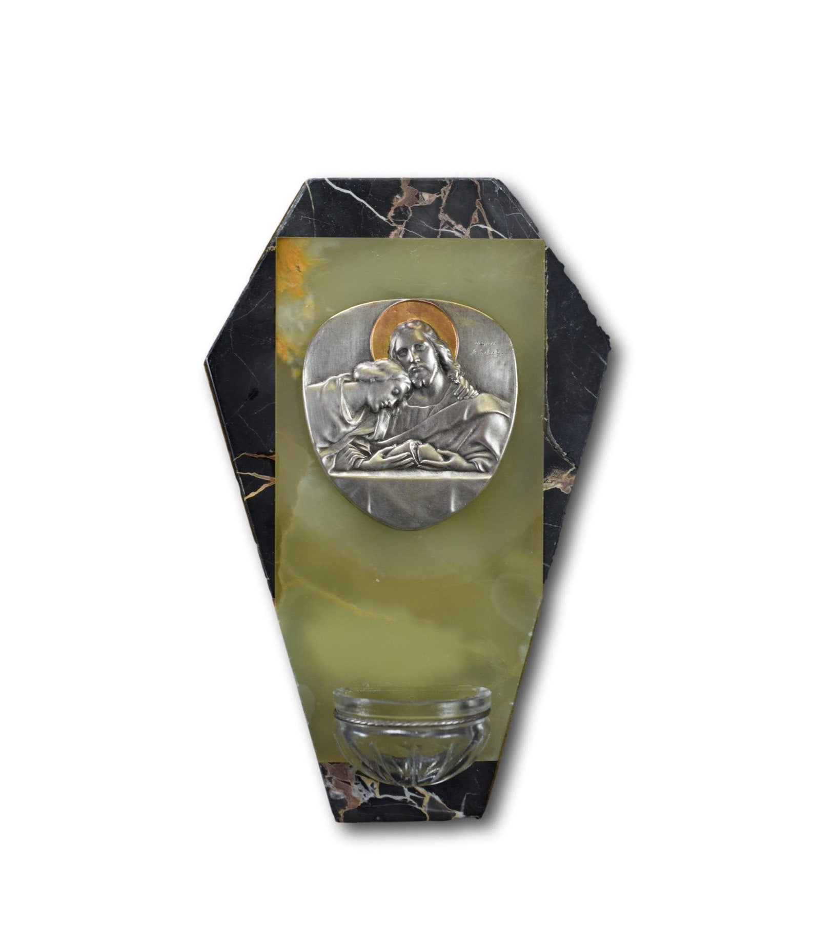 A fabulous French antique holy water font from the Art Deco period. The silver plated medallion finely features a beautiful portrait of Our Lord Jesus Christ and a communicant. This design has been after a painting of Ary Scheffer (1795-1858): a great painter of the 19th century.