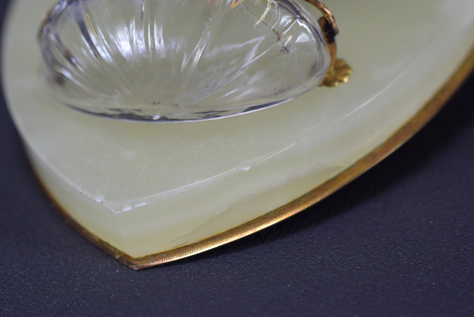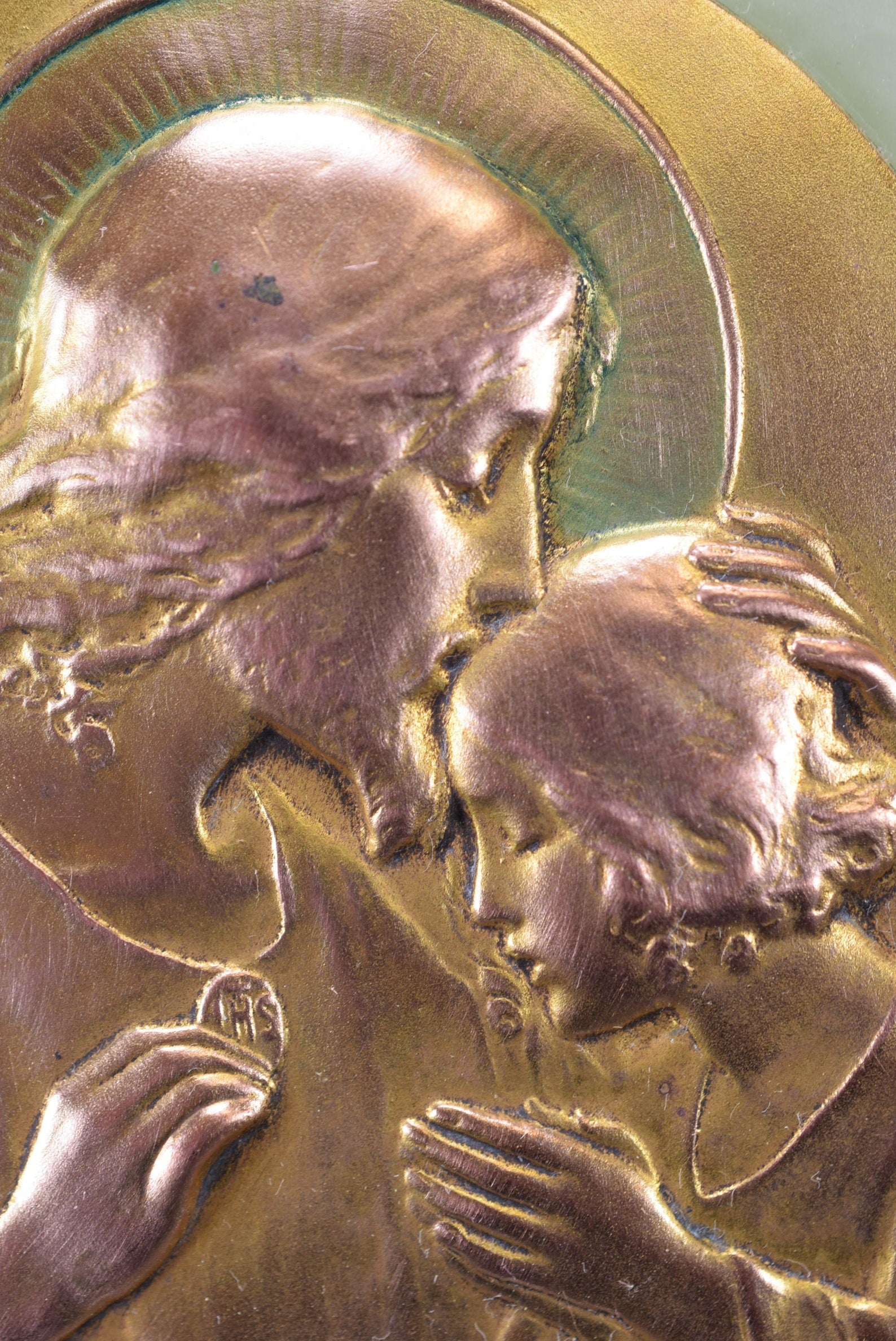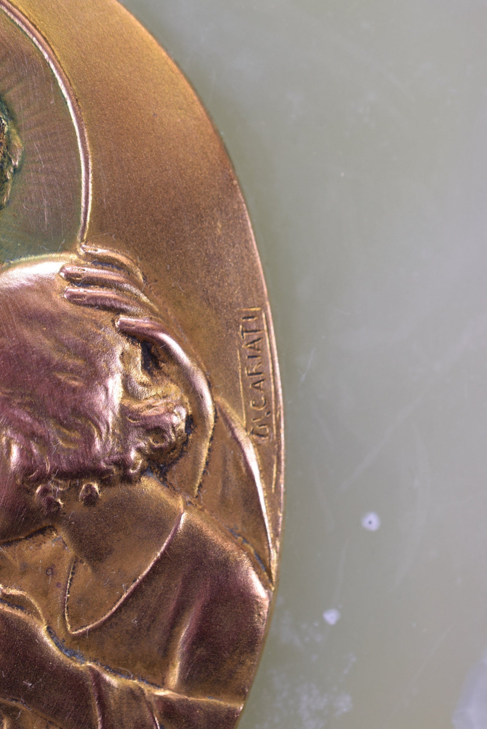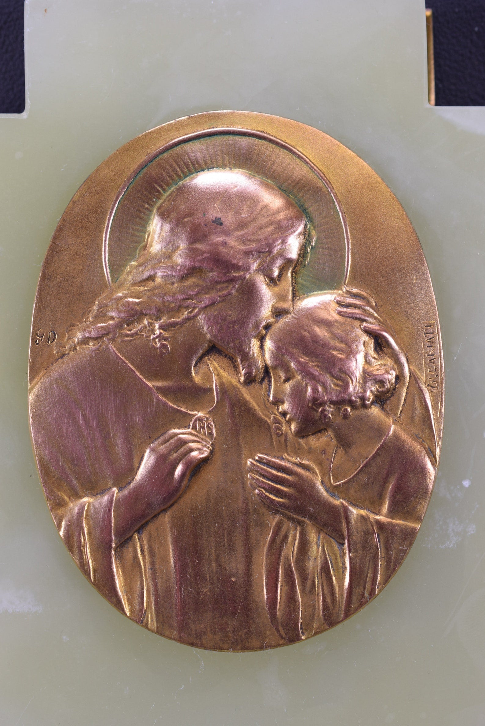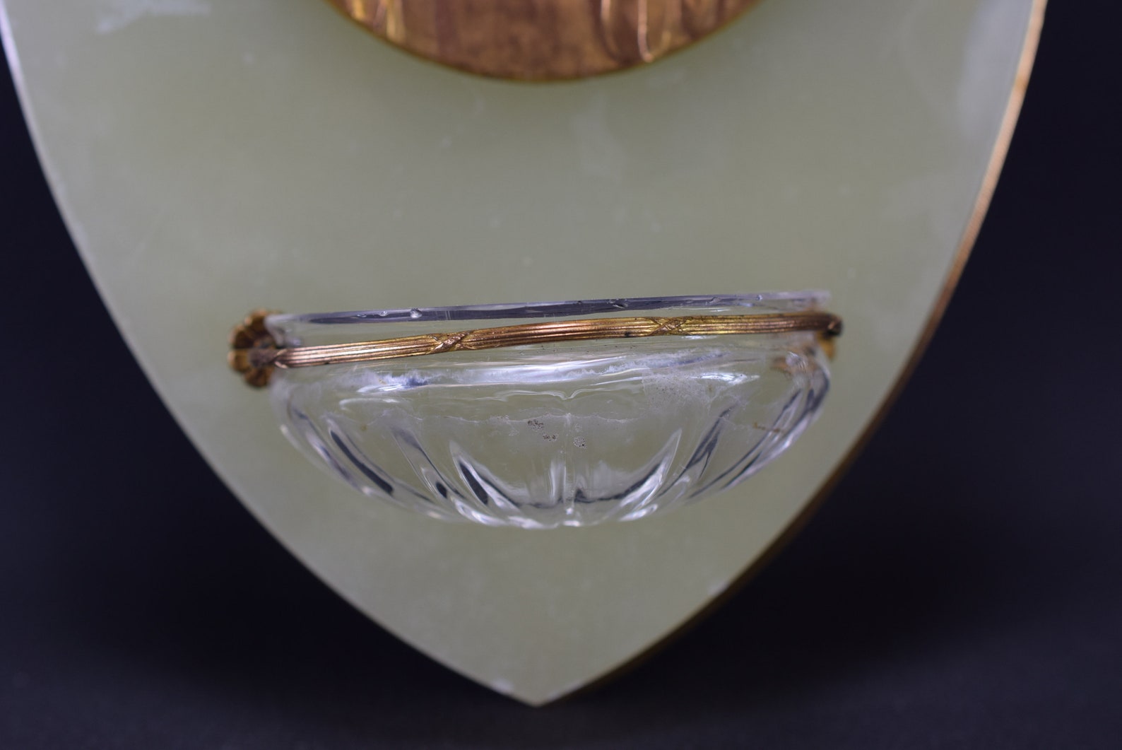 A fabulous French antique holy water font from the Art Deco period. The gold plated medallion finely features a beautiful portrait of Our Lord Jesus Christ and a communicant. This design has been signed G.Cariati. The Italian artist Giovanni Cariati (1865-1917) exhibited his bronze sculptures at the Salon of Paris in 1906, then in New York in 1912 and 1913. Just a few years later, he became American.The medallion is mounted on a marble plaque. The water font is made of glass. The back is protected by a brass plaque.