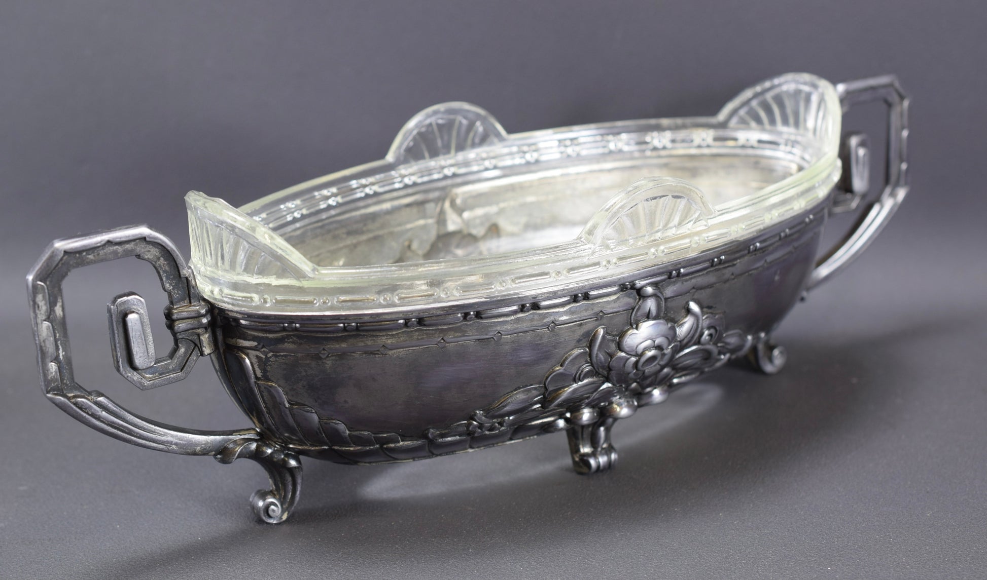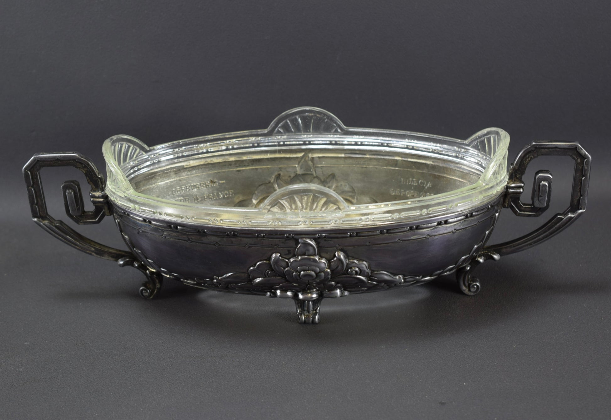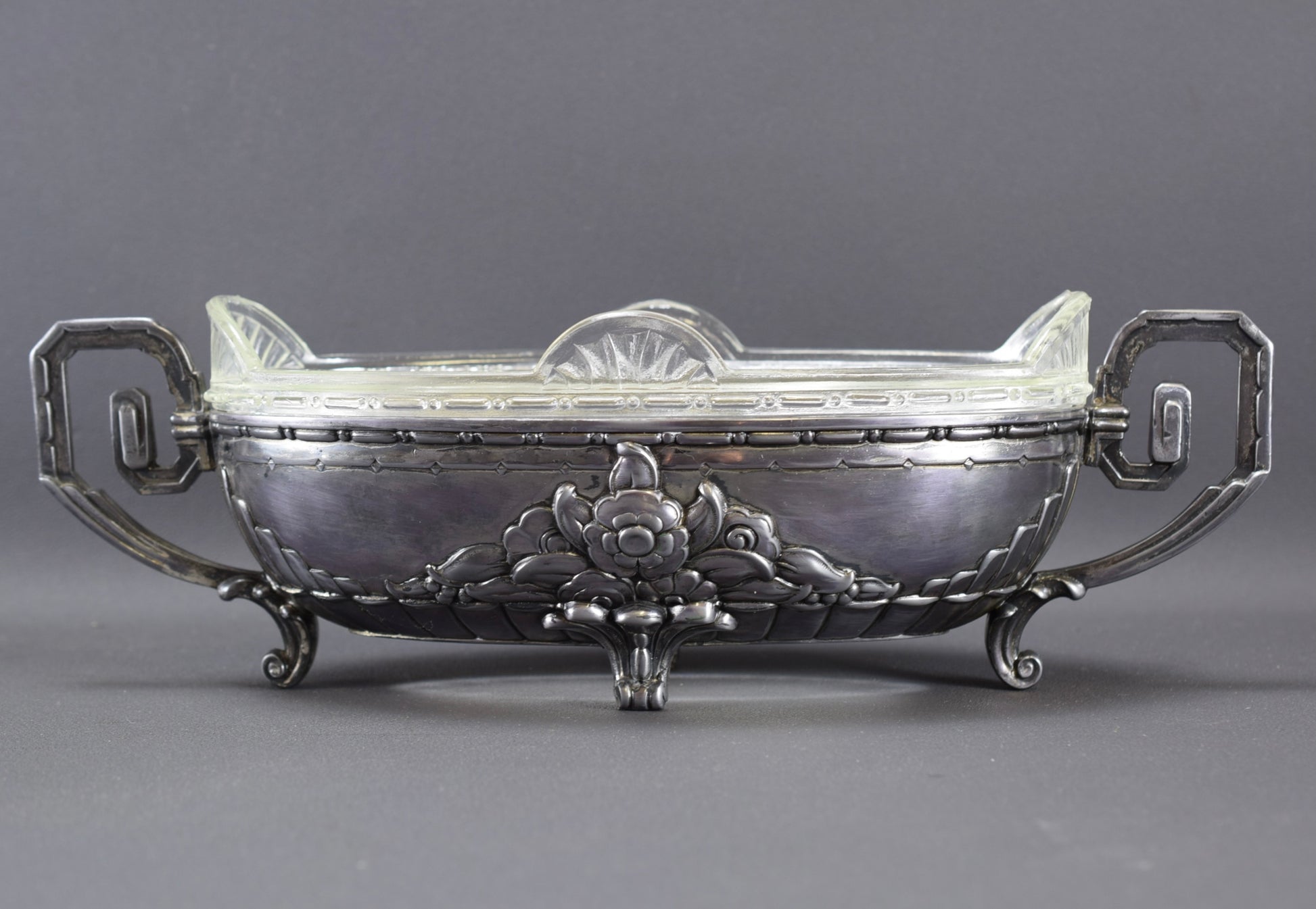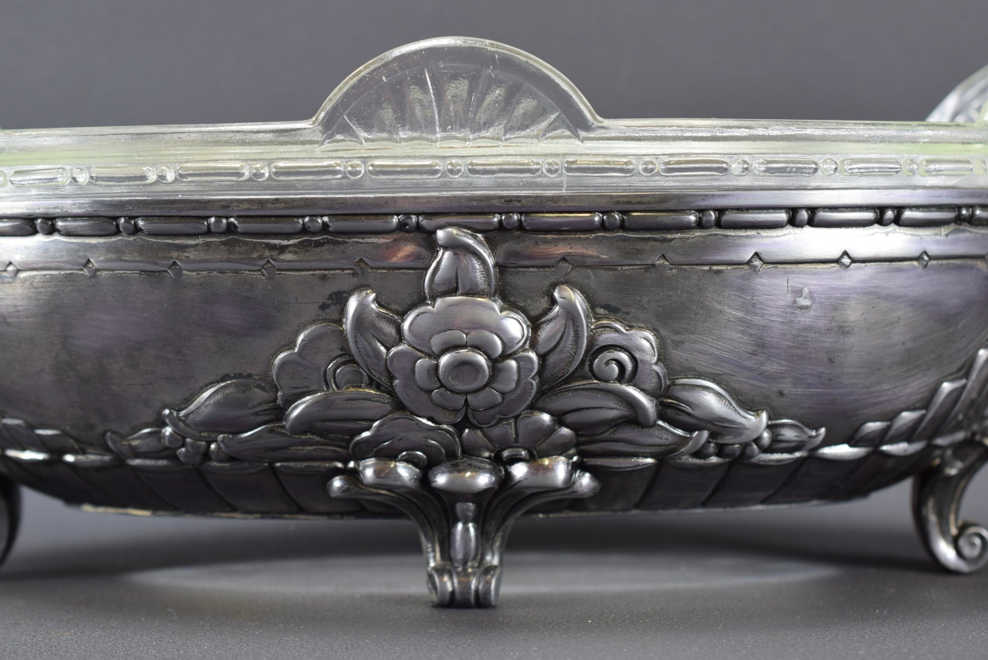 An antique French centerpiece or jardiniere de table, from the Art Deco period, made of silver plated metal . The jardiniere is finely decorated with stylized flowers. The liner is made of transparent glass. It has been produced by the silversmithery Dilecta. This lovely centerpiece would add a charming Art Deco touch to your home.