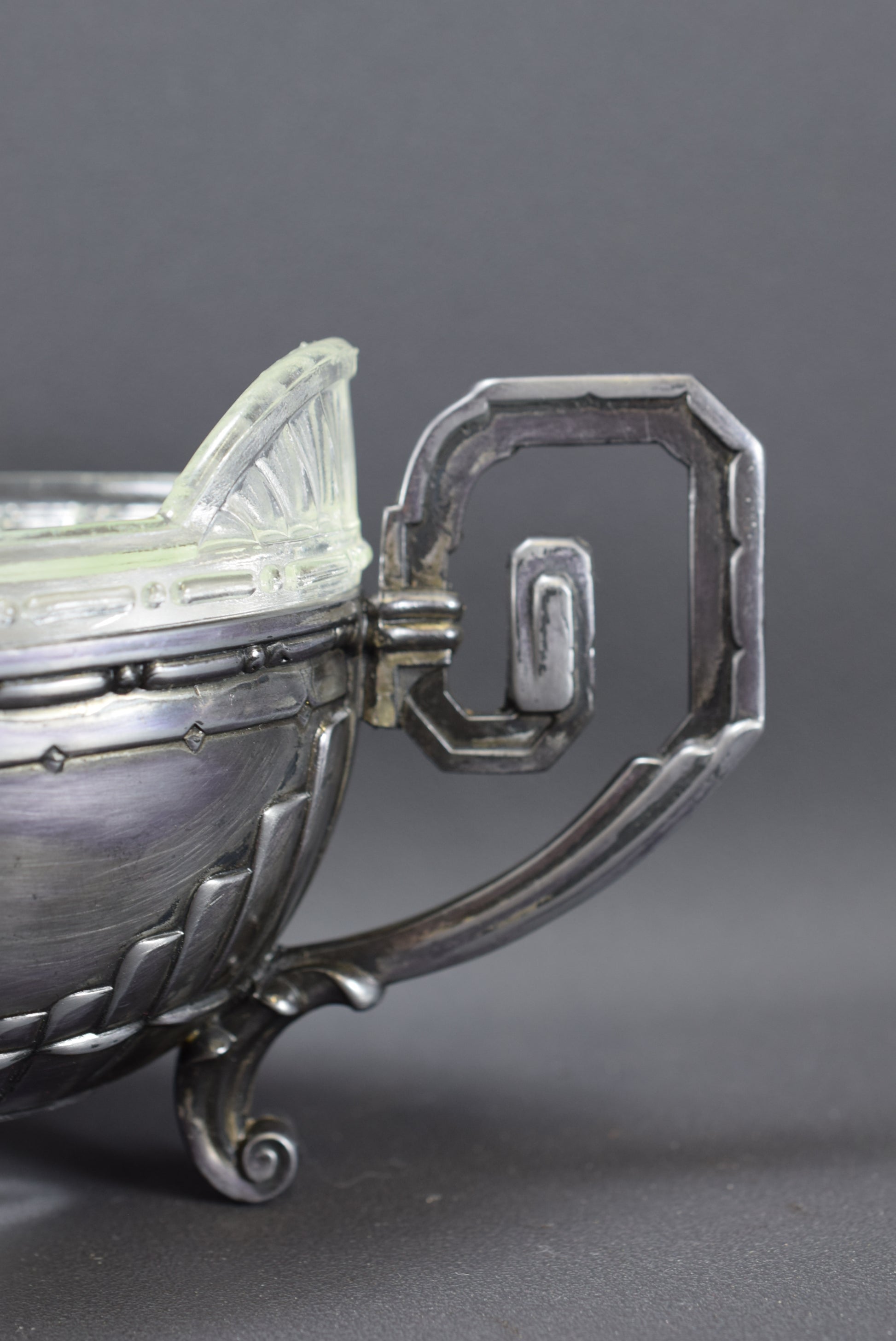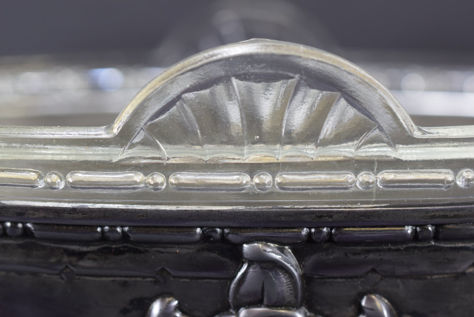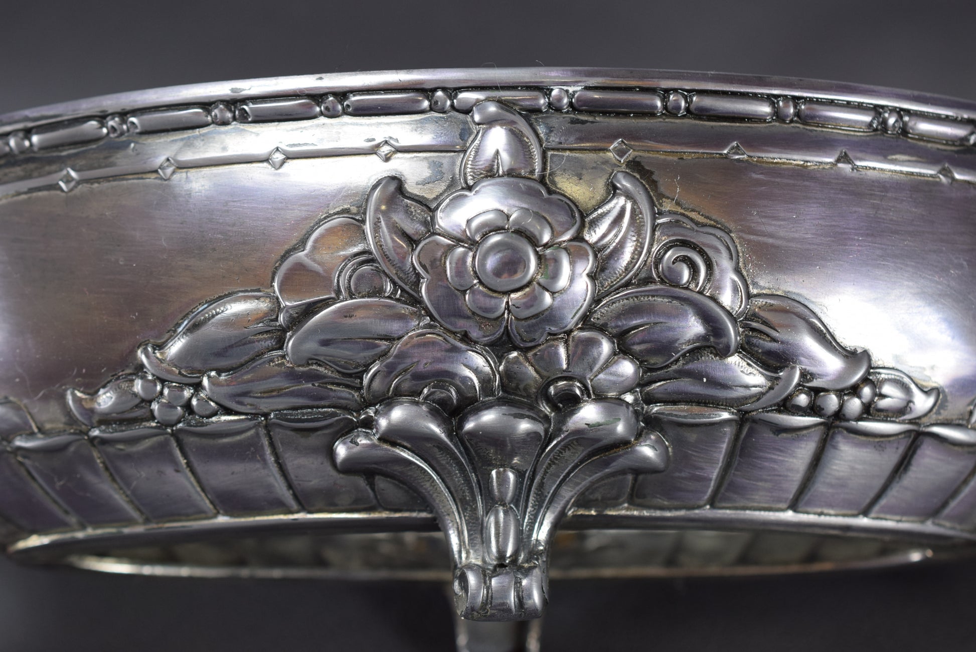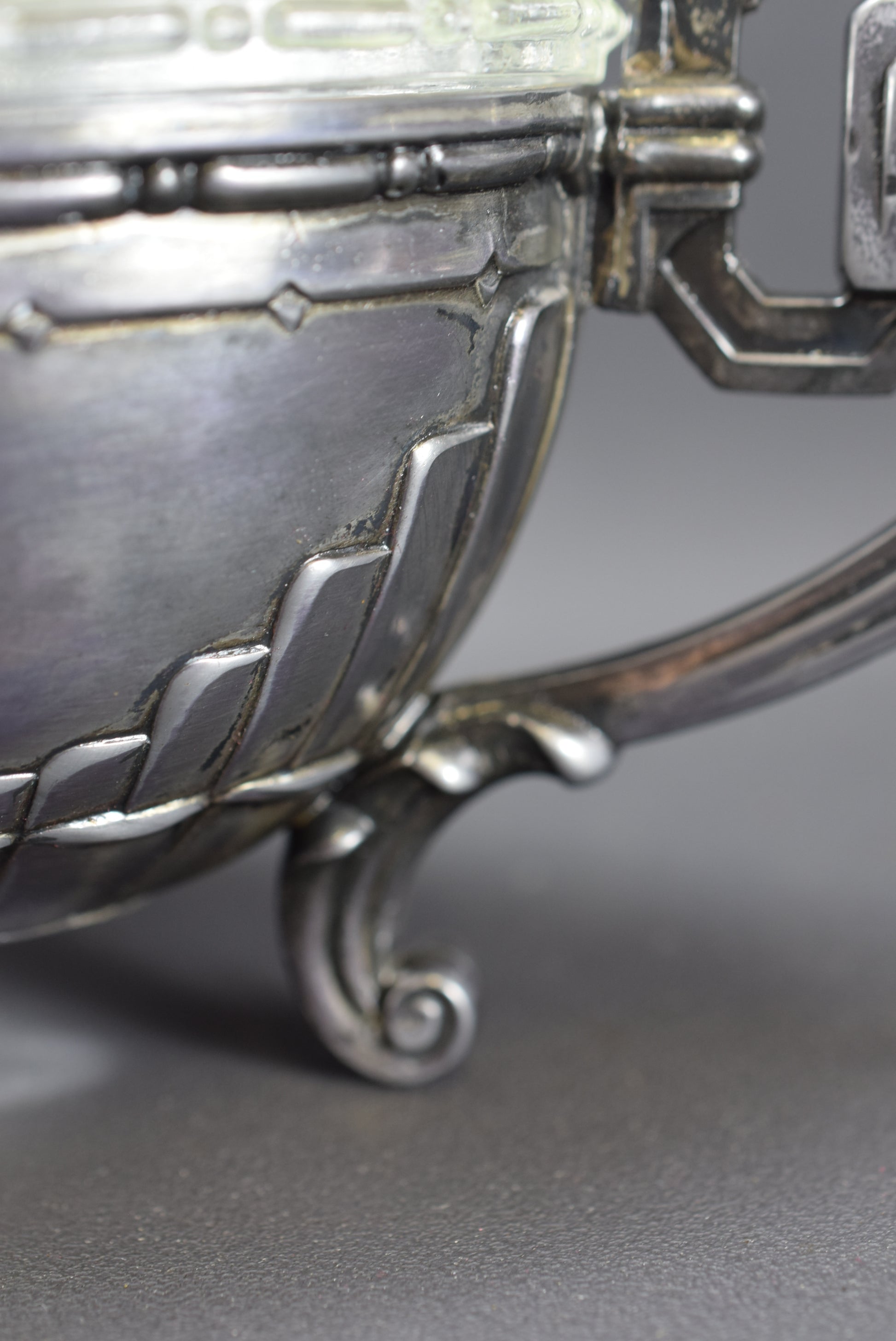 An antique French centerpiece or jardiniere de table, from the Art Deco period, made of silver plated metal . The jardiniere is finely decorated with stylized flowers. The liner is made of transparent glass. It has been produced by the silversmithery Dilecta. This lovely centerpiece would add a charming Art Deco touch to your home.