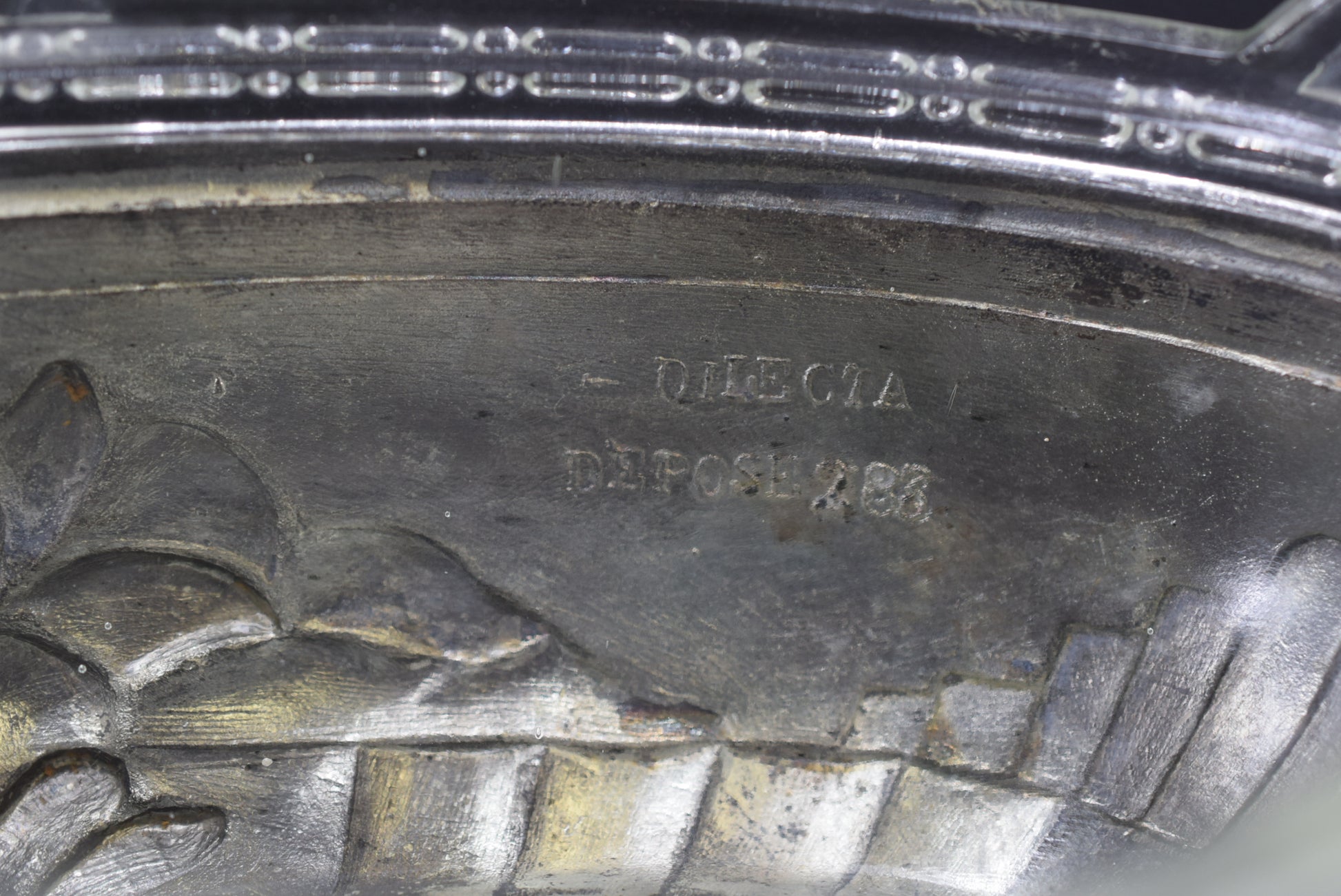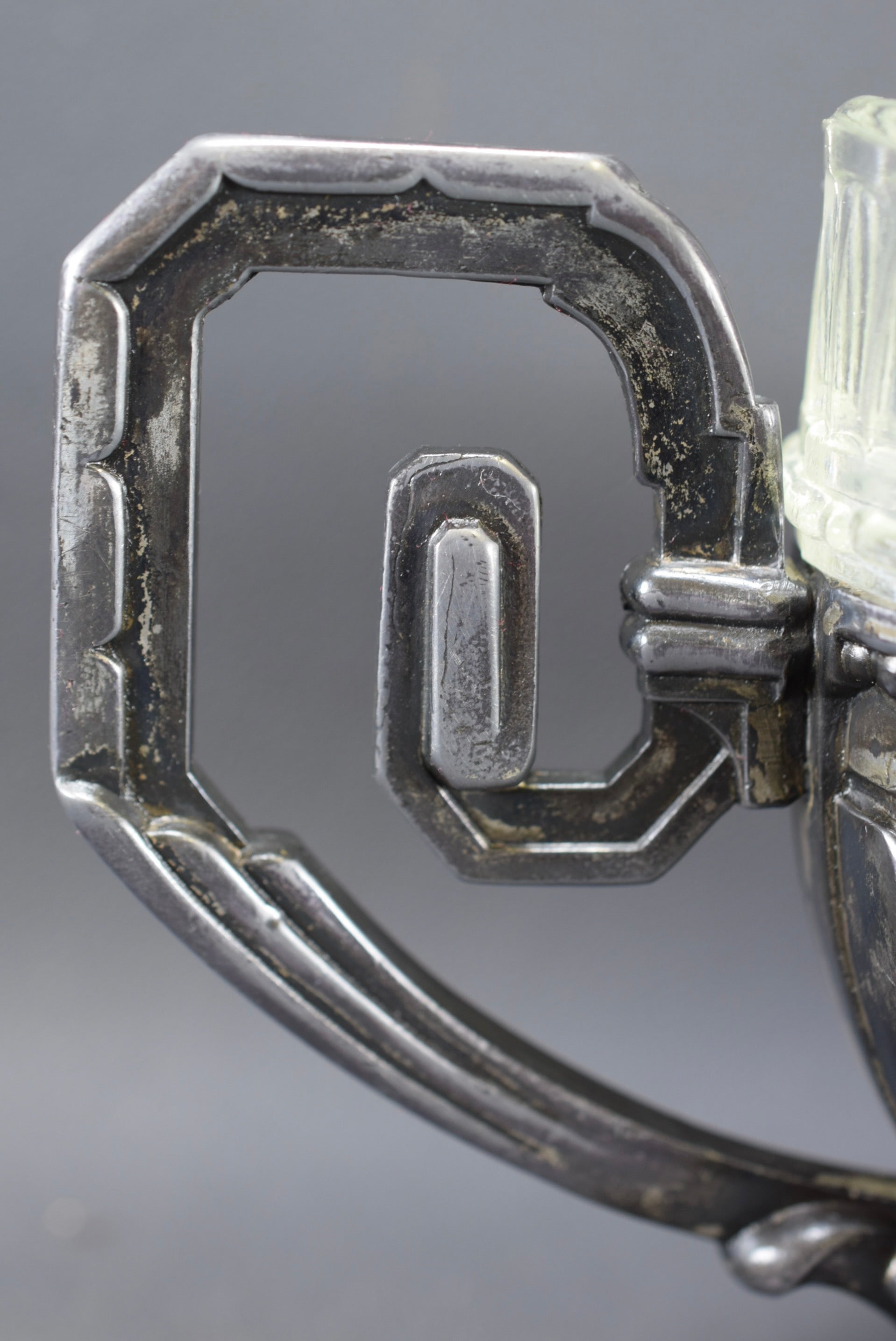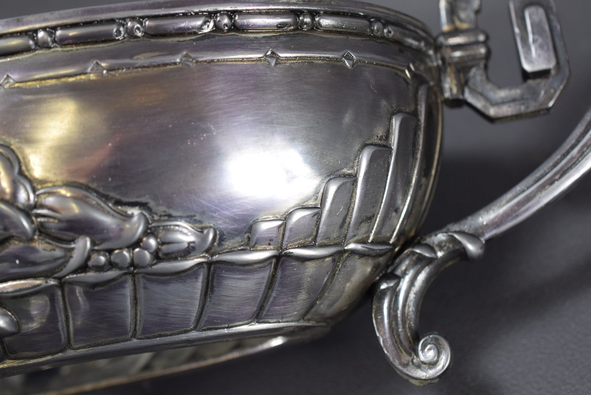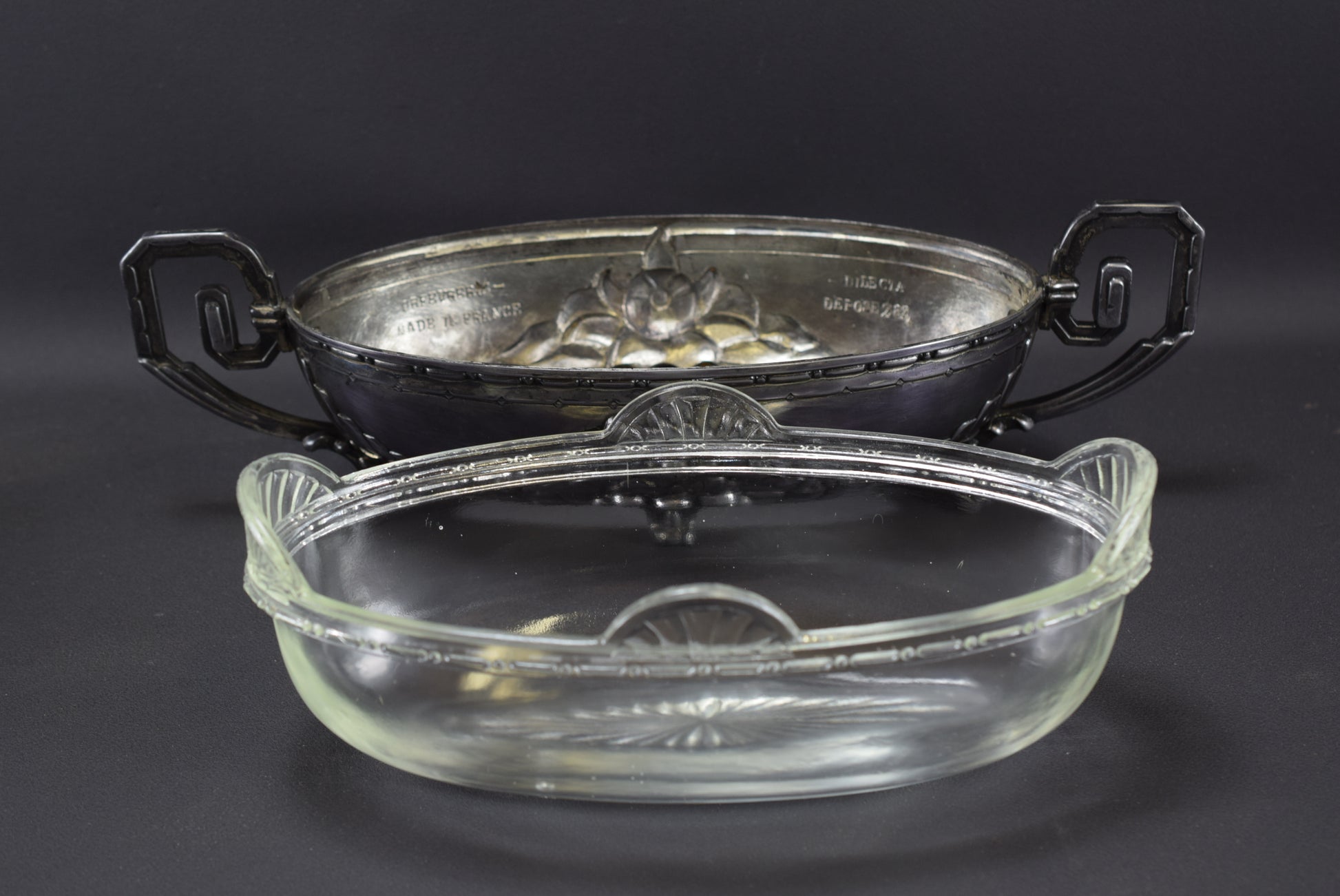 An antique French centerpiece or jardiniere de table, from the Art Deco period, made of silver plated metal . The jardiniere is finely decorated with stylized flowers. The liner is made of transparent glass. It has been produced by the silversmithery Dilecta. This lovely centerpiece would add a charming Art Deco touch to your home.