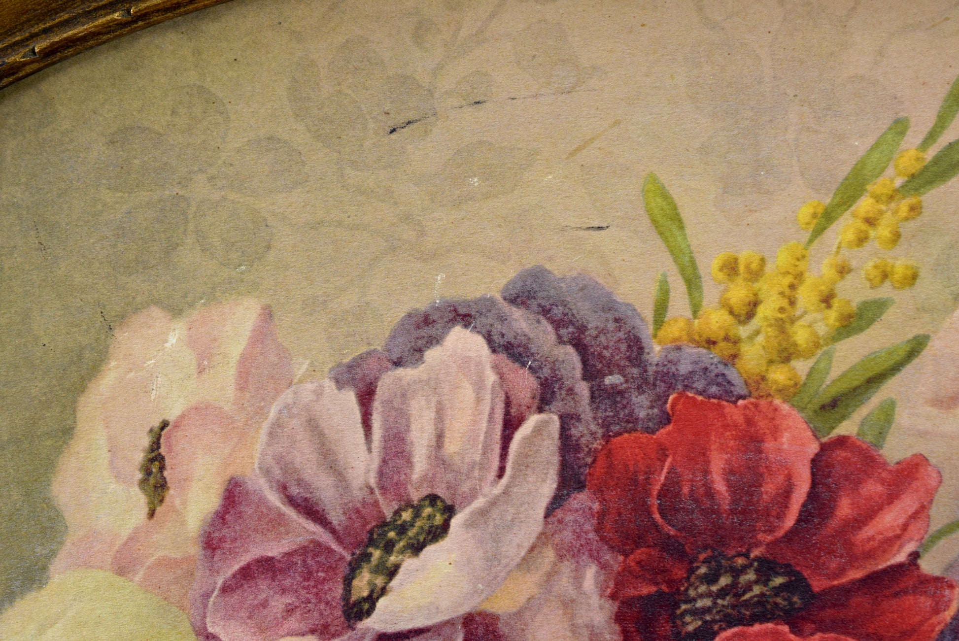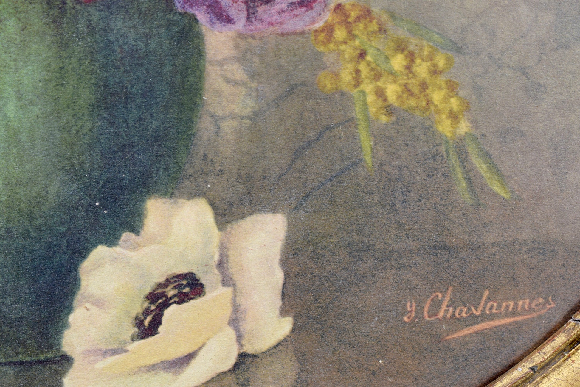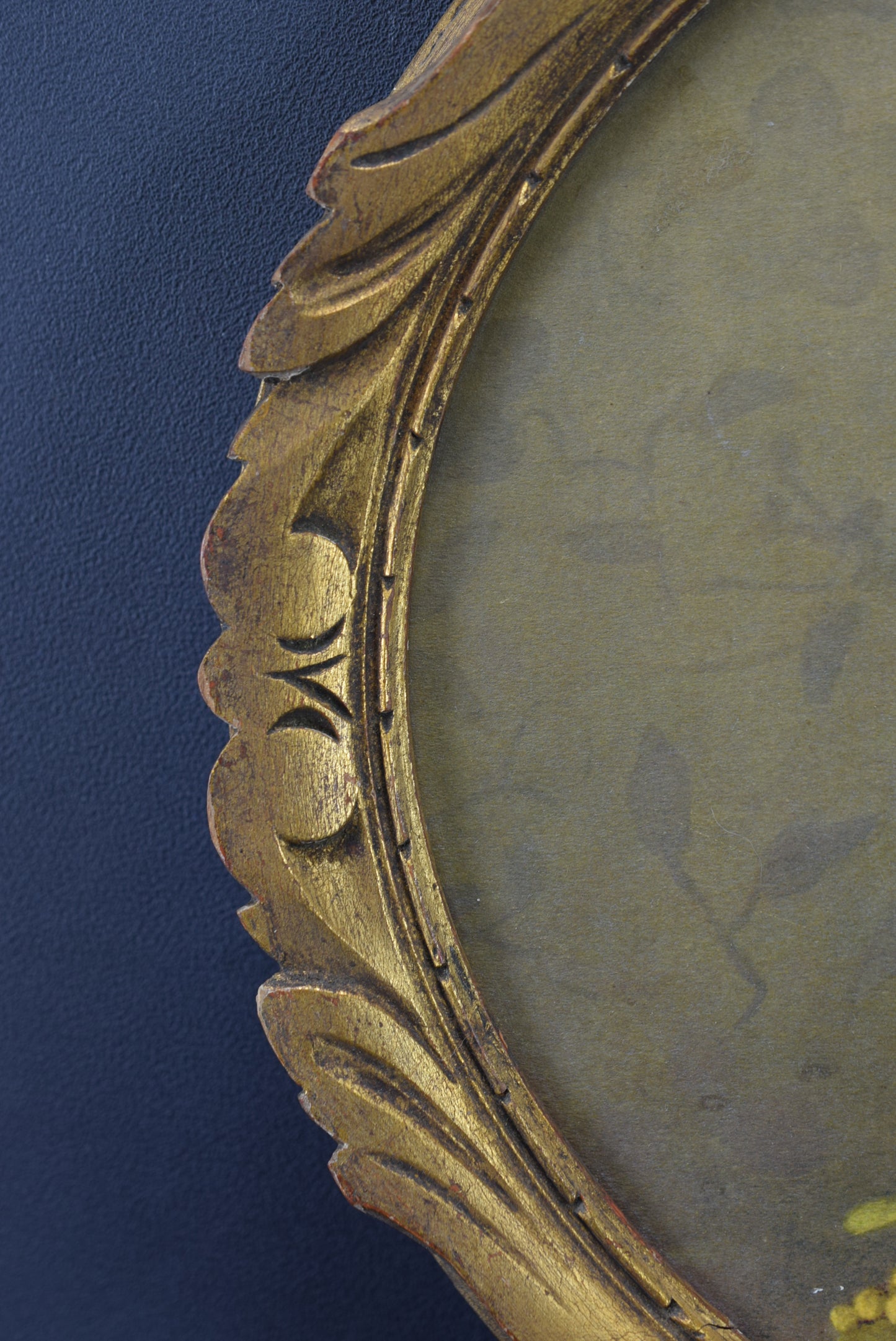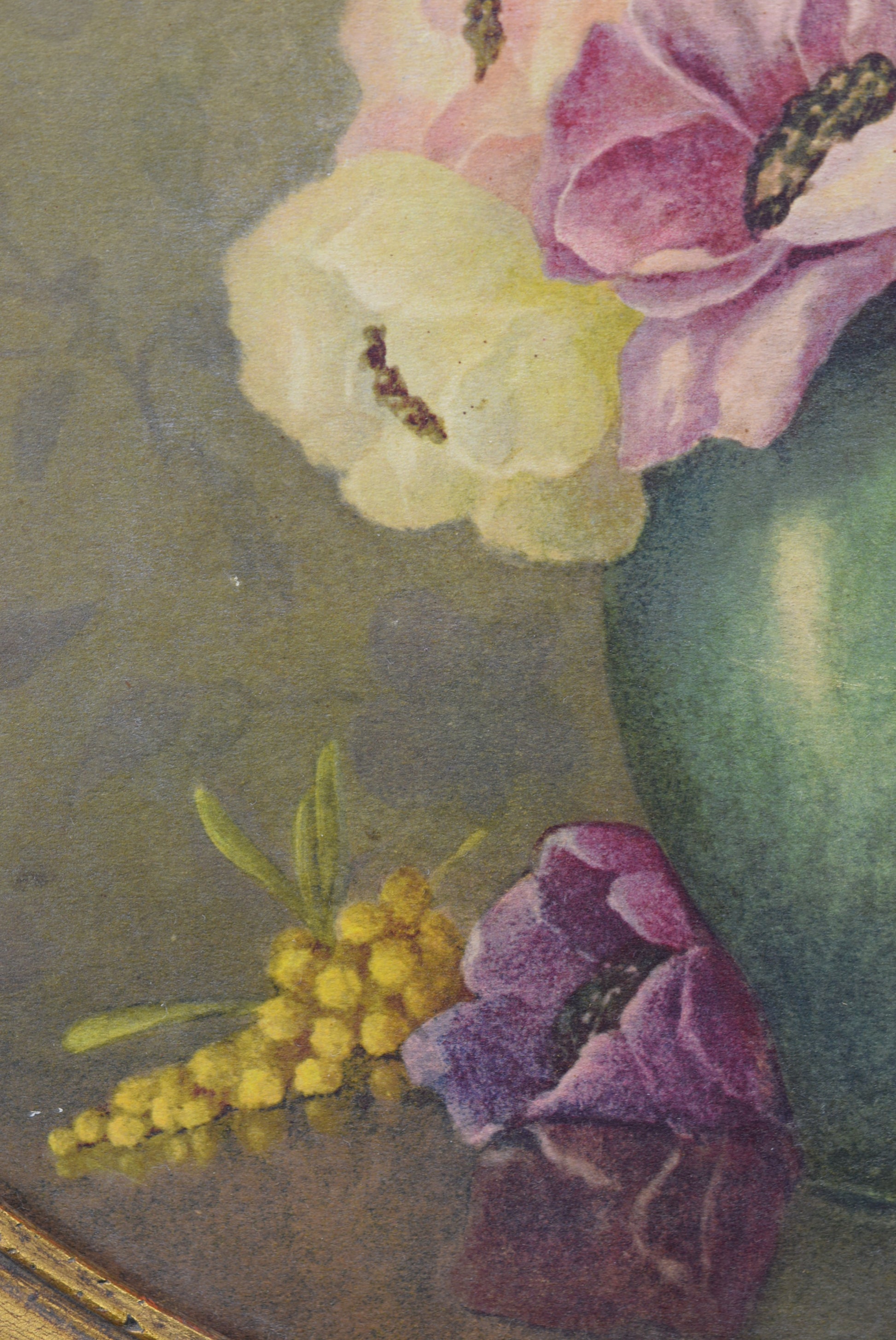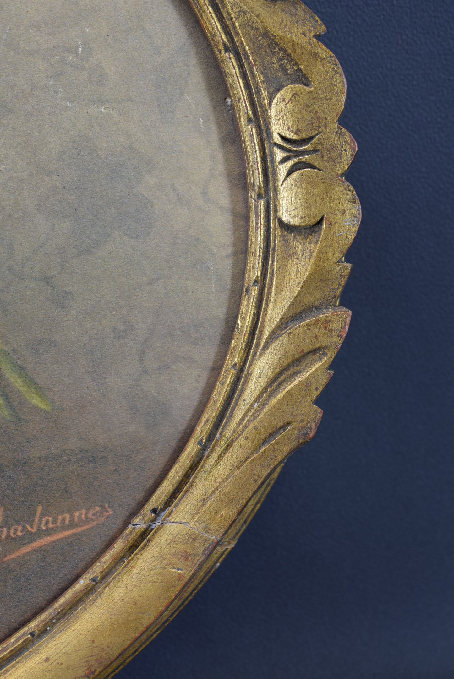 A French Art Deco style painting photo frame made of hand carved gilt wood, dating to the 1940's. It is currently framing a beautiful print depicting a floral still life signed Y Chavannes. This oval Art Deco frame is charming.