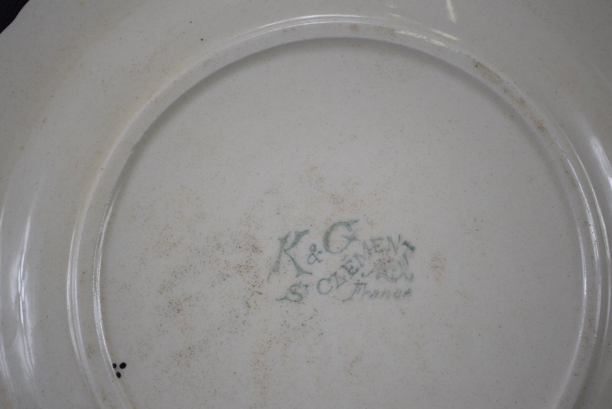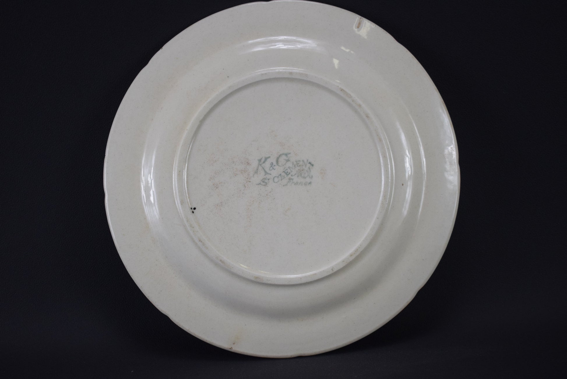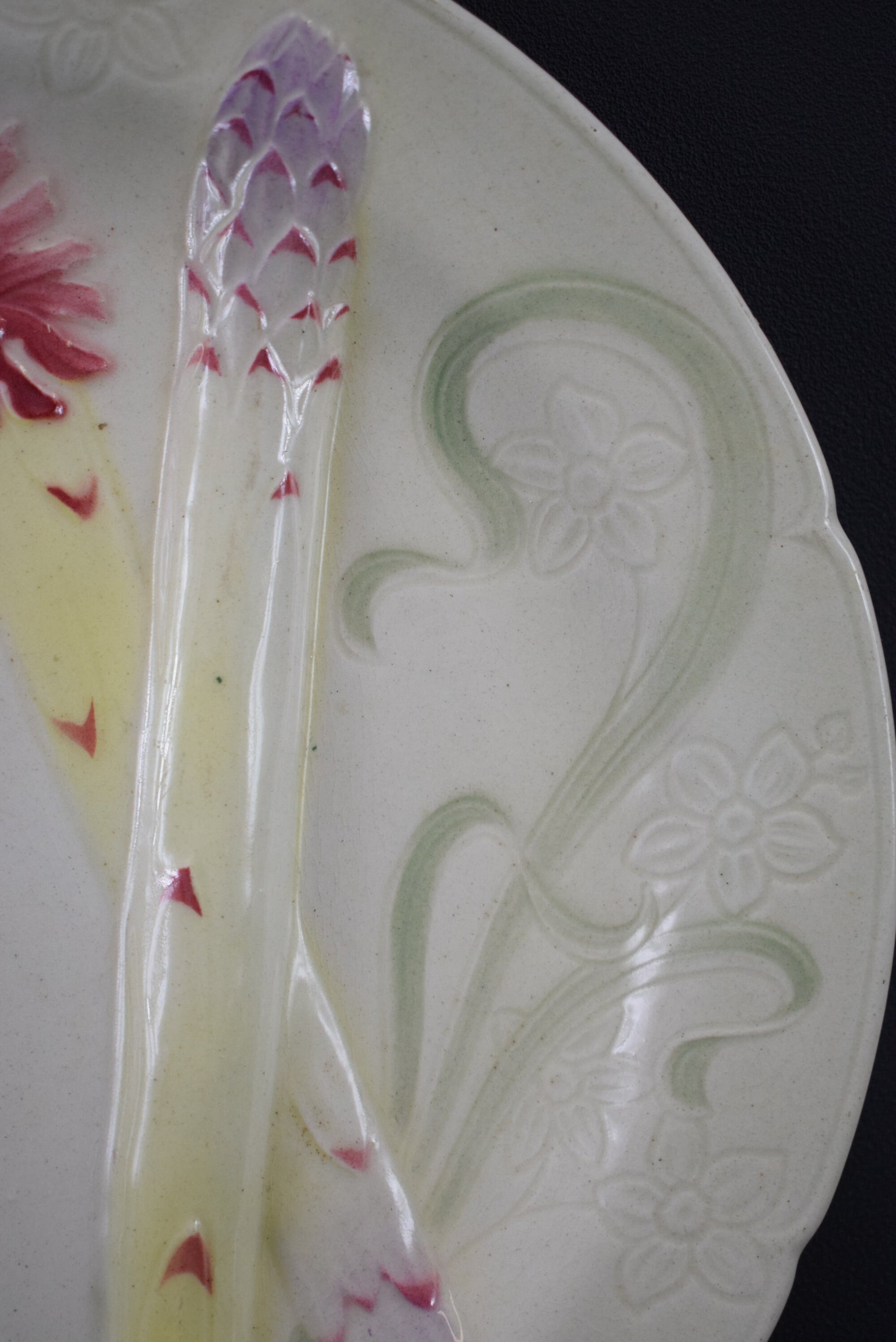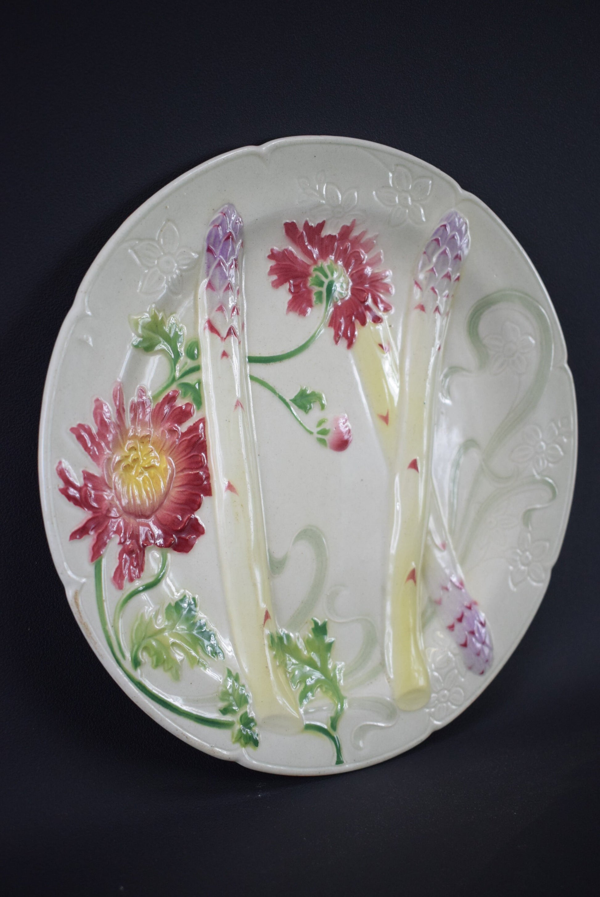 A fabulous French antique majolica asparagus plate dating to the 1900's. The Art Nouveau decor depicts three asparagus and flowers. This beautiful asparagus dish has been produced by Keller & Guerin St Clement. It bears its black stamp on the back.