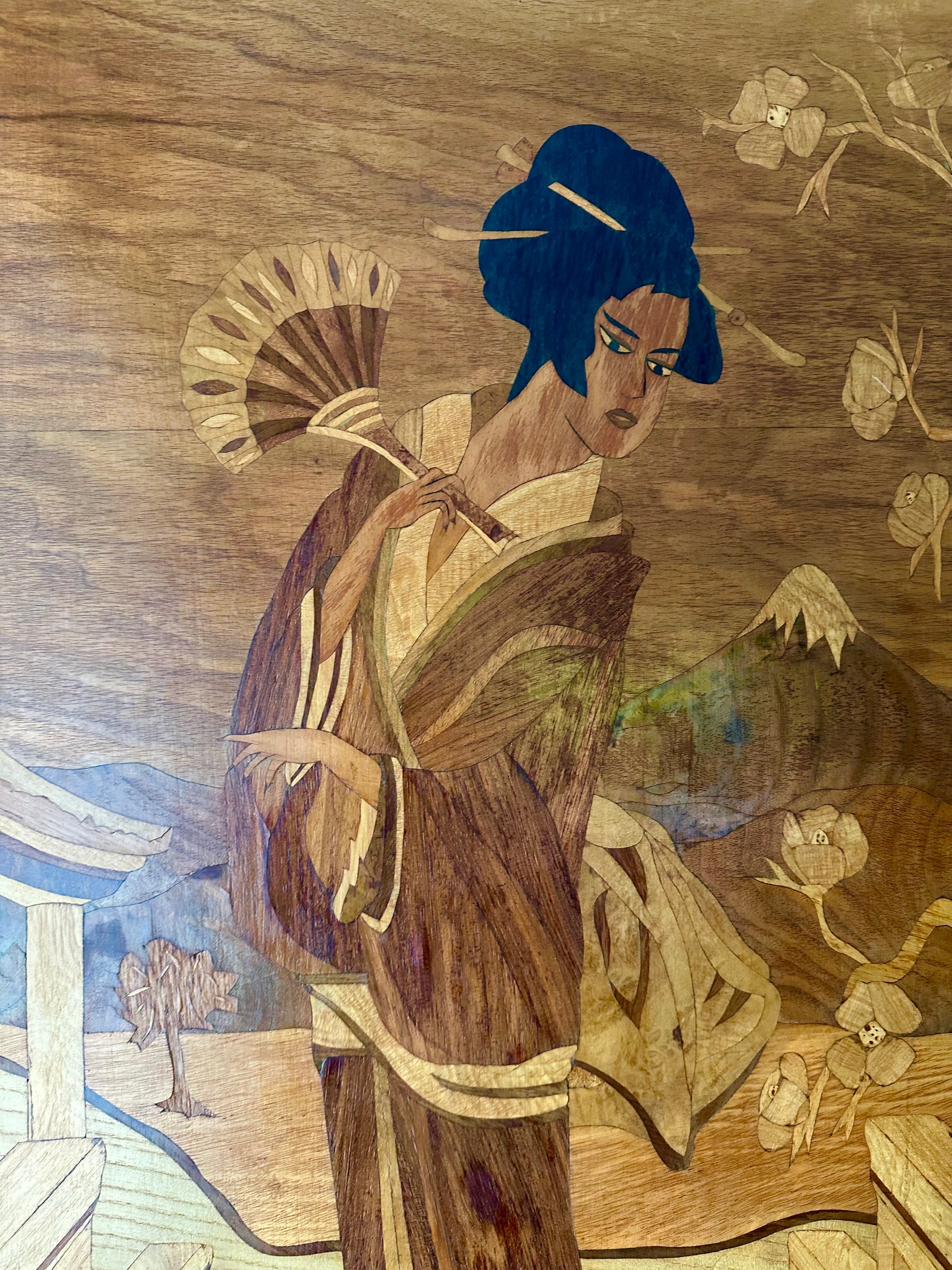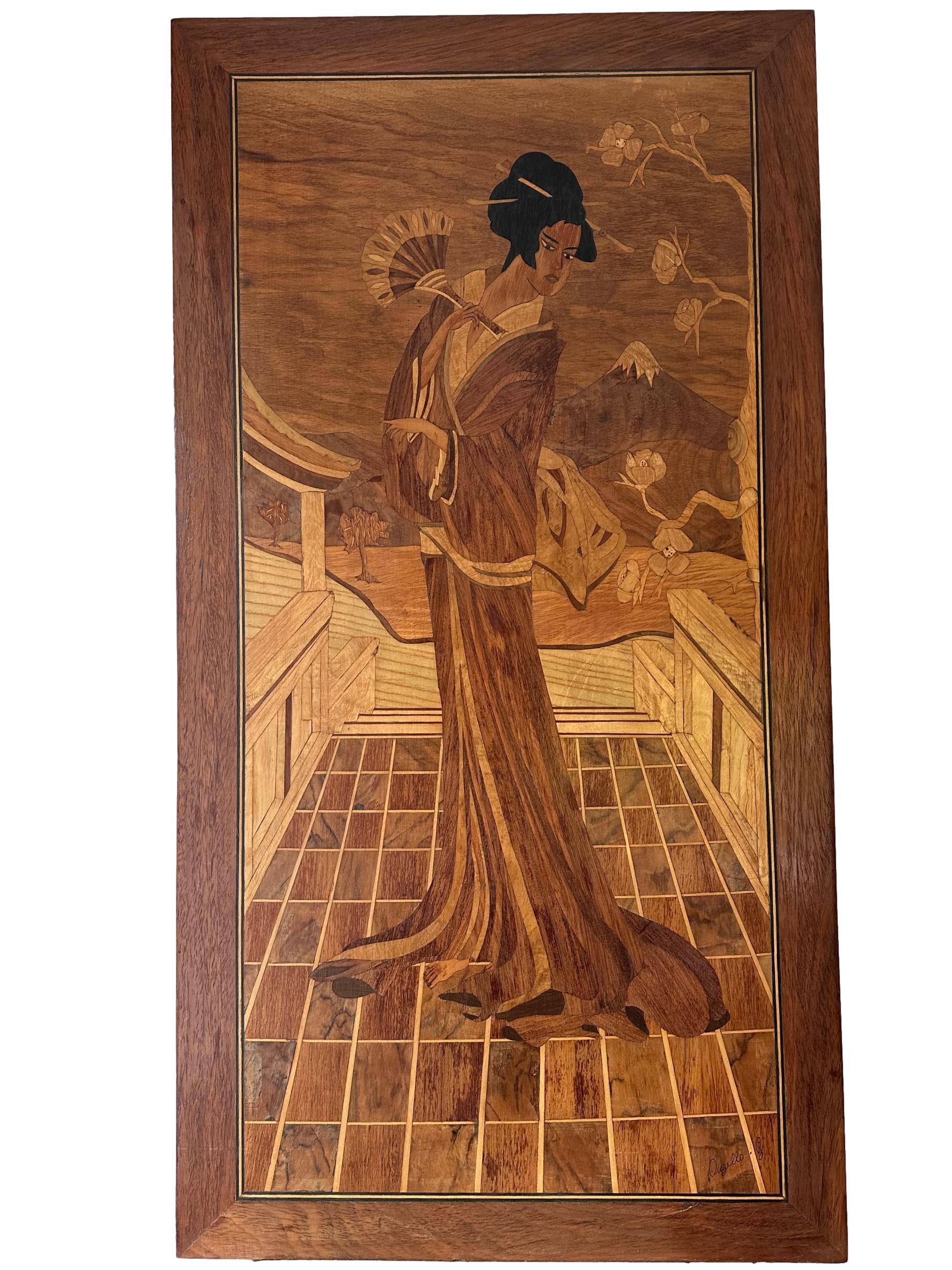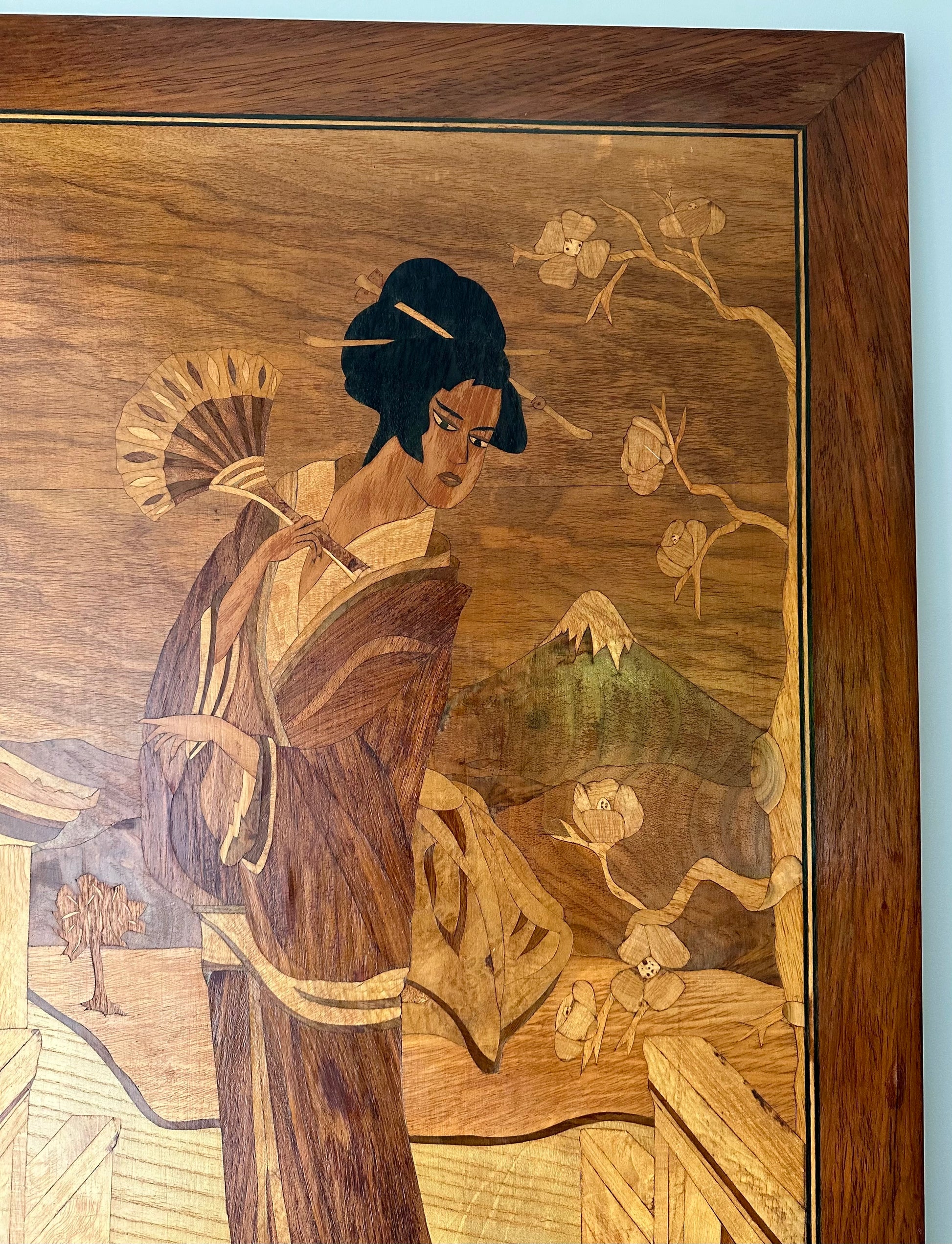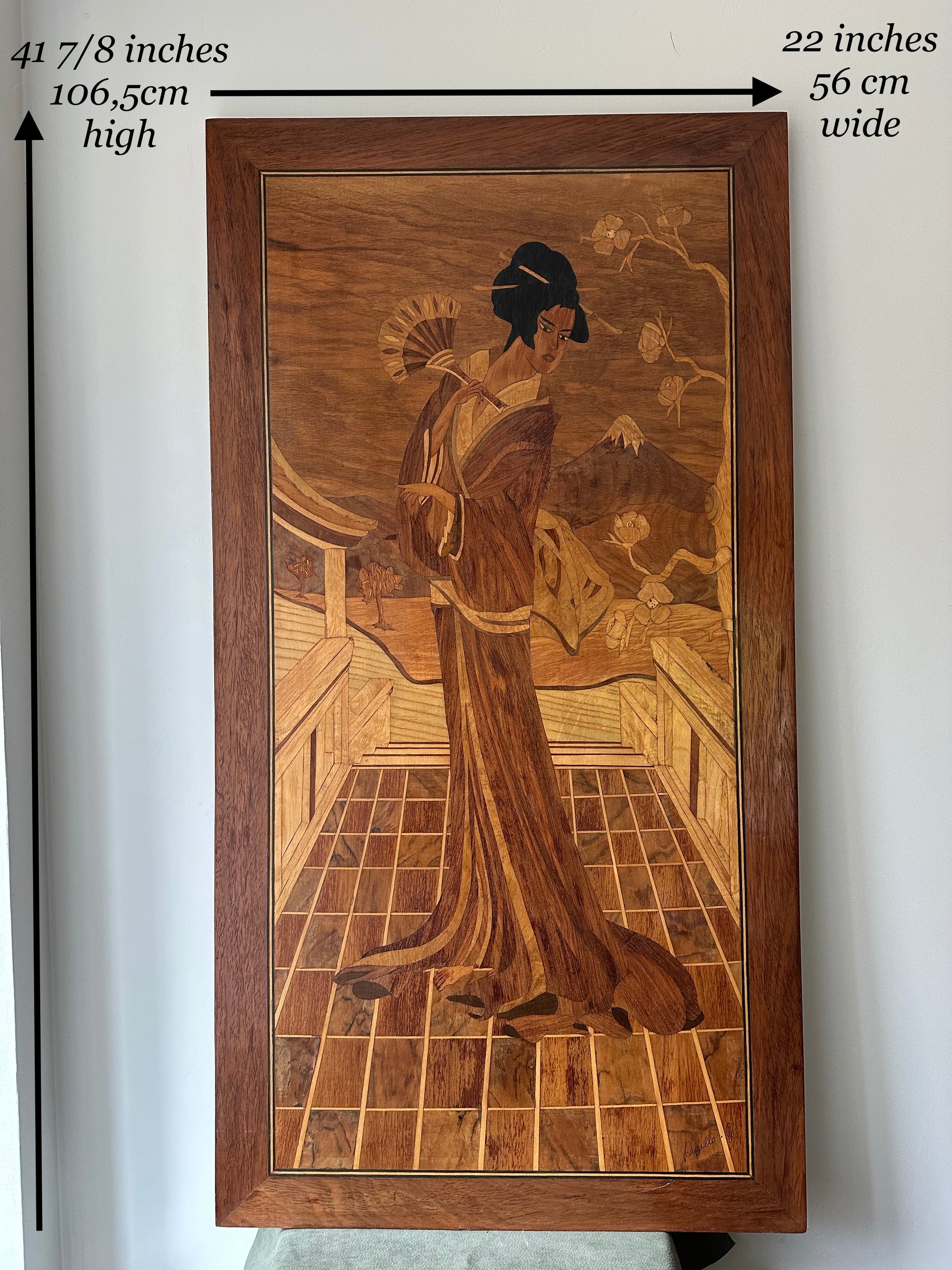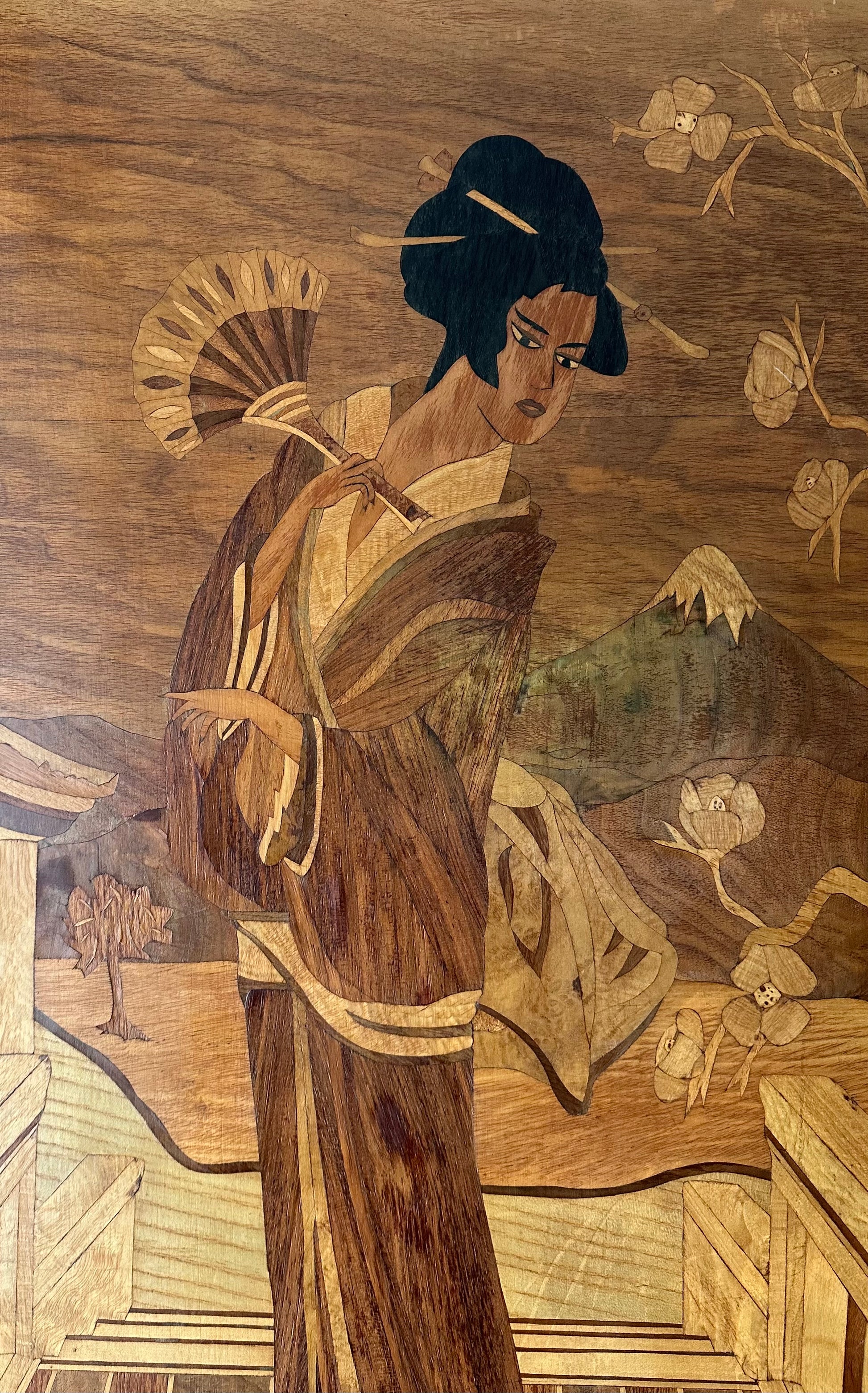 A beautiful vintage marquetry panel depicting the Art Nouveau style portrait of a Japanese woman holding a fan. The large wooden picture has been totally handcrafted from small pieces of wood to create a picture. This art is named: marquetry. "Marquetry (also spelled as marqueterie; from the French marqueter, to varigate) is the art and craft of applying pieces of veneer to a structure to form decorative patterns, designs or pictures." This large wall art panel measures 41 7/8 inches high. Highly decorative, it's a one-of-a-kind piece not to be missed
