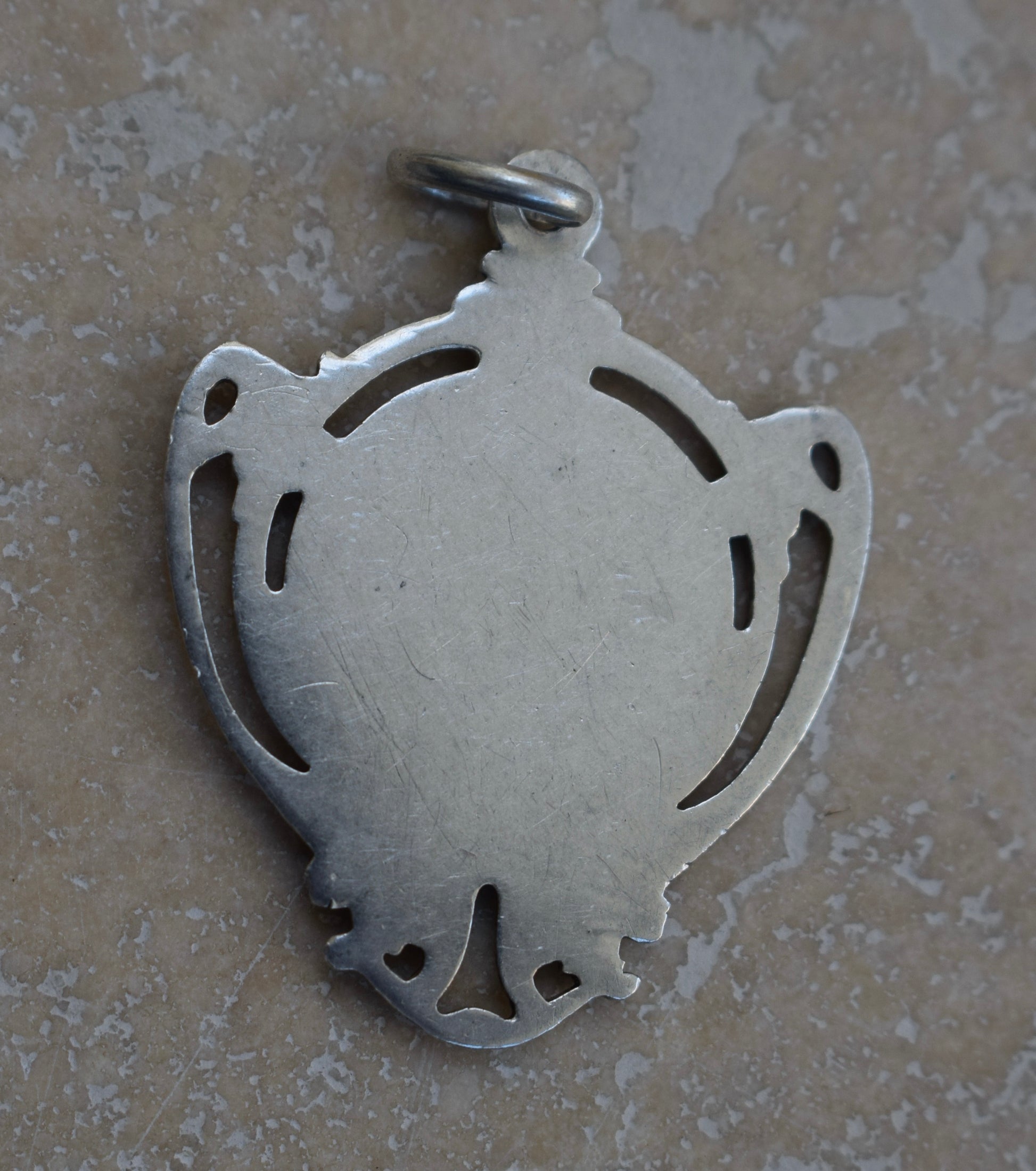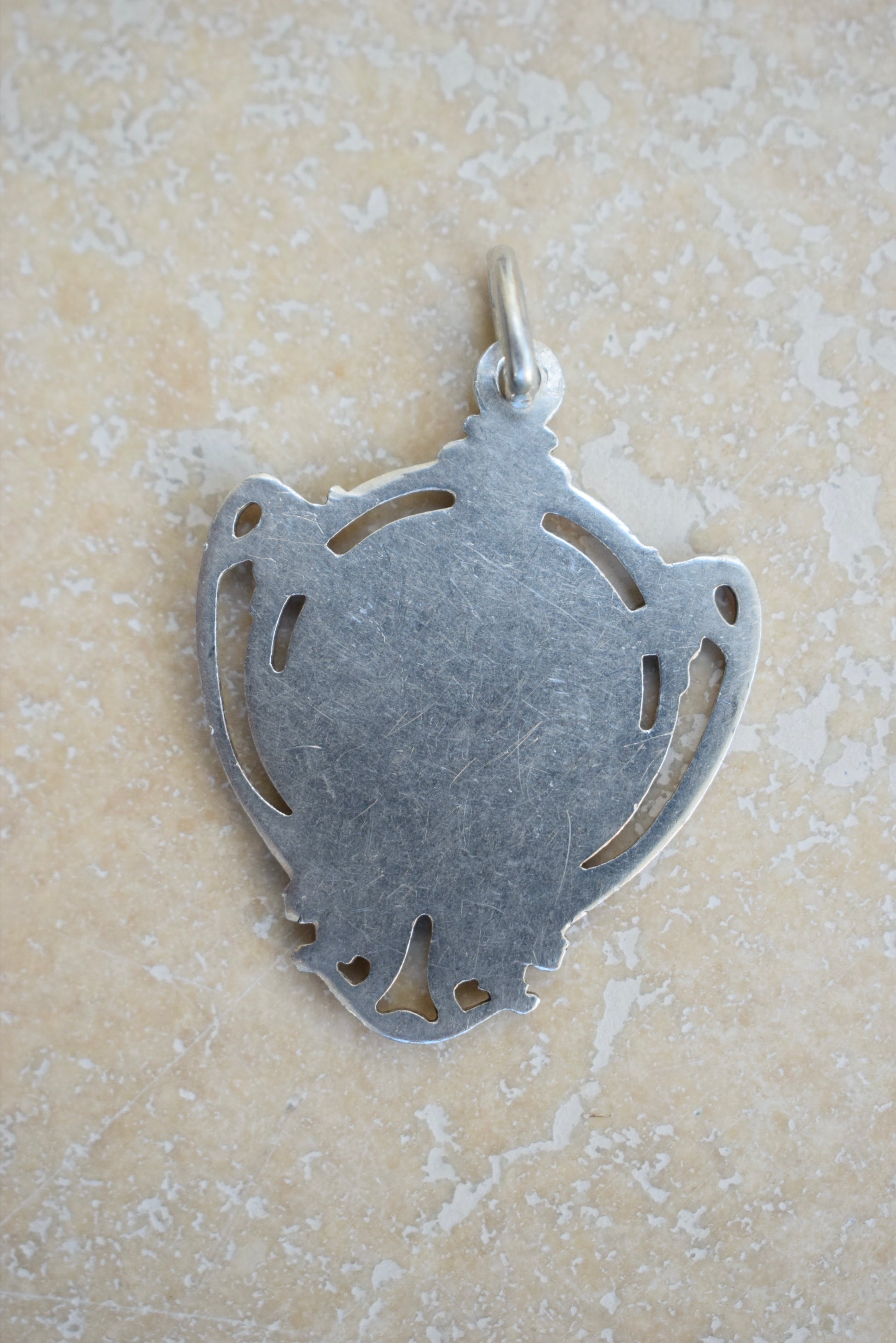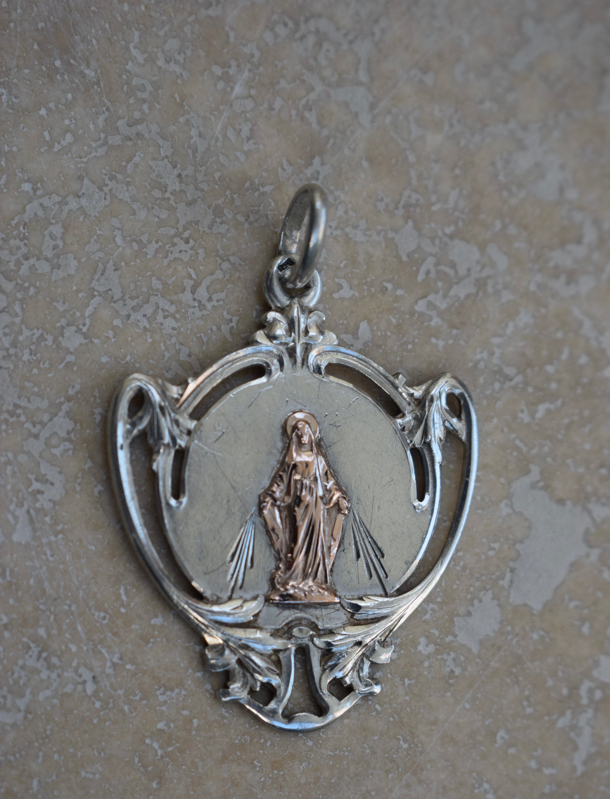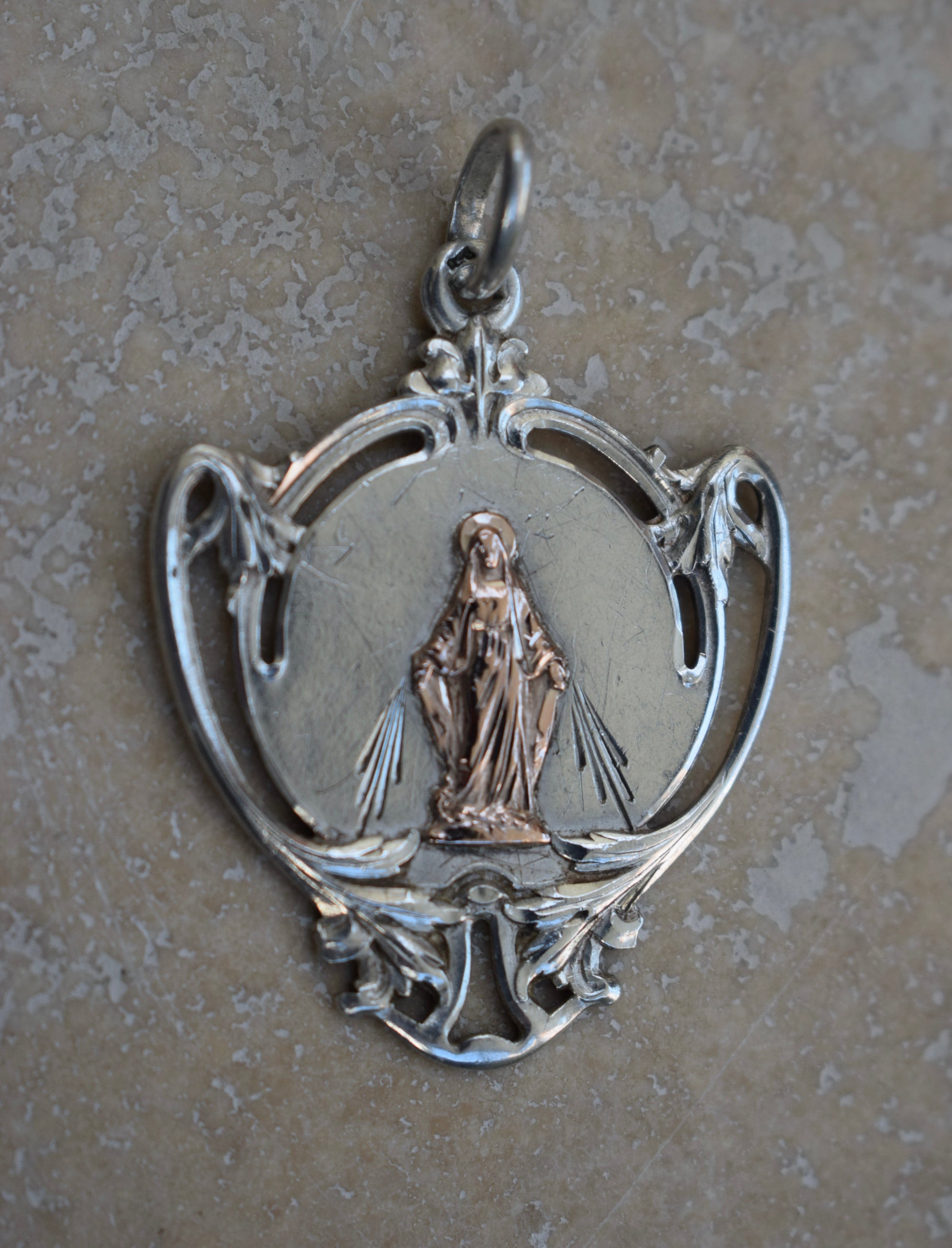 A beautiful French antique medal made of sterling silver. The Art Nouveau openwork pendant features standing Mary. Our Lady is gold plated. Gorgeous design !