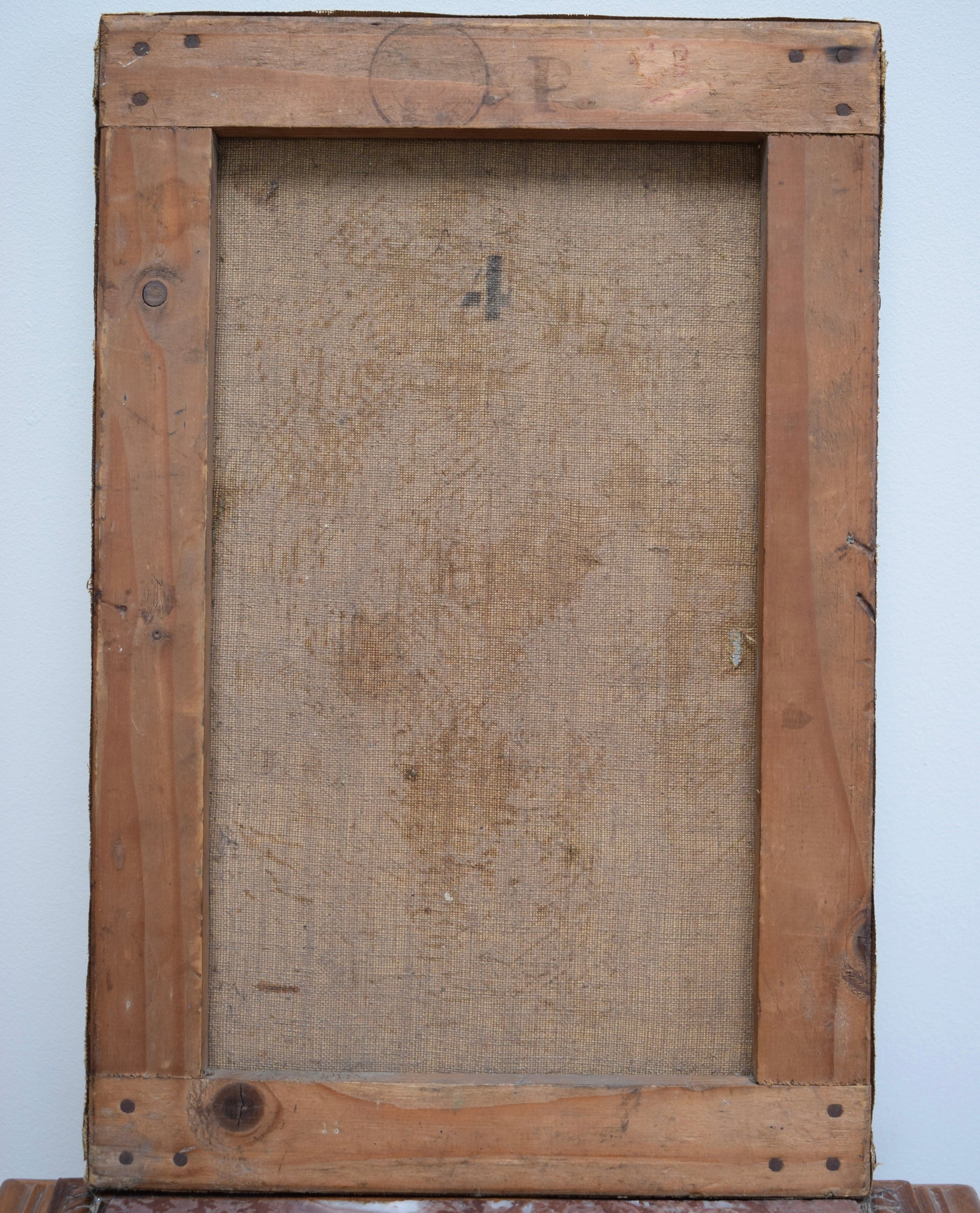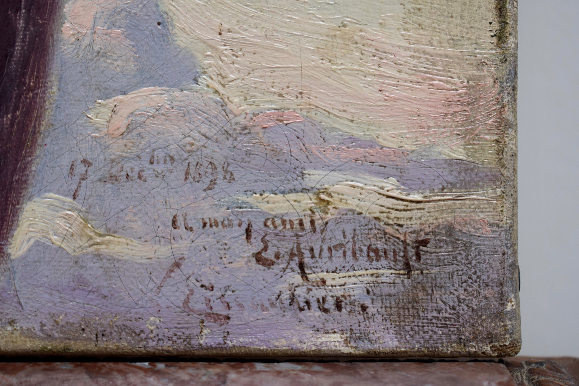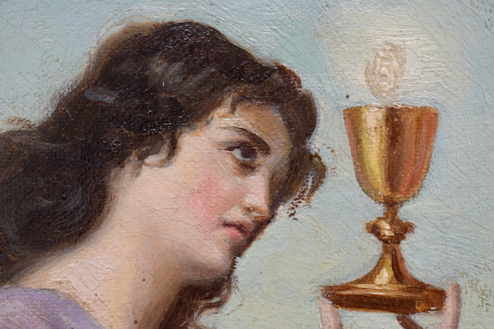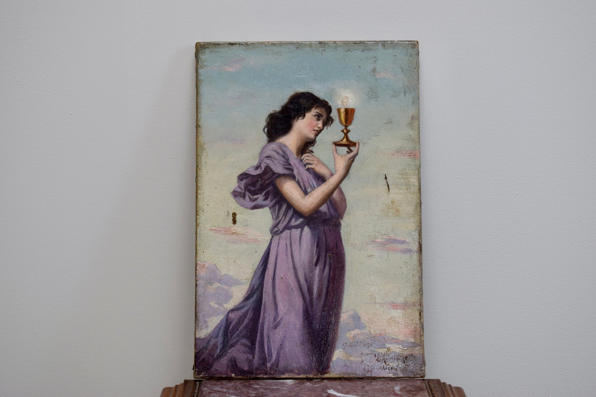 A wonderful French antique oil painting on canvas dating to the late 19th century. The work of art features a woman with dark hair wearing a long purple dress and holding a chalice in her right hand. This woman may represent the allegory of Religion. Over the centuries, Religion has often been personified by a woman holding a chalice. The original art has been dated 17th Dec 1898 and signed by an unknown talented artist Eissautier who offer it to his friend Auribault.