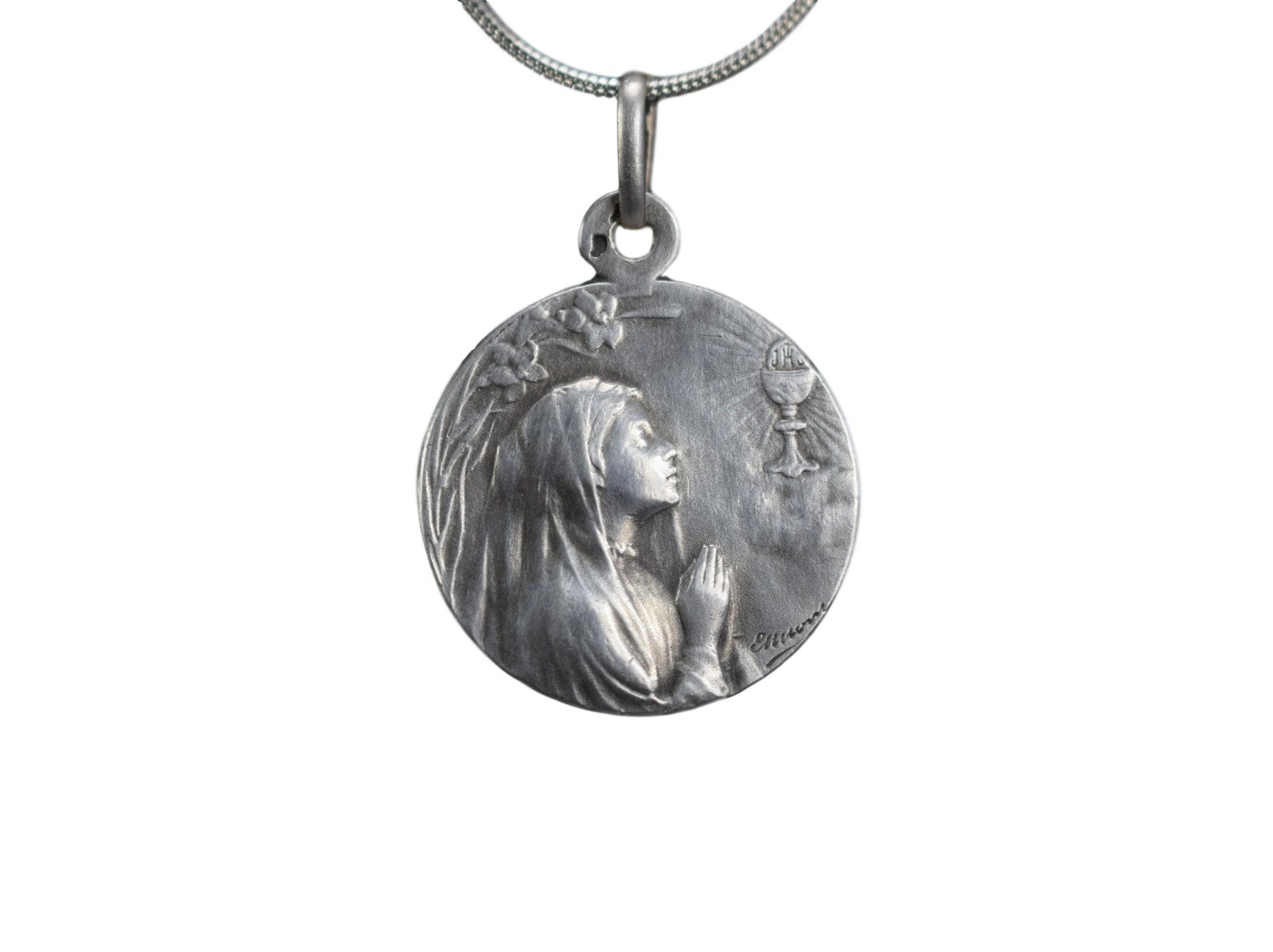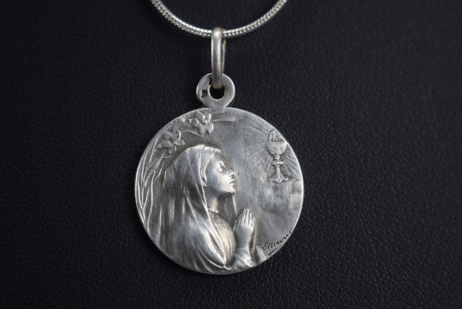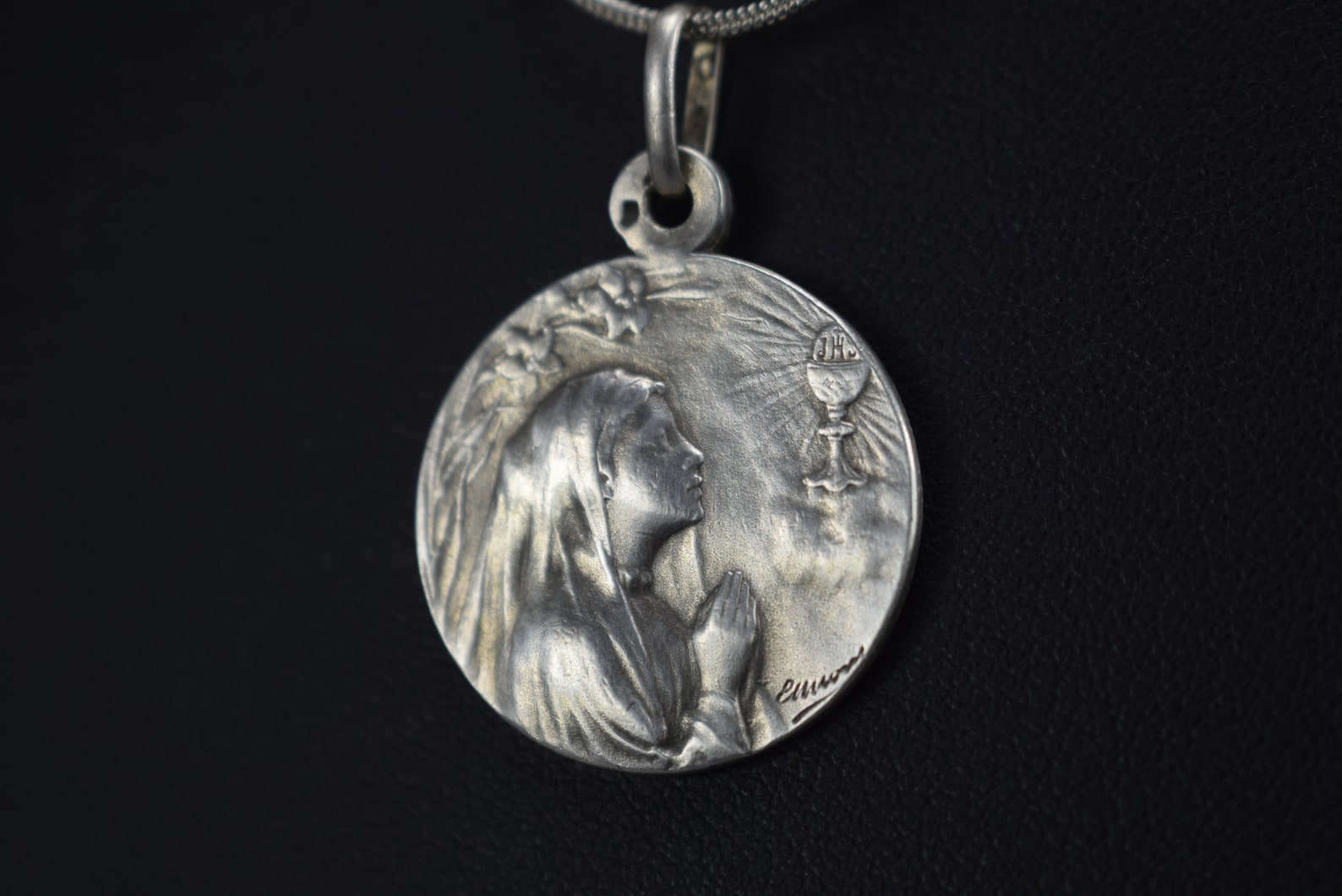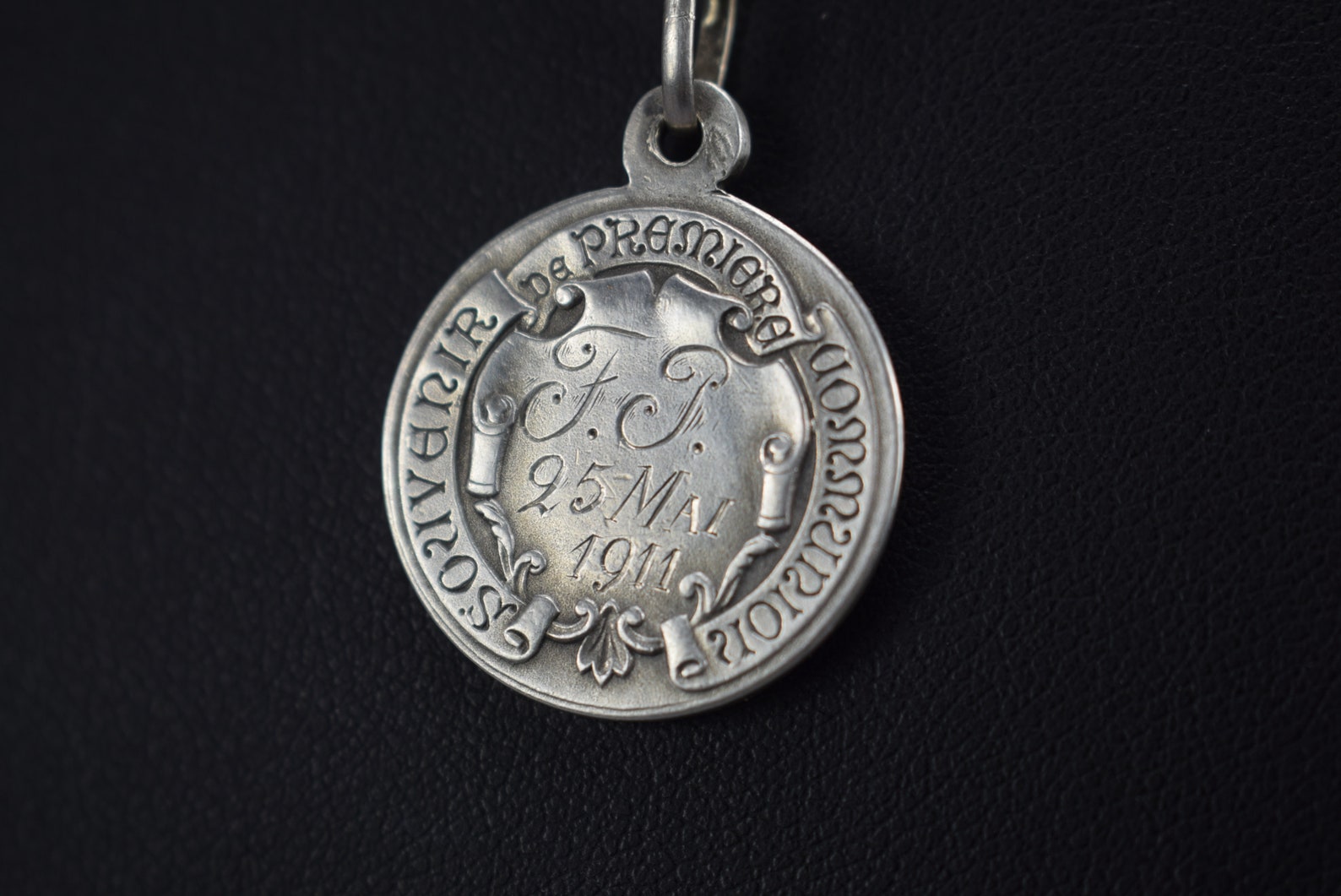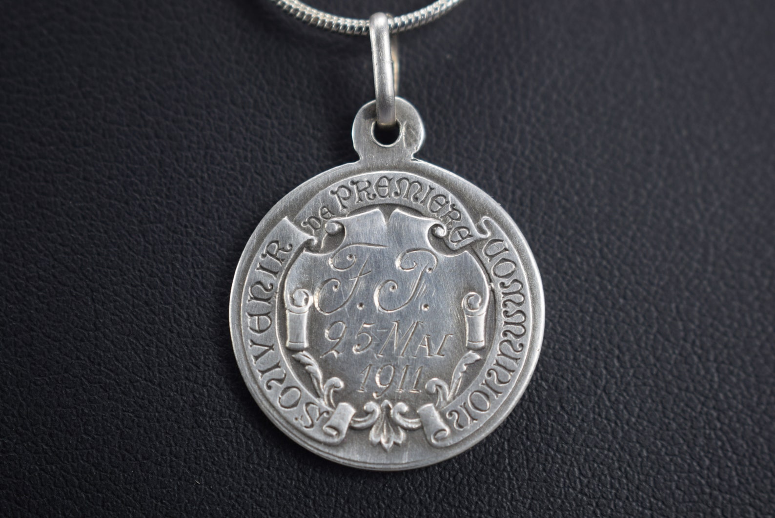 A French vintage Holy Communion medallion dating to the early 20th century. The sterling silver religious pendant features a communicant praying and a chalice. On the reverse, you can read "Souvenir de 1ère Communion" meaning "Souvenir of 1st Communion" and the date 25th May 1911.