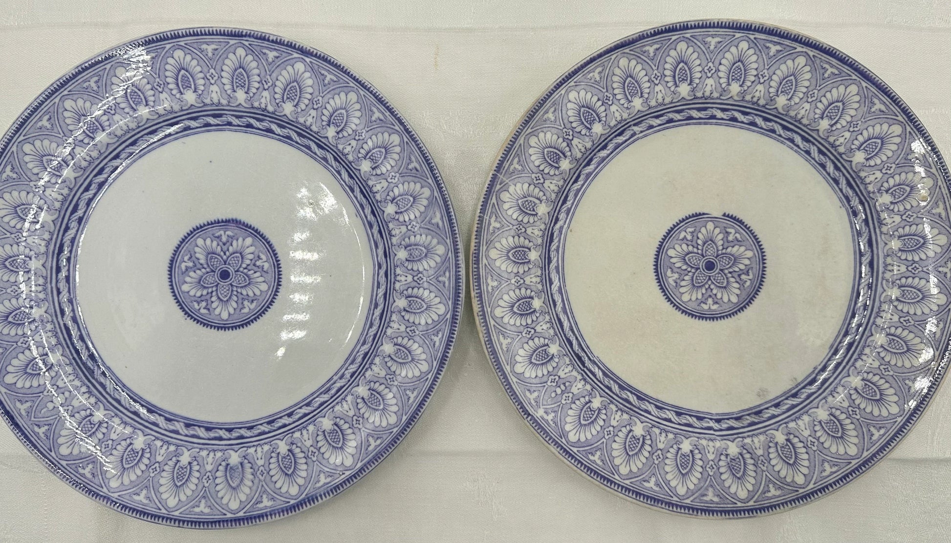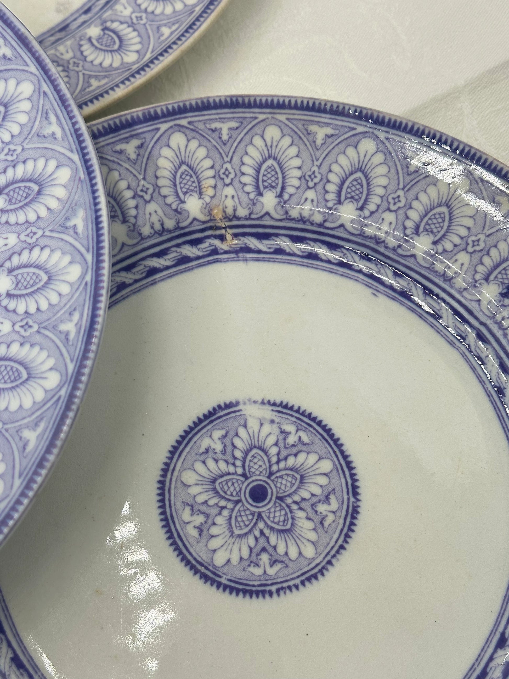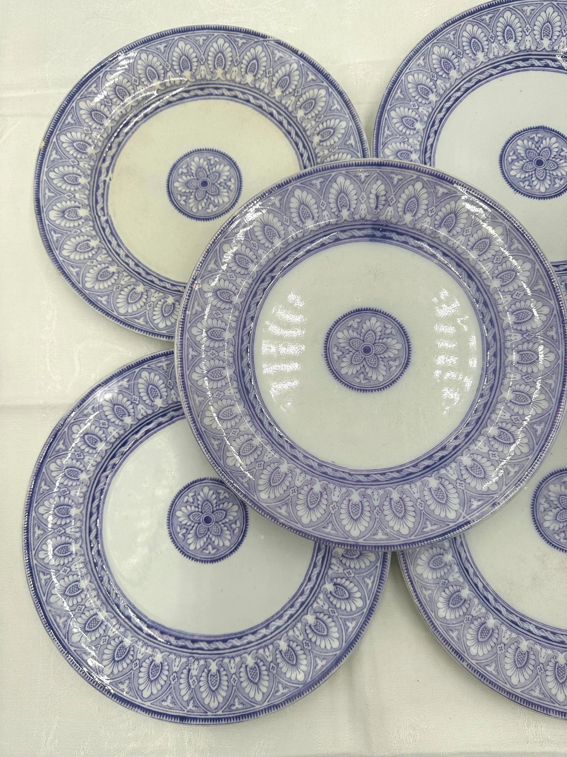 CONDITION: Good condition for age and type. The color can change from a plate to another (more or less purple). Some normals signs of ages like some light stains ("tea stains") on the ironstone, light flaws of the enamel. One plate has a small chip on the rim. A really wonderful old set.