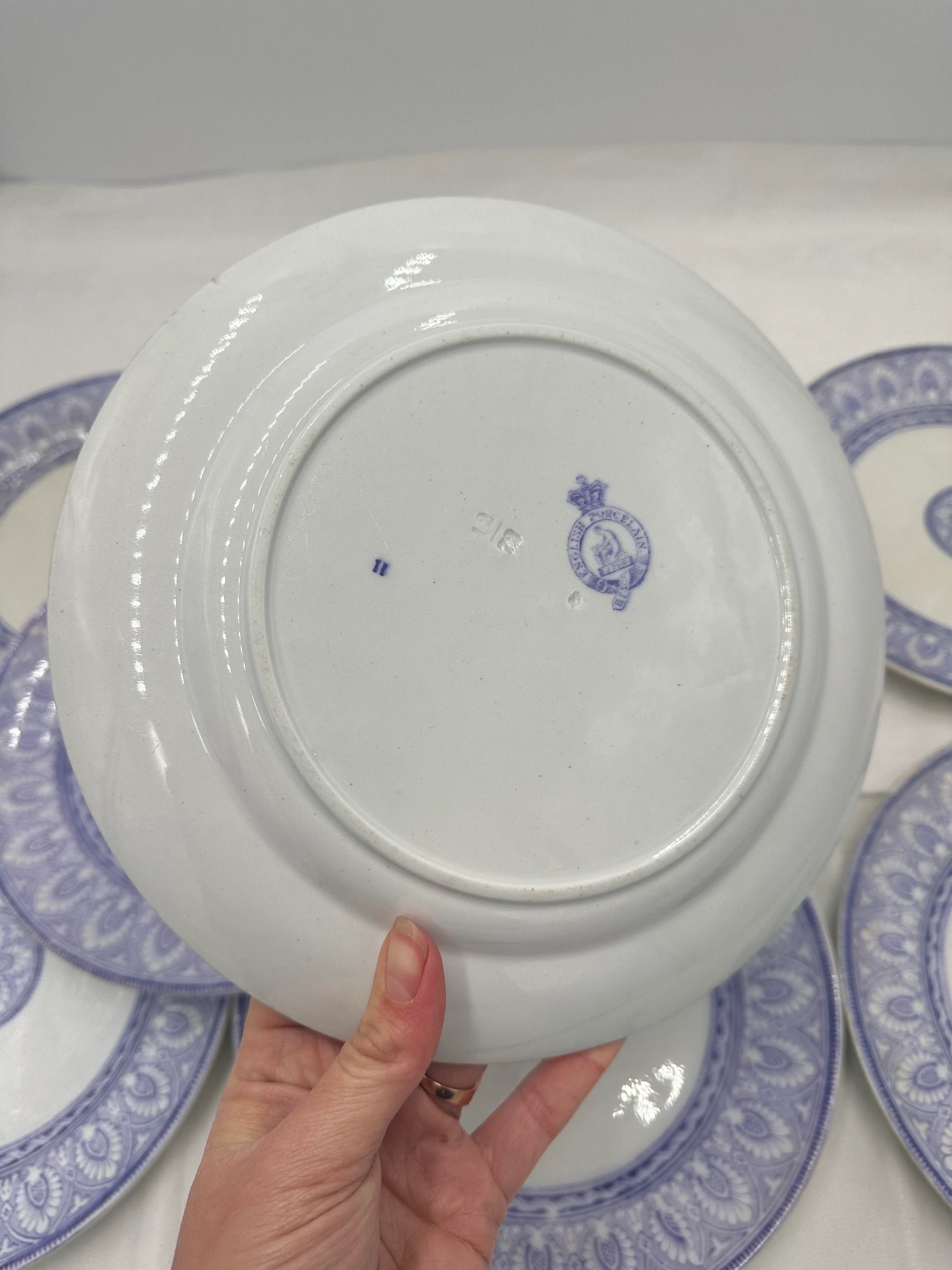 Bates Elliot & Co has produced this grouping of 8 plates ( 9" diameters, typical dinner plate at turn of 19th century, c.1870, when these were made). The charming lavender decor features printed underglaze greek motifs. This pattern is called "Grecian Border". They're fabulous plates you'll enjoy using. Not just cabinet plates, this set will take you from informal to formal table settings in style. The mark on back was used in the 1870's: lavender underglaze maker mark noting "English Porcelain BE&Co", as maker, BE & Co for Bates Elliot and Co.