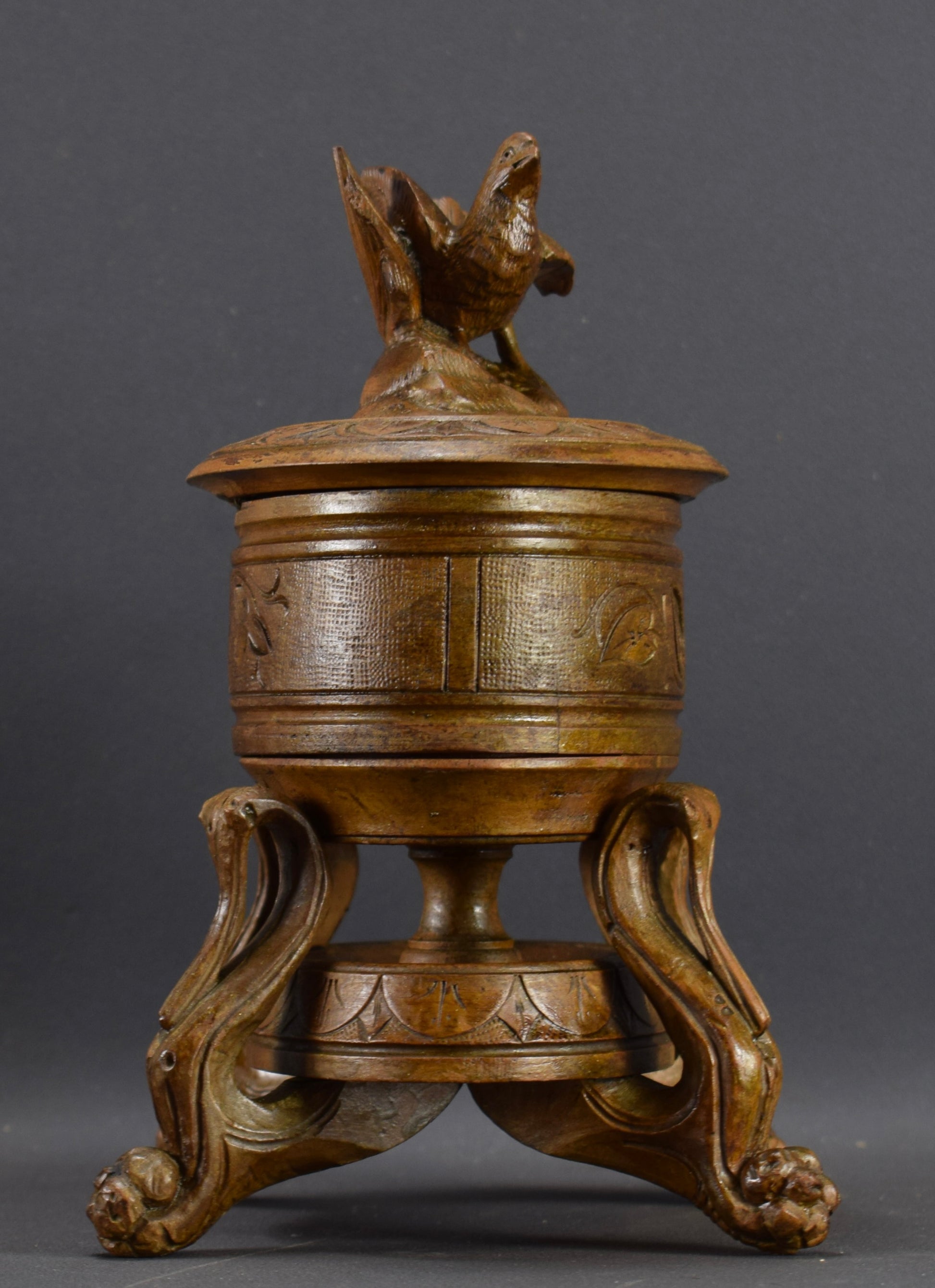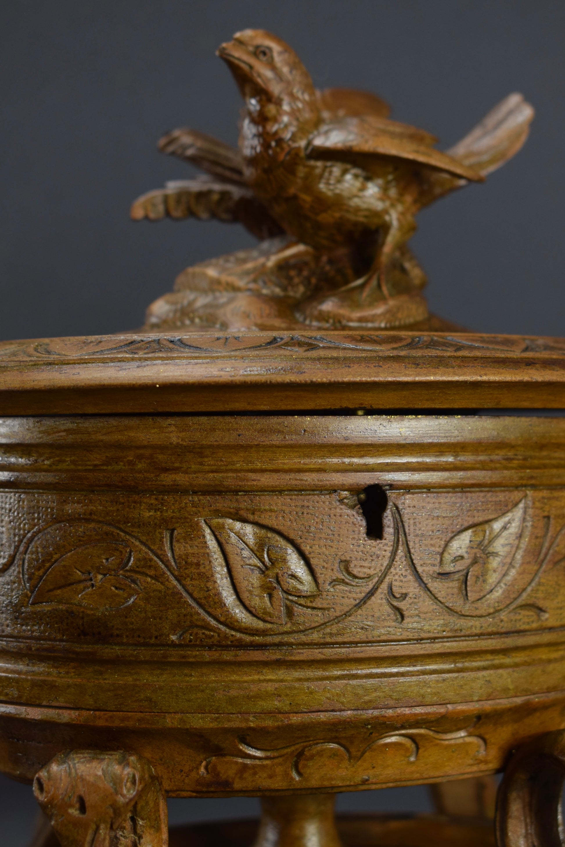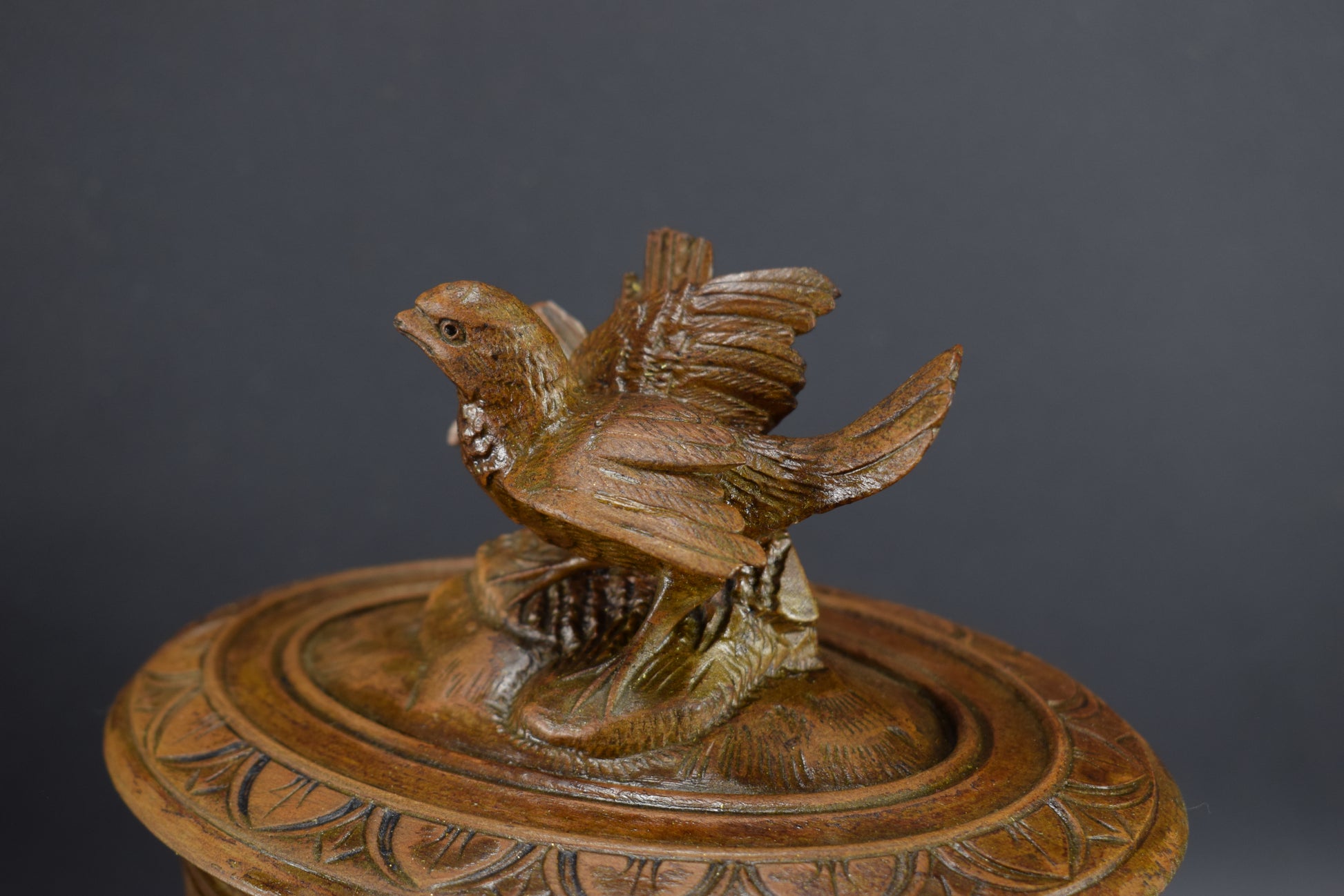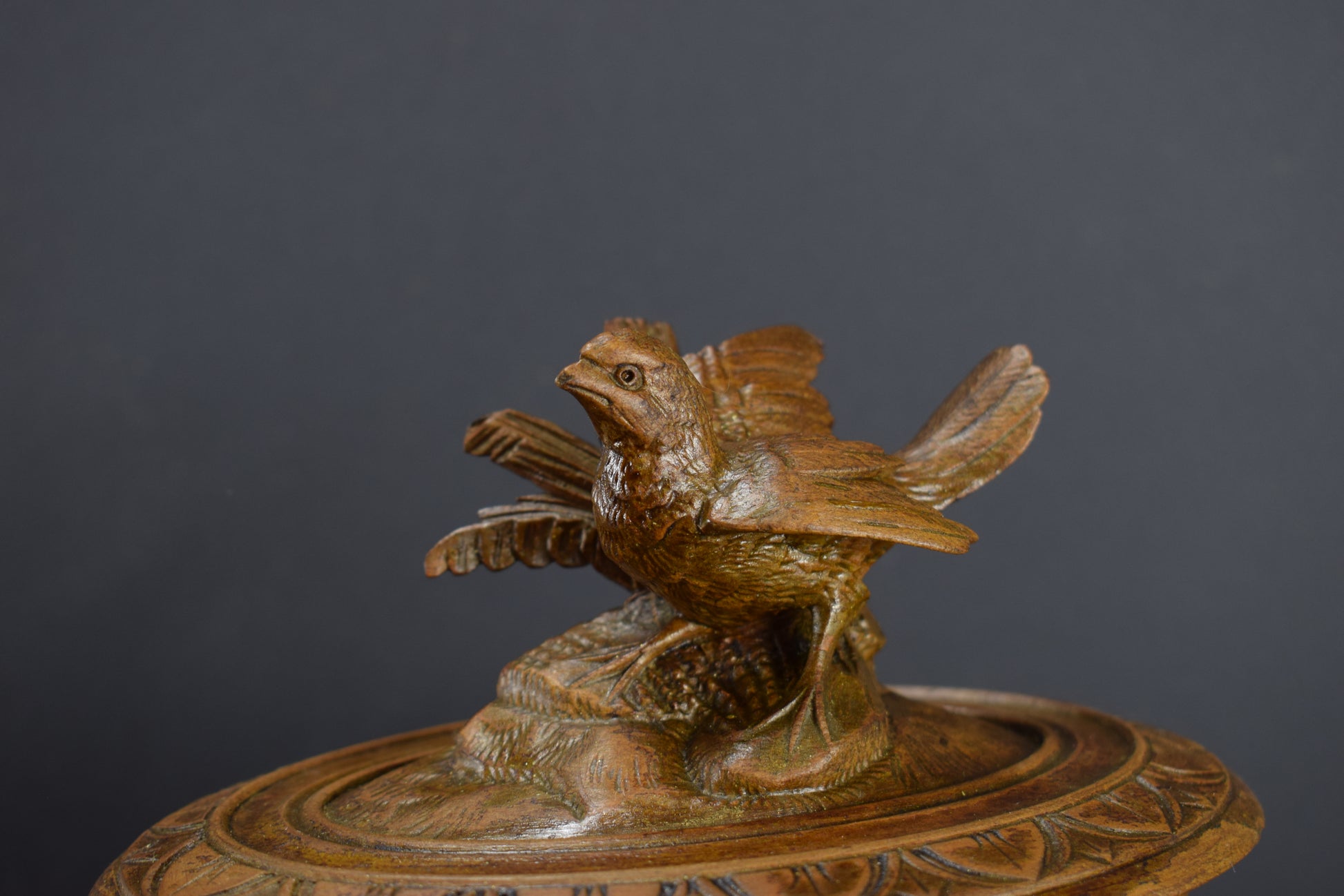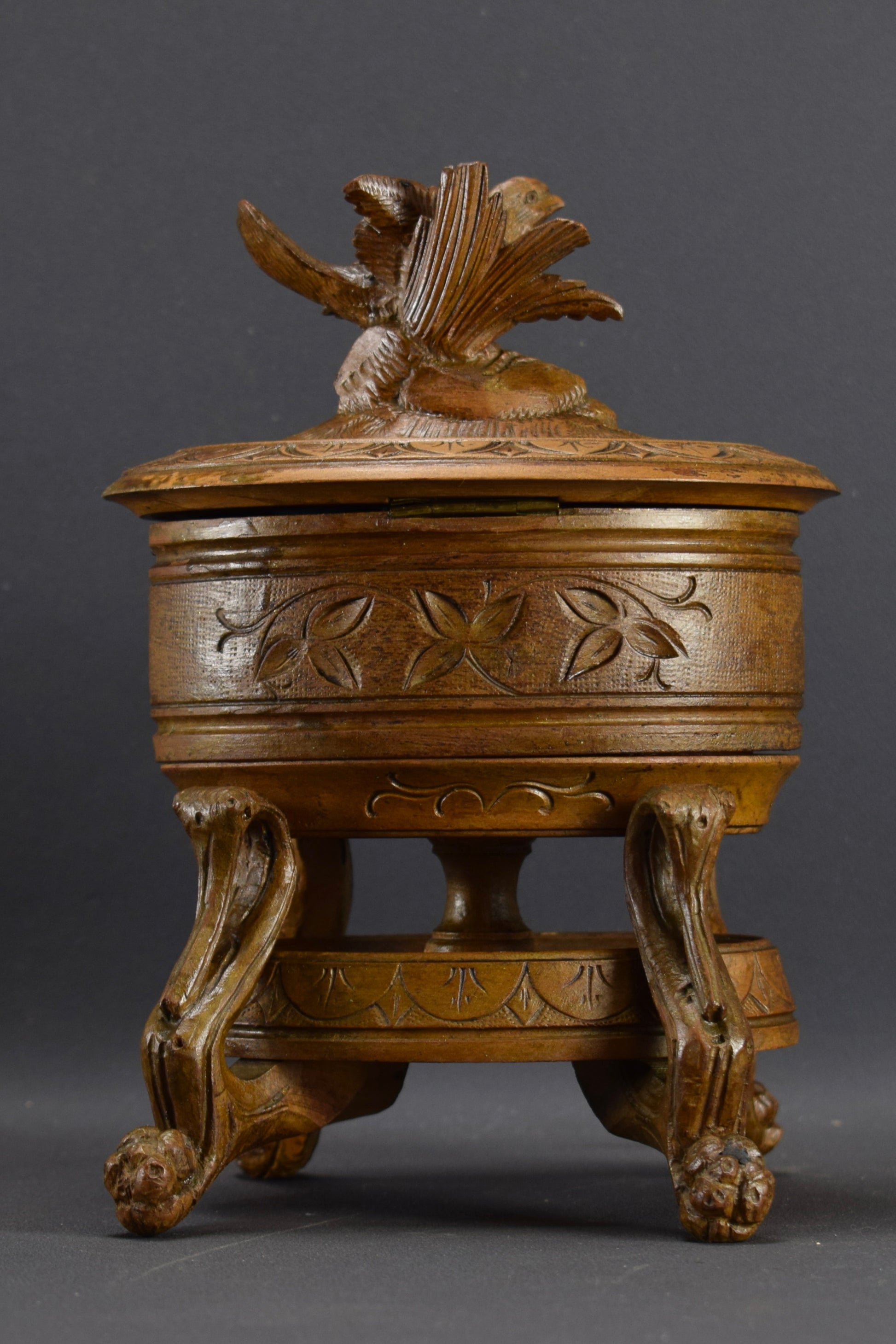 Wonderful Black Forest jewelry box made of hand carved wood. The hunt themed decor features a game bird on the lid. Charming handcrafted casket with cabriole legs. One of a kind shape. It dates to the 19th century, circa 1880.