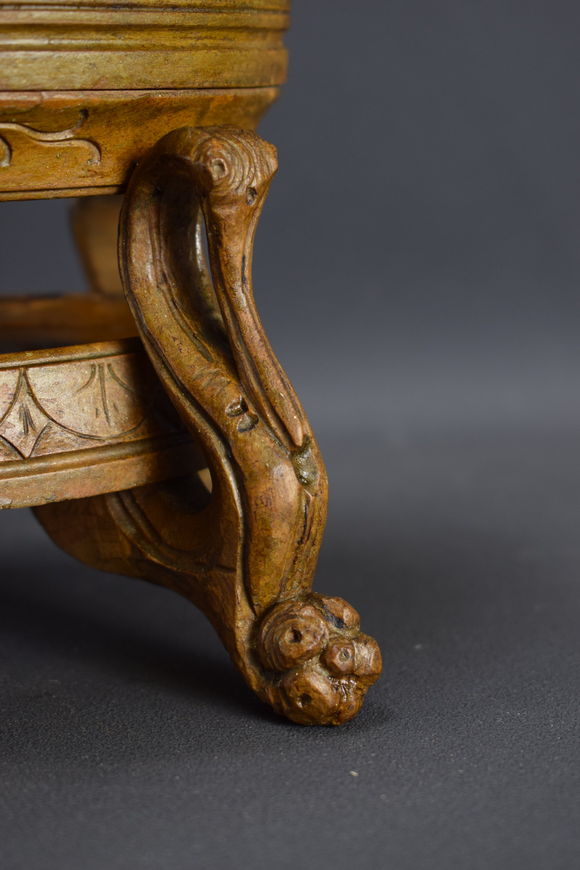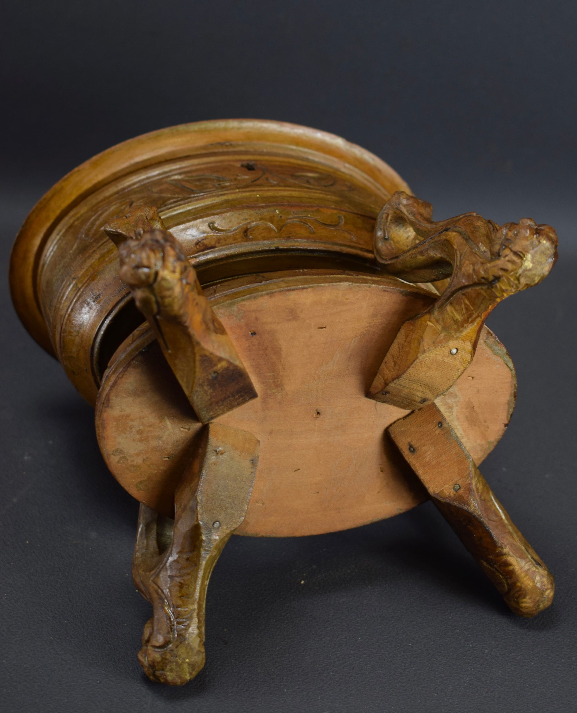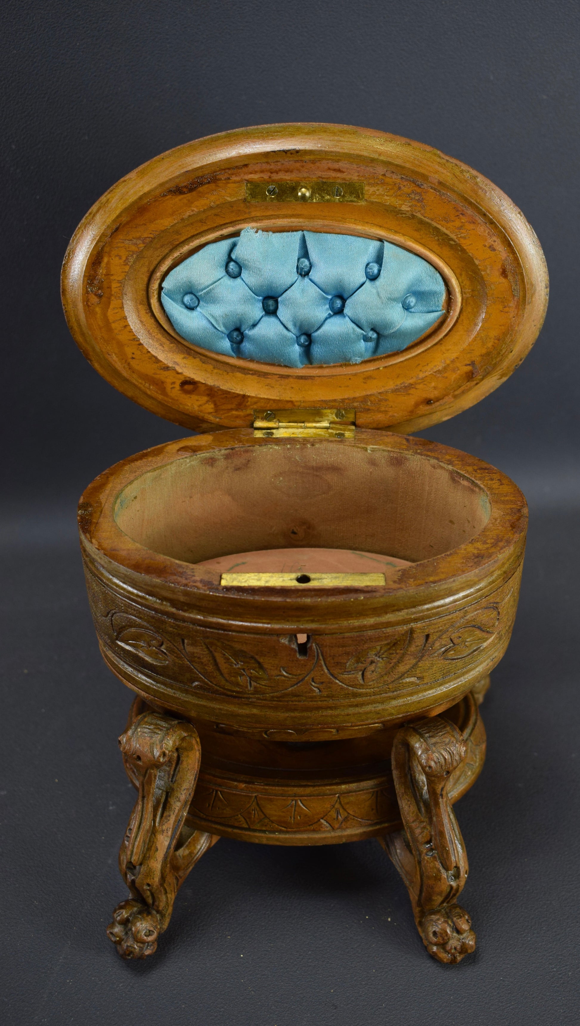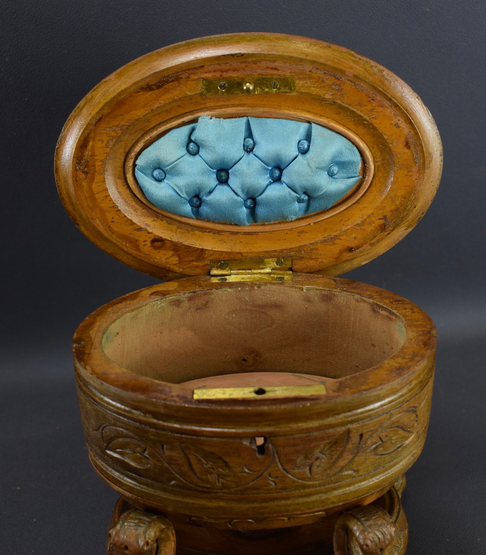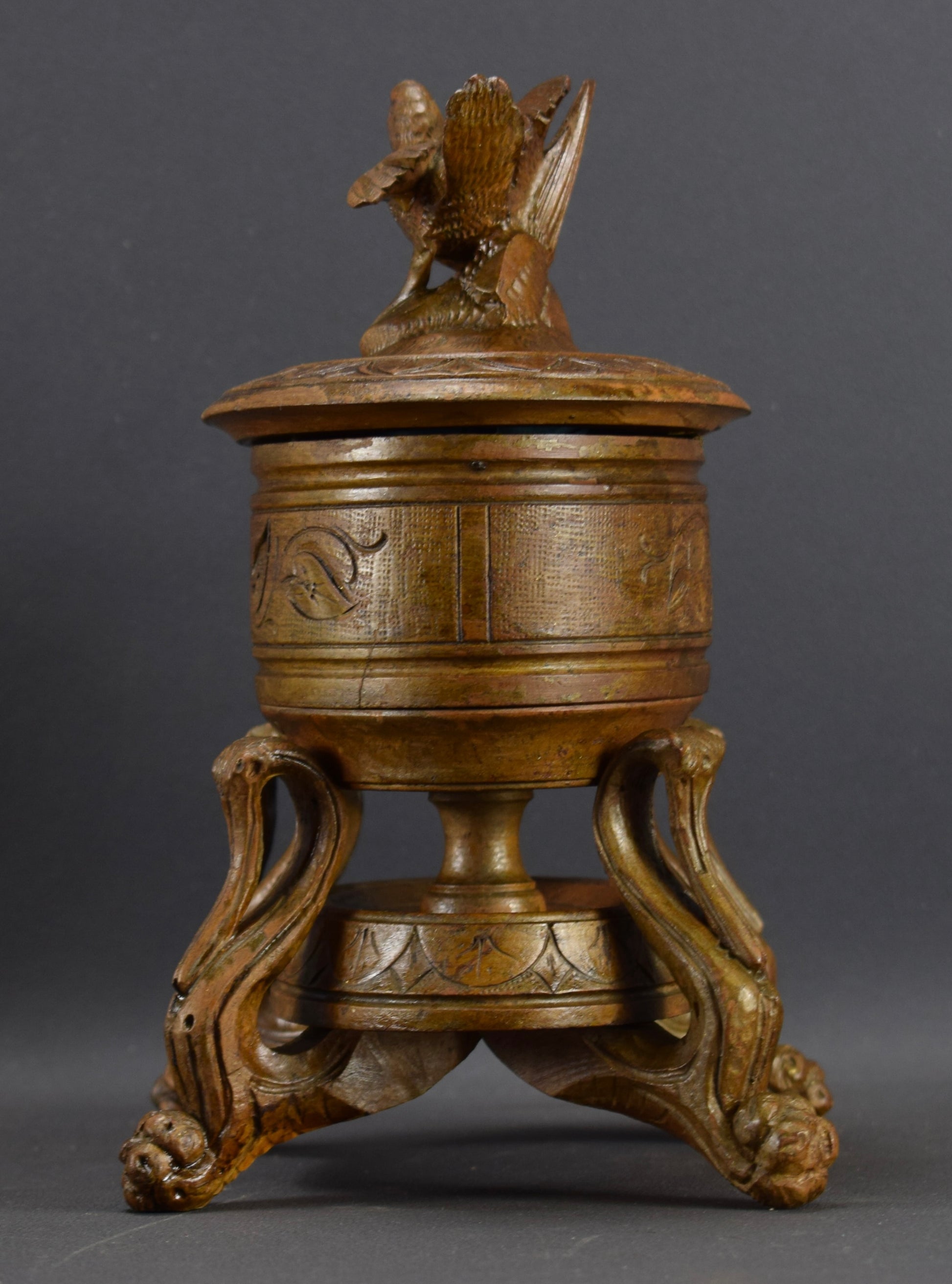 Wonderful Black Forest jewelry box made of hand carved wood. The hunt themed decor features a game bird on the lid. Charming handcrafted casket with cabriole legs. One of a kind shape. It dates to the 19th century, circa 1880.