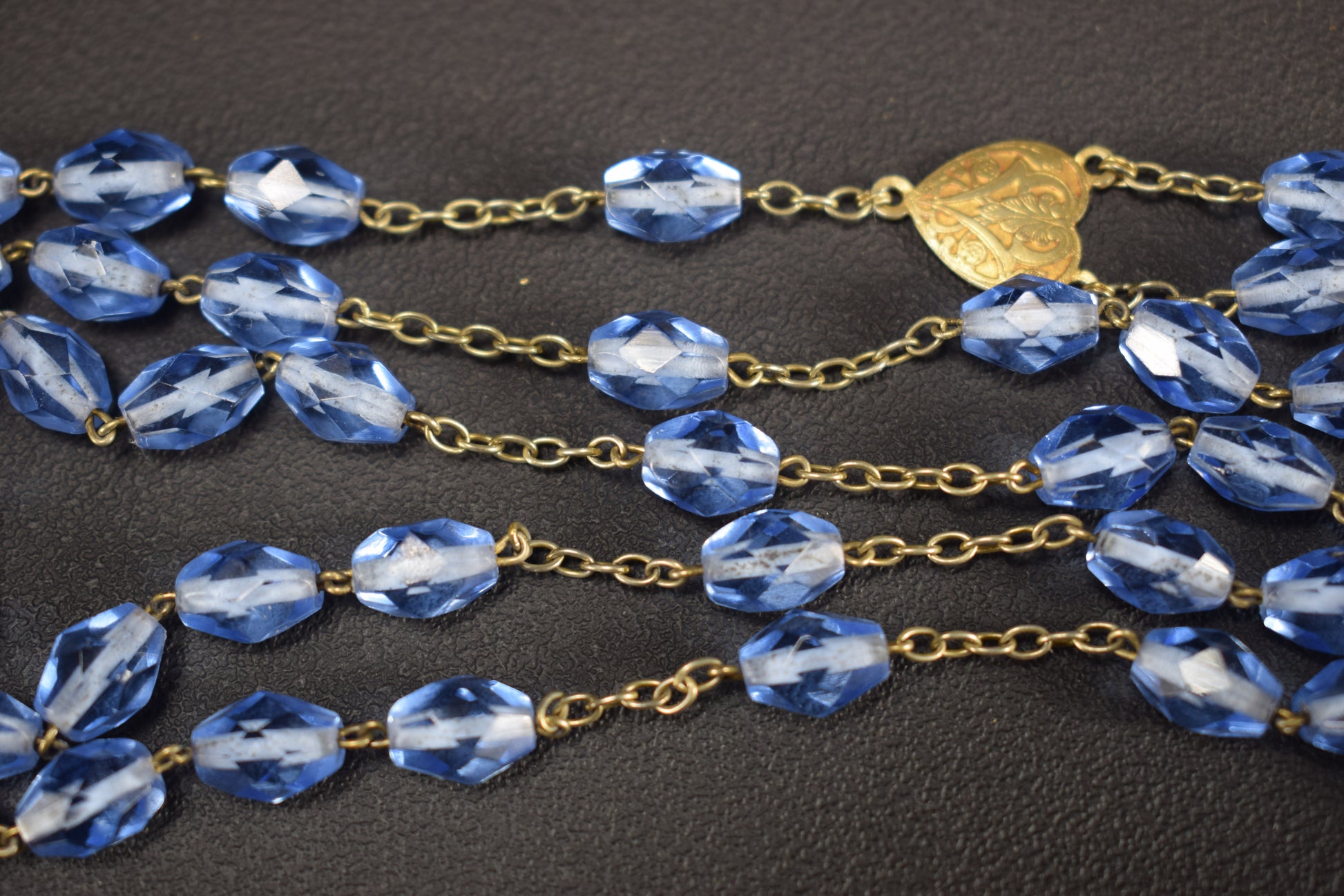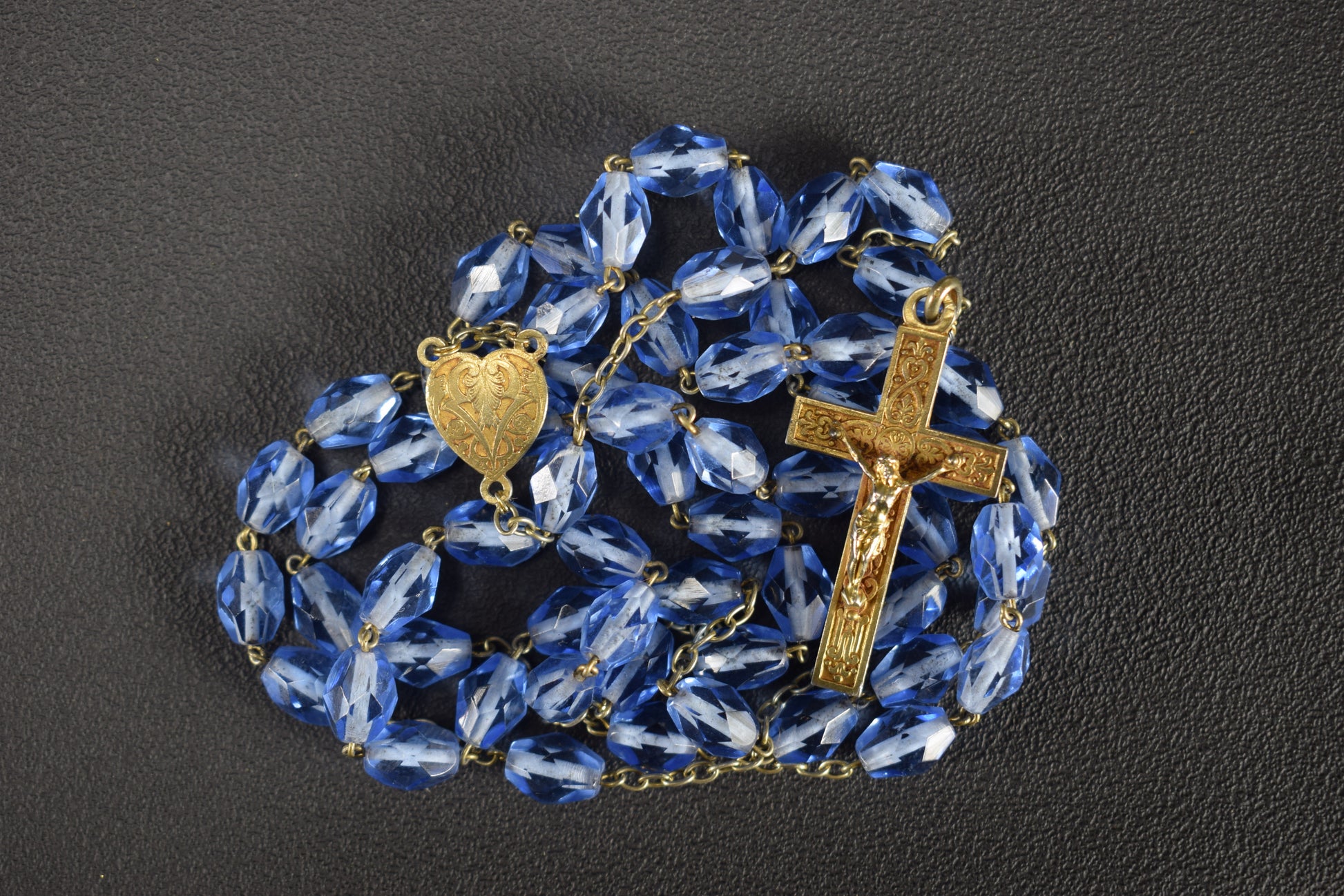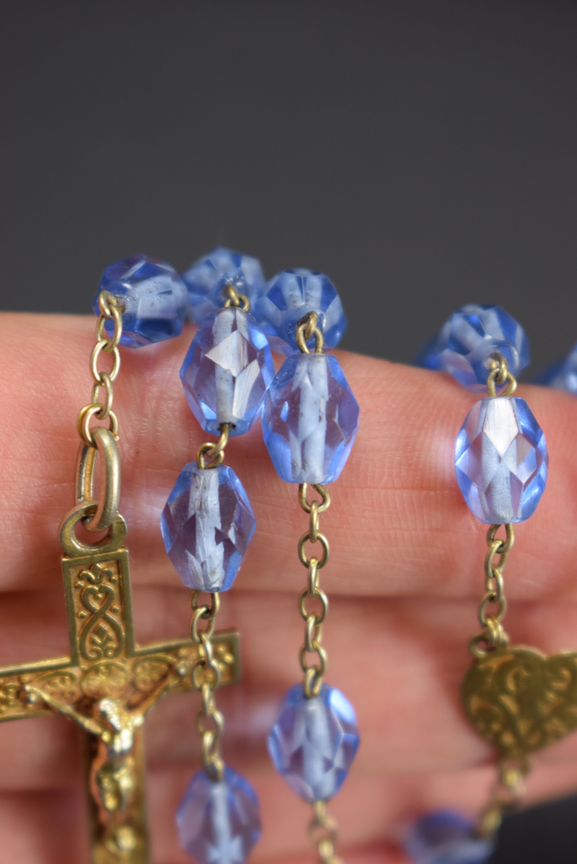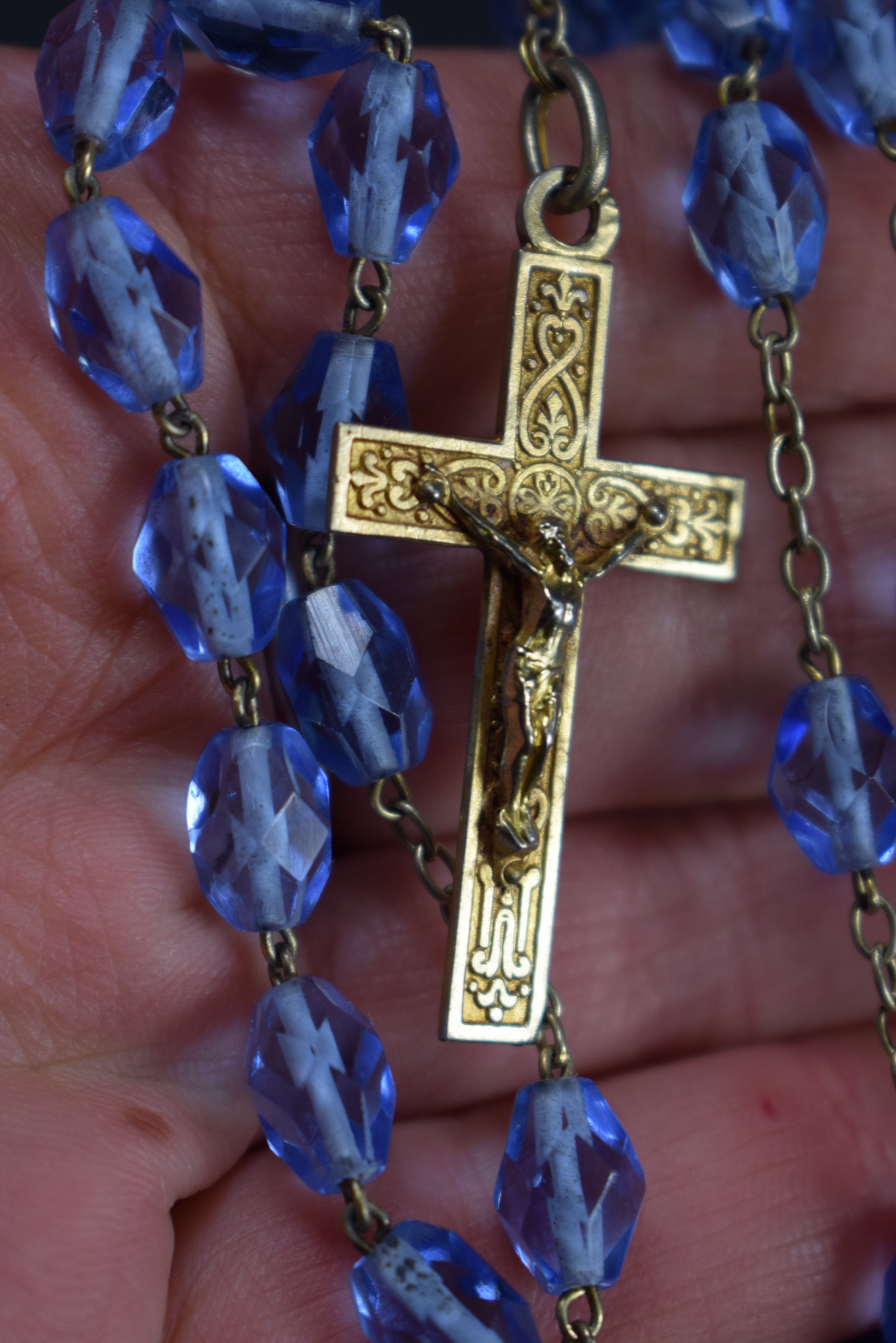 A lovely French antique rosary made of 59 blue faceted glass beads and gold plated sterling silver (vermeil). The Art Nouveau cross and connector are finely crafted.