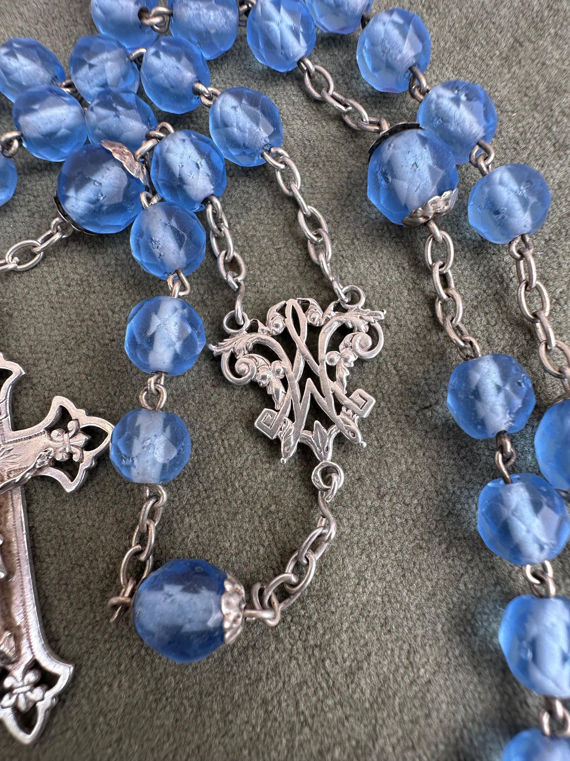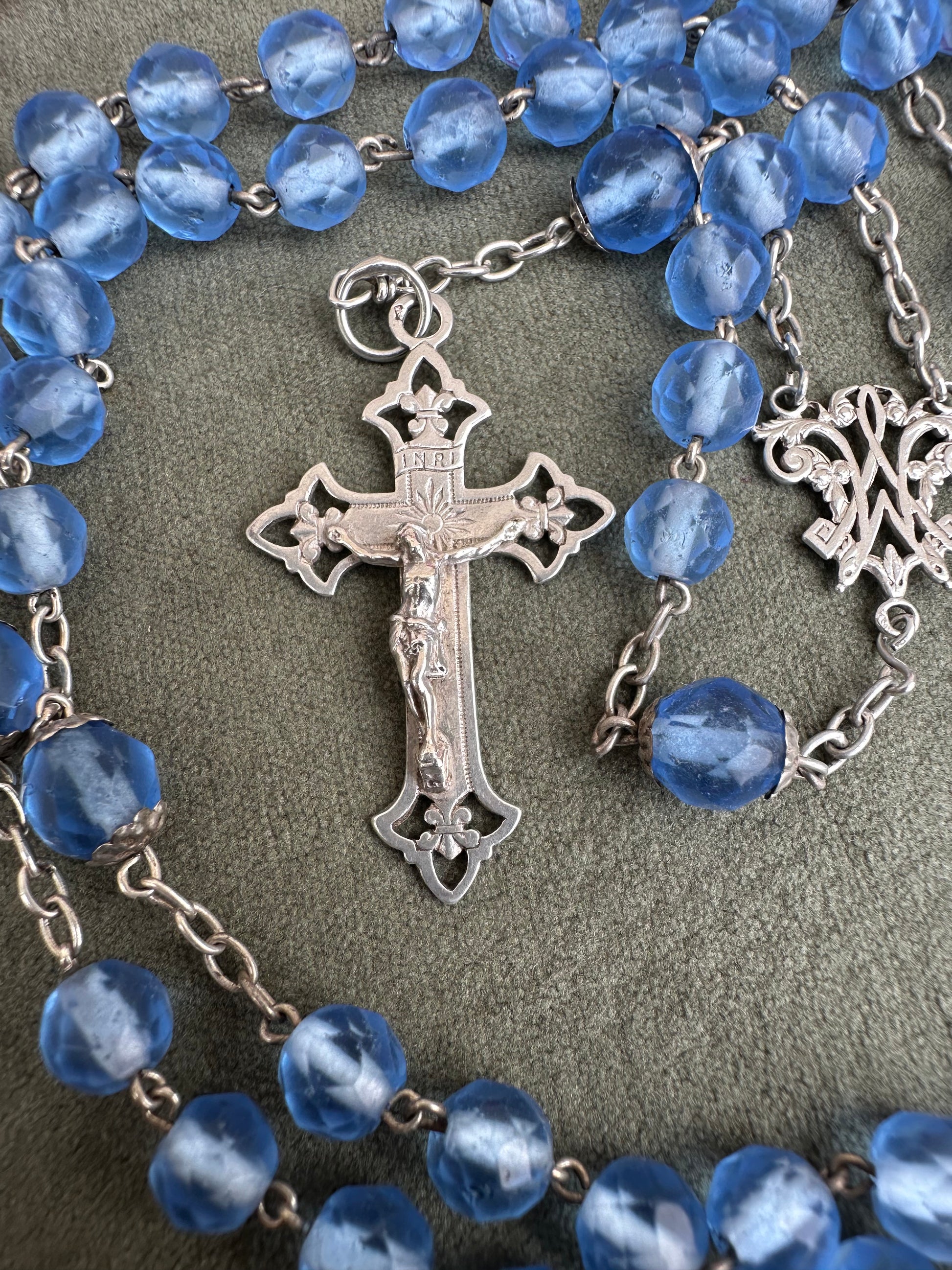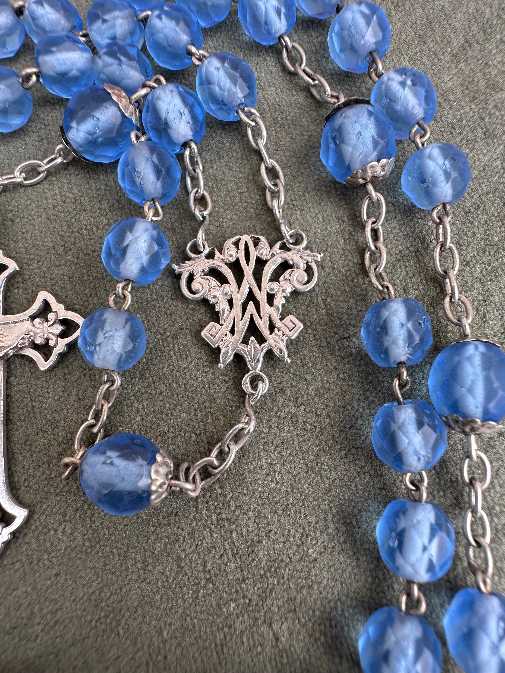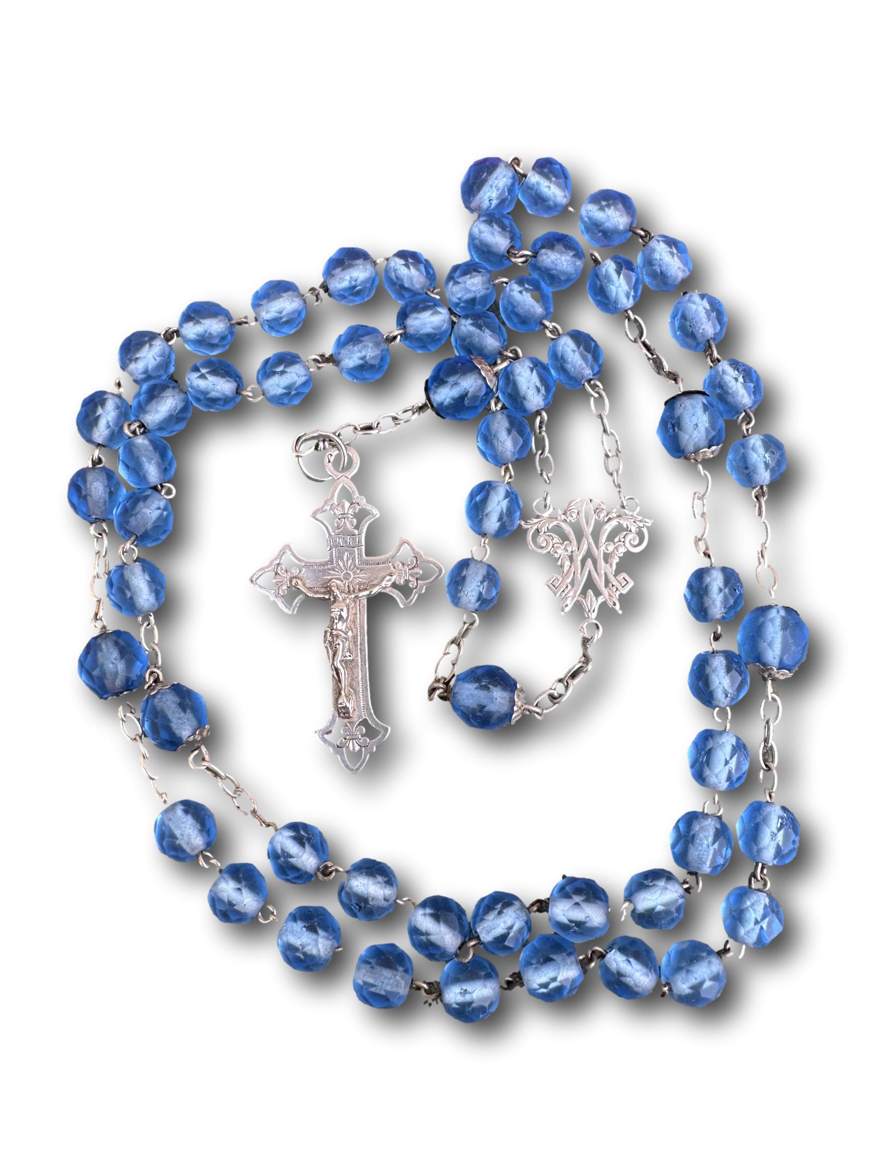 This exquisite French antique rosary from 1910 features elegant faceted blue glass beads, each shimmering with a beautiful, translucent depth. The beads are perfectly complemented by the bright sterling silver chain, crucifix, and centerpiece, showcasing timeless craftsmanship. Pater beads are finely capped. The openwork crucifix is delicately detailed, adding an air of sophistication, while the centerpiece displays an interlaced "M" of Mary, symbolizing devotion to the Virgin Mary.