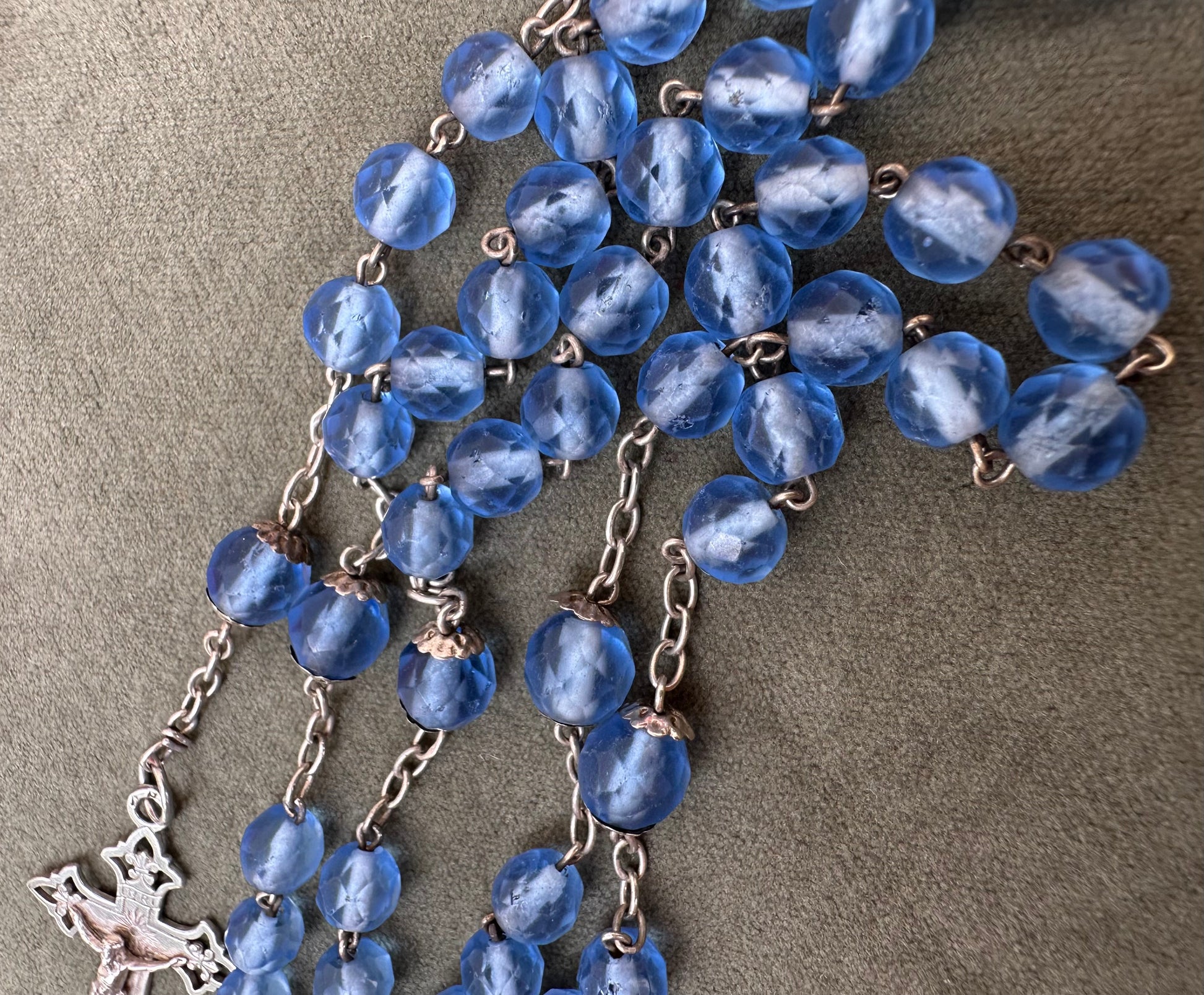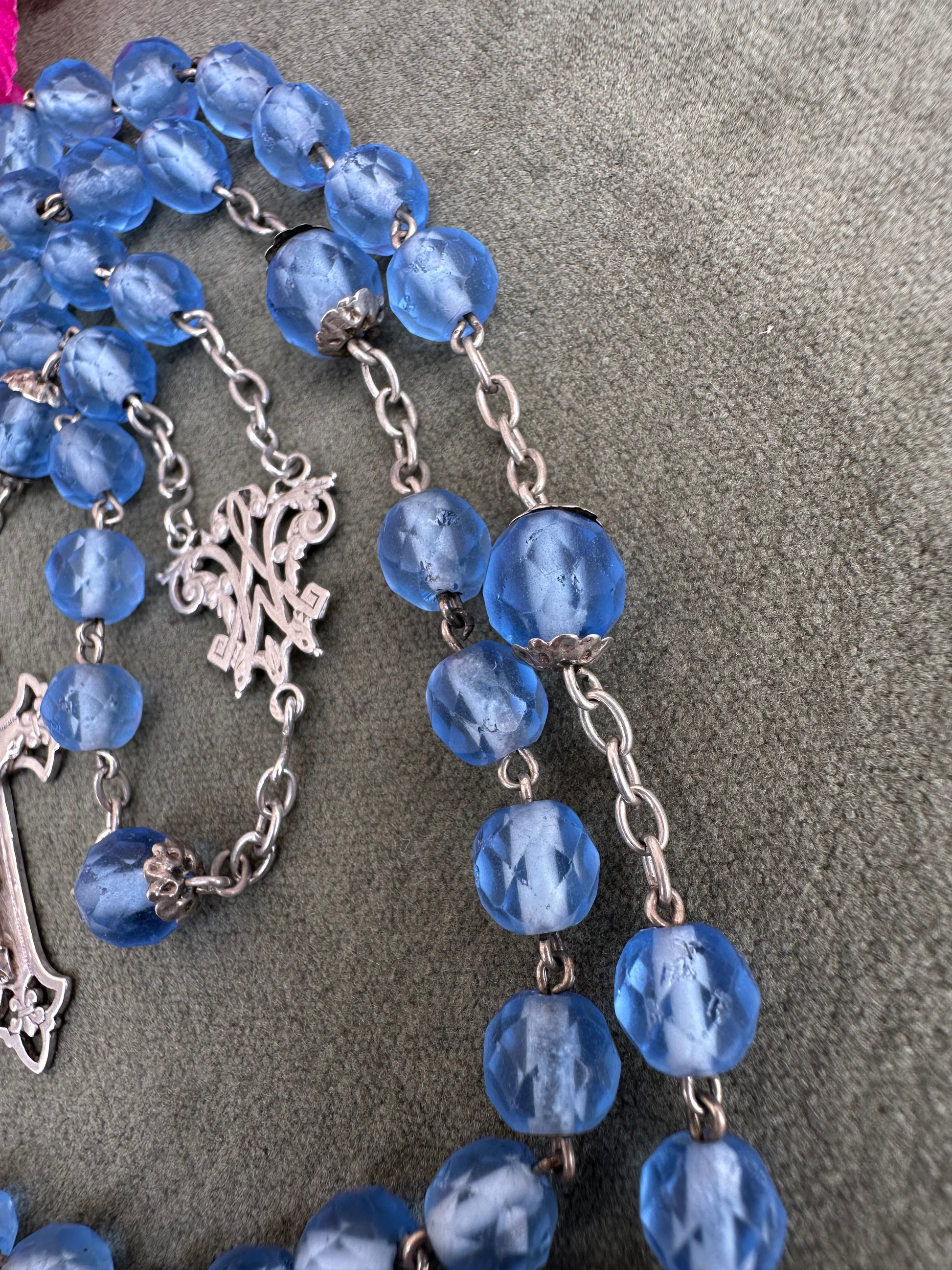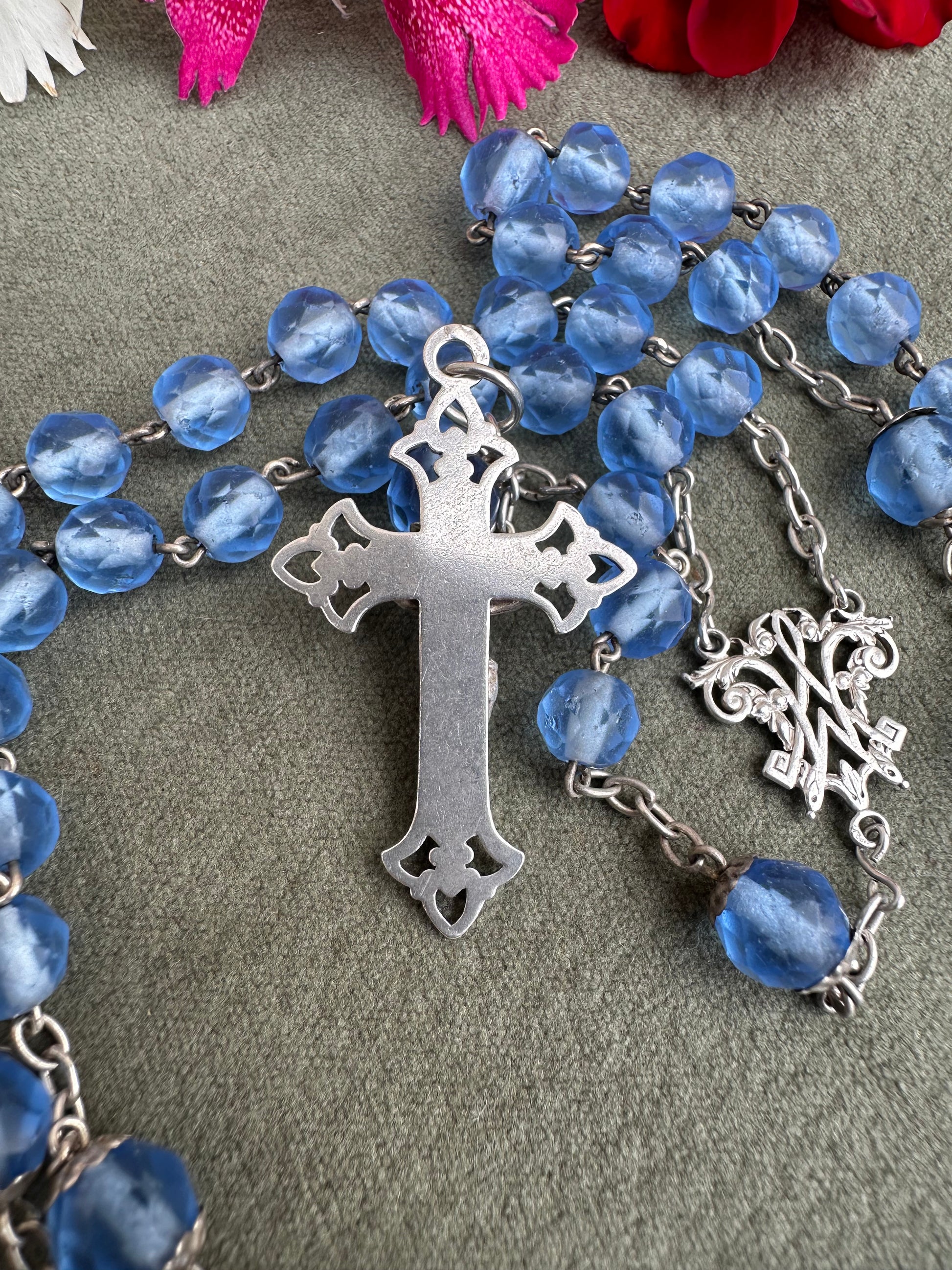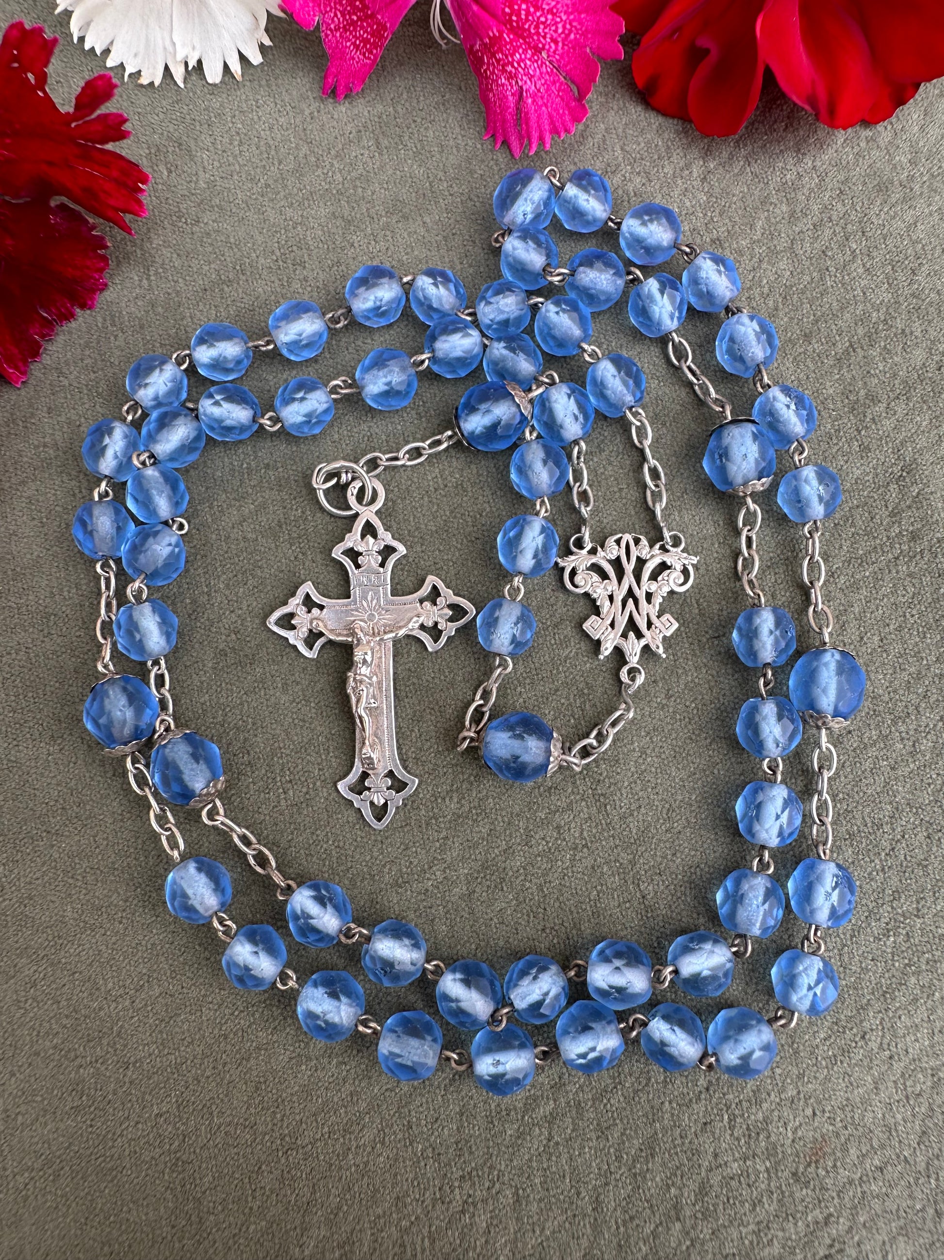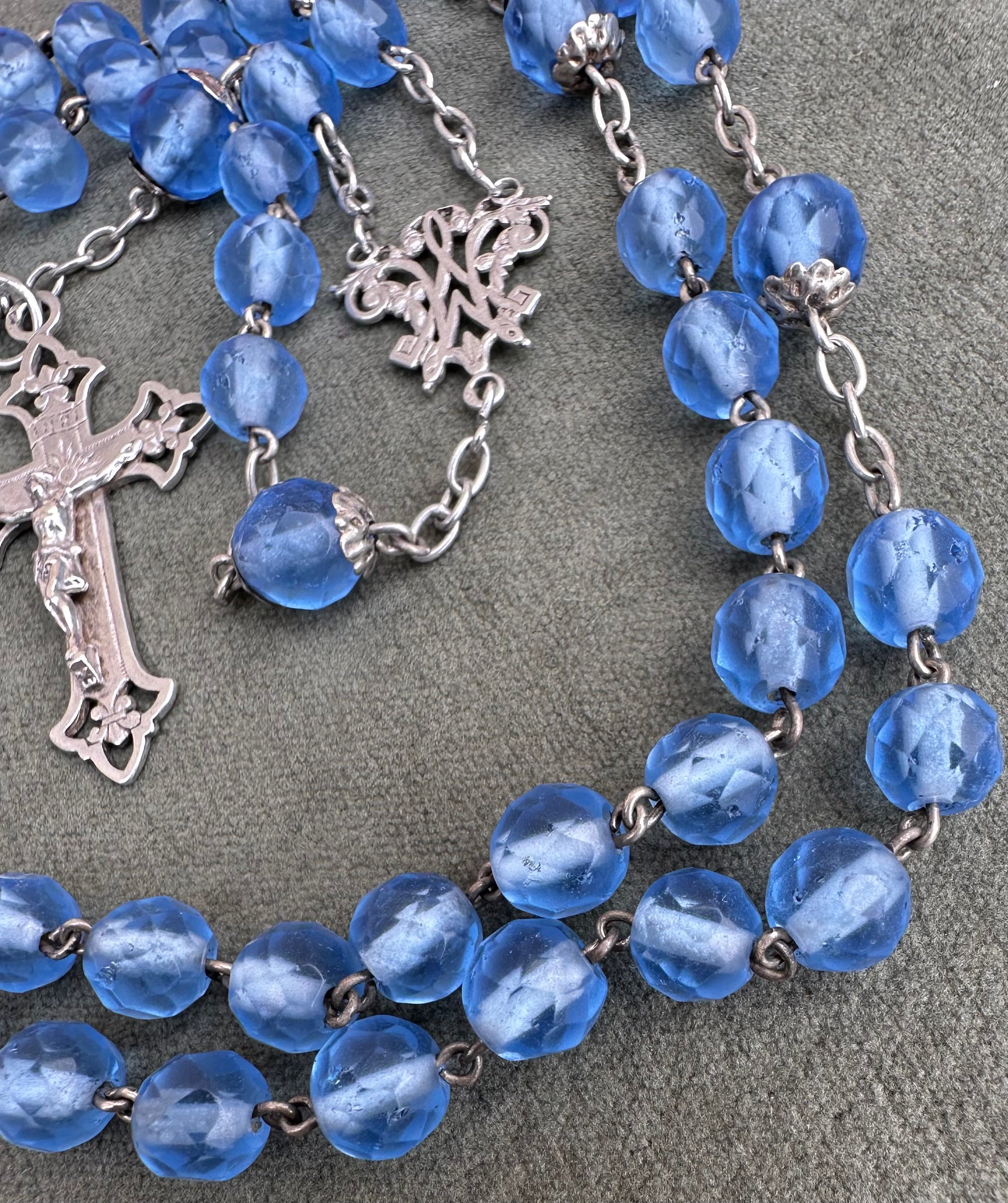 This exquisite French antique rosary from 1910 features elegant faceted blue glass beads, each shimmering with a beautiful, translucent depth. The beads are perfectly complemented by the bright sterling silver chain, crucifix, and centerpiece, showcasing timeless craftsmanship. Pater beads are finely capped. The openwork crucifix is delicately detailed, adding an air of sophistication, while the centerpiece displays an interlaced "M" of Mary, symbolizing devotion to the Virgin Mary.