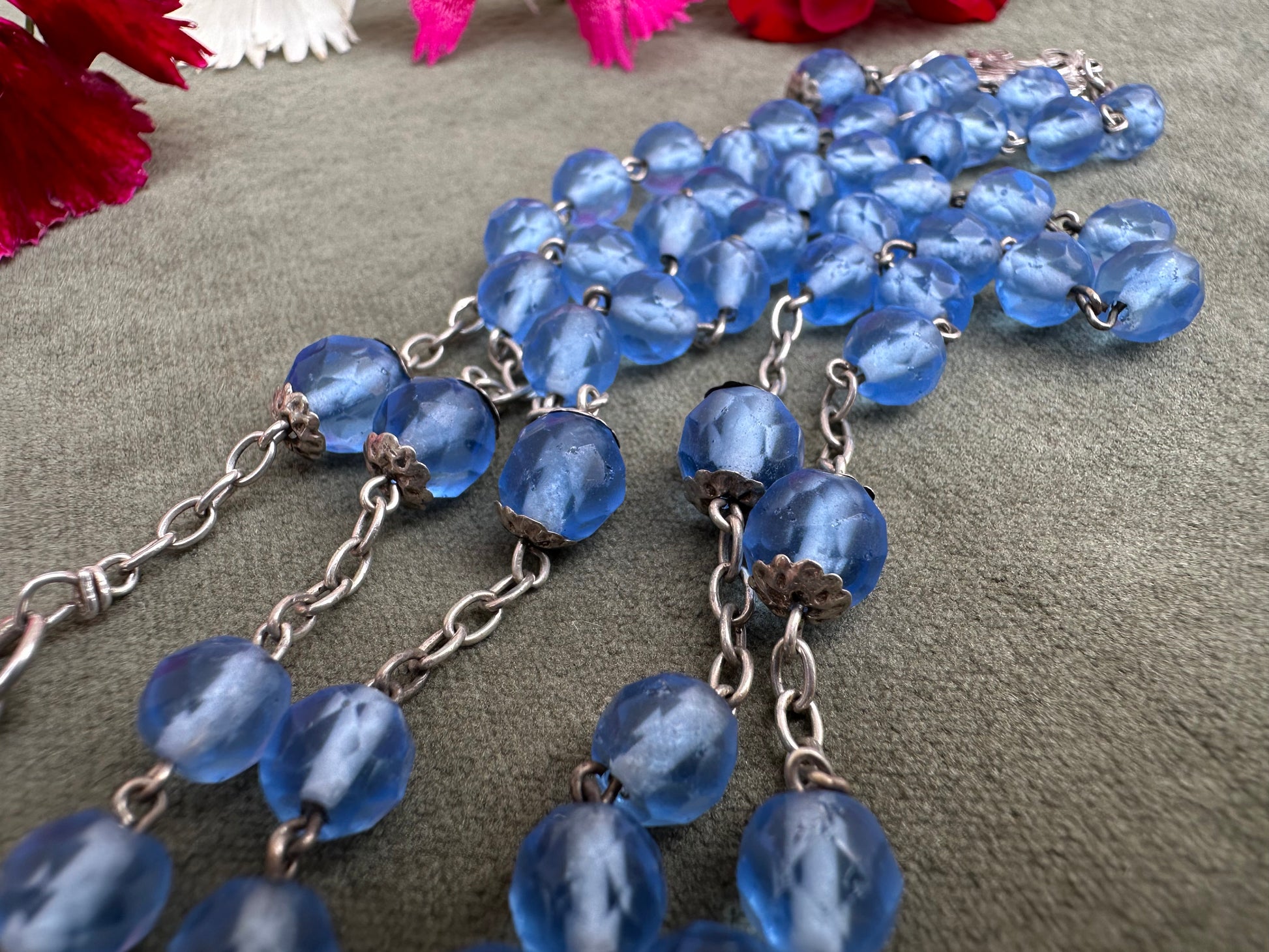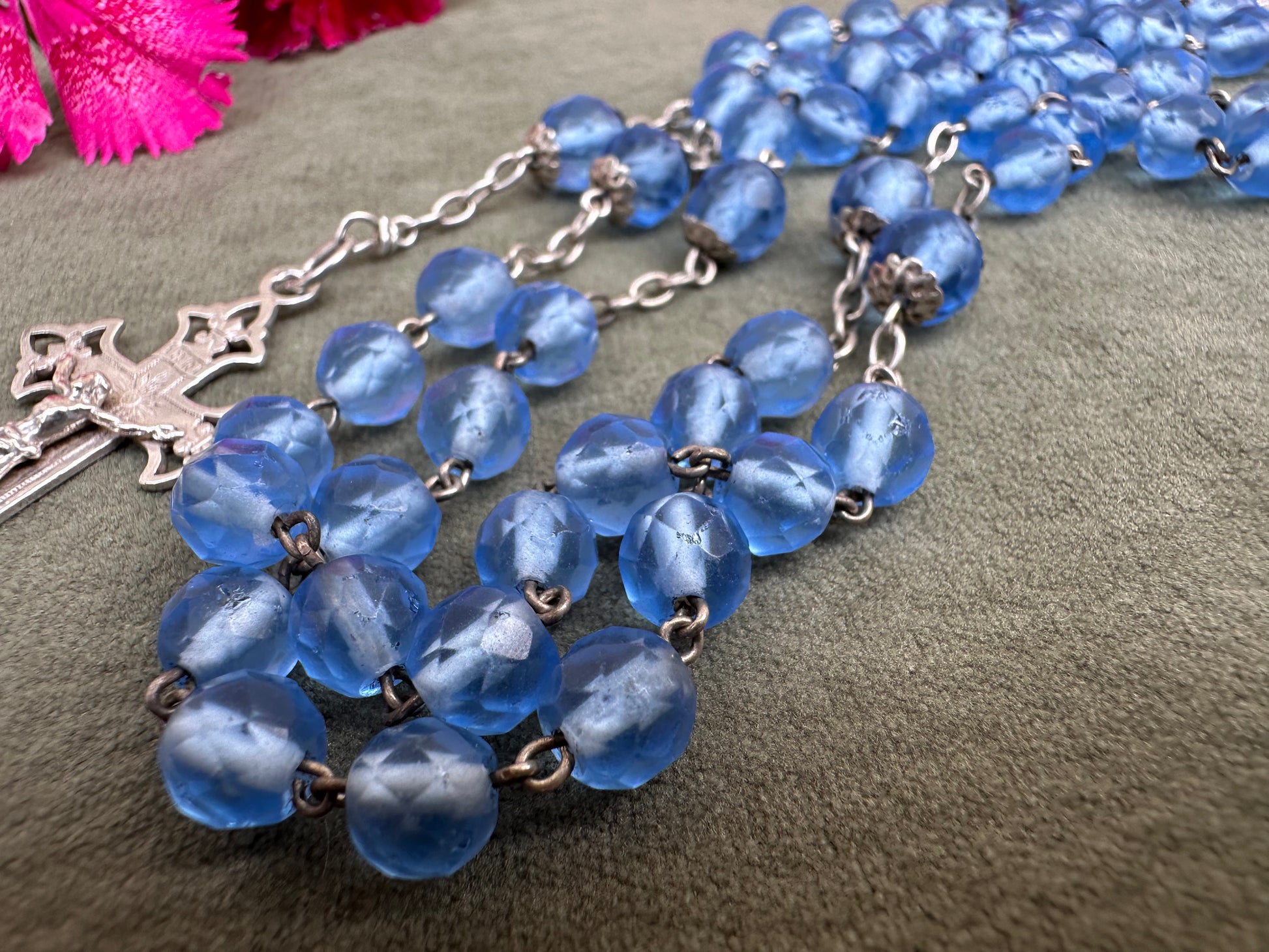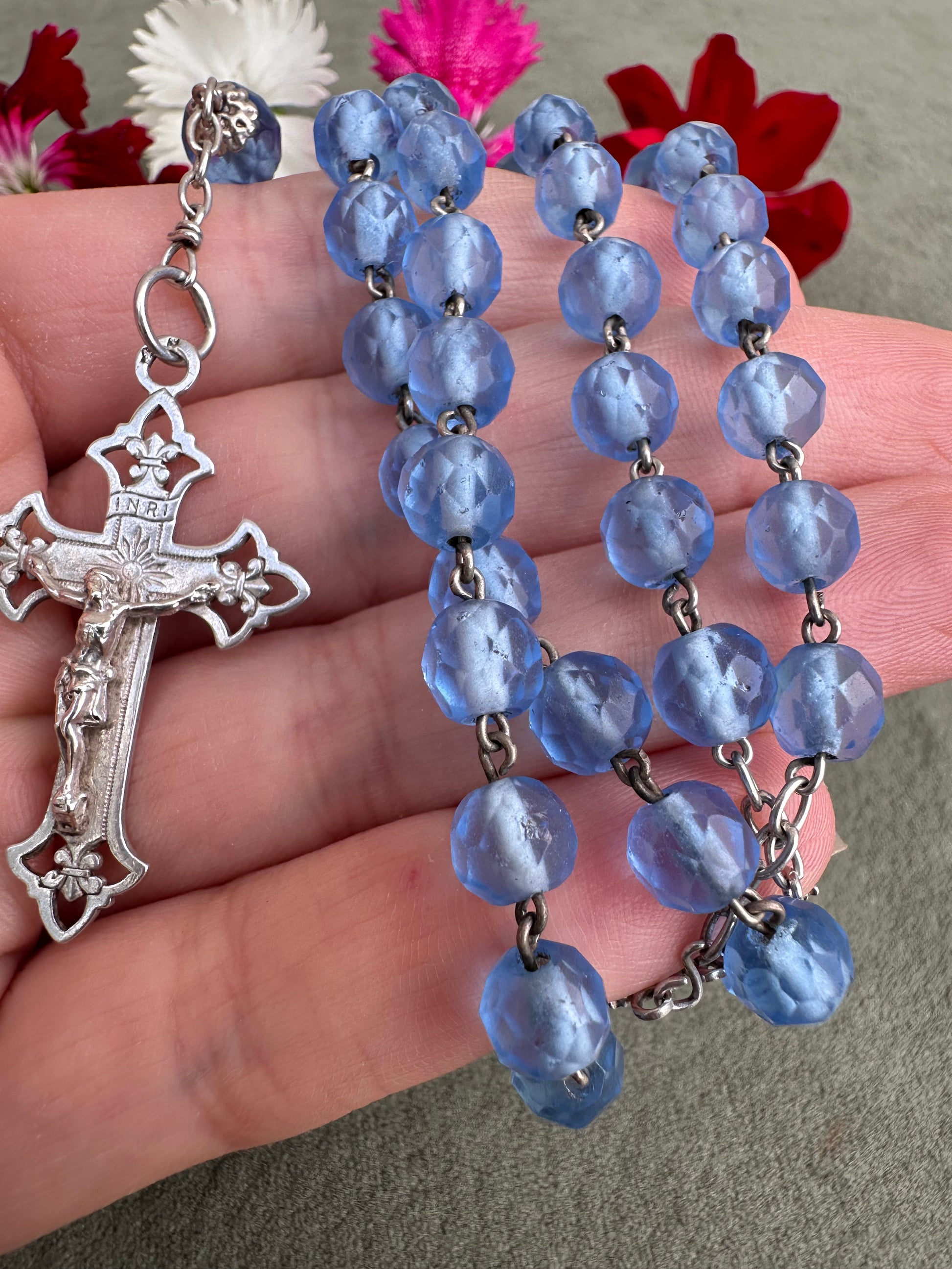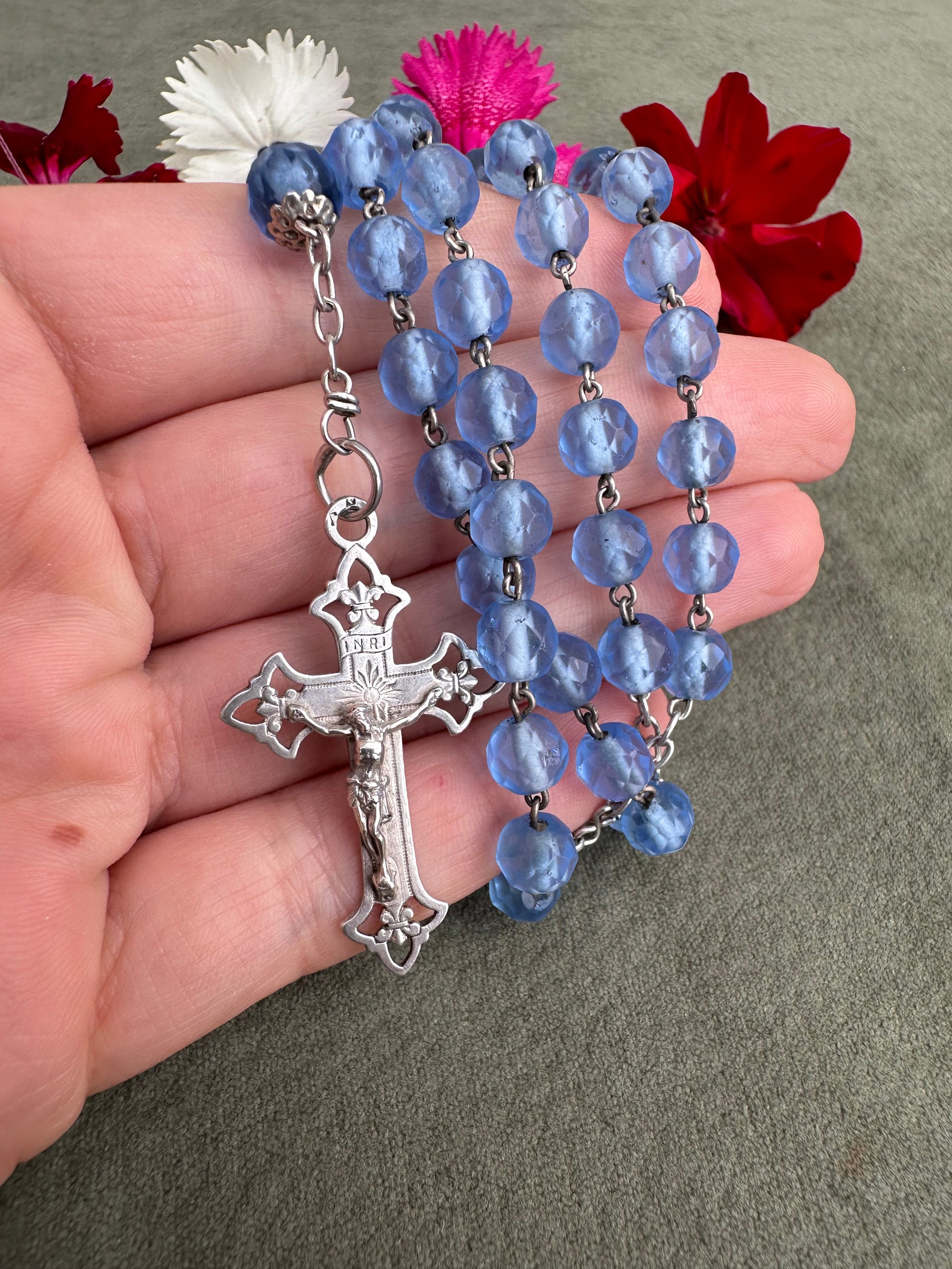 This exquisite French antique rosary from 1910 features elegant faceted blue glass beads, each shimmering with a beautiful, translucent depth. The beads are perfectly complemented by the bright sterling silver chain, crucifix, and centerpiece, showcasing timeless craftsmanship. Pater beads are finely capped. The openwork crucifix is delicately detailed, adding an air of sophistication, while the centerpiece displays an interlaced "M" of Mary, symbolizing devotion to the Virgin Mary.