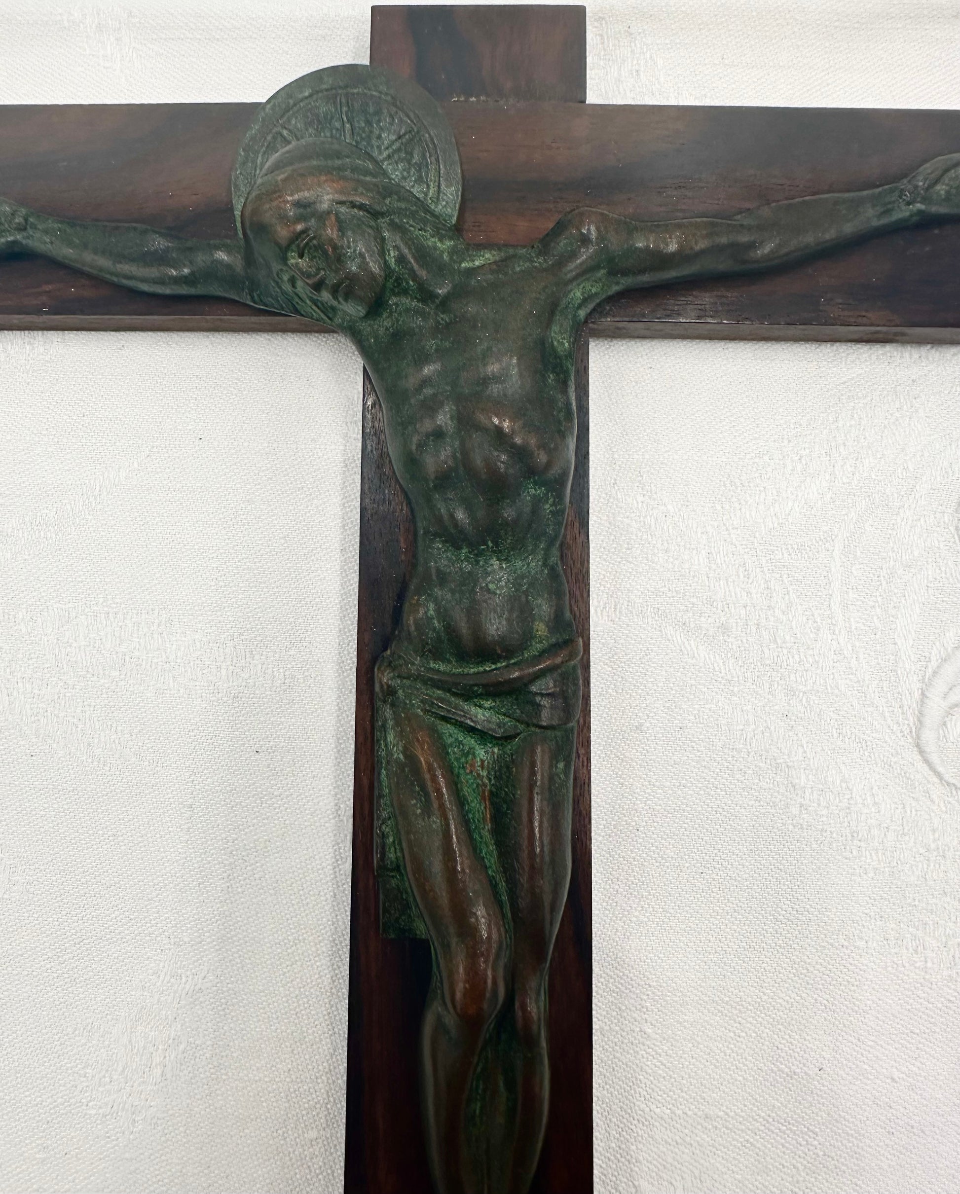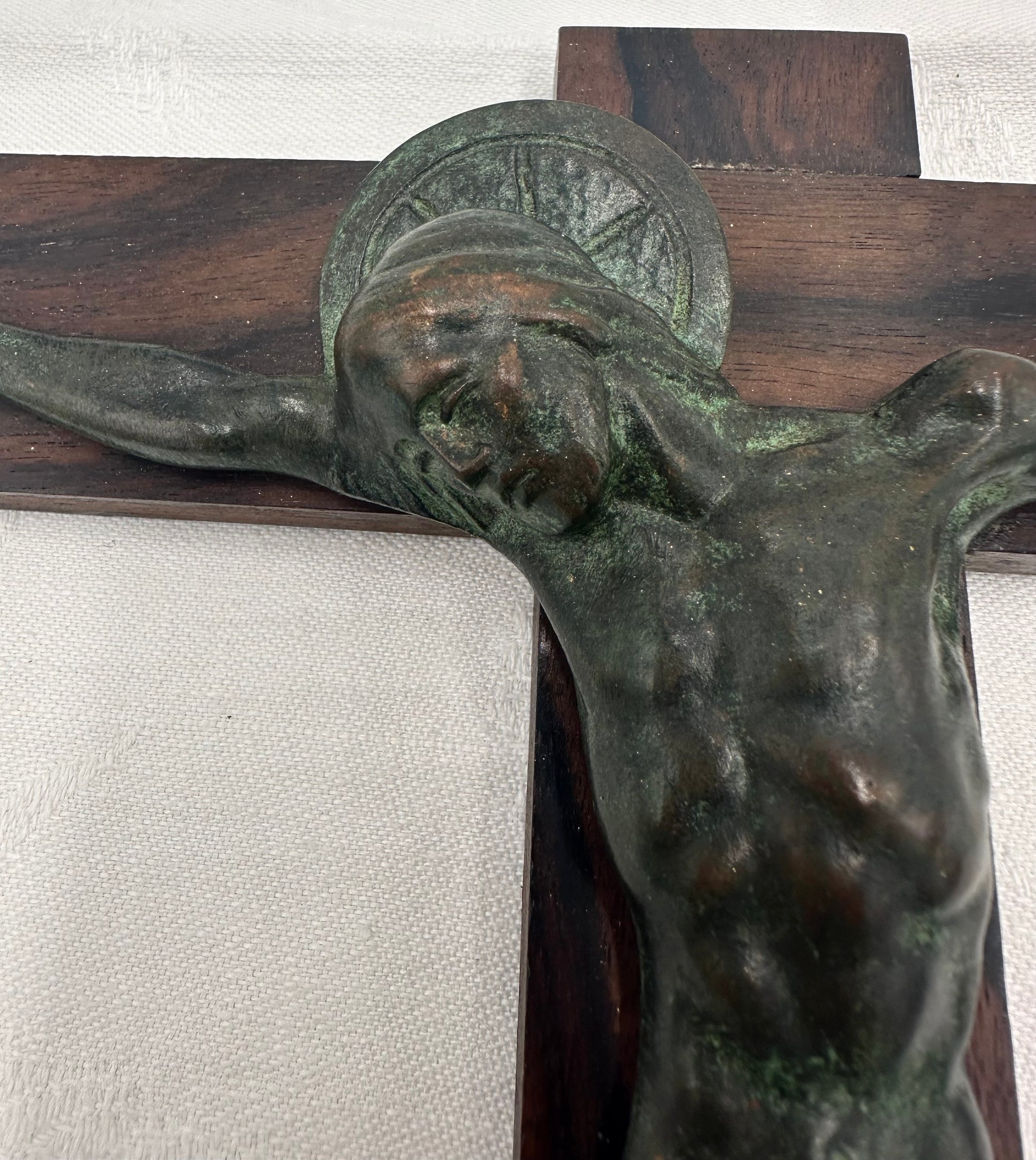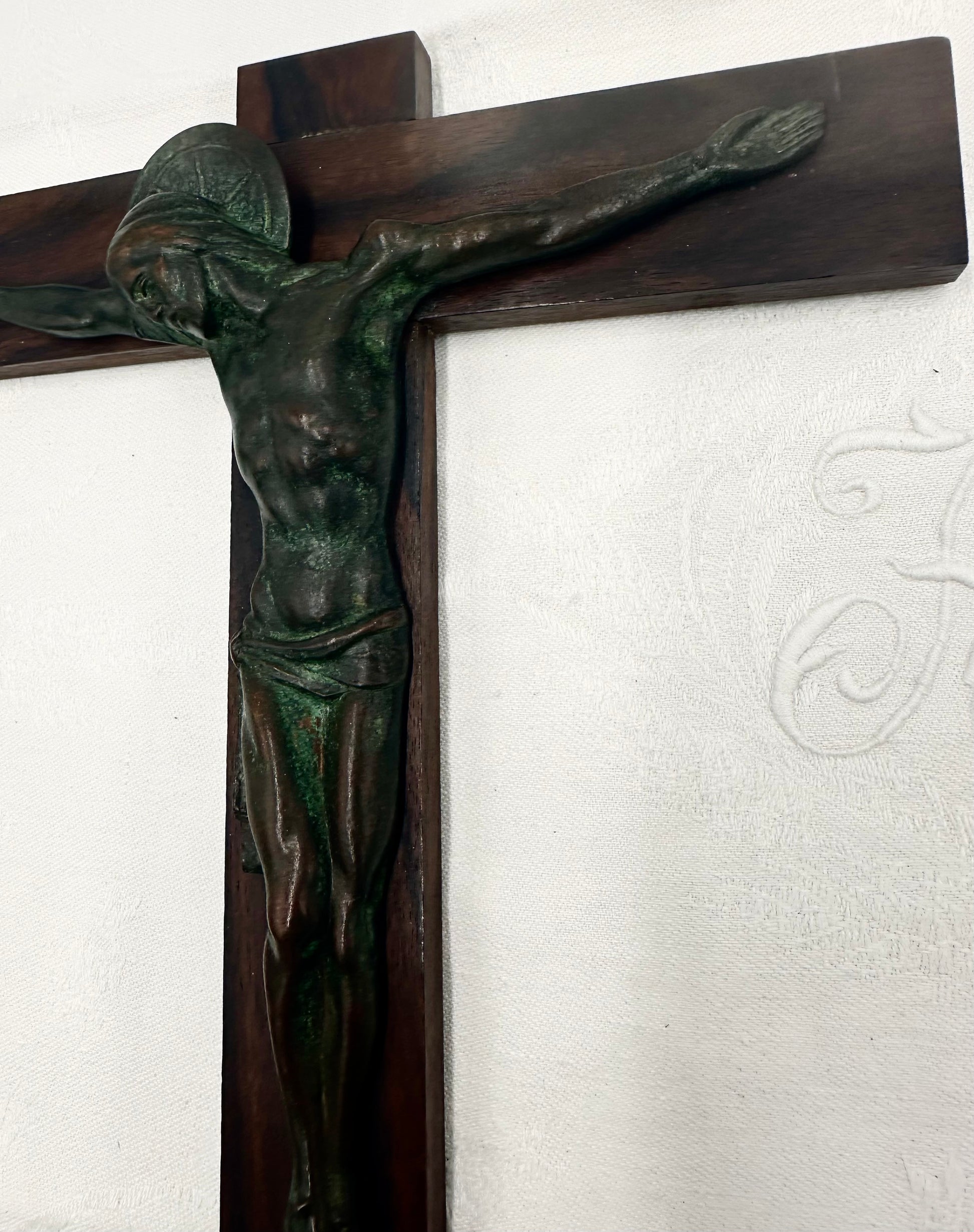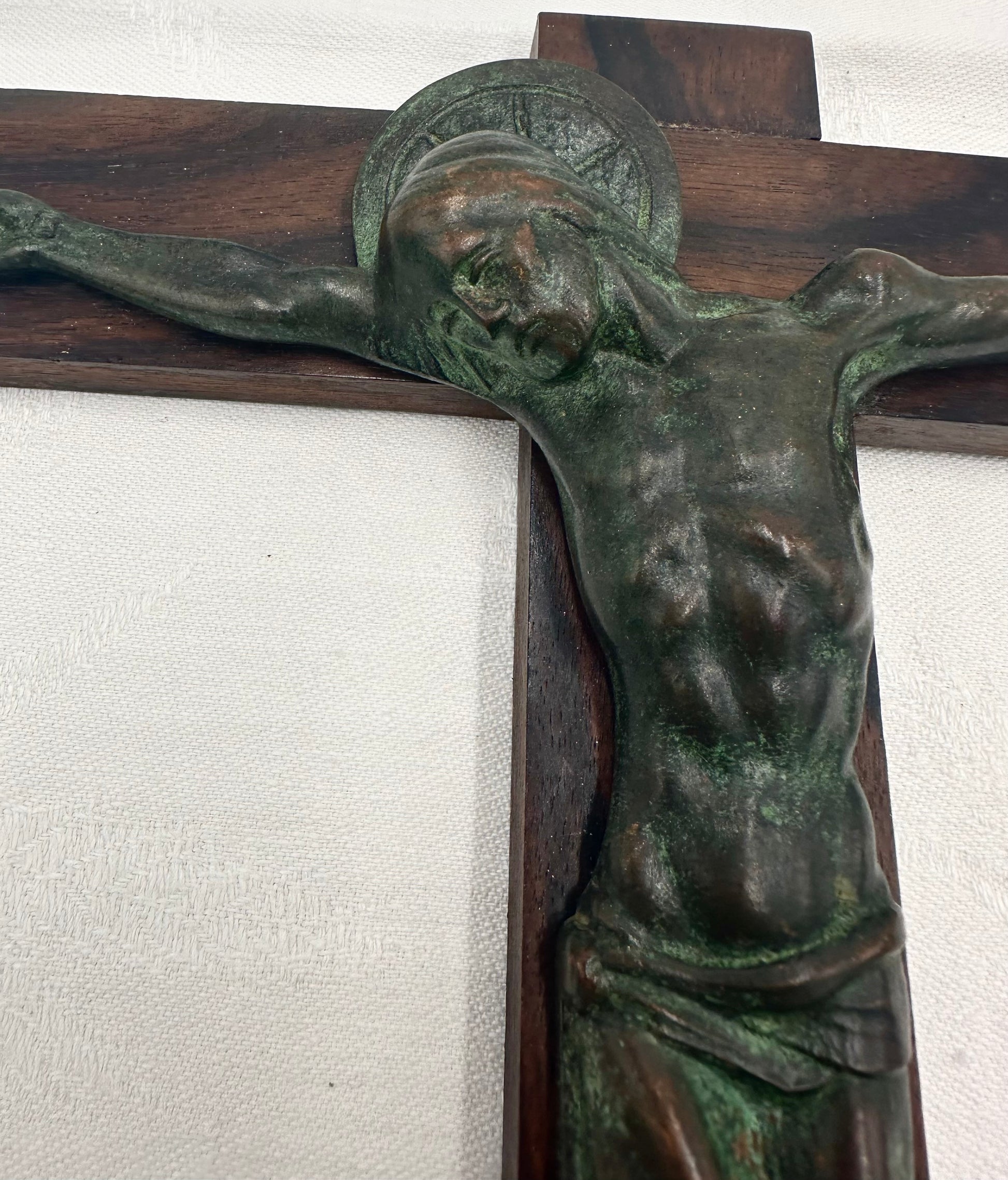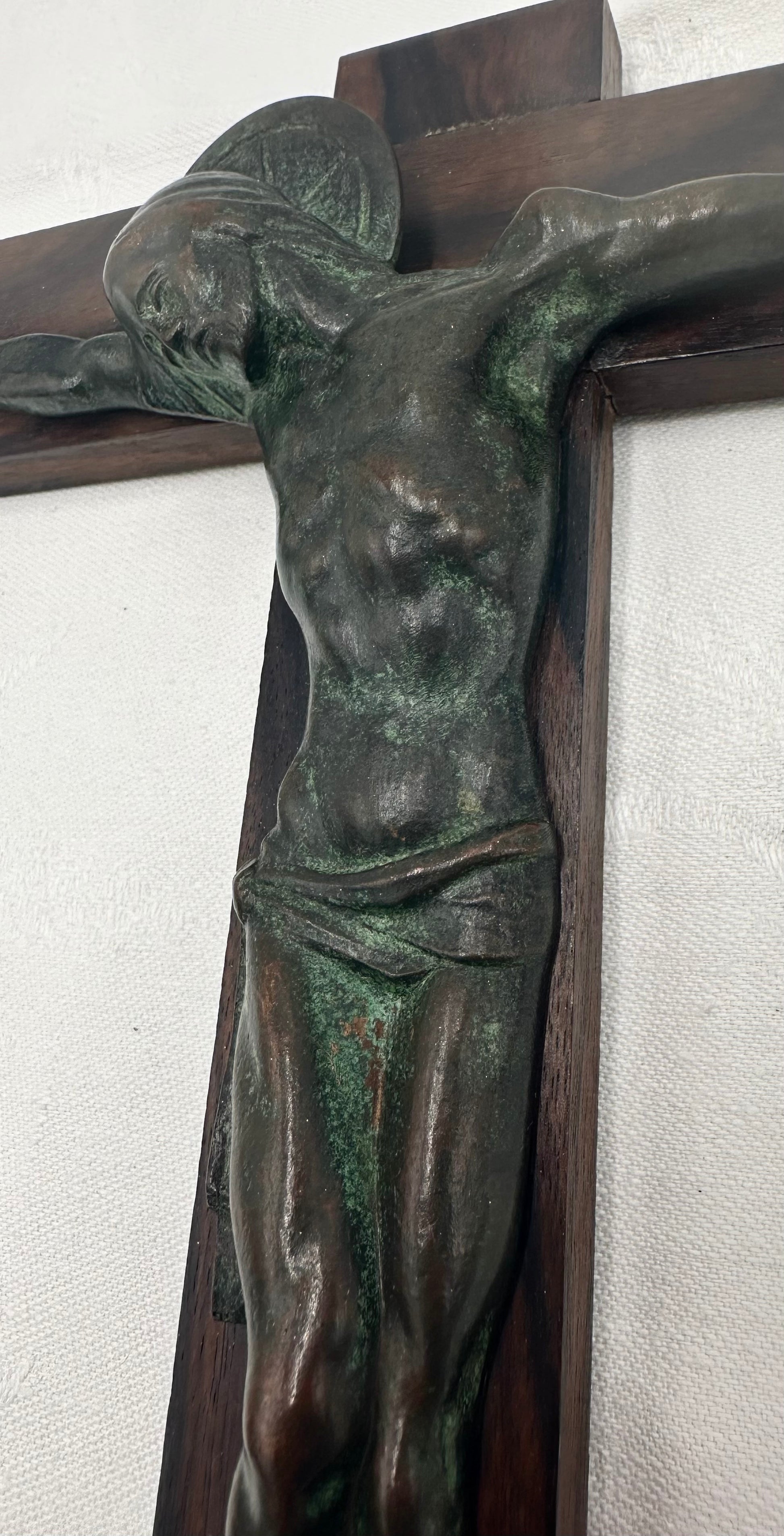 A French antique religious wall cross made of bronze with a green patina and wood. Jesus Christ corpus is signed by the French artists Hartmann (1908-1994). This Art Deco wall crucifix dates from the 1940's-1950's.