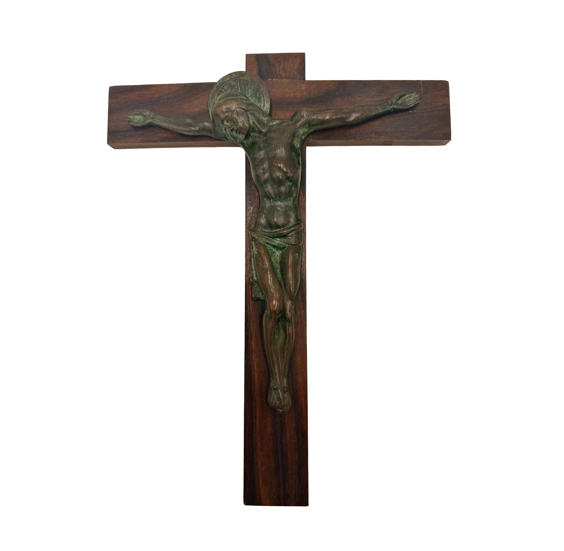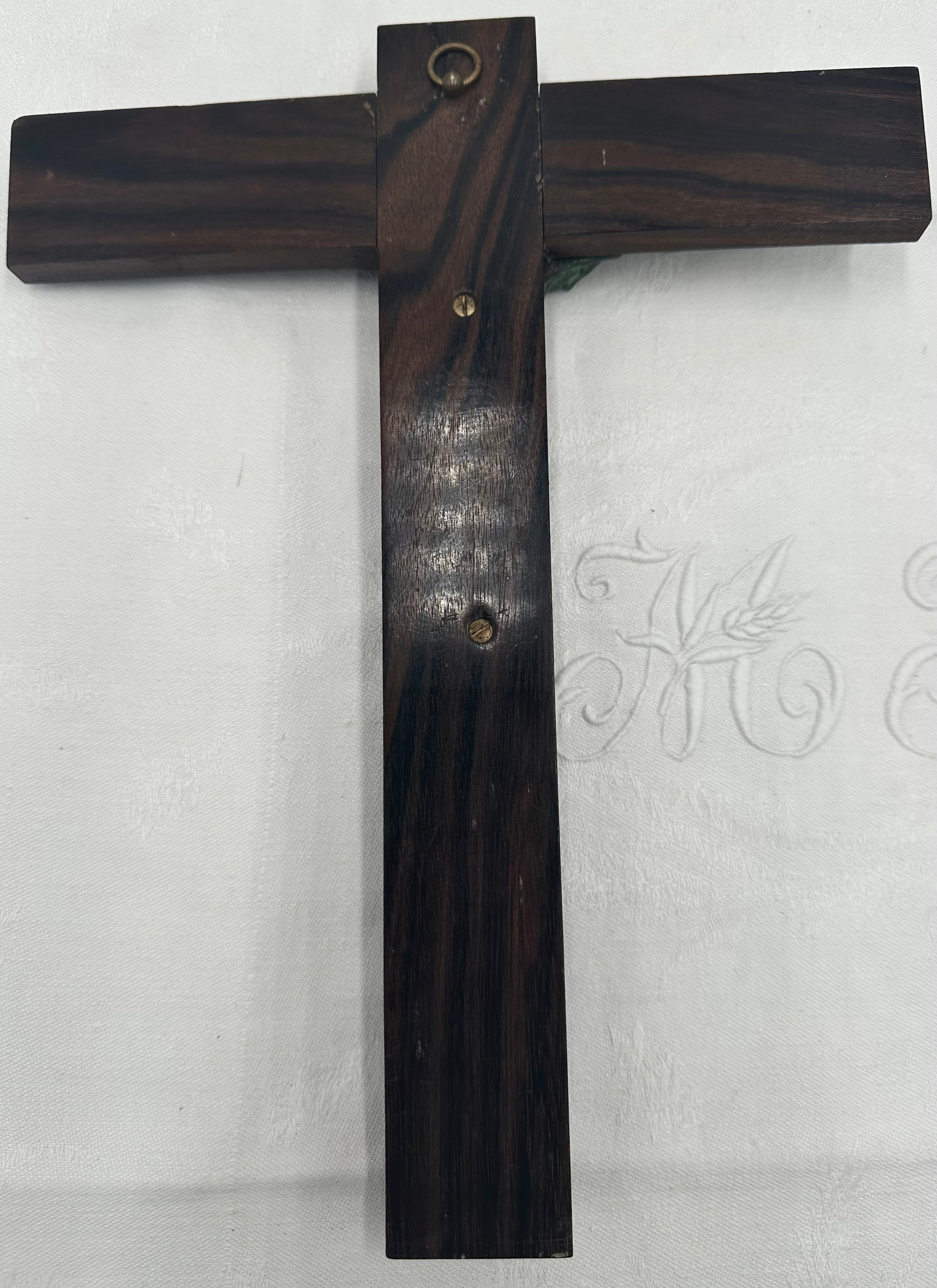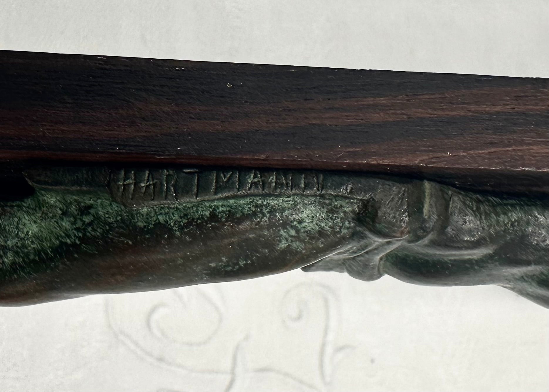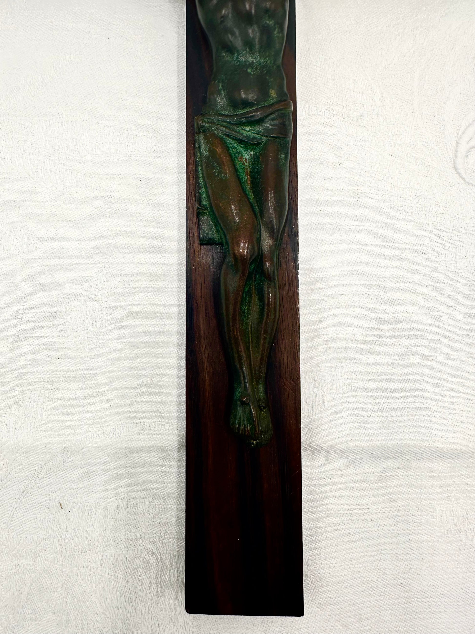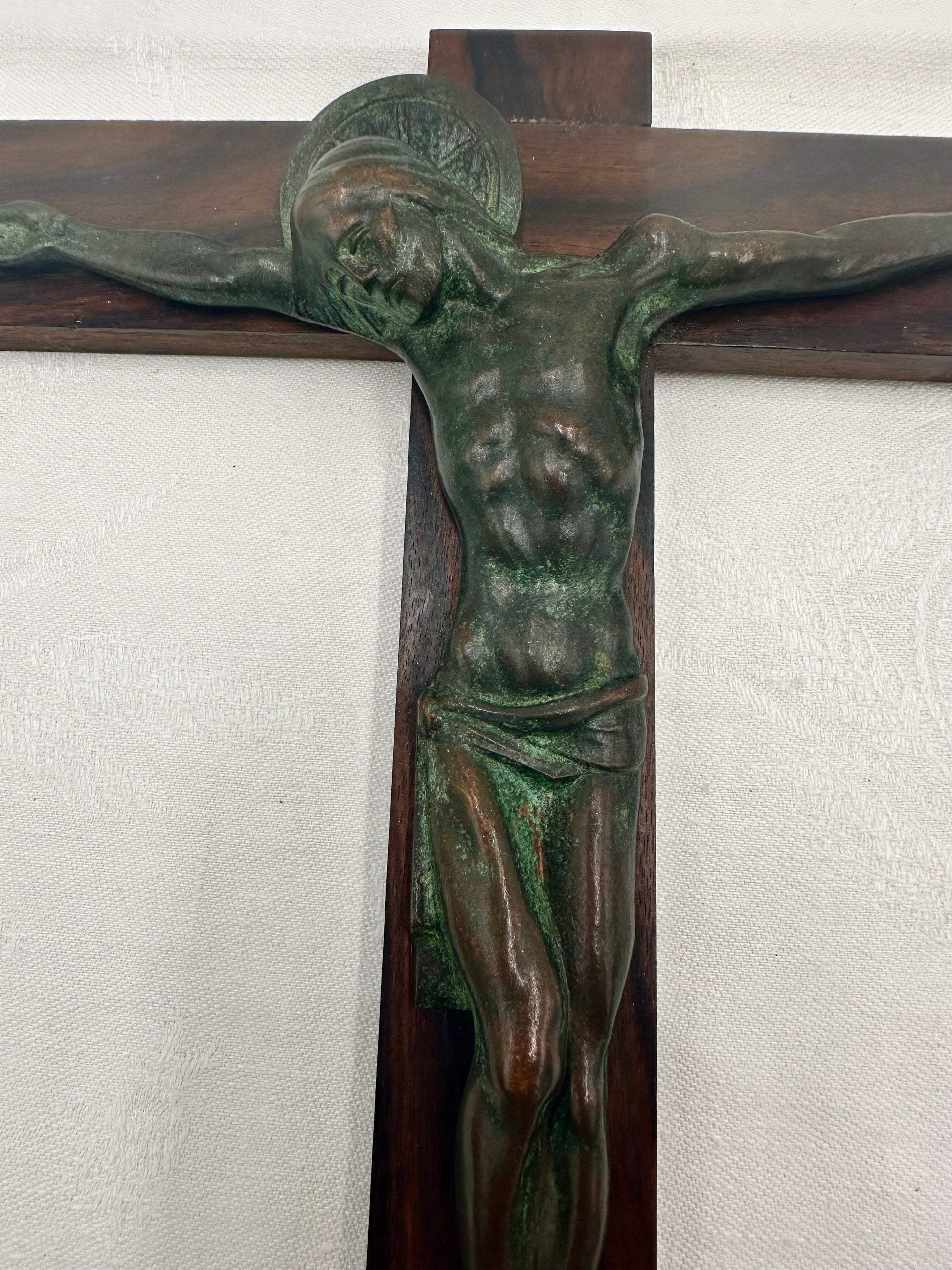 A French antique religious wall cross made of bronze with a green patina and wood. Jesus Christ corpus is signed by the French artists Hartmann (1908-1994). This Art Deco wall crucifix dates from the 1940's-1950's.
