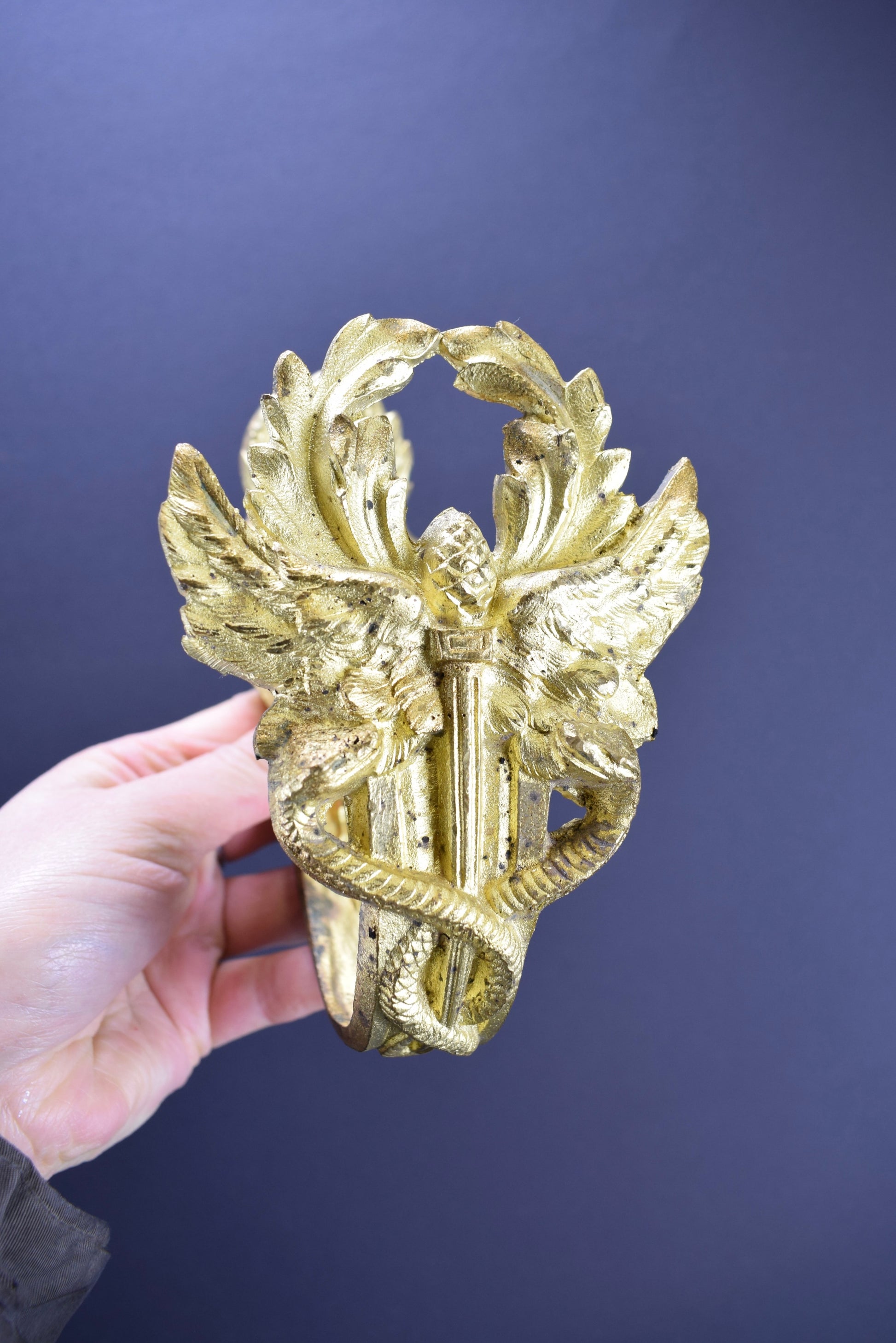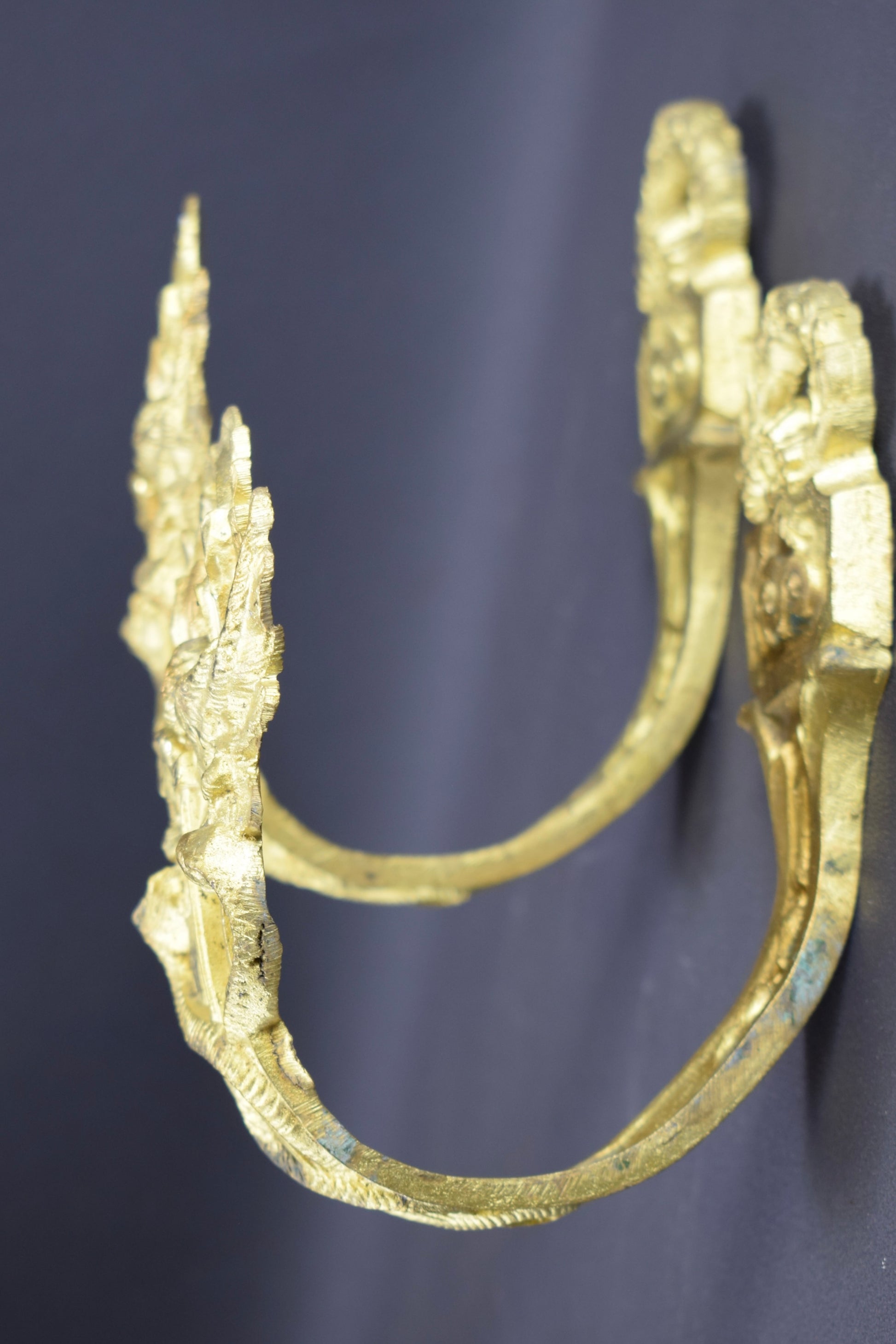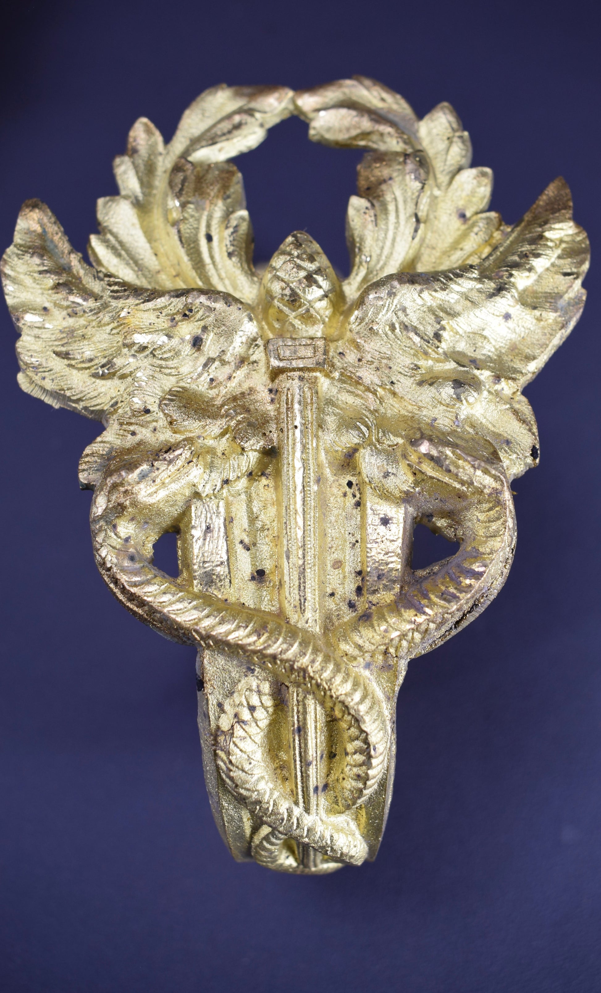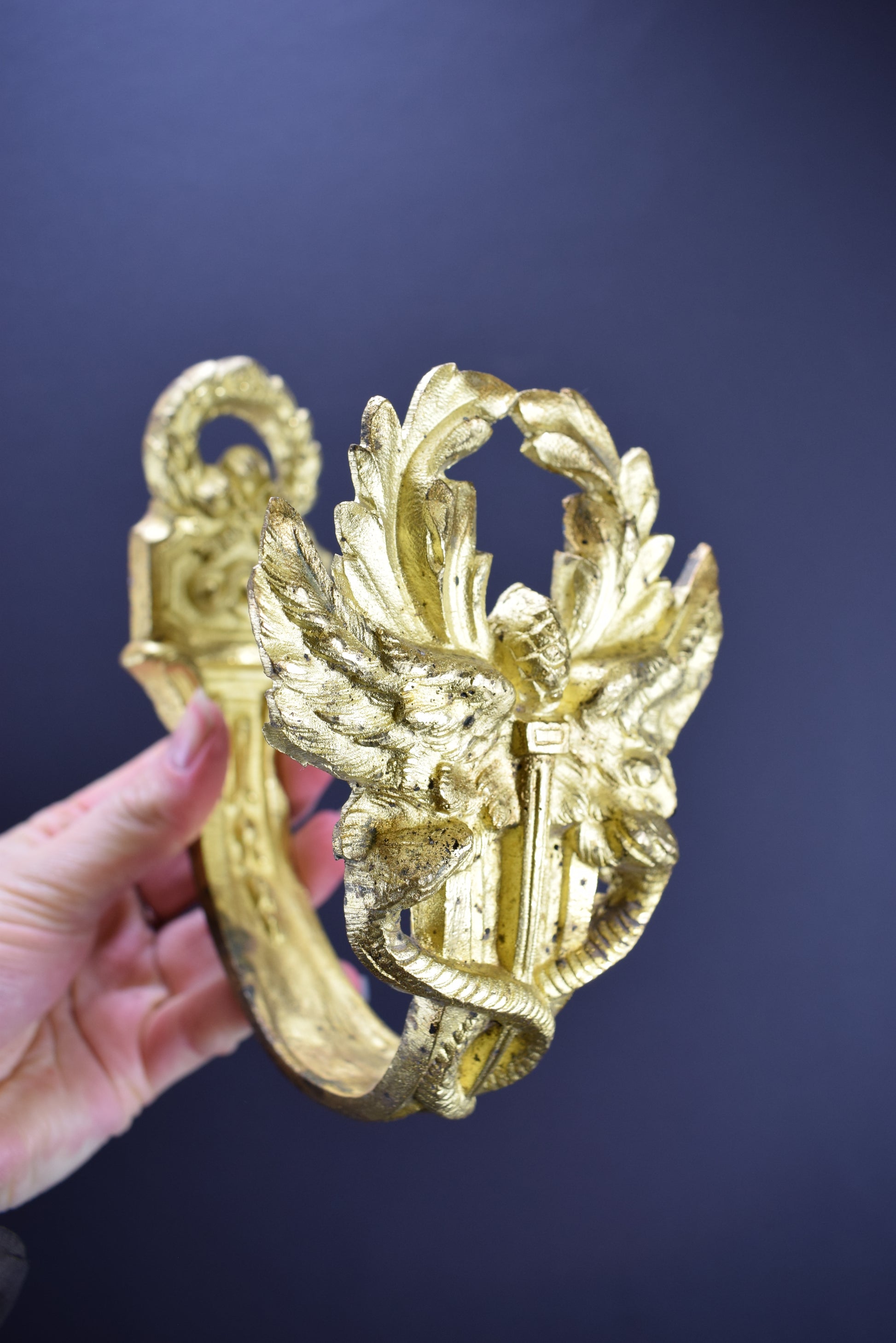 Charming antique French curtain holdbacks dating to the late 19th century. The Victorian gilt bronze curtain holders features a caduceus: a short laurel staff entwined by two serpents, surmounted by wings. The caduceus is the staff carried by Hermes in Greek mythology. Nowadays, it is a symbol for medicine. Very rare design, hard to find ! Do not miss it !