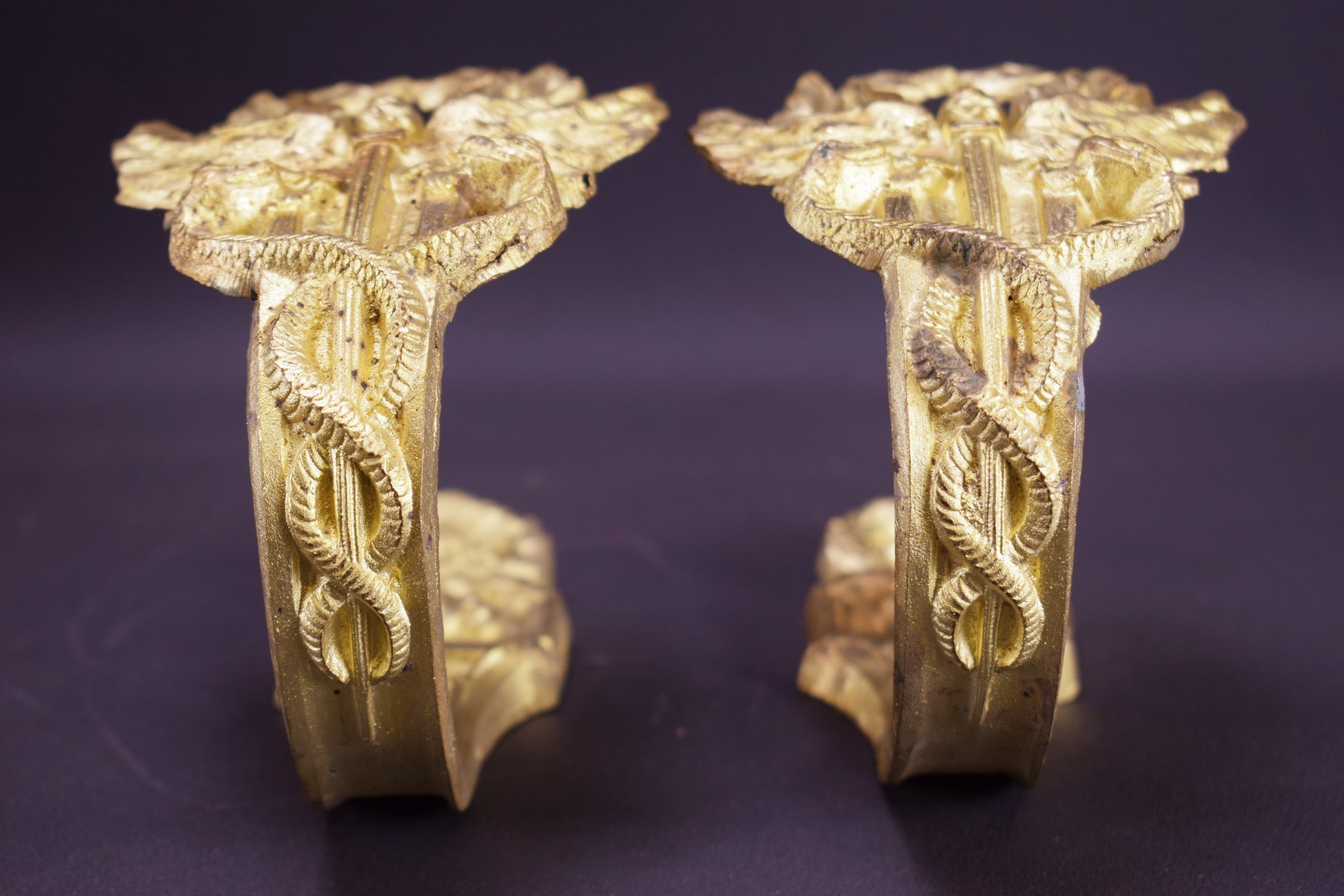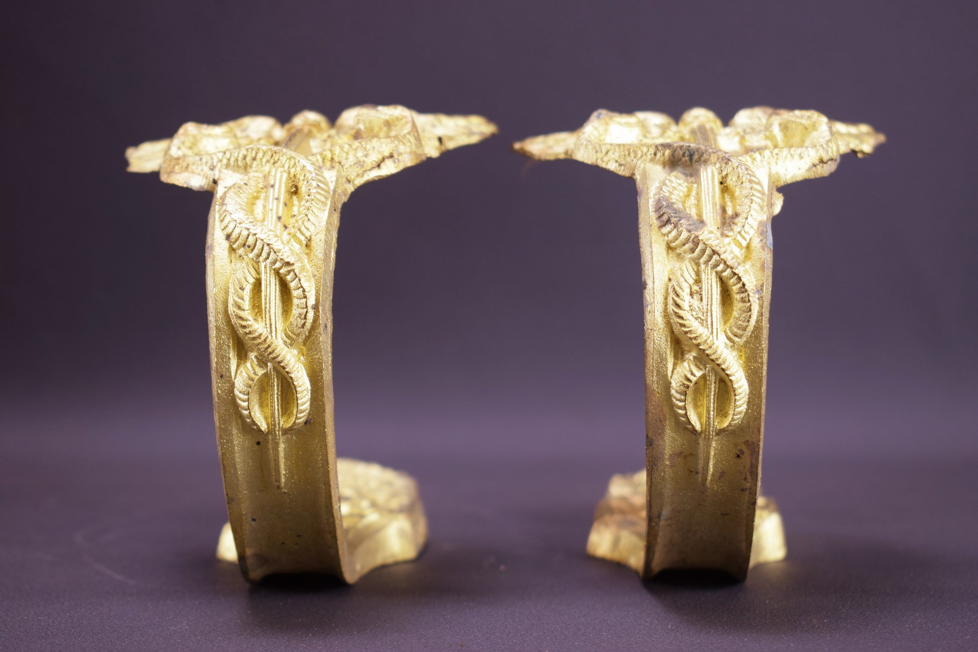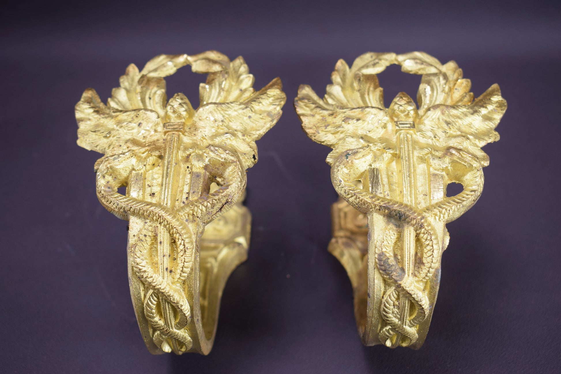 Charming antique French curtain holdbacks dating to the late 19th century. The Victorian gilt bronze curtain holders features a caduceus: a short laurel staff entwined by two serpents, surmounted by wings. The caduceus is the staff carried by Hermes in Greek mythology. Nowadays, it is a symbol for medicine. Very rare design, hard to find ! Do not miss it !