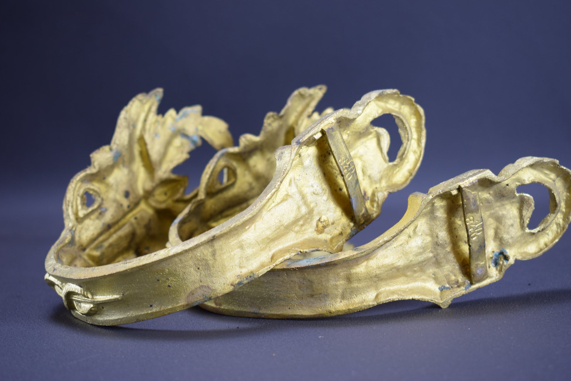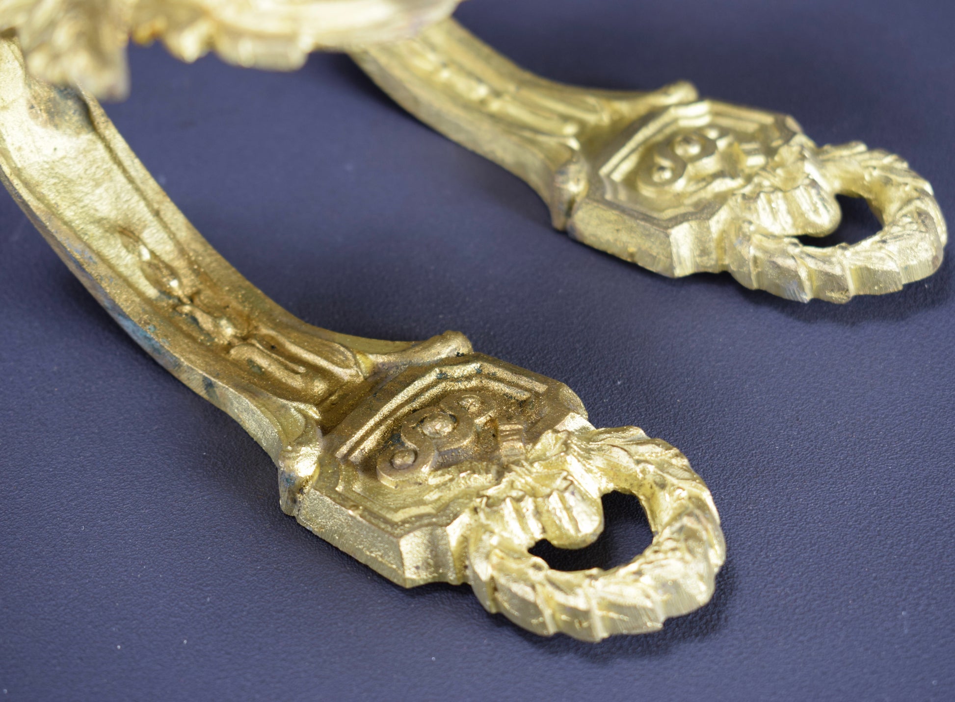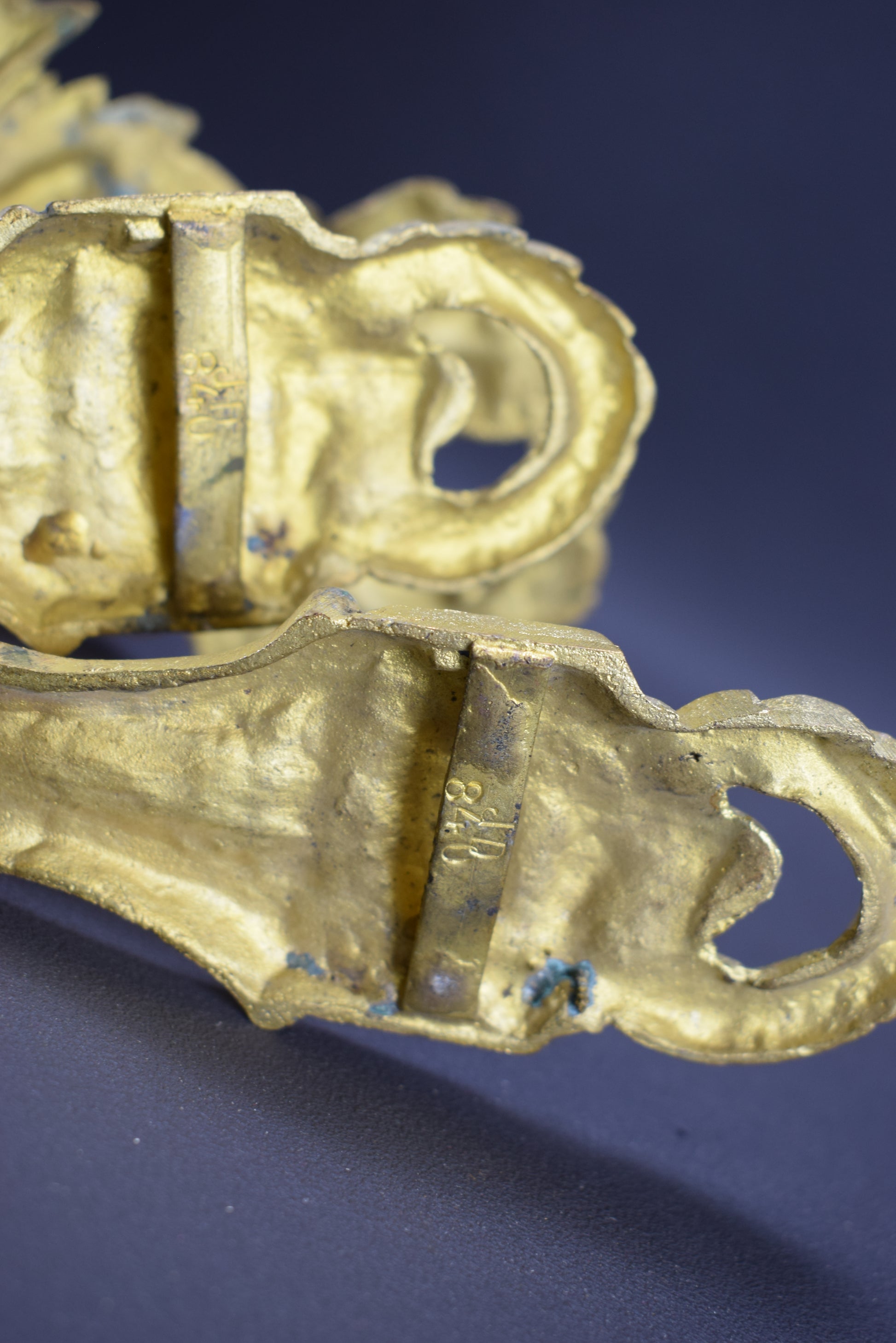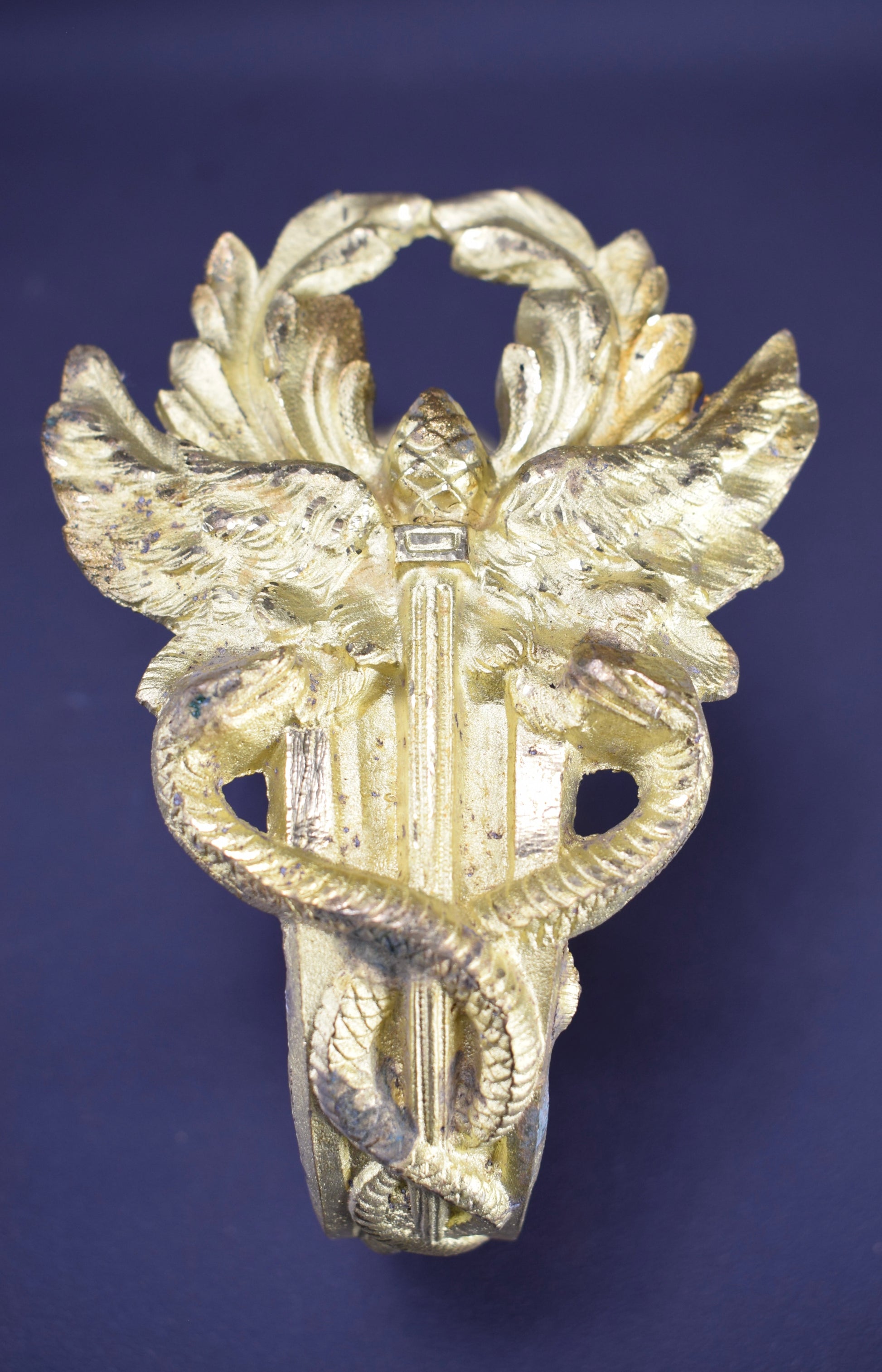 Charming antique French curtain holdbacks dating to the late 19th century. The Victorian gilt bronze curtain holders features a caduceus: a short laurel staff entwined by two serpents, surmounted by wings. The caduceus is the staff carried by Hermes in Greek mythology. Nowadays, it is a symbol for medicine. Very rare design, hard to find ! Do not miss it !