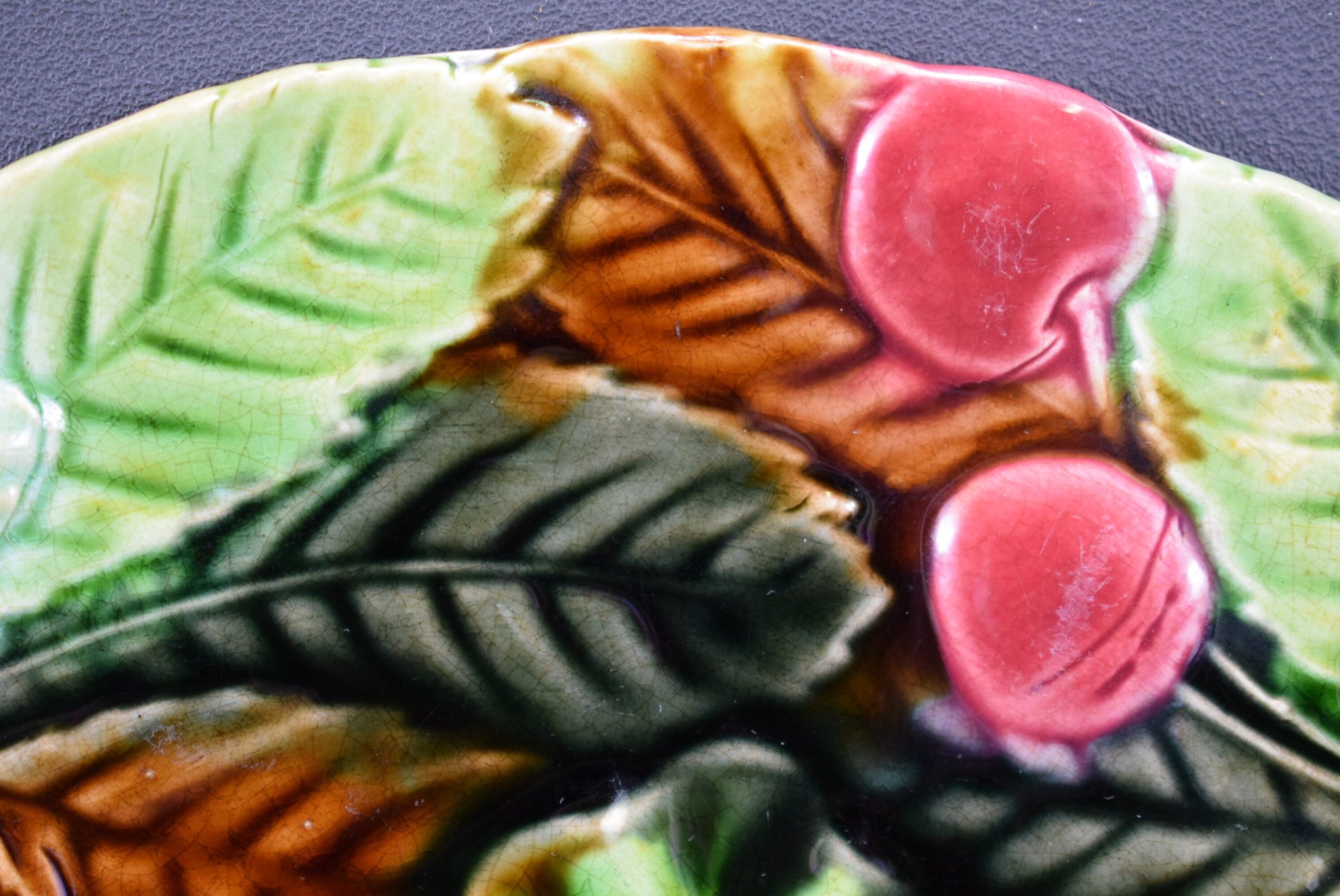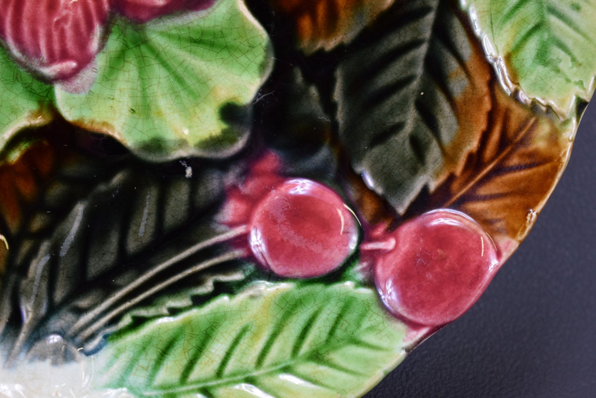 The plate features a beautifully rendered design of cherry leaves, captured in a rich, glossy green glaze. The lifelike leaves are intricately detailed, with veining and texture that bring the natural motif to life. Scattered among the leaves are clusters of deep red cherries, adding a striking contrast and enhancing the plate's visual appeal.