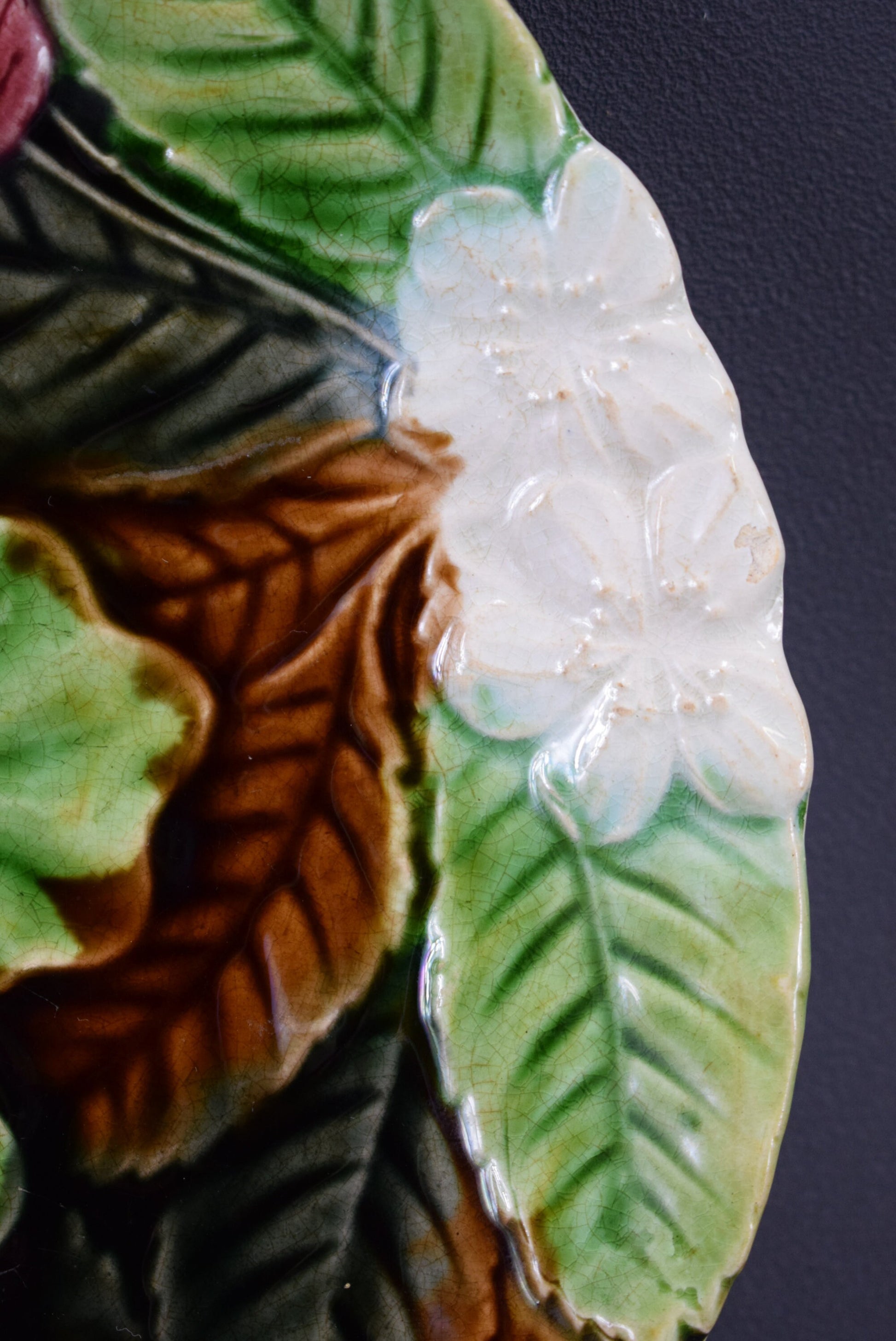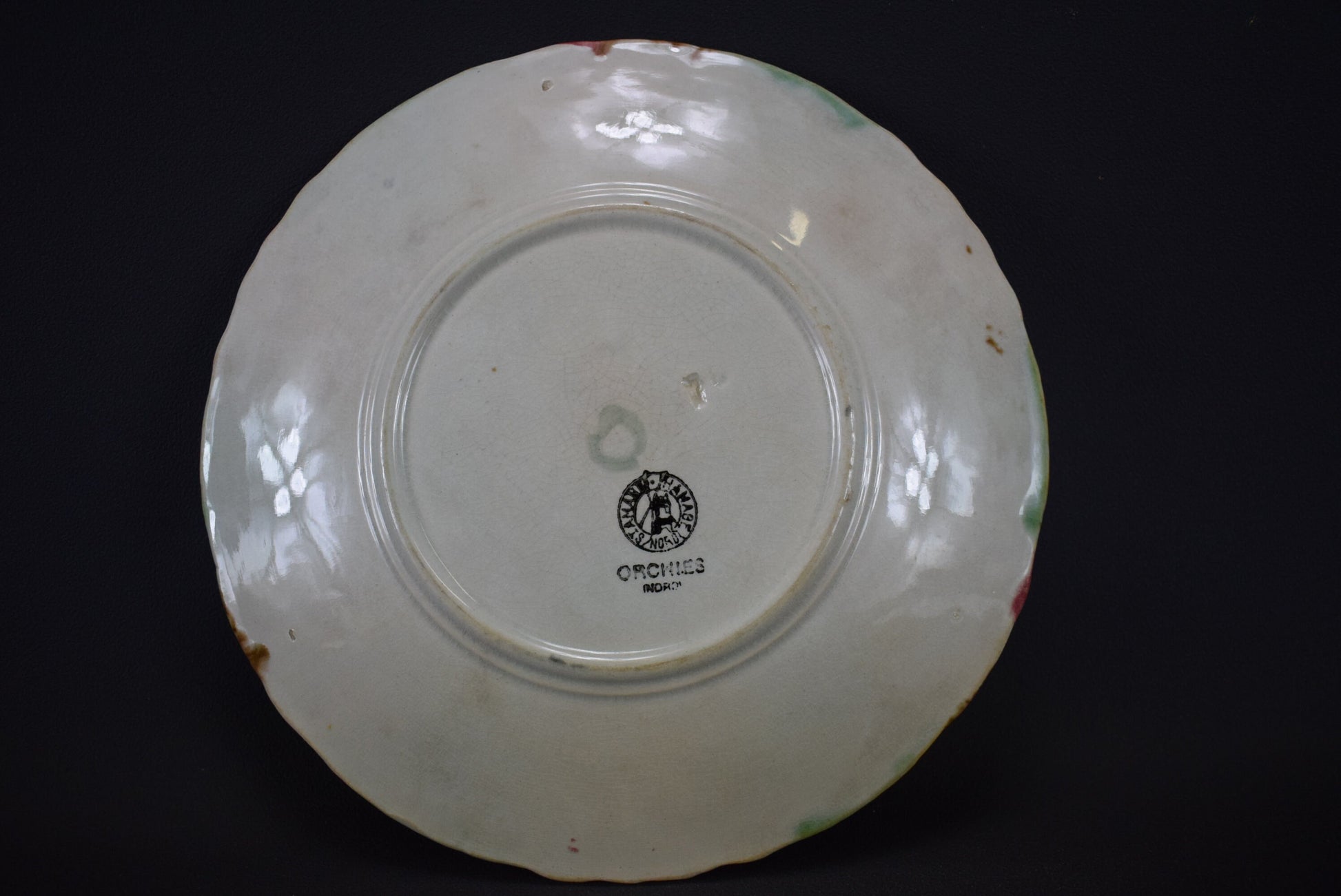 The back of the plate typically bears the Orchies mark, confirming its authenticity and heritage. This antique Orchies majolica plate is not just a functional dish but also a beautiful decorative piece that brings a touch of nature-inspired charm to any setting. Its vibrant colors and intricate design make it a standout addition to any collection or display.