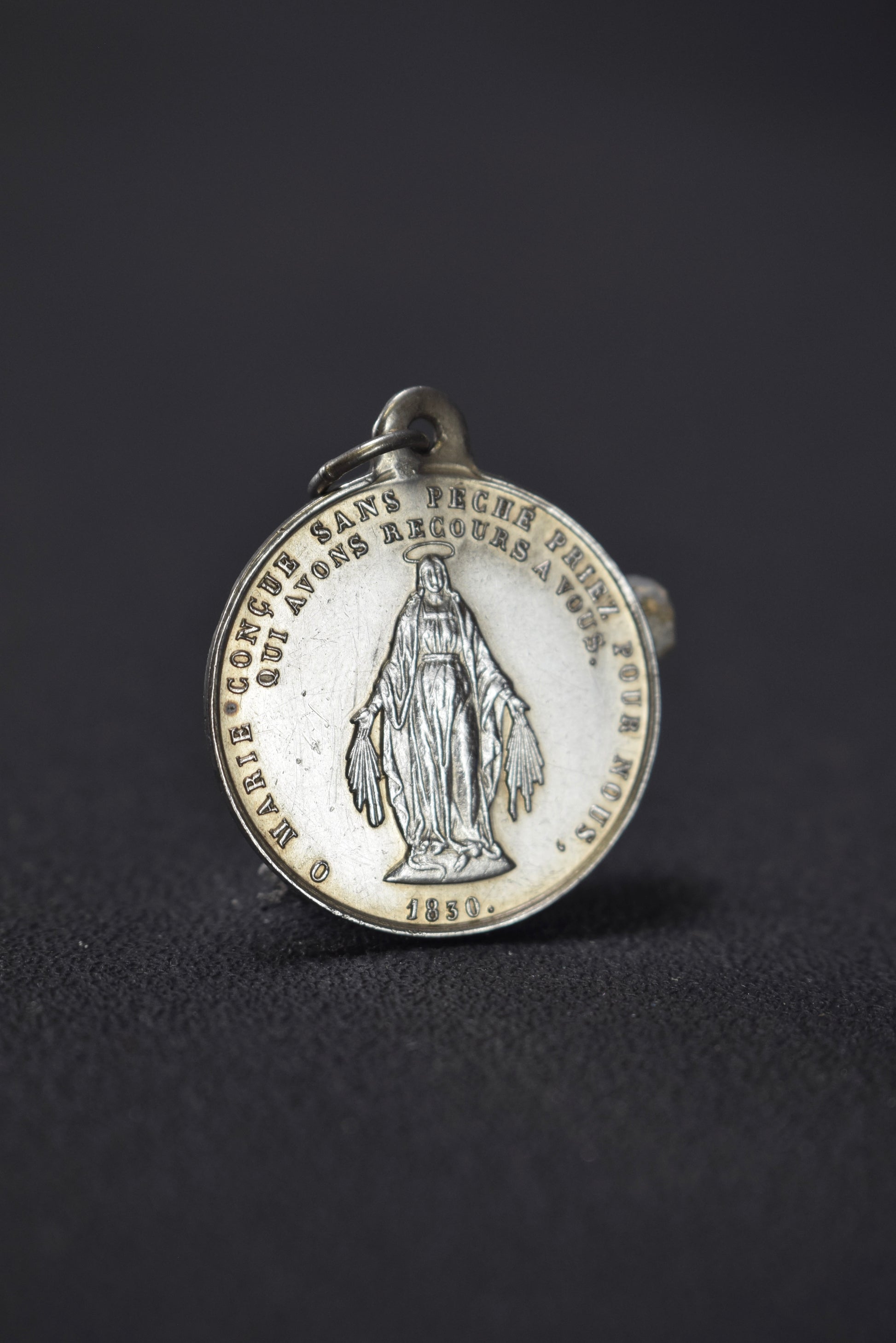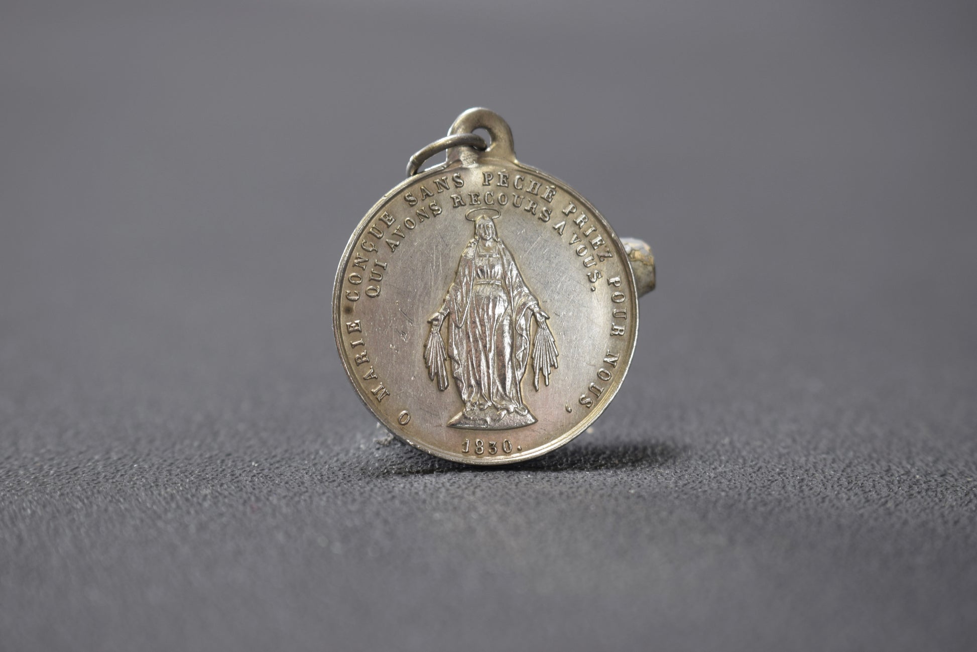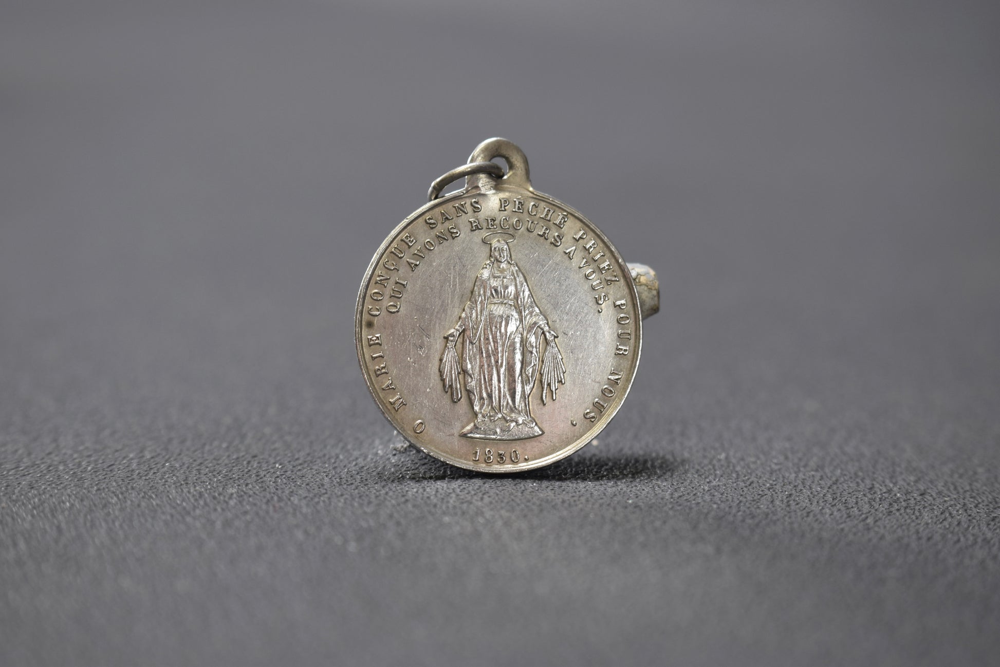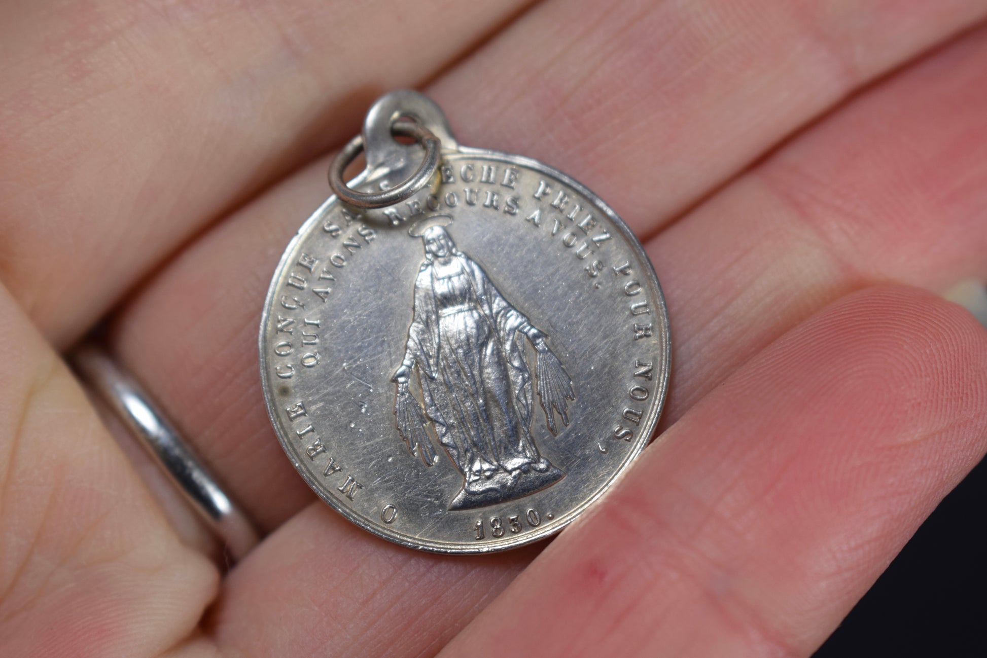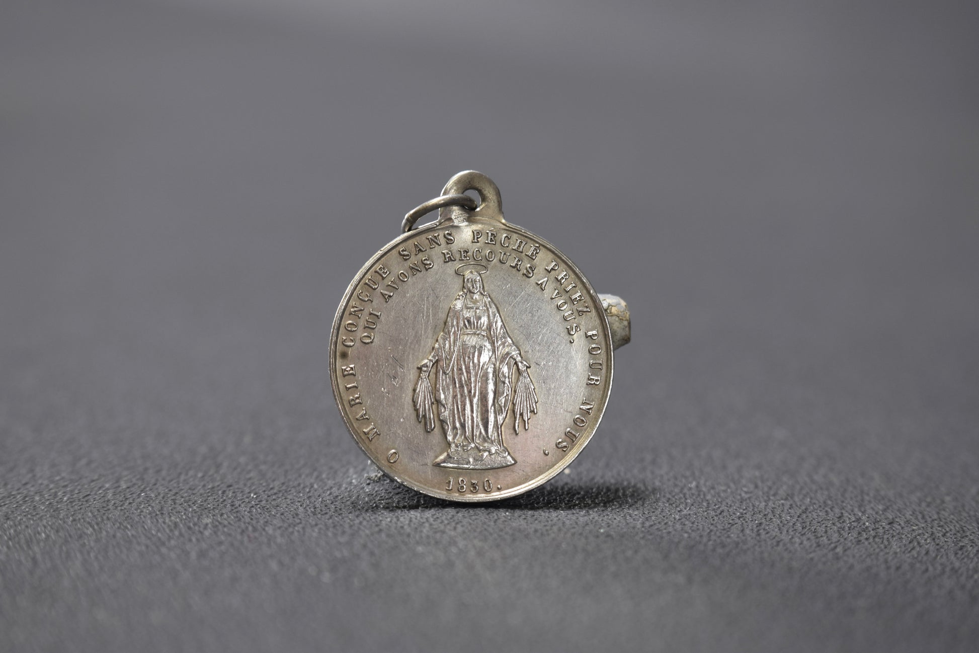 A French antique medal made of solid sterling silver. It dates to the early 20th century. The front shows The Miraculous Medal, also known as the Medal of Our Lady of Graces. The design of which was originated by Saint Catherine Labouré following her apparitions of the Blessed Virgin Mary in Rue du Bac, Paris, France, and made by goldsmith Adrien Vachette.