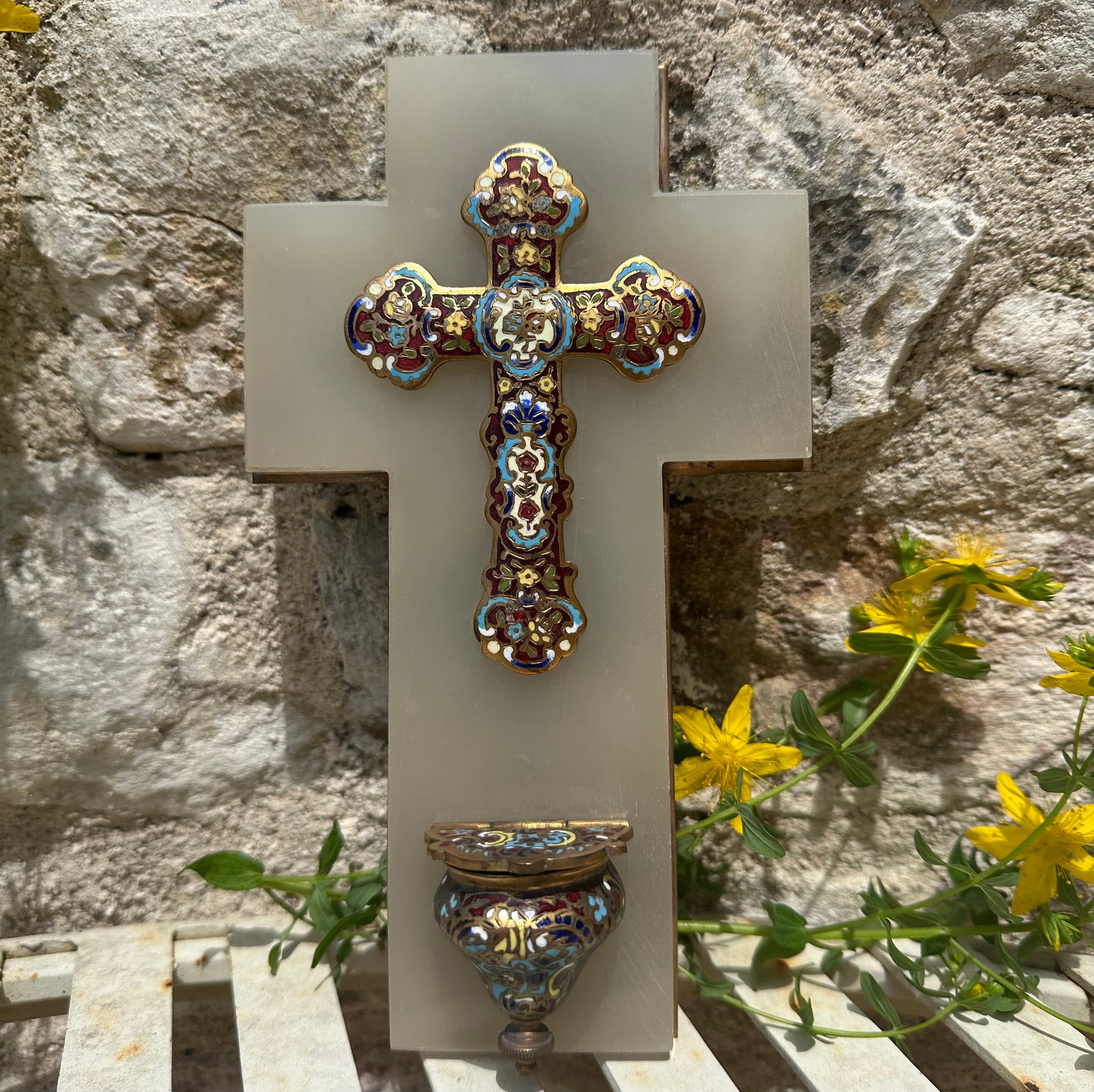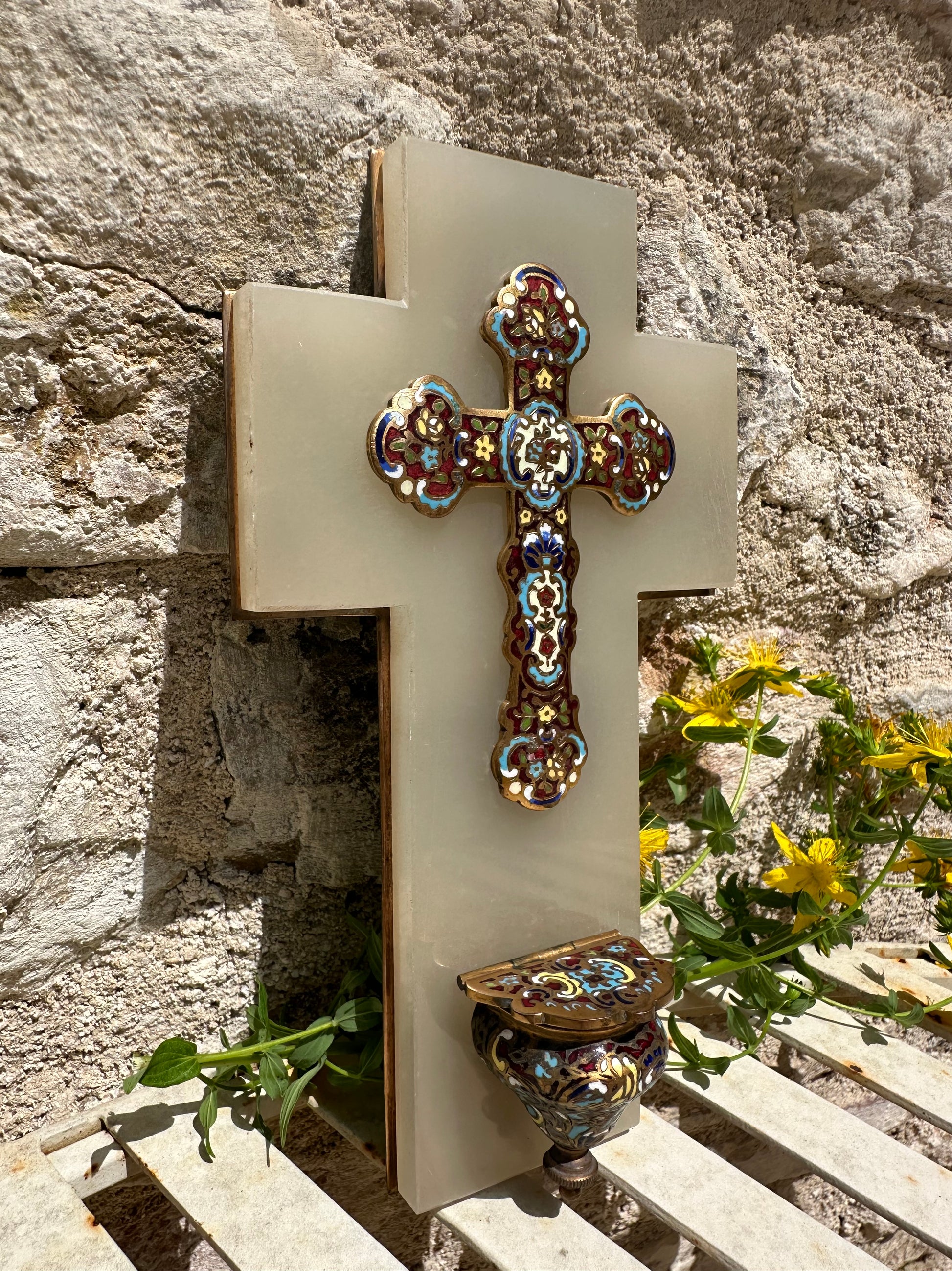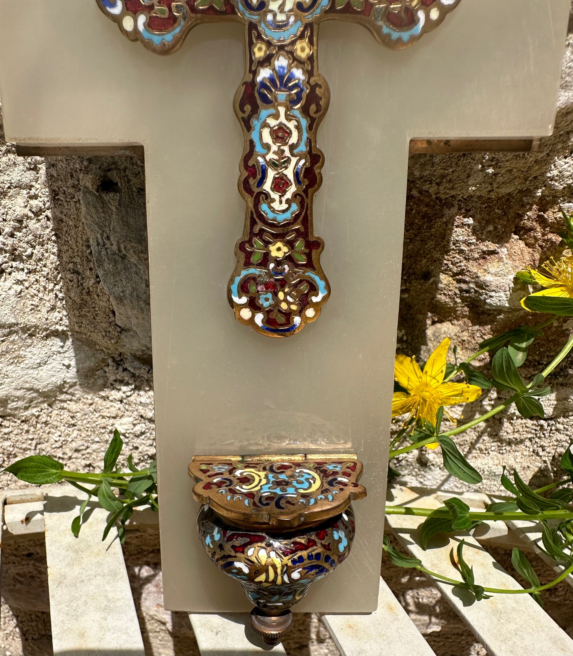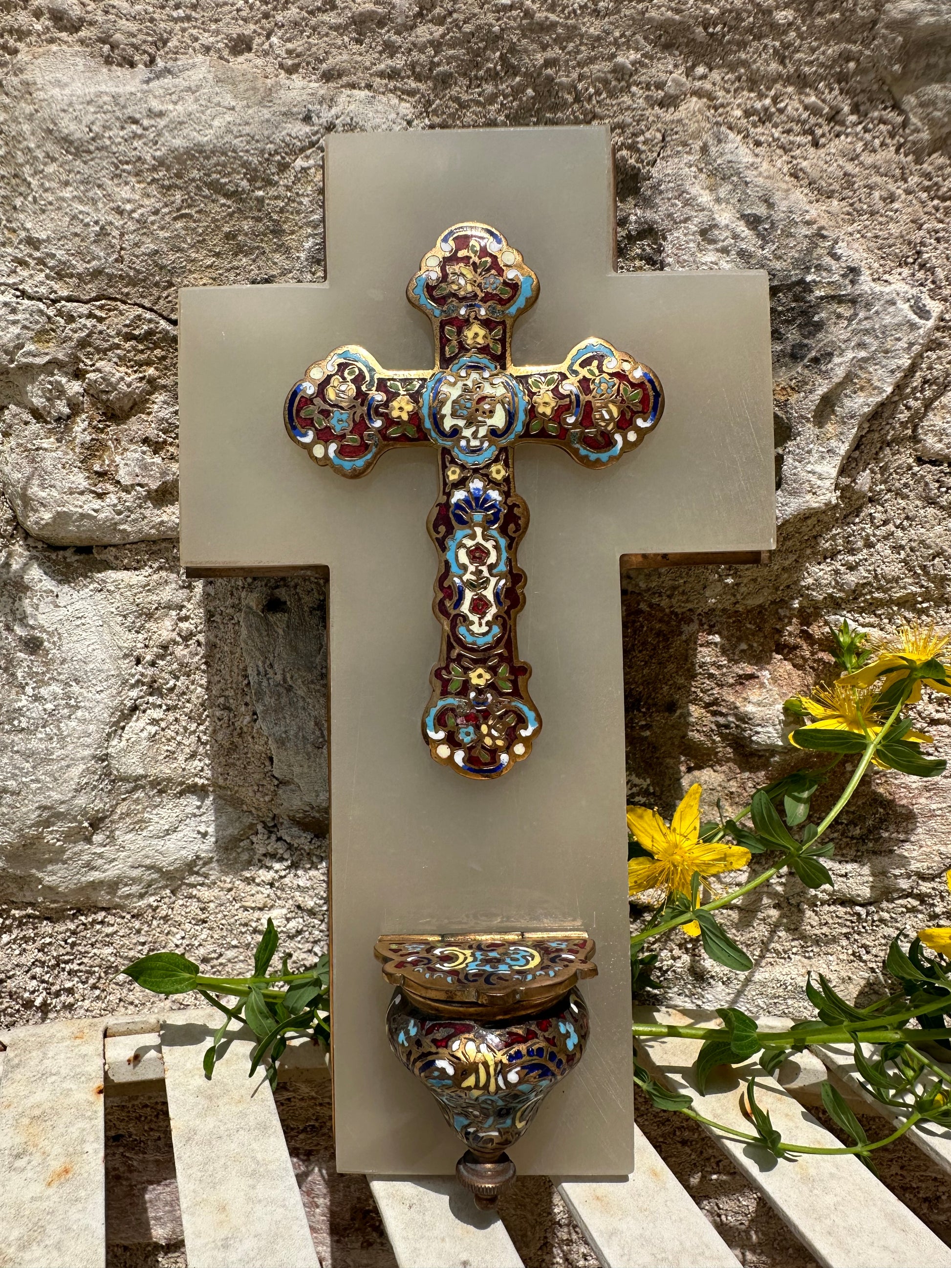A beautiful French antique wall holy water font dating to the late 19th century. The cloisonne enamel bronze cross rests on a white marble plaque and features a combination of green, blue, red, white and yellow enamels with floral intricate motifs. The holy water container is finely enameled in white inside. The back is protected by a brass plaque. There is a brass ring to easily hang it. High quality materials for a beautiful collectible piece.