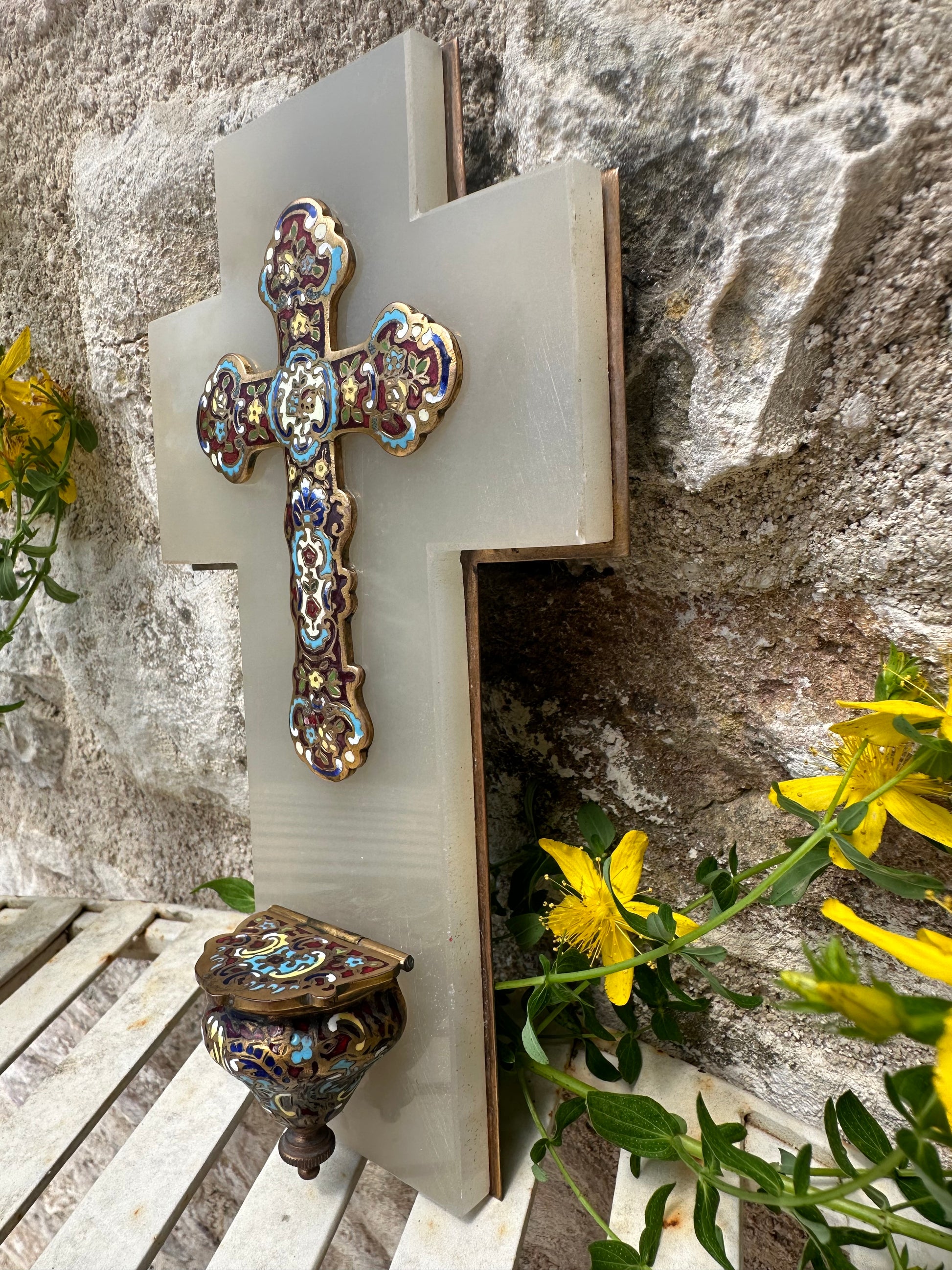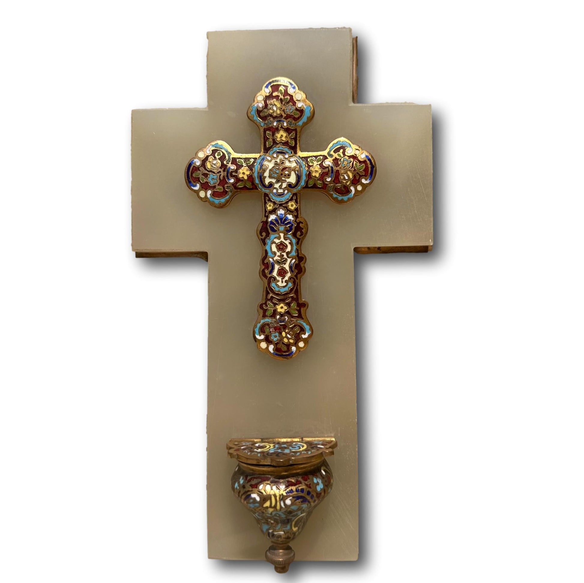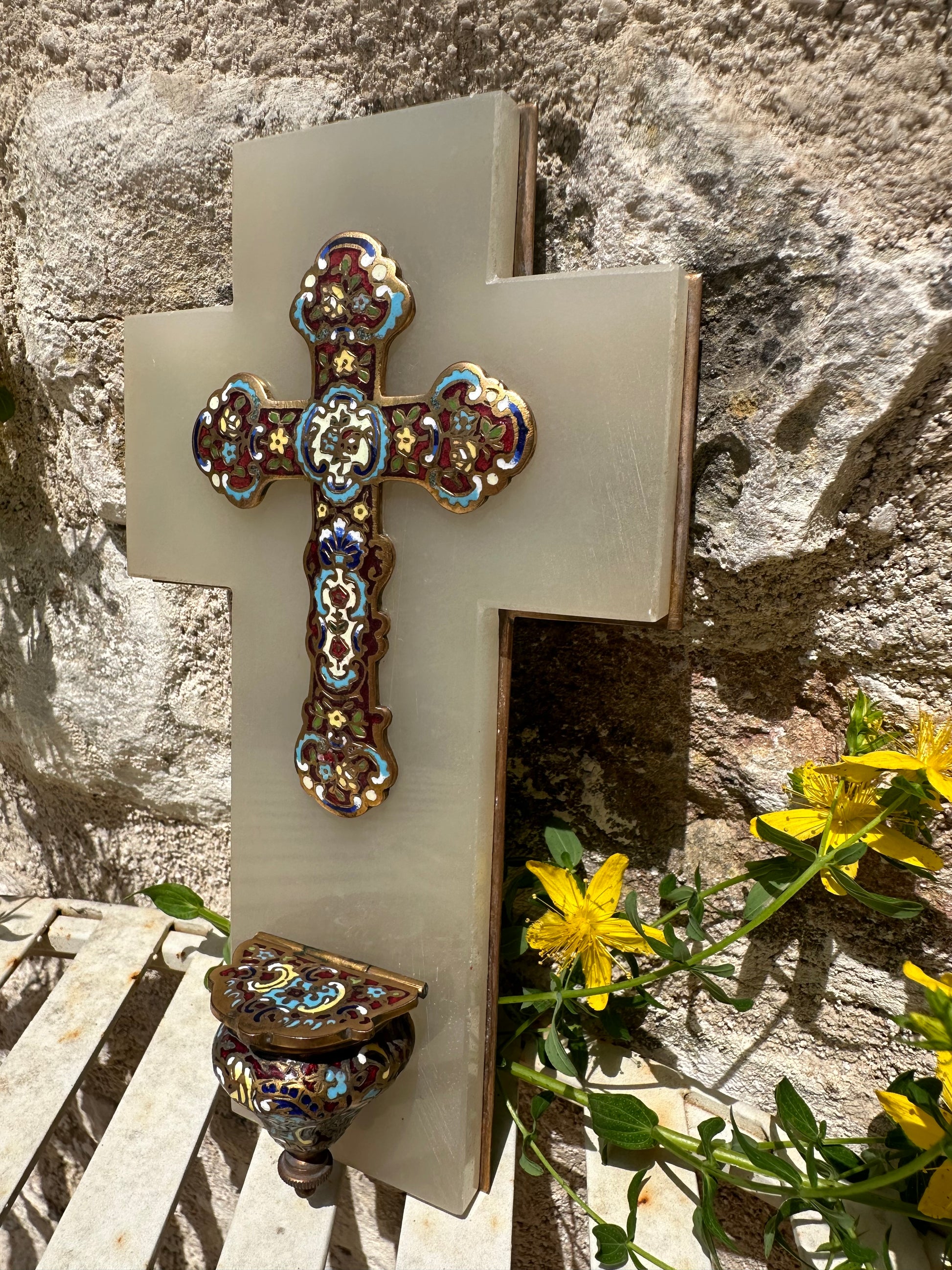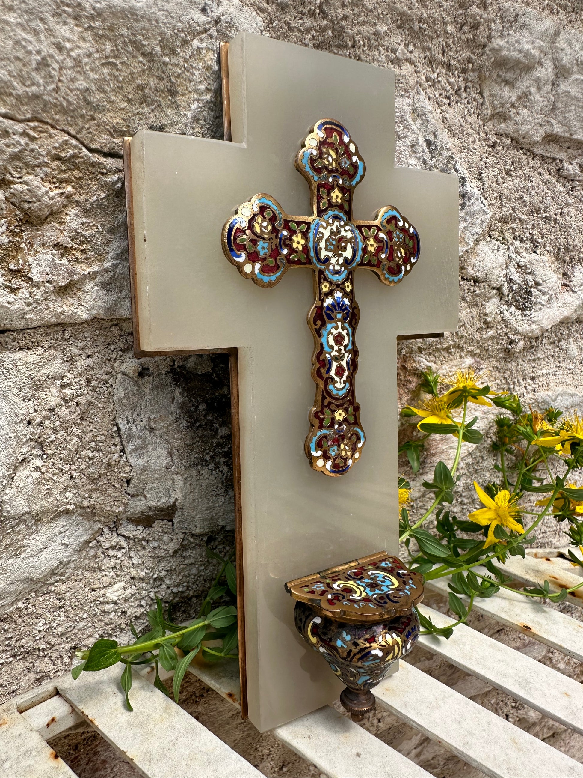 A beautiful French antique wall holy water font dating to the late 19th century. The cloisonne enamel bronze cross rests on a white marble plaque and features a combination of green, blue, red, white and yellow enamels with floral intricate motifs. The holy water container is finely enameled in white inside. The back is protected by a brass plaque. There is a brass ring to easily hang it. High quality materials for a beautiful collectible piece.