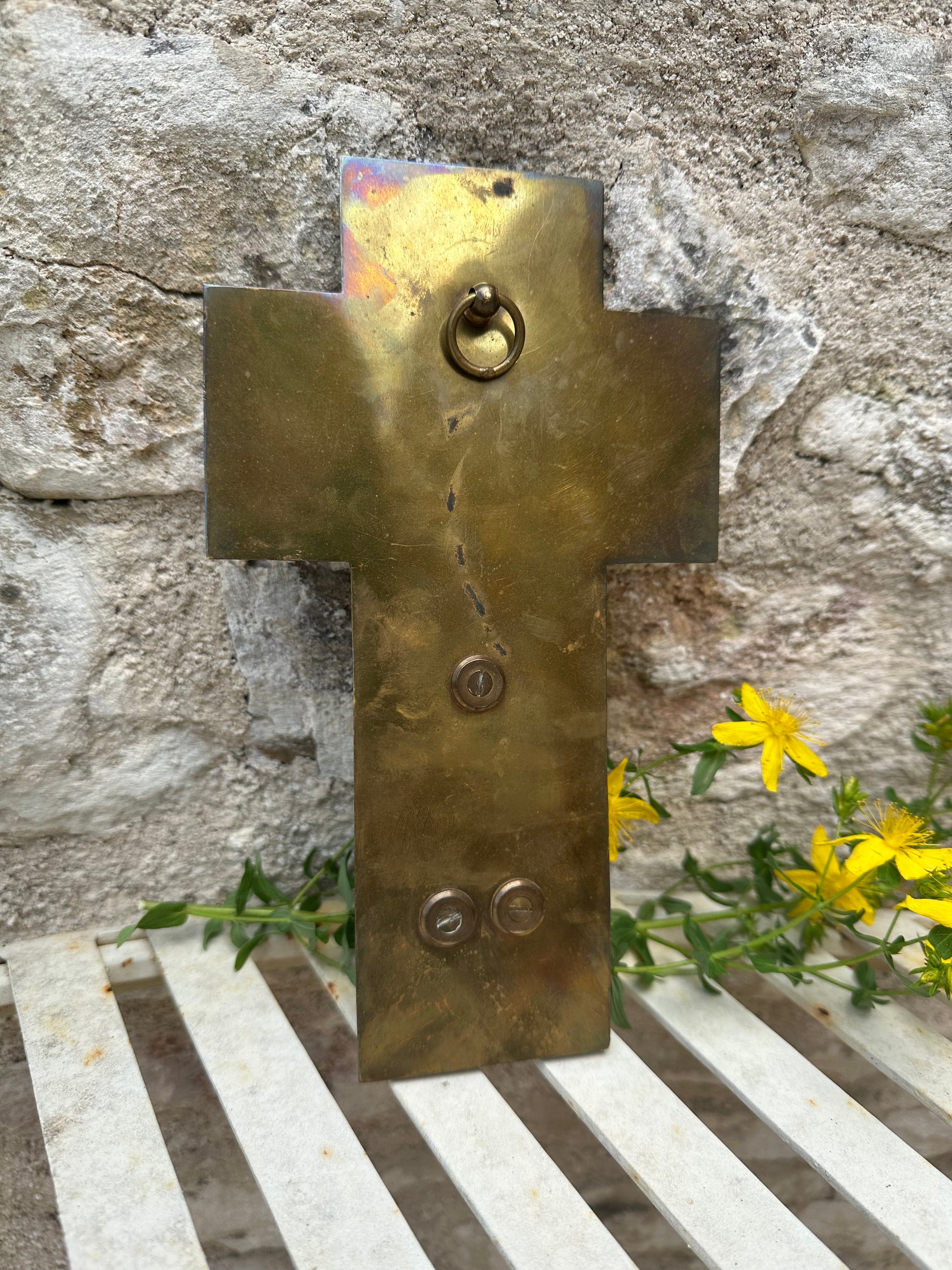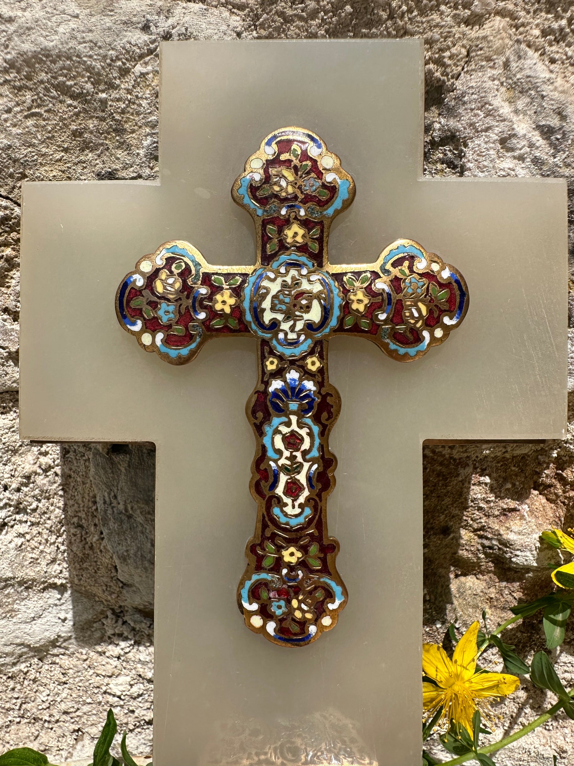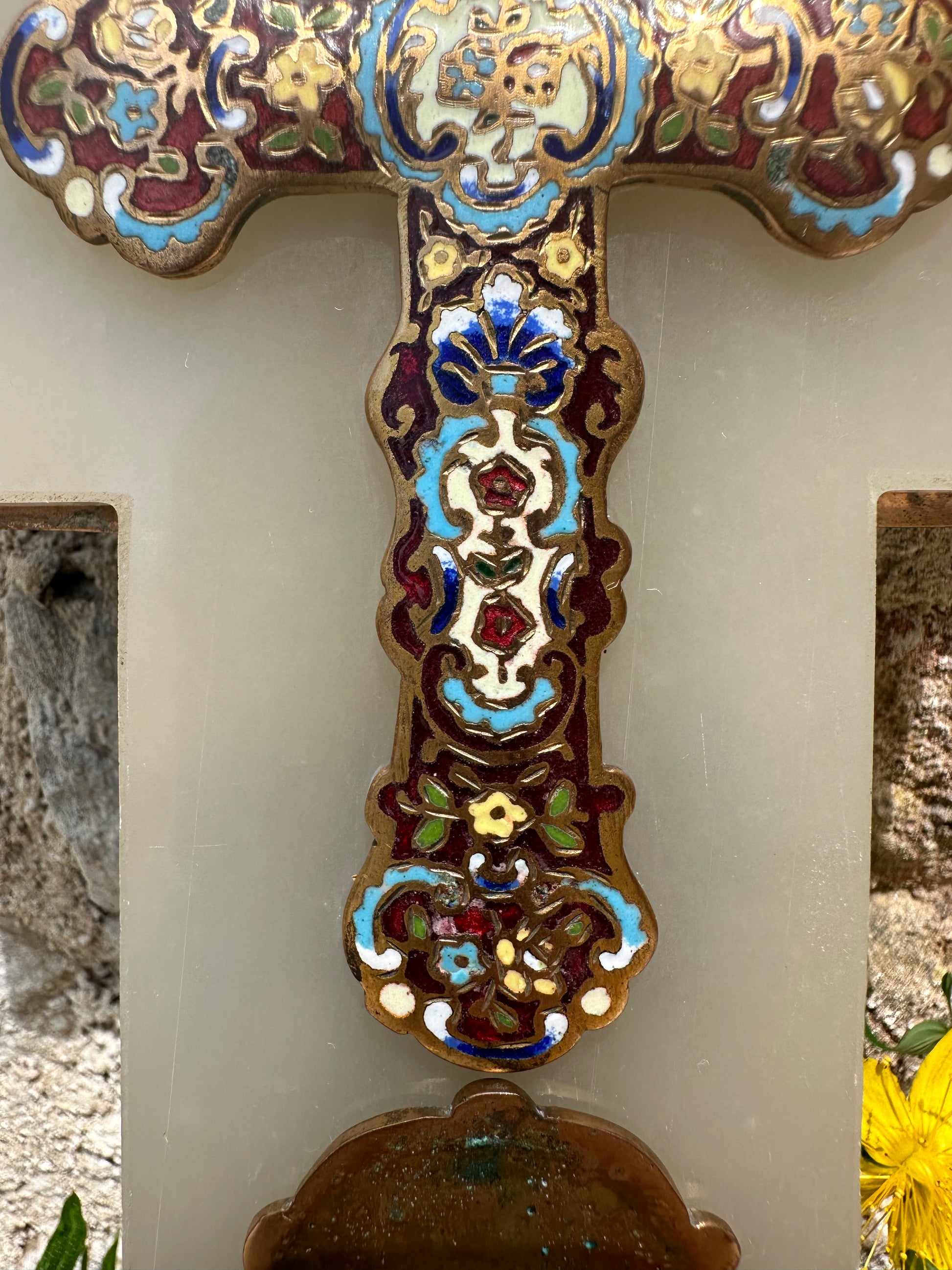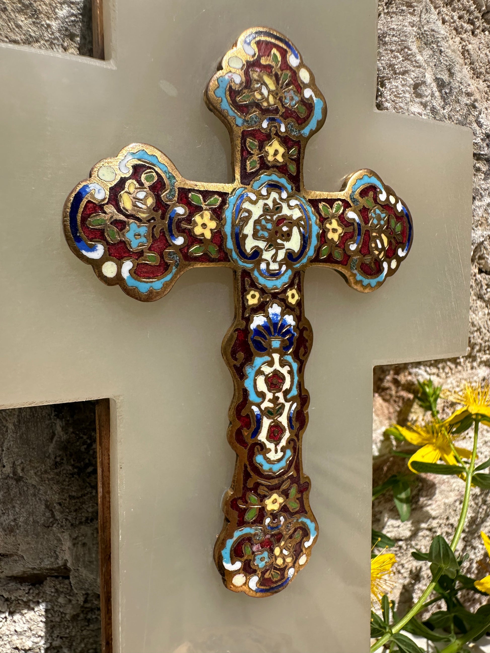 A beautiful French antique wall holy water font dating to the late 19th century. The cloisonne enamel bronze cross rests on a white marble plaque and features a combination of green, blue, red, white and yellow enamels with floral intricate motifs. The holy water container is finely enameled in white inside. The back is protected by a brass plaque. There is a brass ring to easily hang it. High quality materials for a beautiful collectible piece.