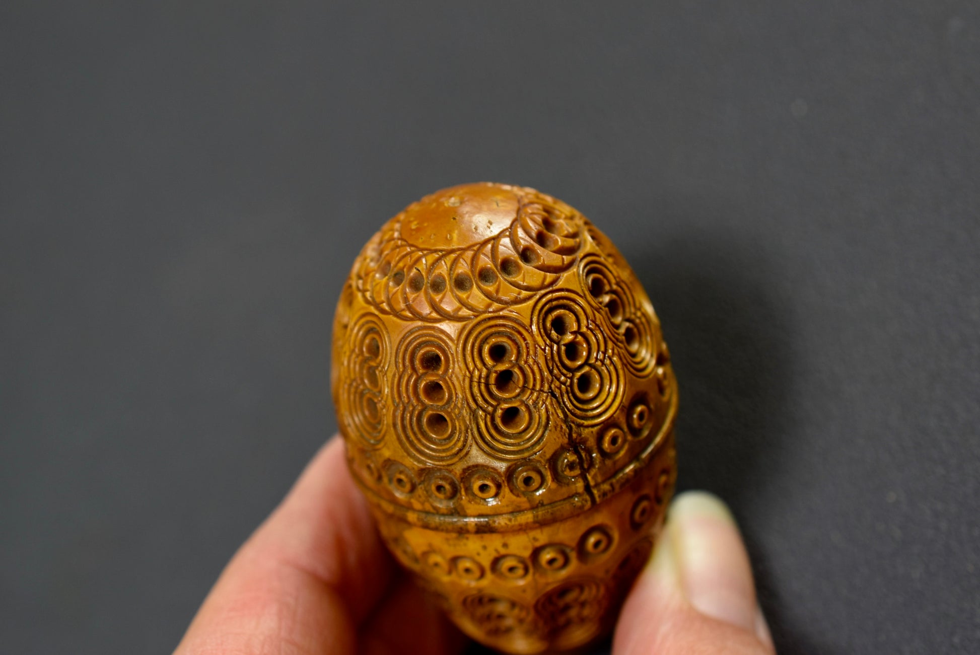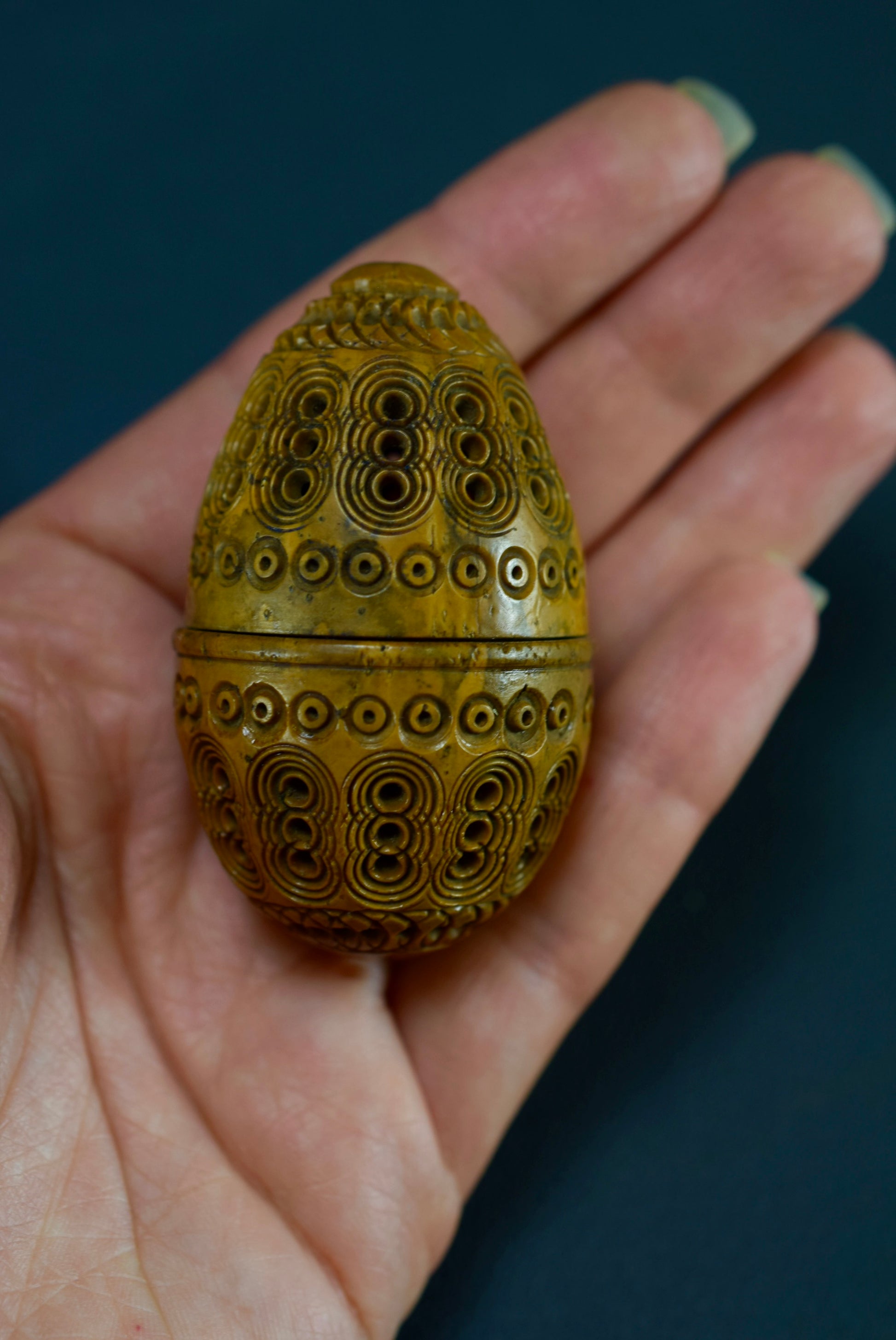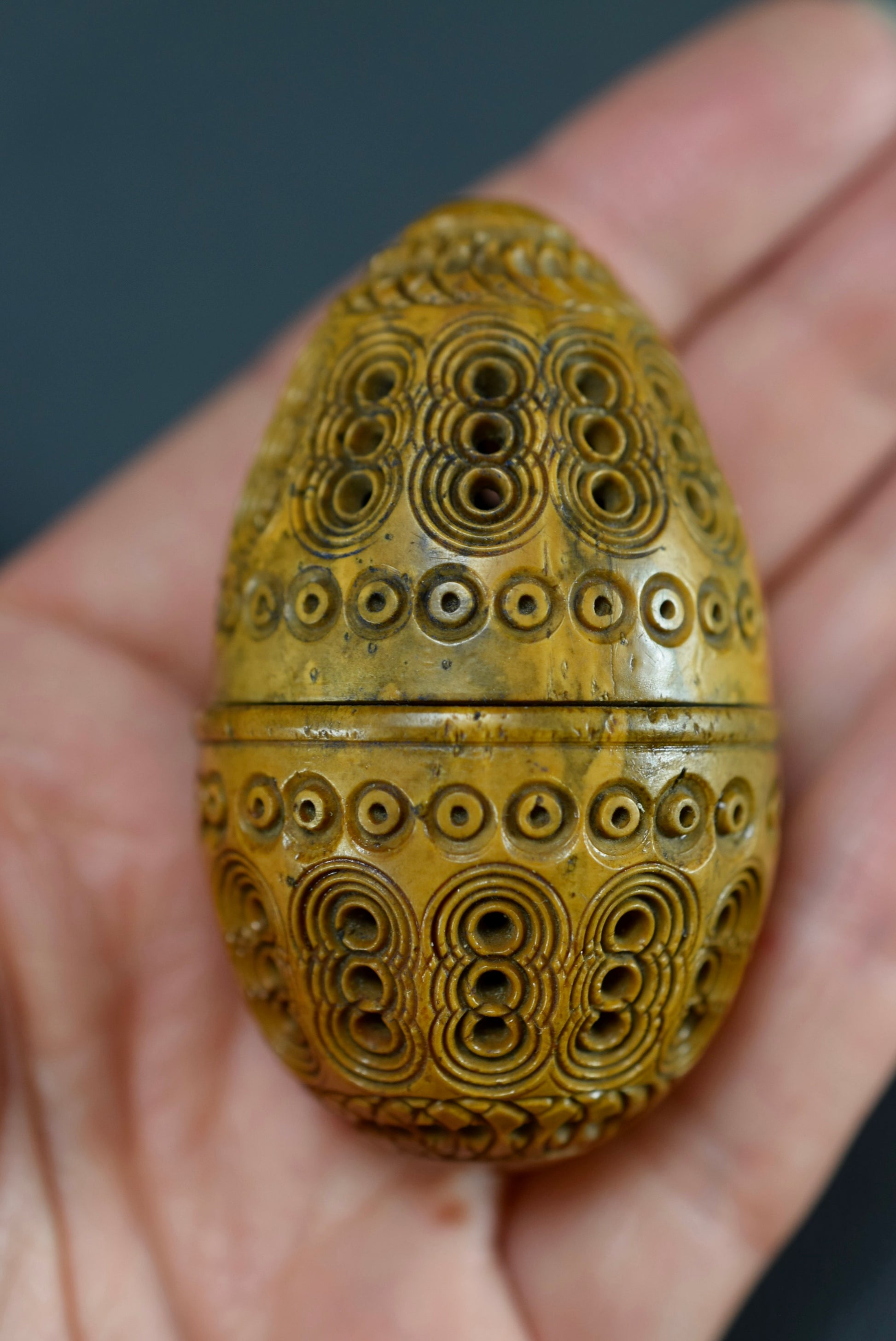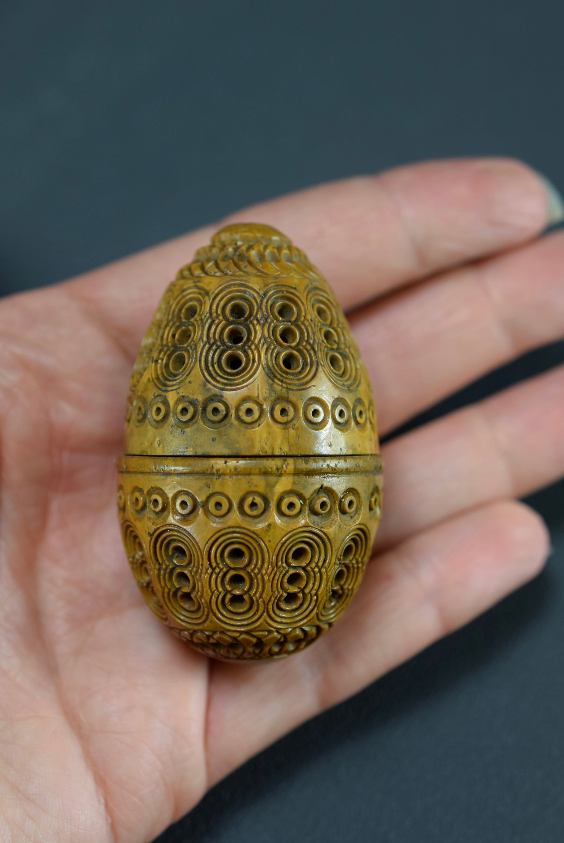A beautiful French antique handmade small case made of carved Corozo nut. Made circa the late 19th century - early 20th century for keeping safe a rosary or chaplet. Perfect to carry your rosary in your pocket. Could be used nowadays for hiding keepsakes etc. This egg case is charming.