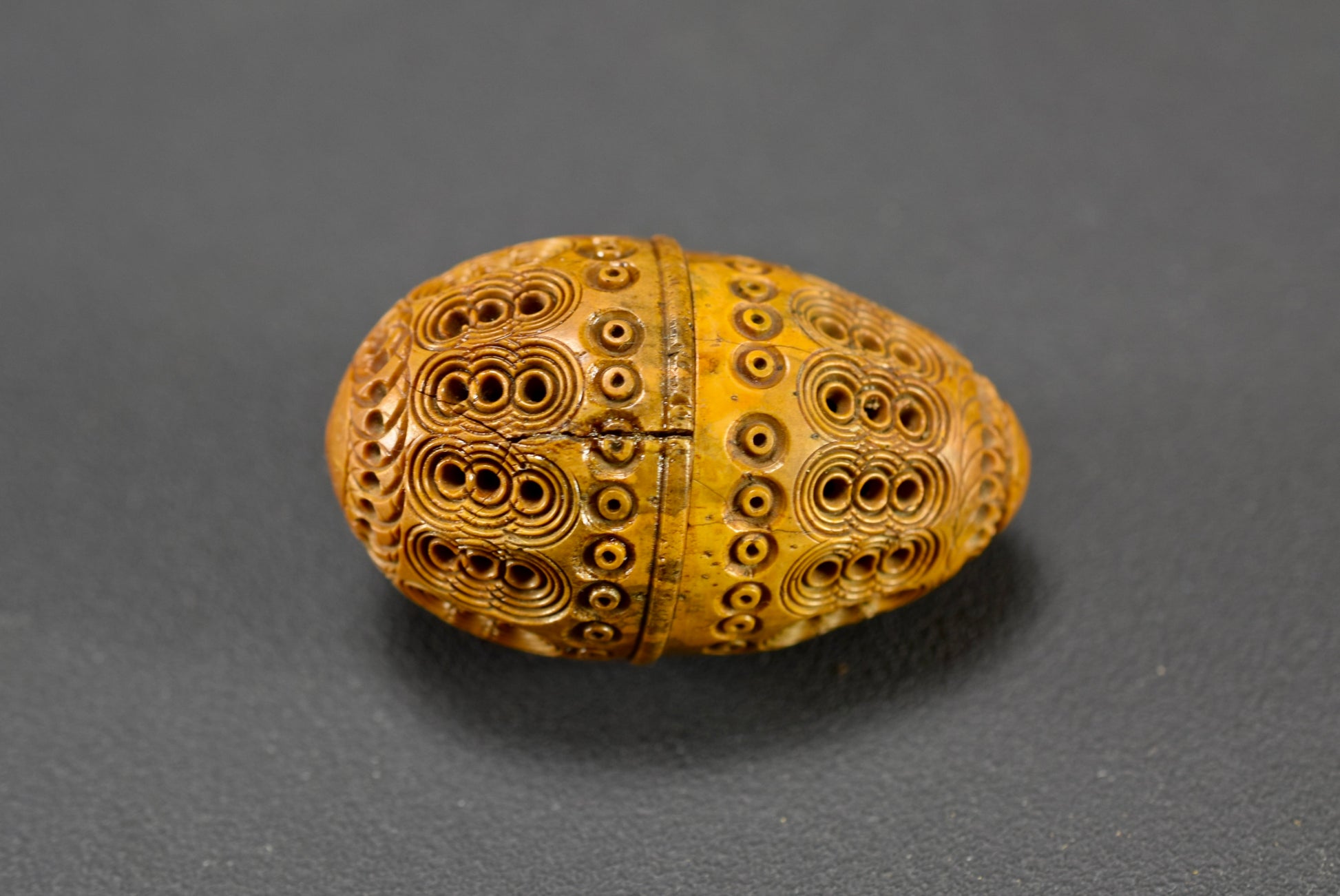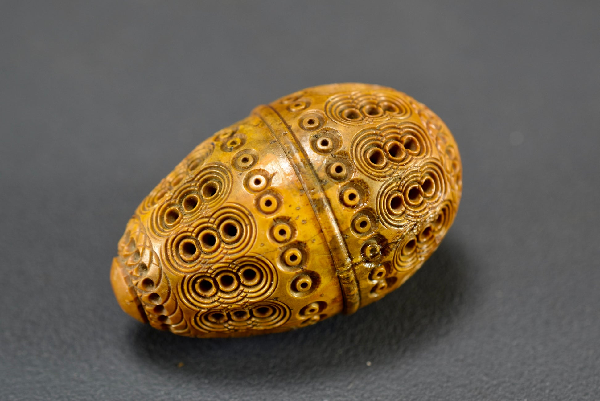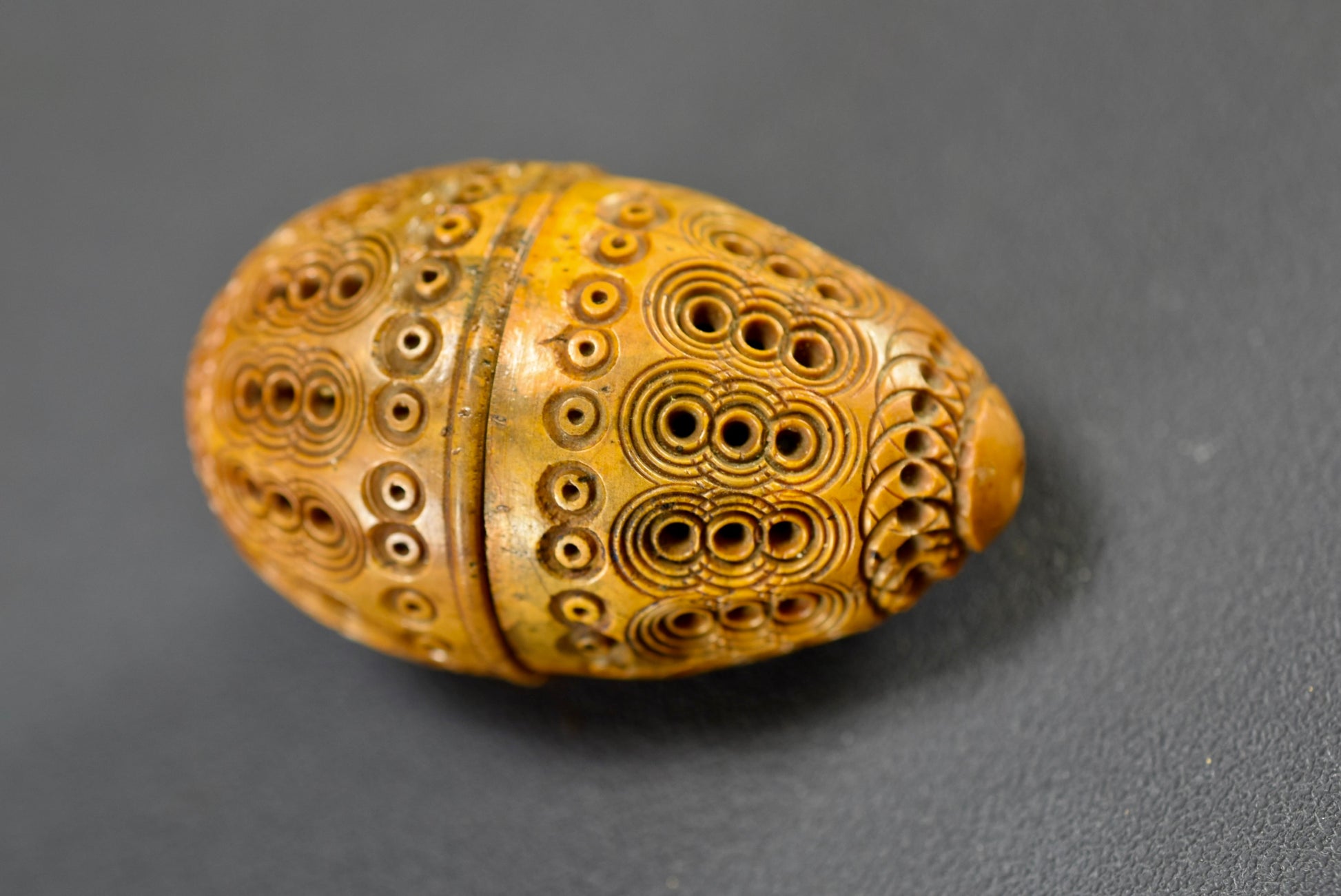 A beautiful French antique handmade small case made of carved Corozo nut. Made circa the late 19th century - early 20th century for keeping safe a rosary or chaplet. Perfect to carry your rosary in your pocket. Could be used nowadays for hiding keepsakes etc. This egg case is charming.