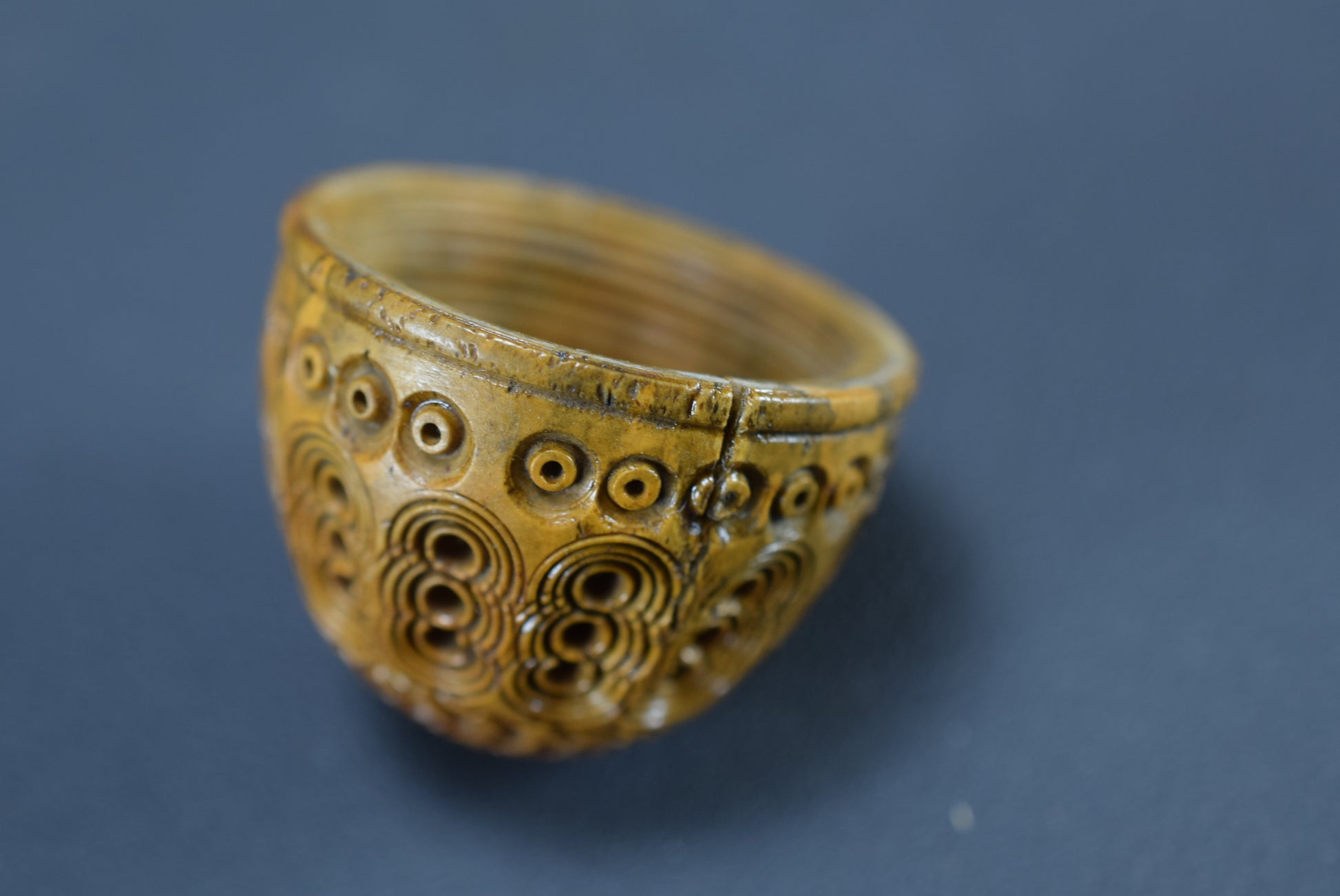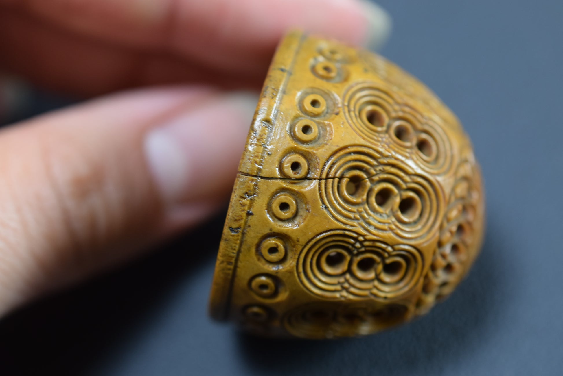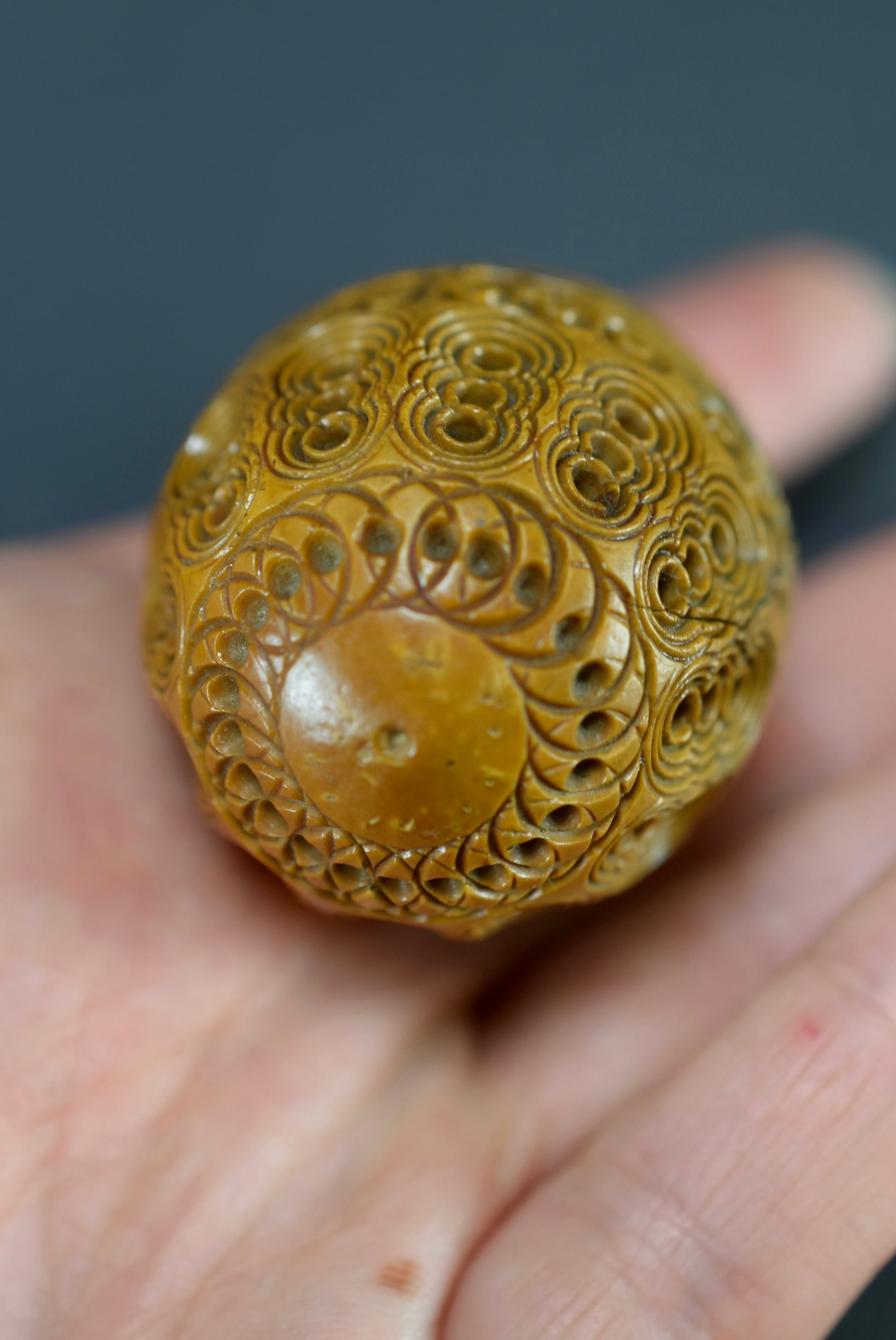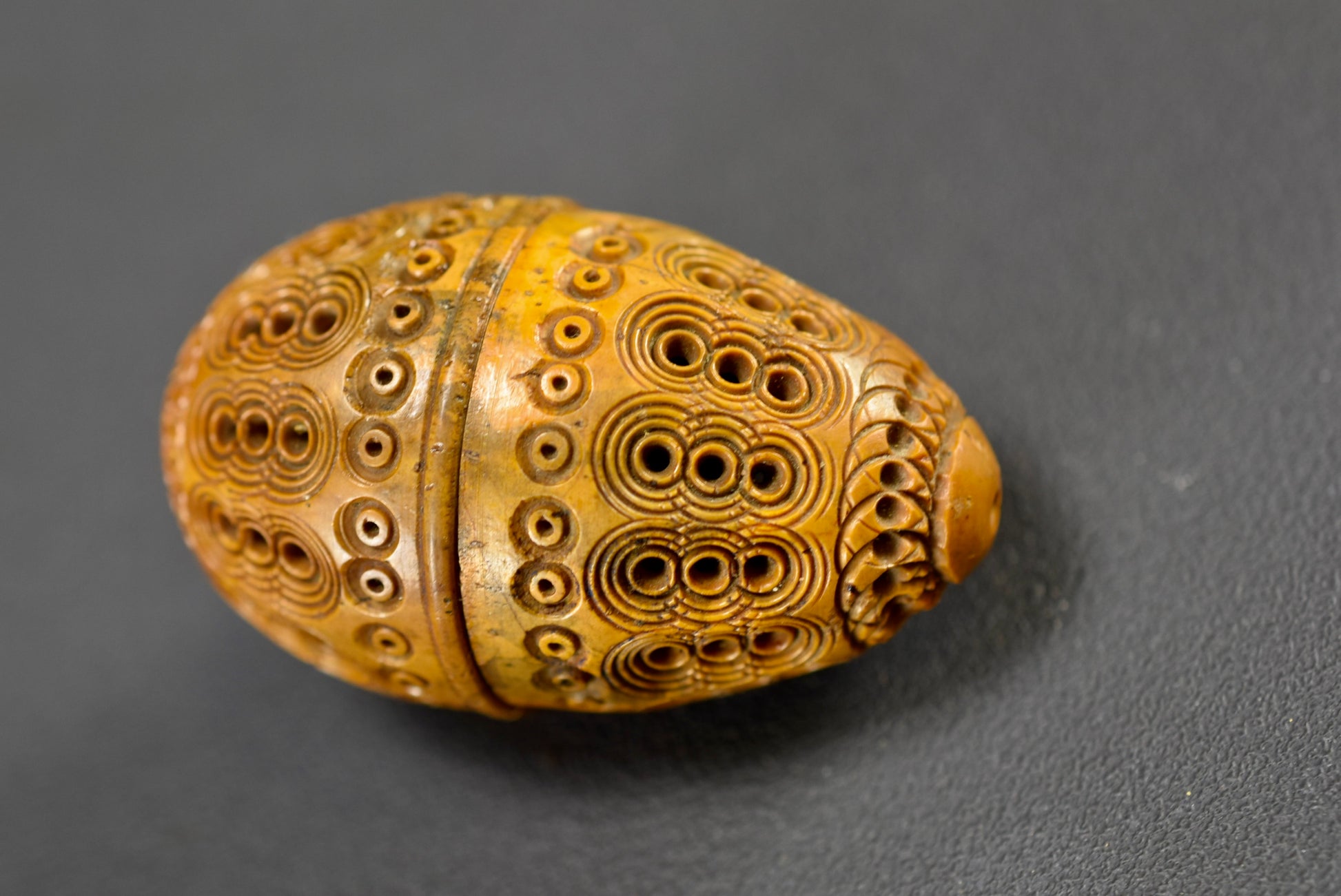 A beautiful French antique handmade small case made of carved Corozo nut. Made circa the late 19th century - early 20th century for keeping safe a rosary or chaplet. Perfect to carry your rosary in your pocket. Could be used nowadays for hiding keepsakes etc. This egg case is charming.