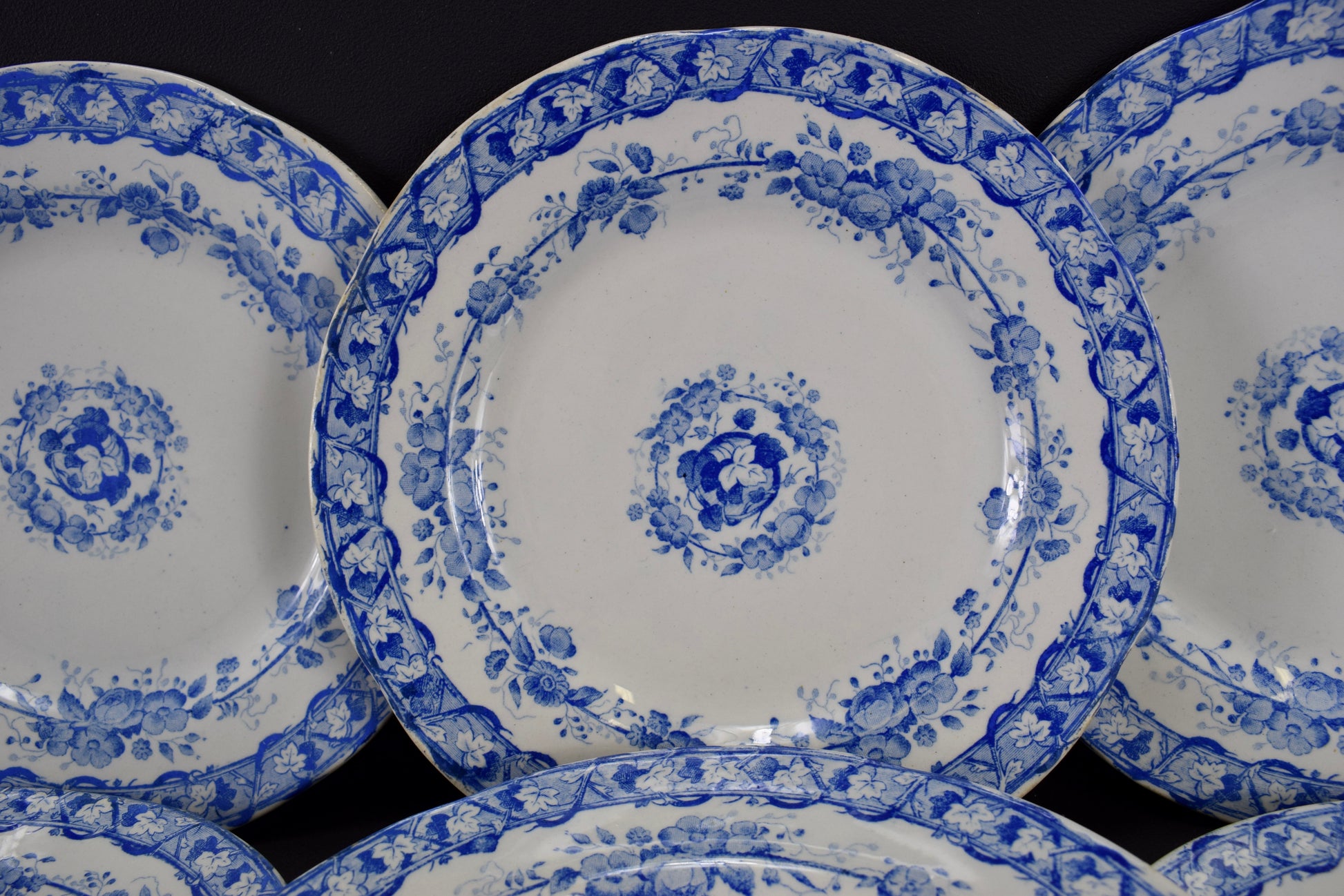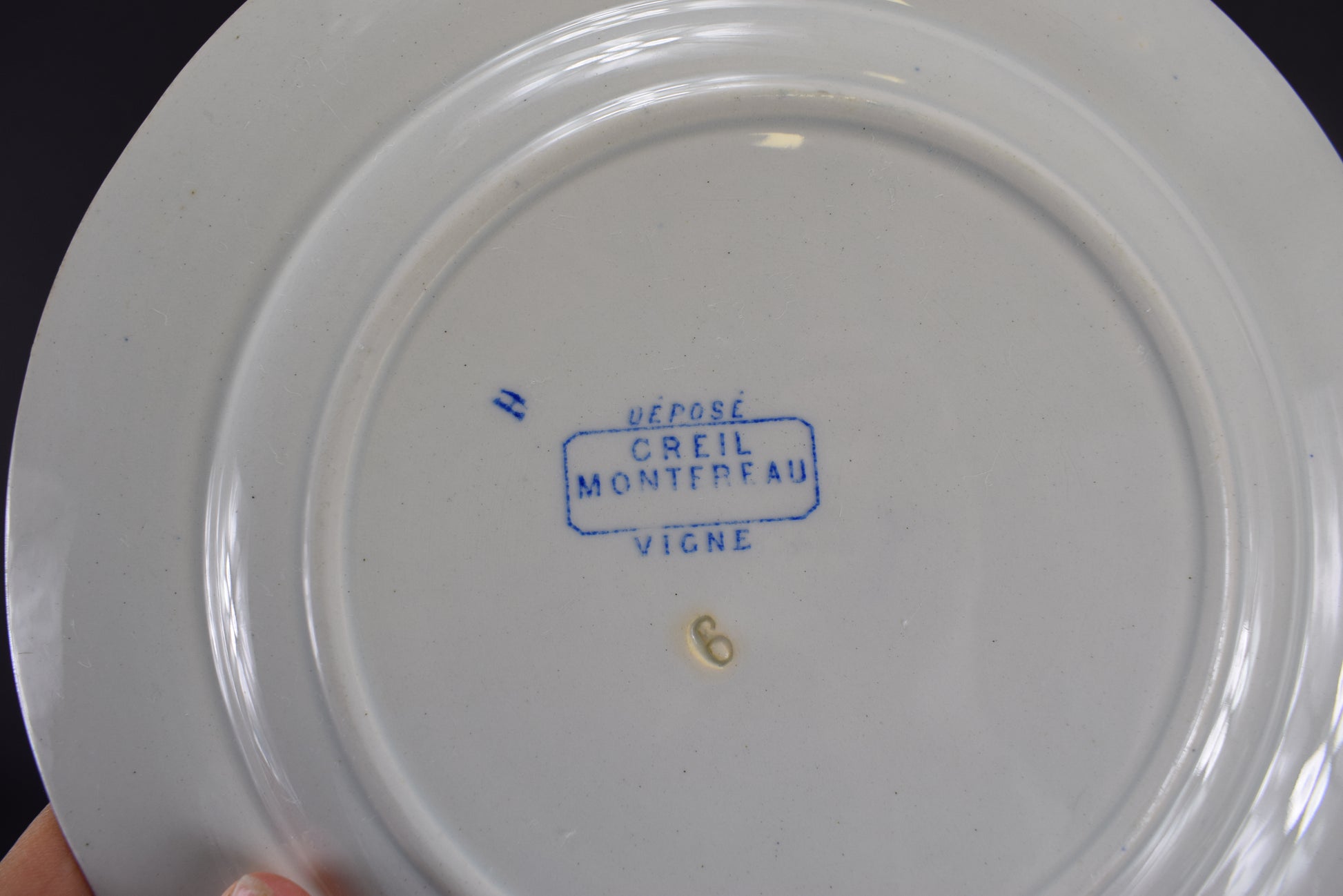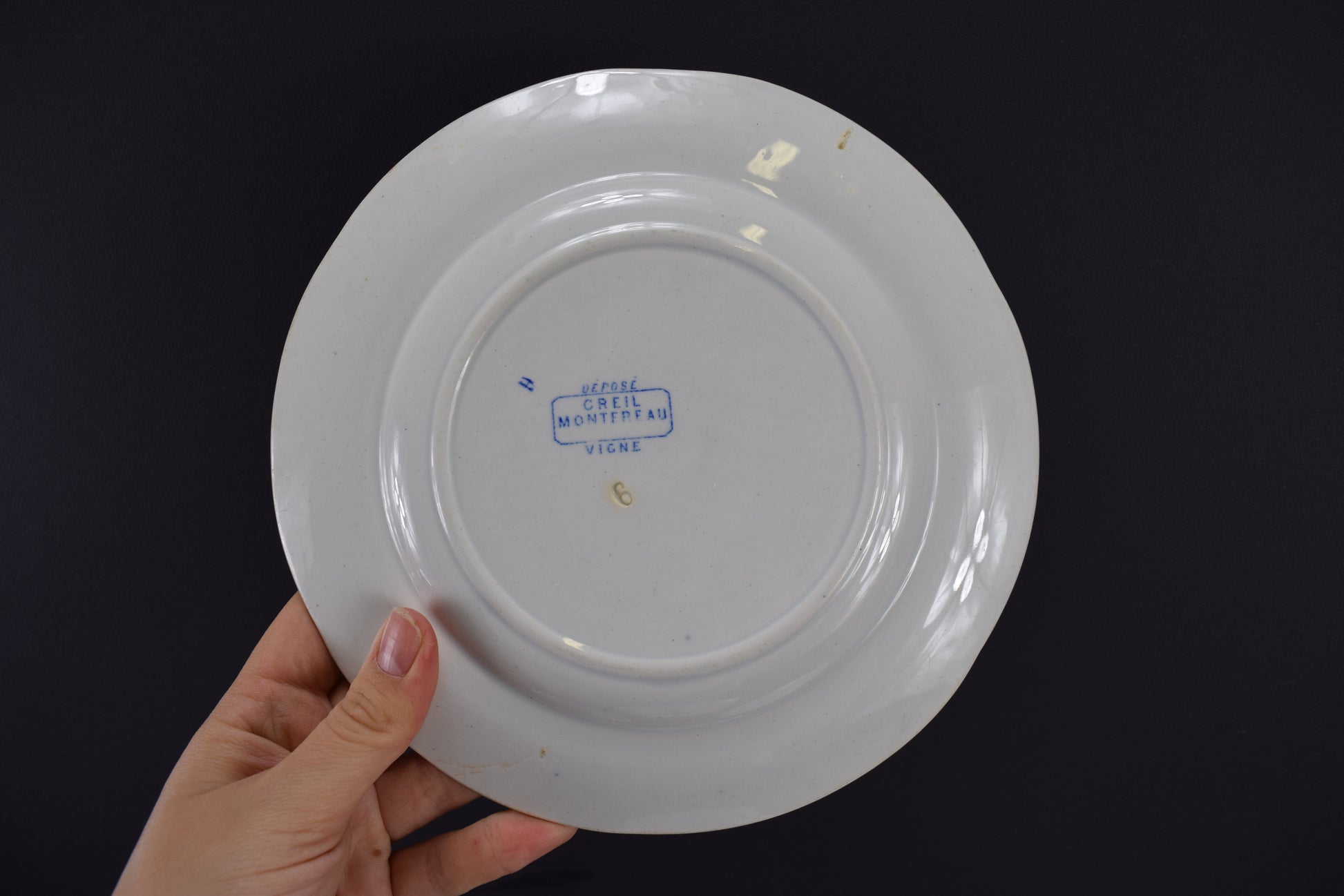 Creil & Montereau has produced this grouping of 6 plates. 7 5/8 inches diameter, they were made for cake and cookies or when serving salads or appetizers. In France, there are also perfect to eat cheese. The charming blue decor features printed underglaze fruits, flowers and vine leaves. This pattern is called "Vigne" (vine). They're fabulous dessert plates you'll enjoy using. Not just cabinet plates, this set will take you from informal to formal table settings in style. The mark on back was used between 1840 and 1876: blue underglaze maker mark noting "Creil et Montereau, Vigne". The maker mark is not printed on these plates but on other pieces of the service: maker, LM & Cie for Leboeuf Millet