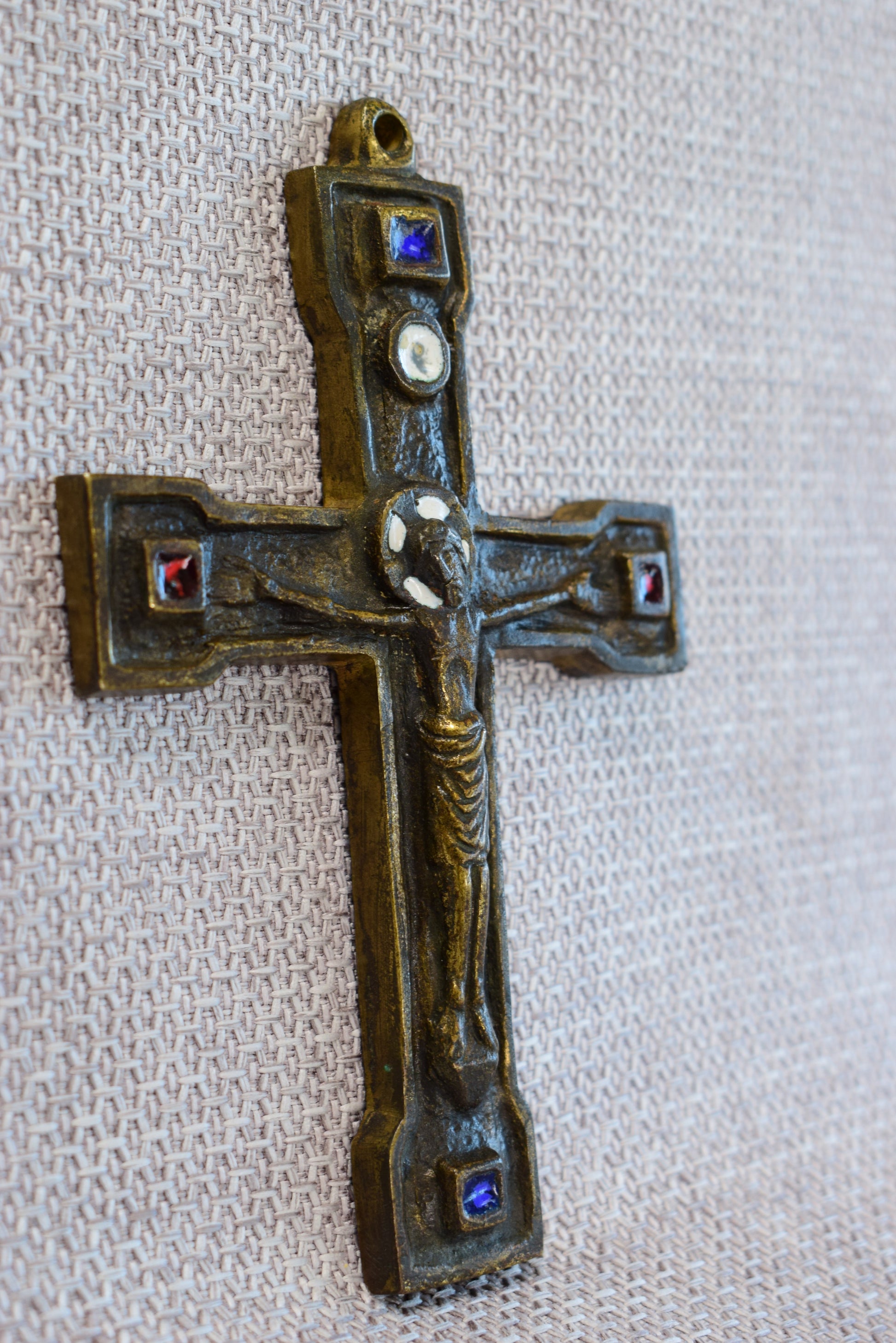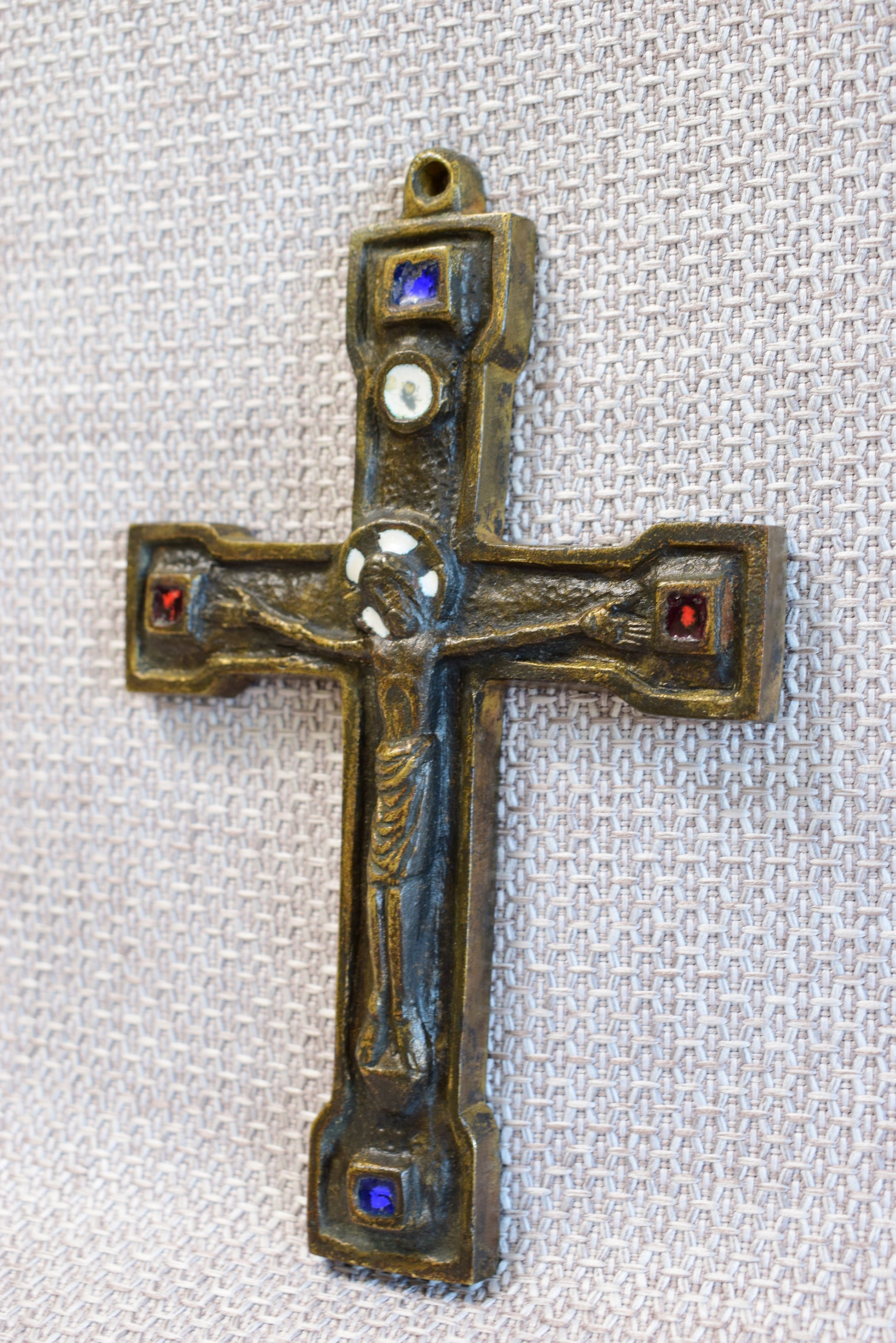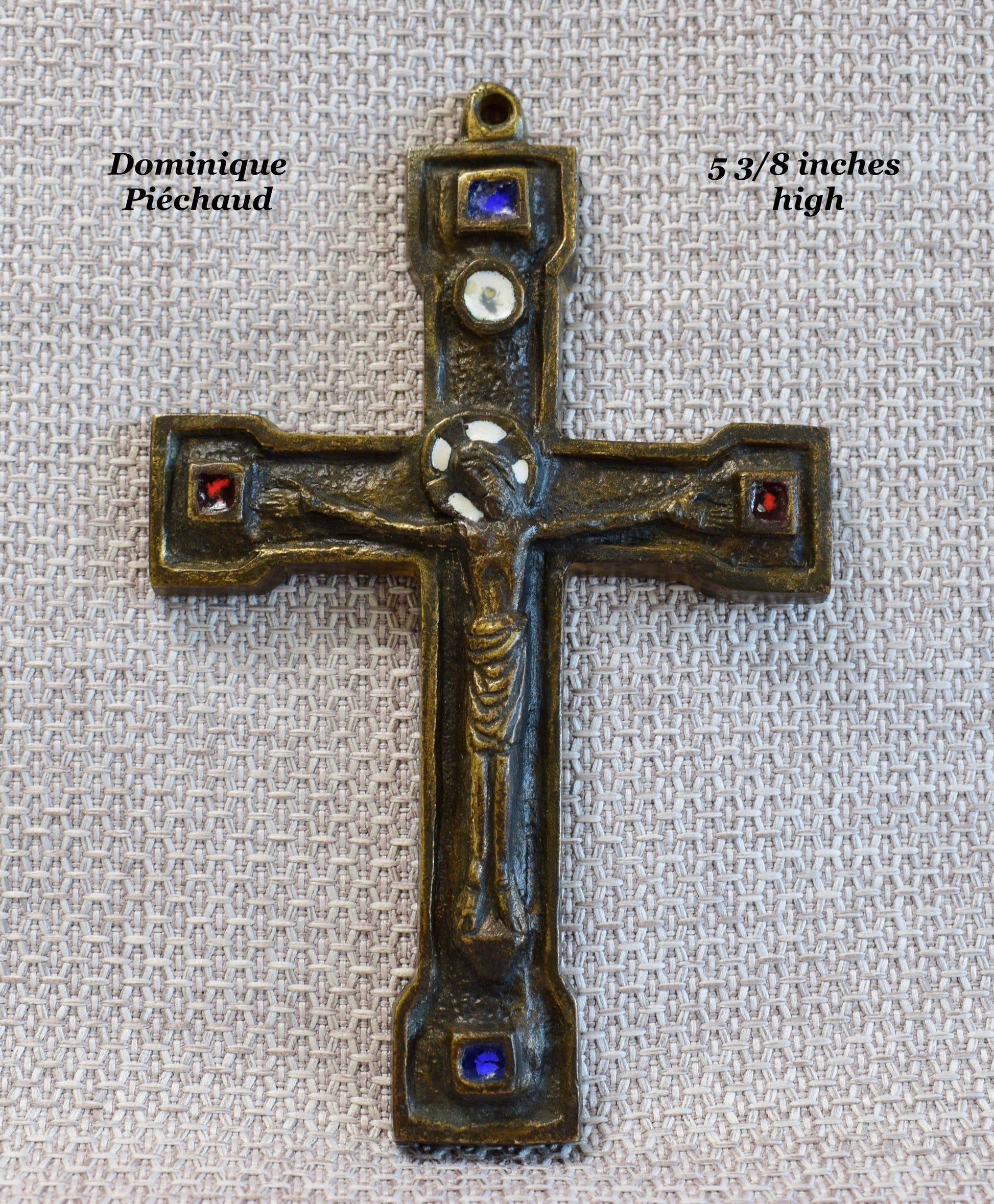 A stunning vintage Medieval-style crucifix crafted in bronze with exquisite enamel detailing, signed by the renowned French sculptor Dominique Piéchaud (1922–2011), trained by German artist Anton Nagel.