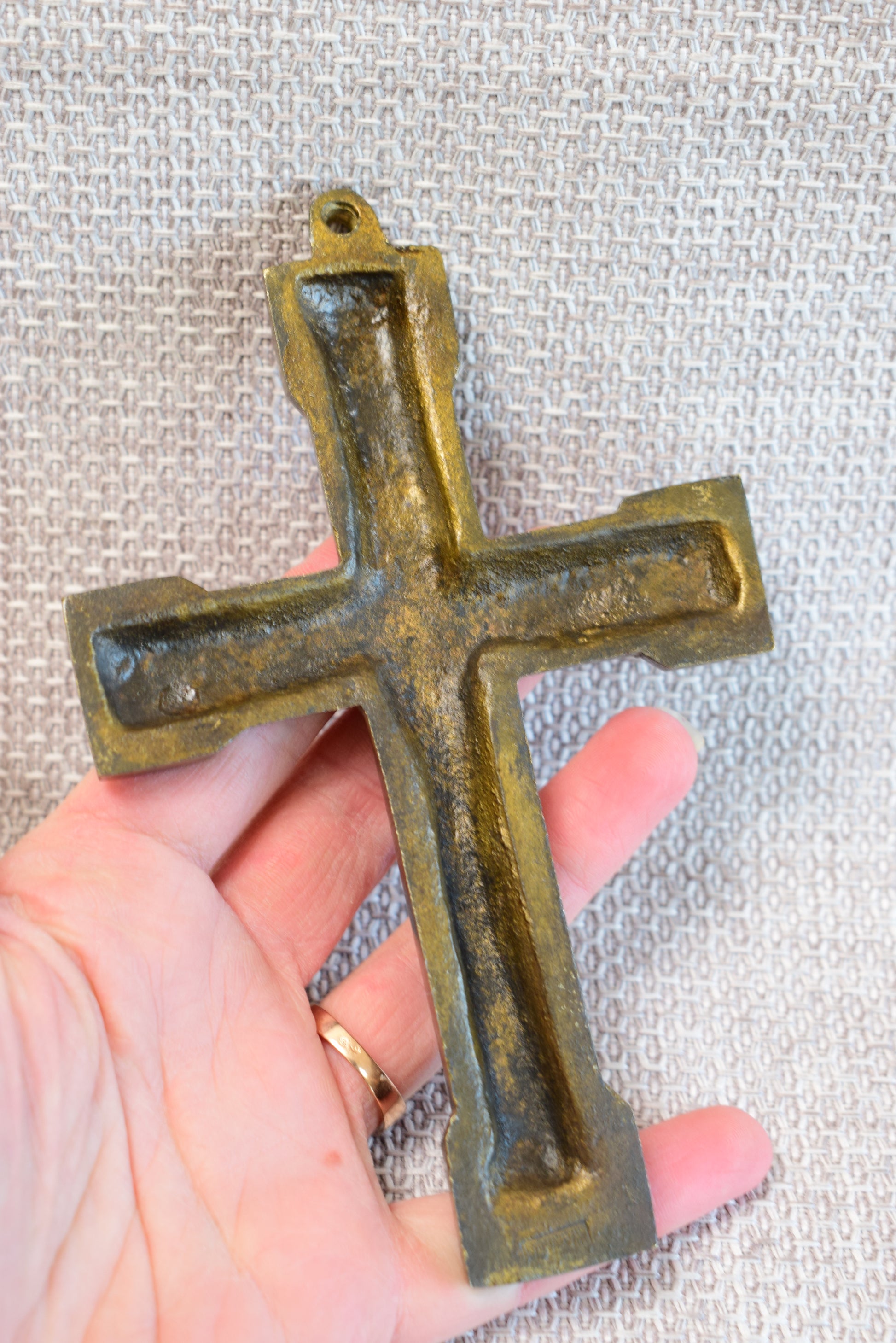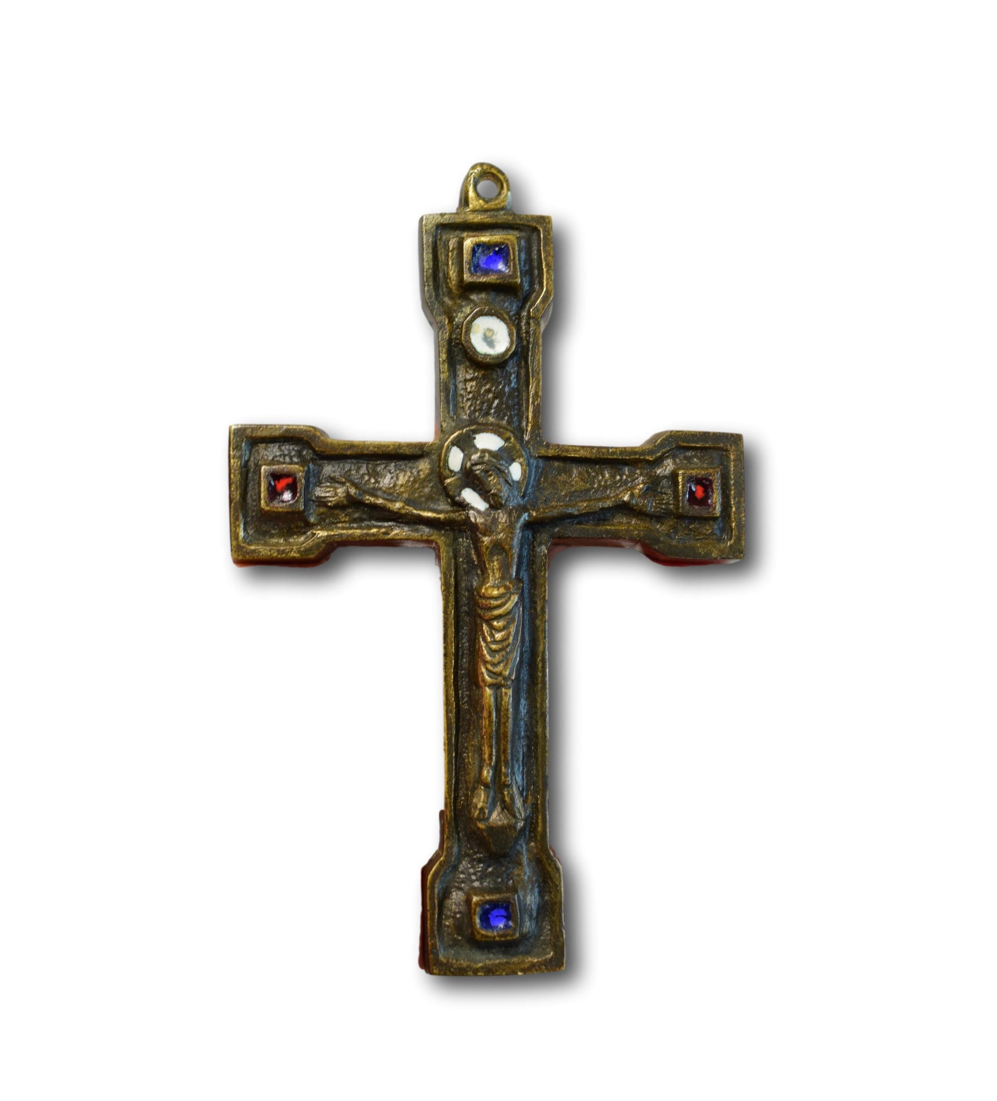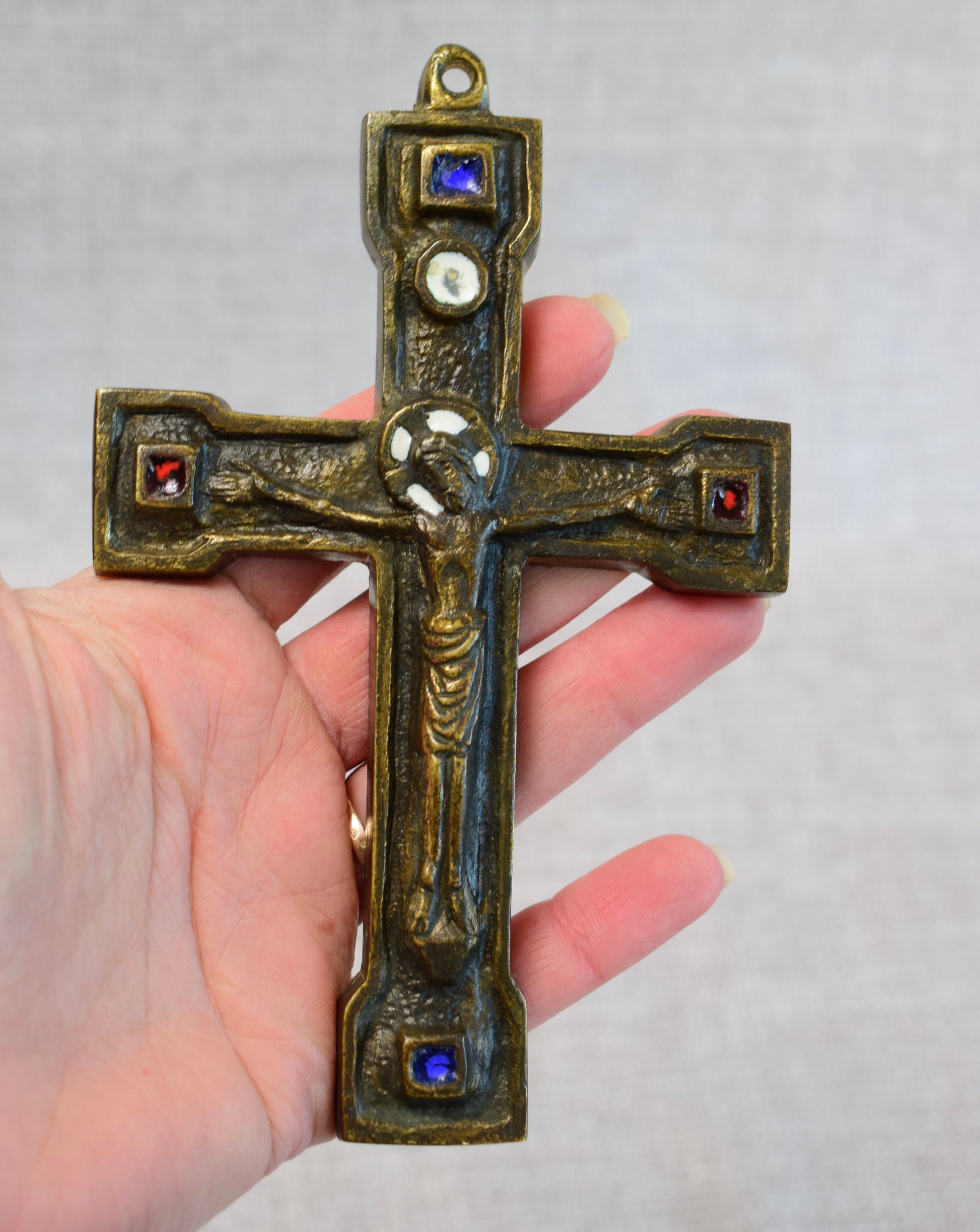 A stunning vintage Medieval-style crucifix crafted in bronze with exquisite enamel detailing, signed by the renowned French sculptor Dominique Piéchaud (1922–2011), trained by German artist Anton Nagel.