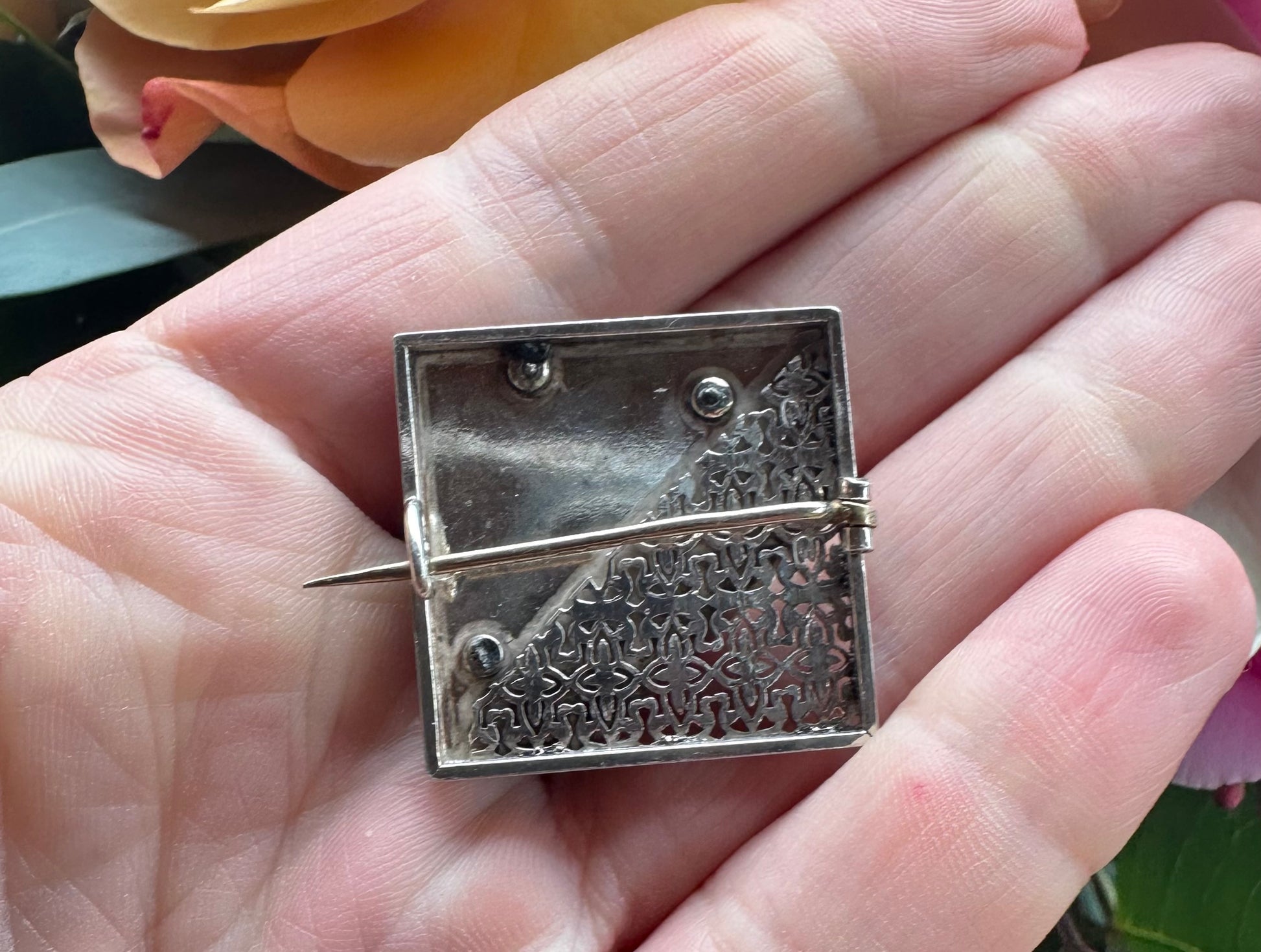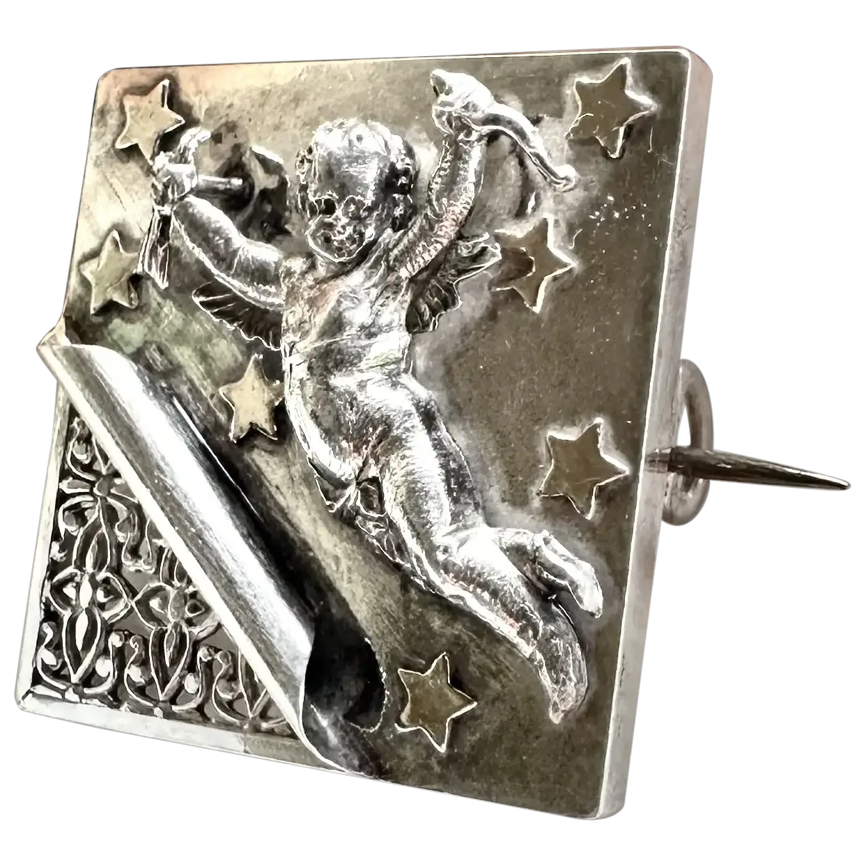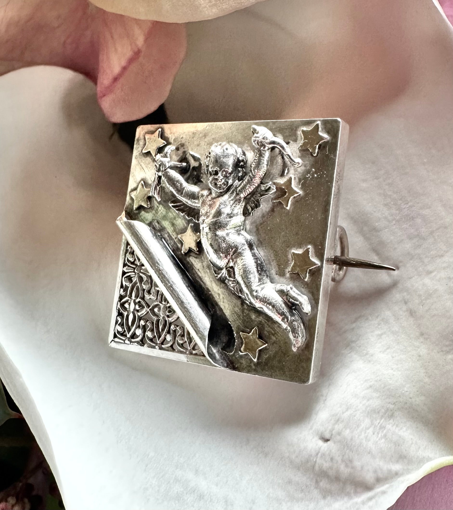 A beautiful French vintage brooch depicting in high relief Cupid, God of Love. The charming cherub is surrounded by seven goldplated stars. The bottom left corner depicts an openwork. Shiny pin (not easy to take in photos) made of metal.