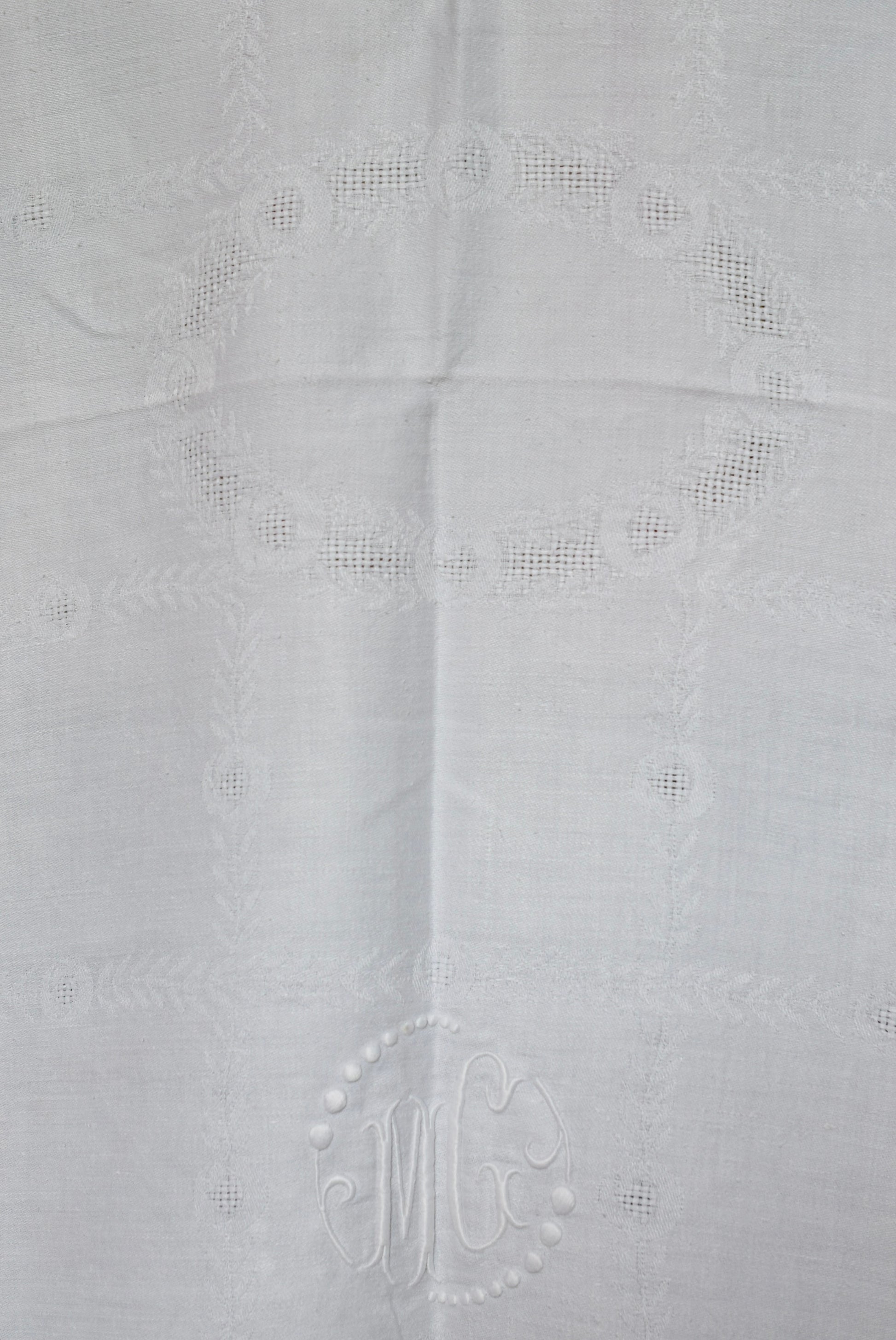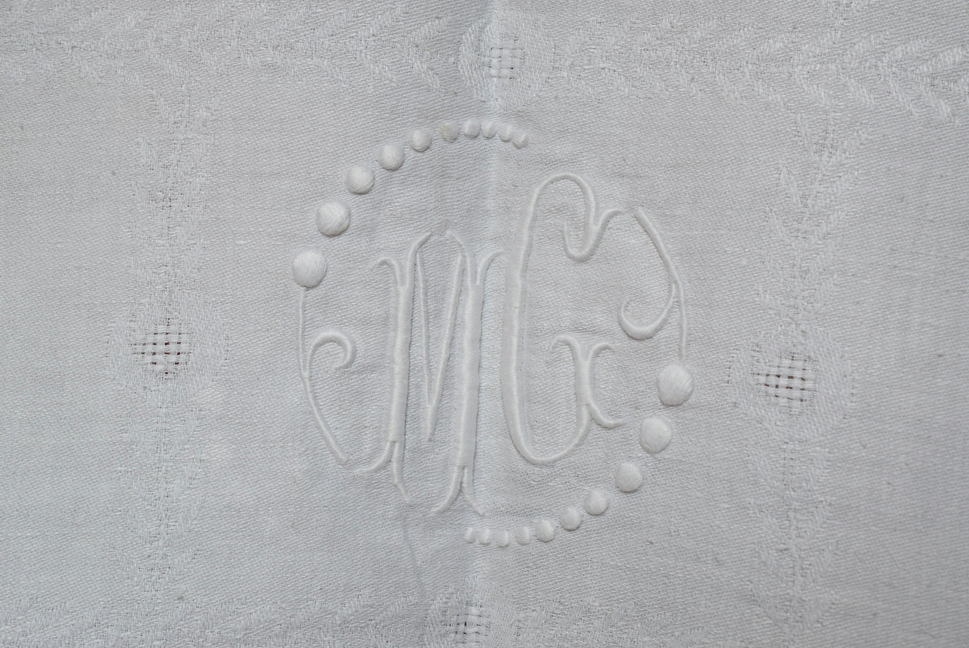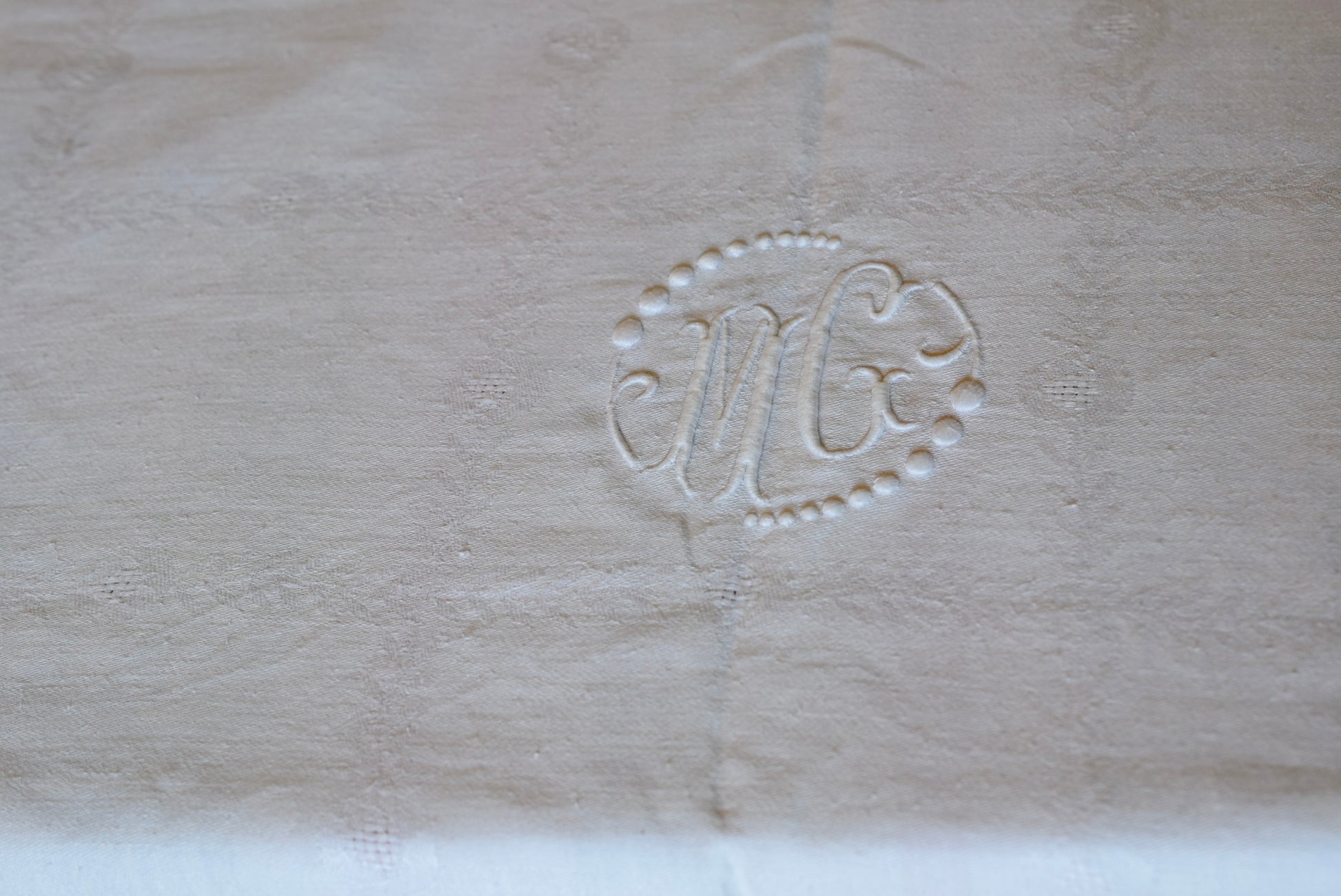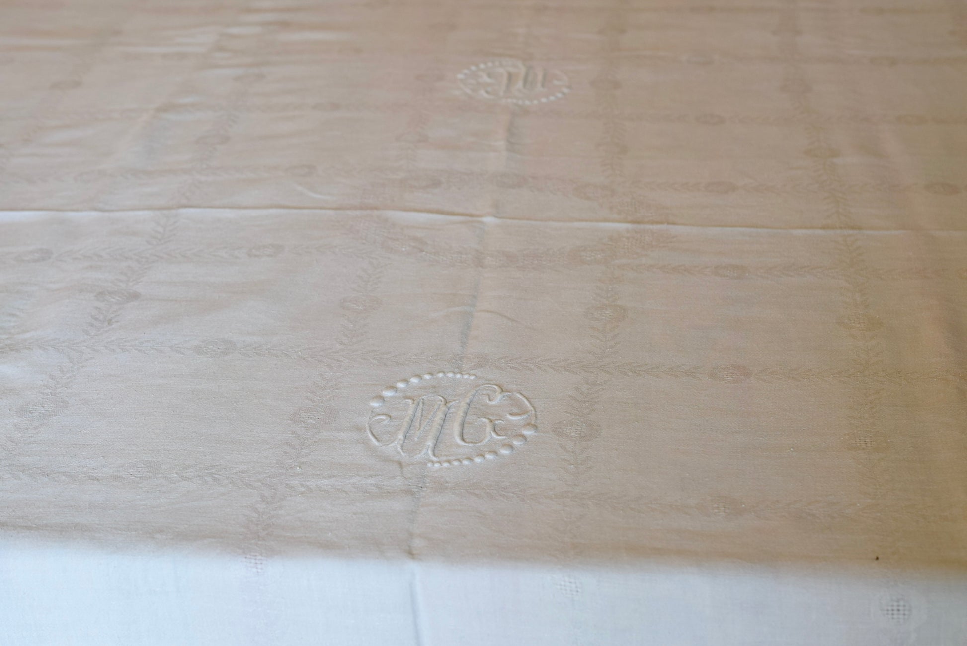 A French antique tablecloth made of damasse cotton/linen. It has been finely embroidered with two white monograms MG. Bunches of flowers motifs. This beautiful tablecloth dates from the early 20th century. It measures 90 1/2 inches (230cm) long and 59 inches wide (150cm). I offer two matching napkins with the tablecloth.