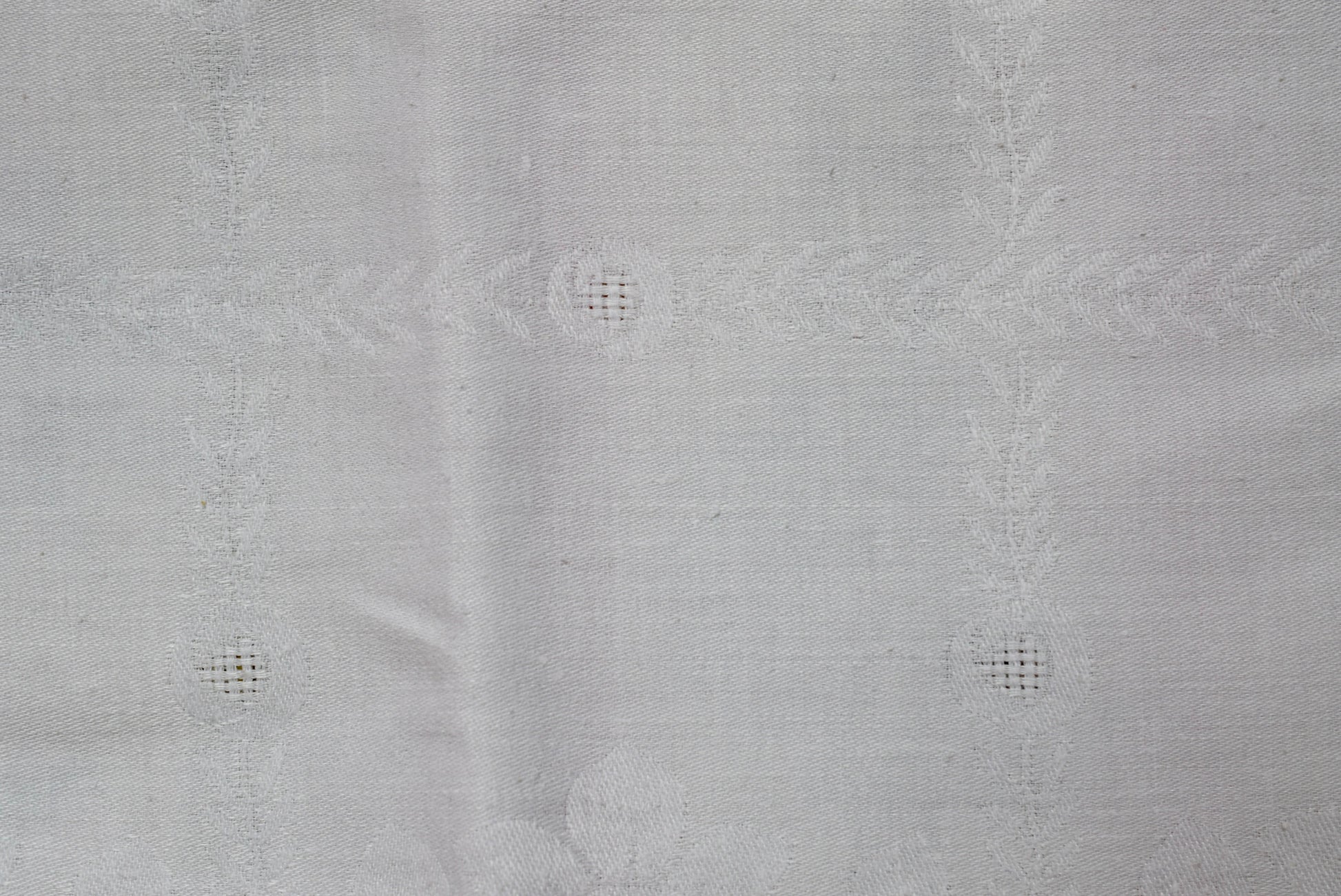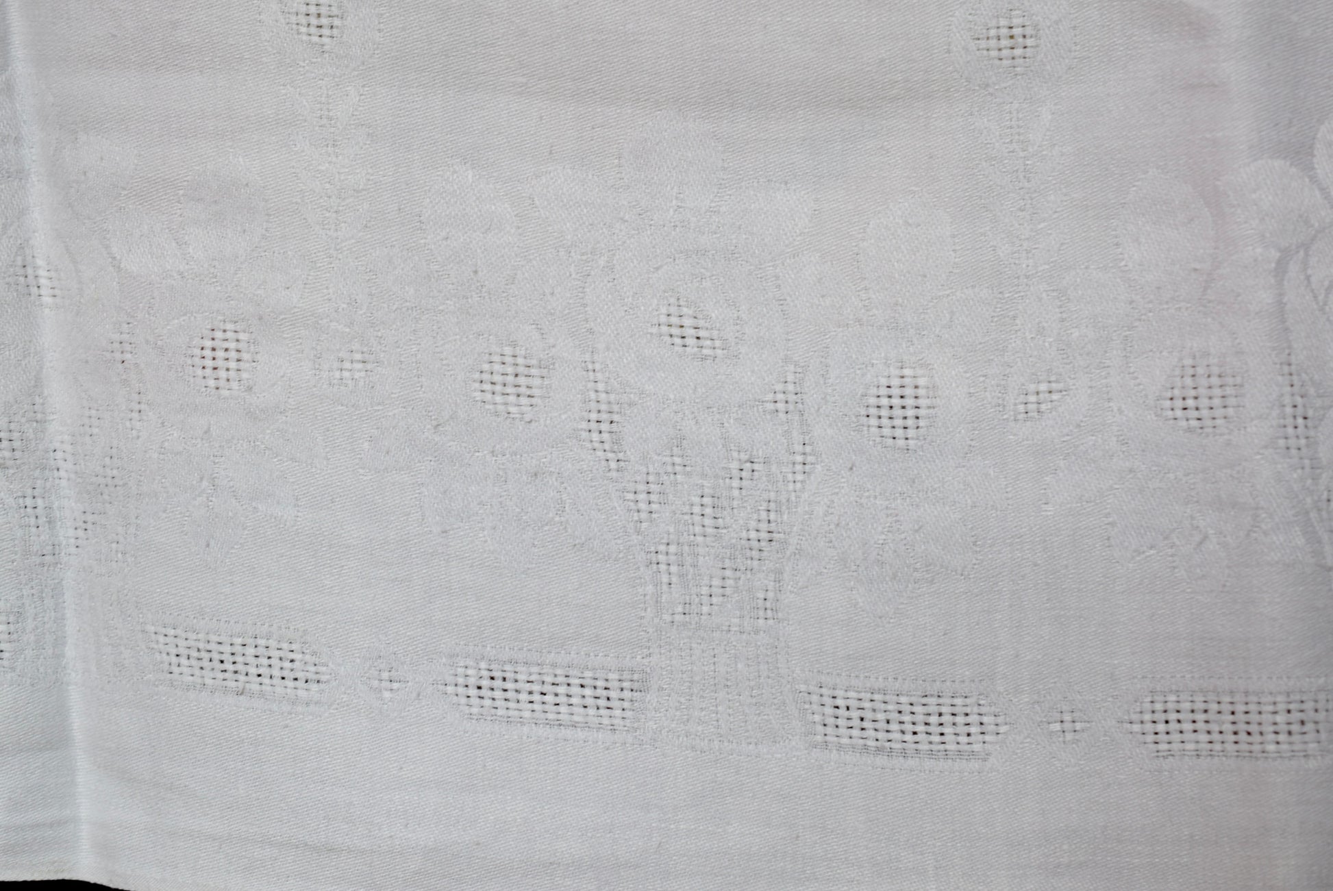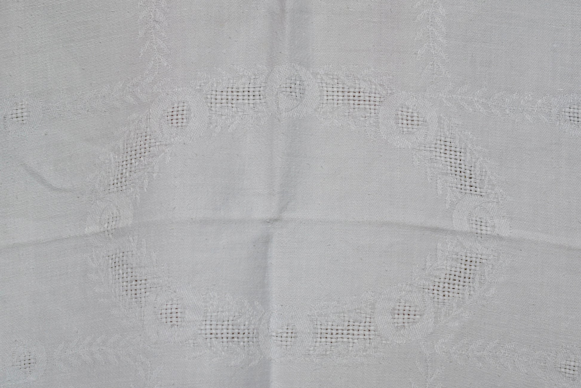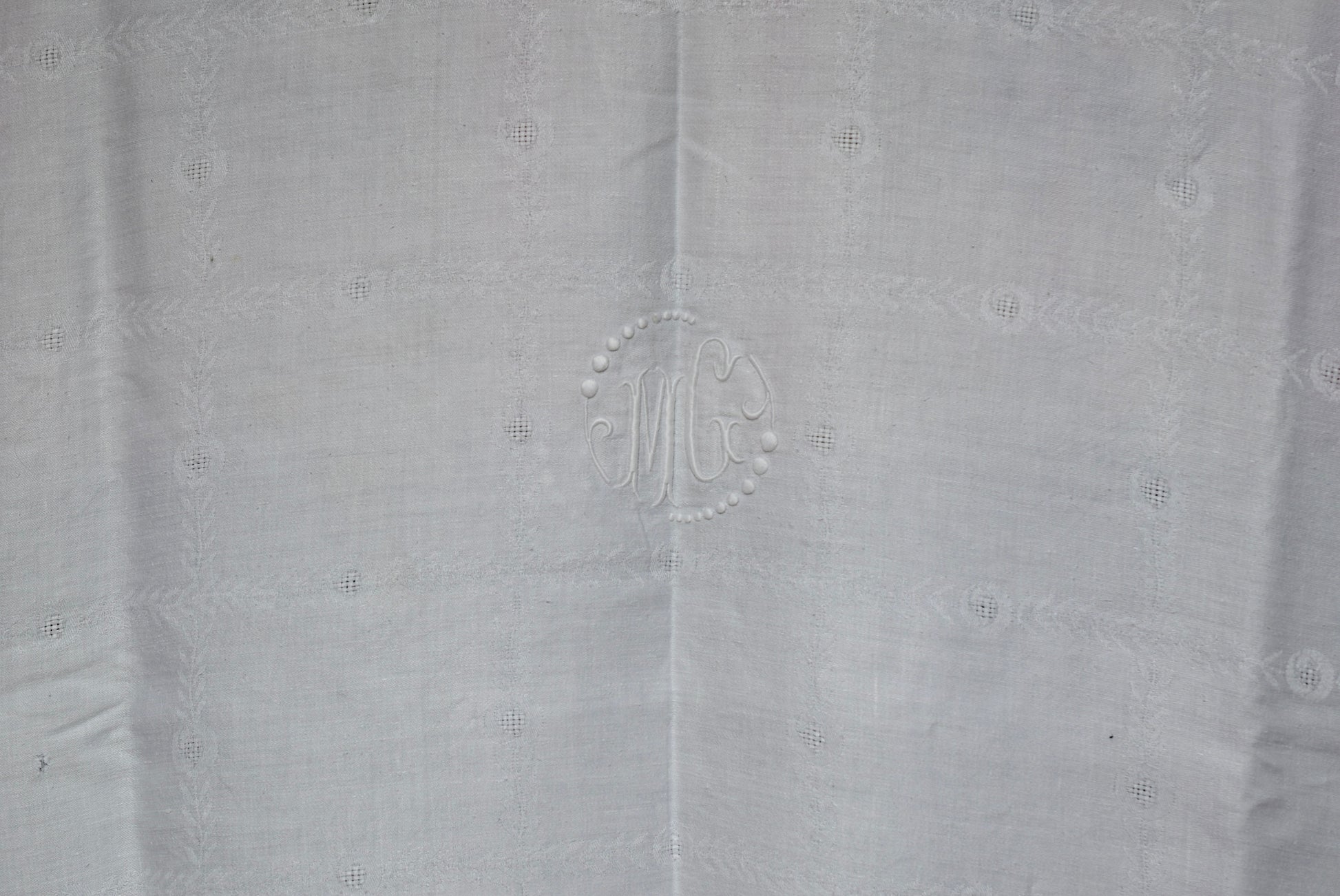 A French antique tablecloth made of damasse cotton/linen. It has been finely embroidered with two white monograms MG. Bunches of flowers motifs. This beautiful tablecloth dates from the early 20th century. It measures 90 1/2 inches (230cm) long and 59 inches wide (150cm). I offer two matching napkins with the tablecloth.