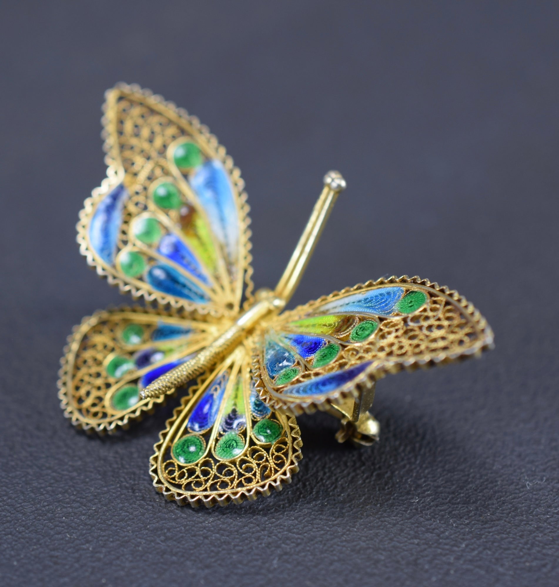 Beautiful vintage butterfly pin brooch dating from circa 1944-1968 produced by the Italian jeweler Alioto Adriana from Genoa. The filigree vermeil 800 silver butterfly is embellished with multi-color enamel in the vitreous pique-à-jour technique. Fantastic retro jewelry piece.