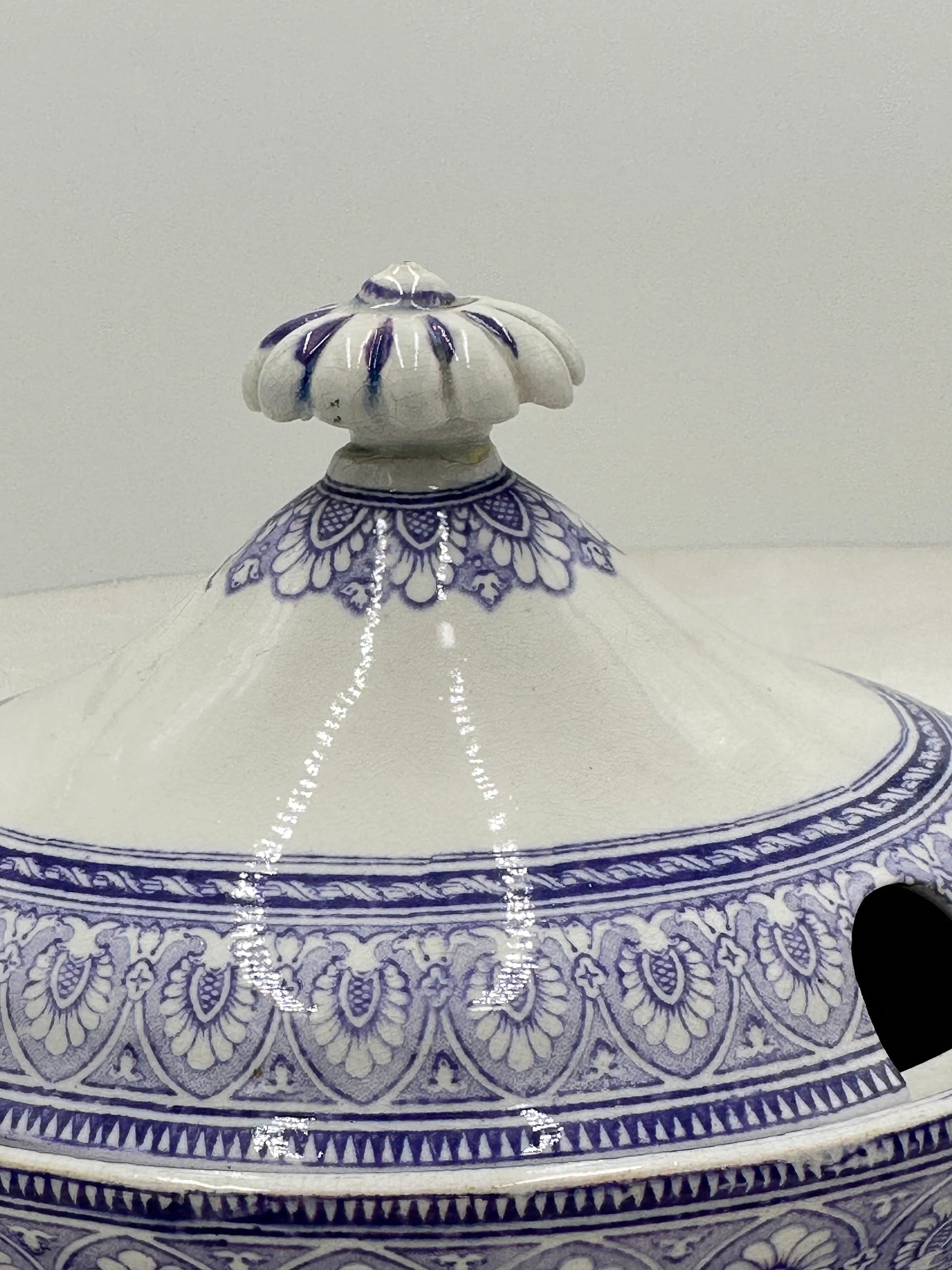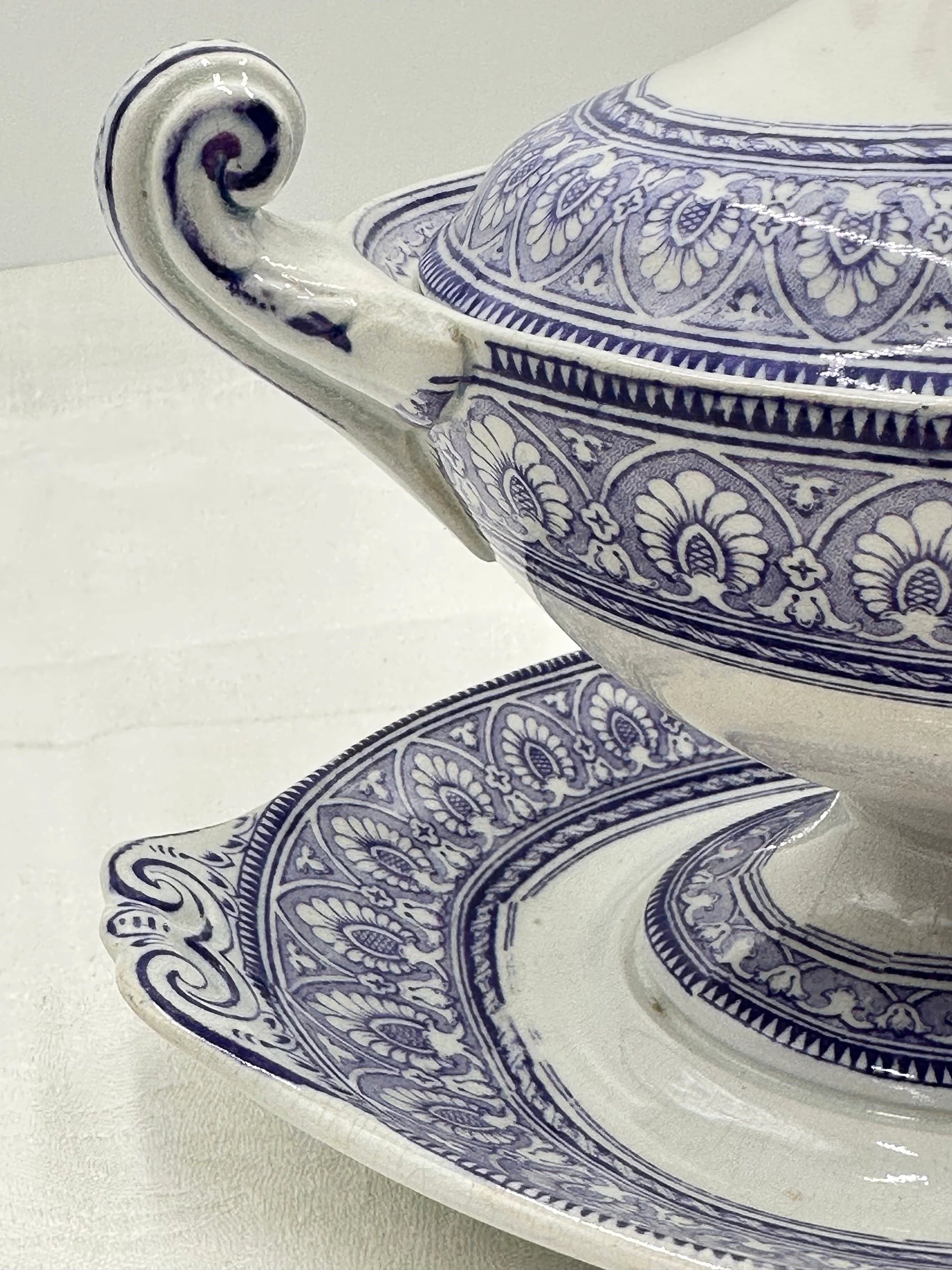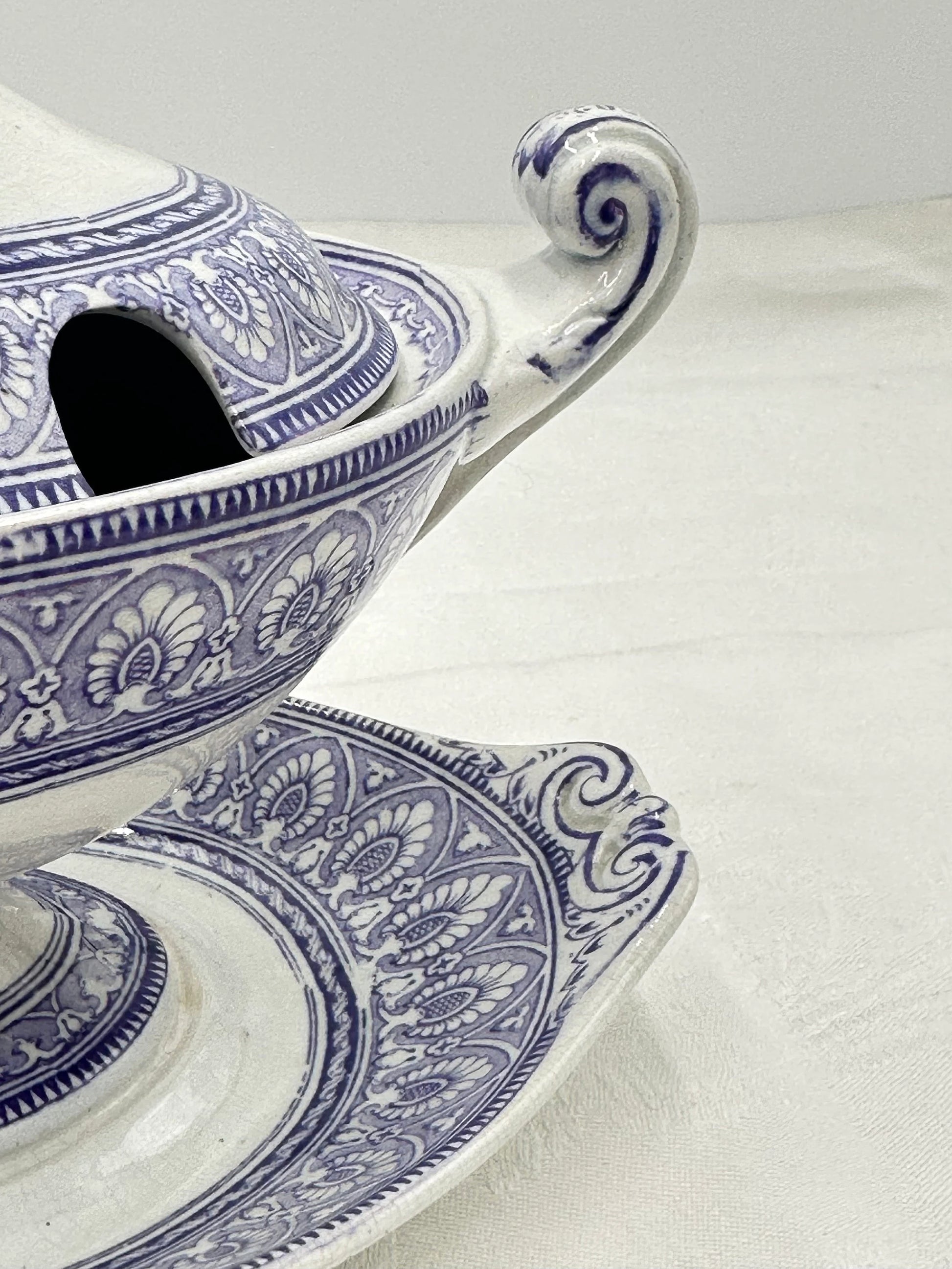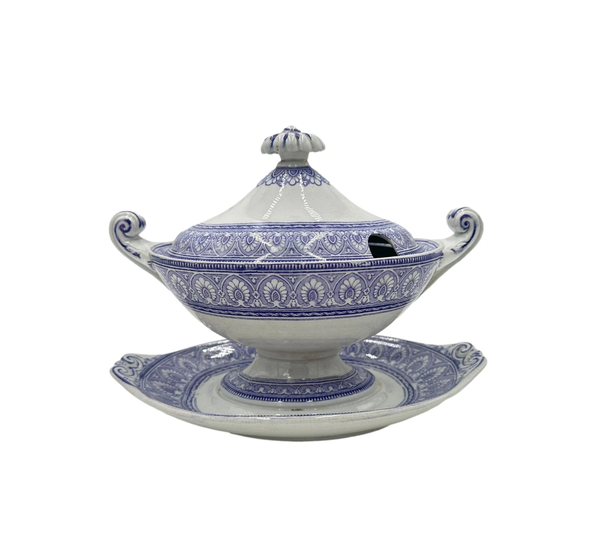 Bates Elliot & Co has produced this beautiful lidded gravy boat. The charming lavender decor features printed underglaze greek motifs. This pattern is called "Grecian Border" and was produced by the English pottery manufacturer in the 1870's It only bears the name of the pattern "Grecian Border". Elegant greek revival design.