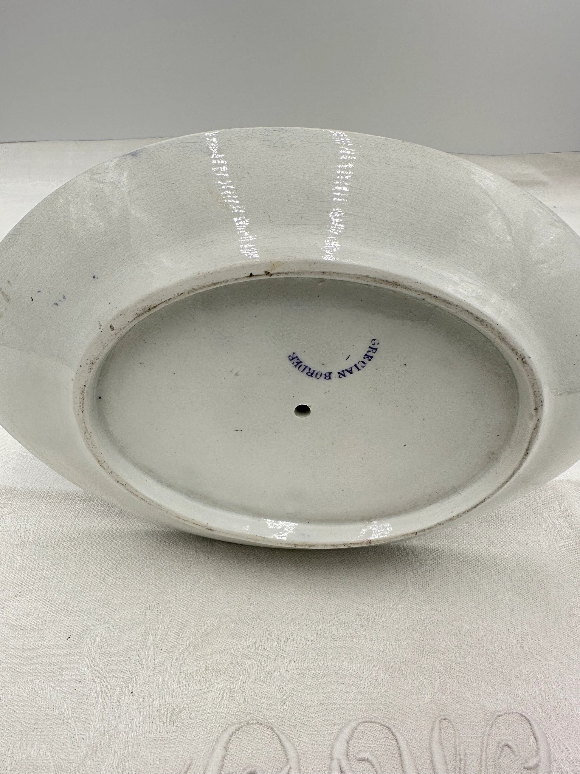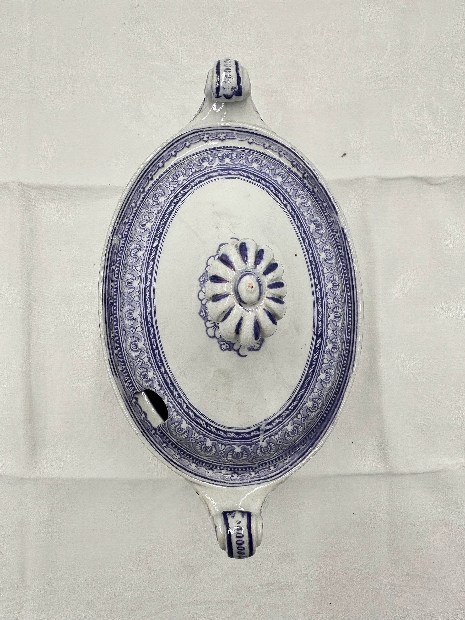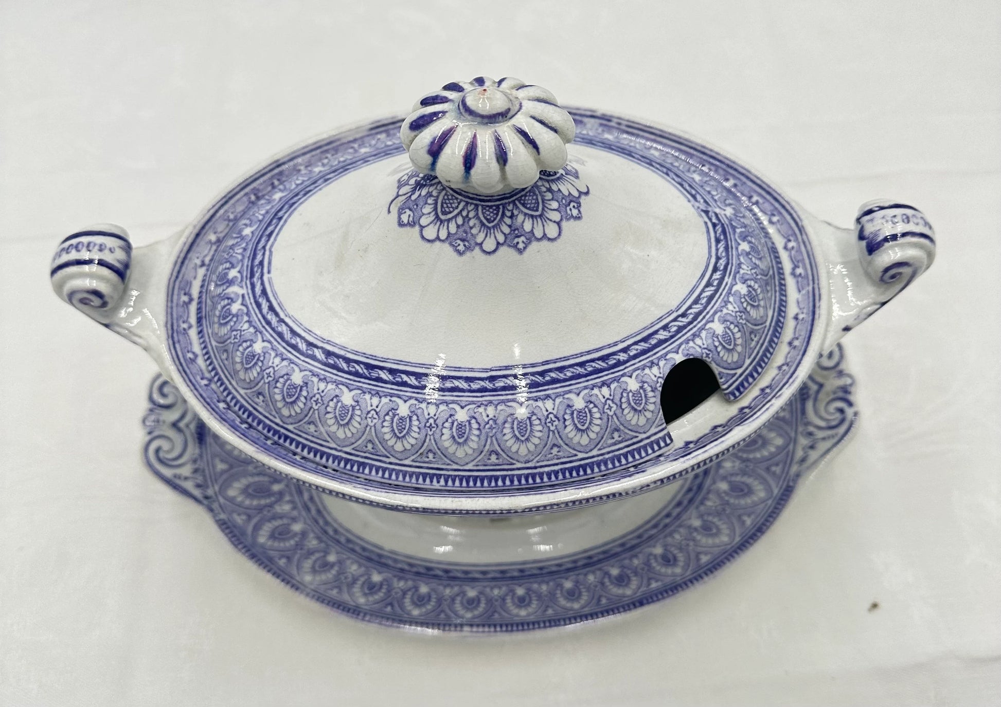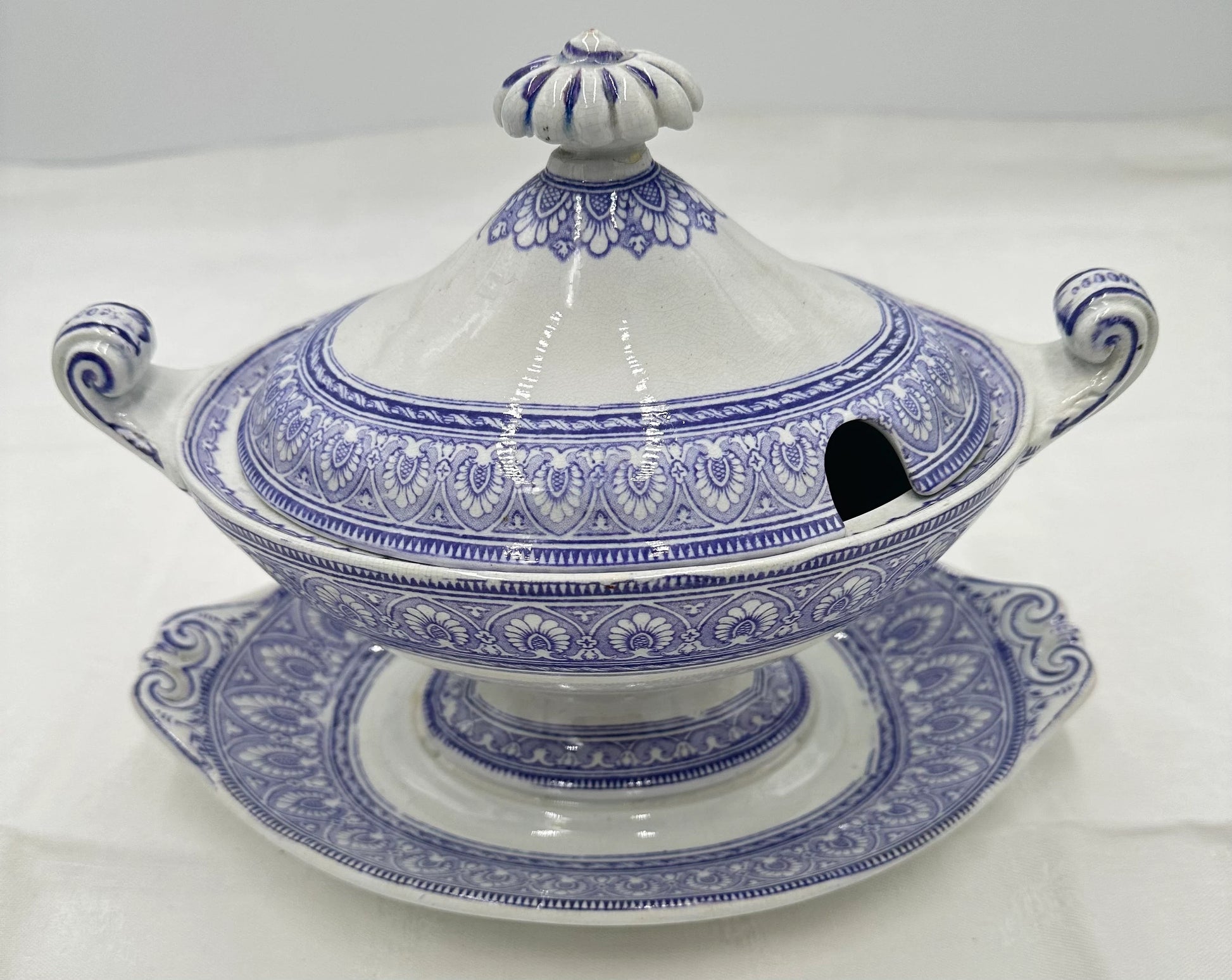 Bates Elliot & Co has produced this beautiful lidded gravy boat. The charming lavender decor features printed underglaze greek motifs. This pattern is called "Grecian Border" and was produced by the English pottery manufacturer in the 1870's It only bears the name of the pattern "Grecian Border". Elegant greek revival design.